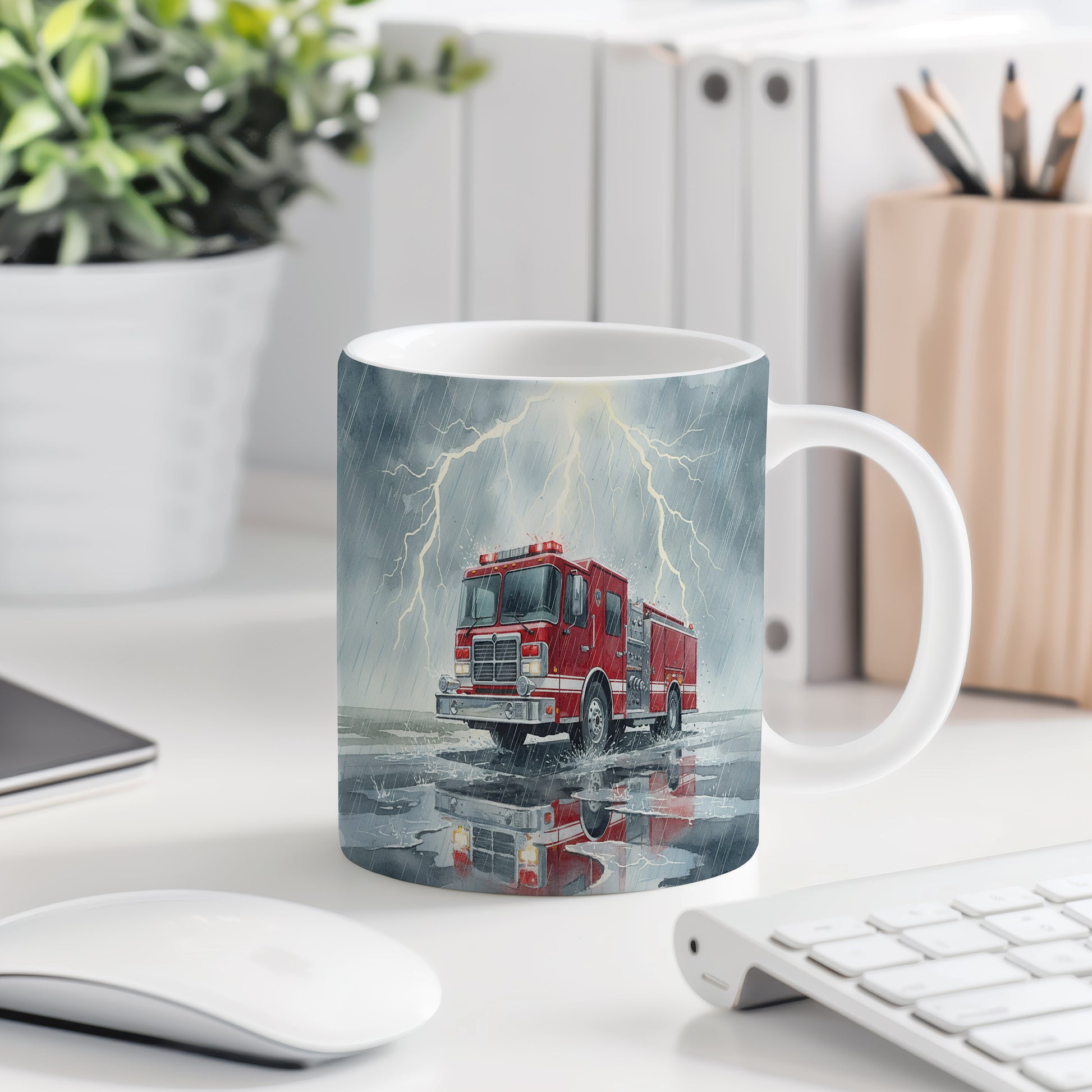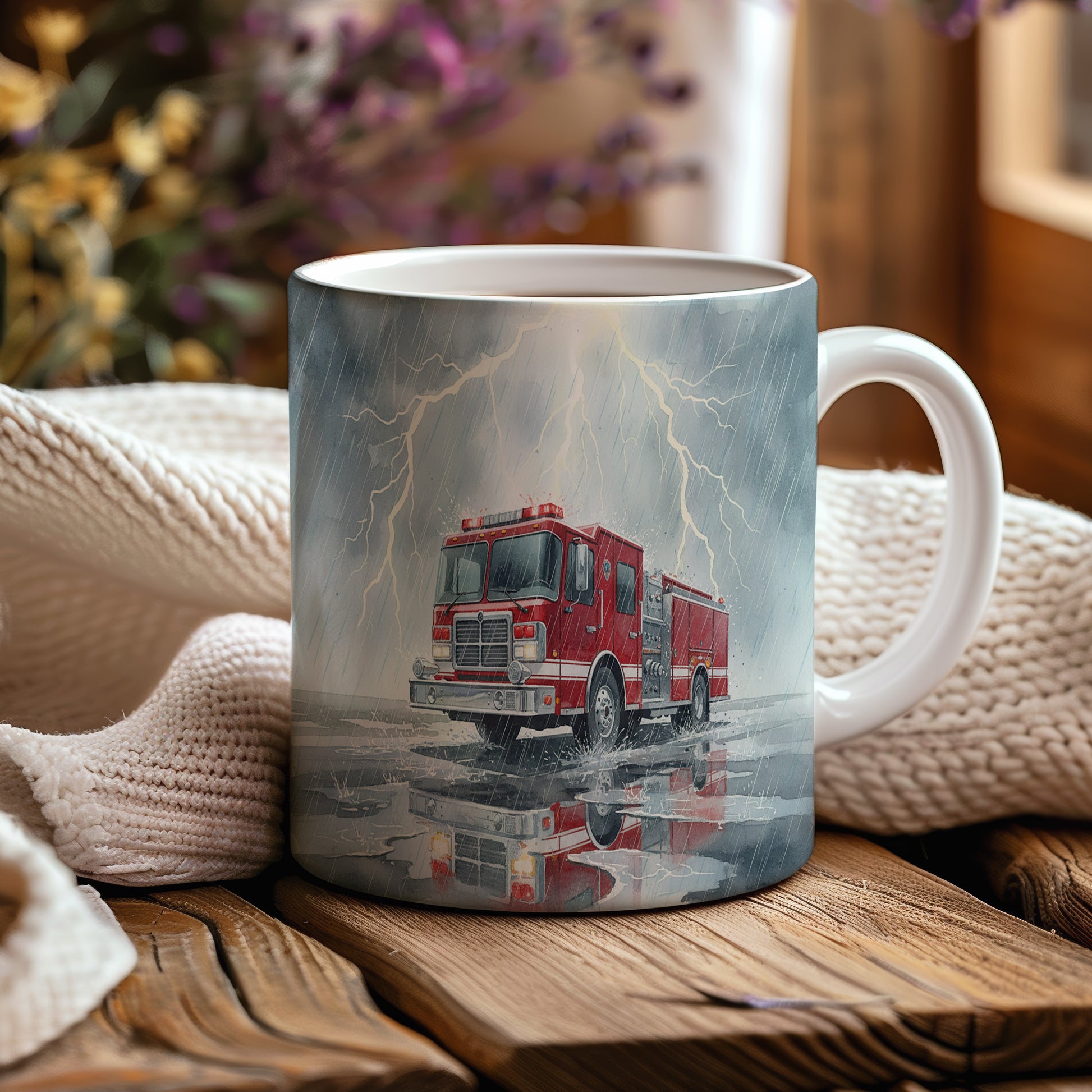 Objevte sílu a odvahu s tímto hrnkem zdobeným akvarelem hasičského vozu uprostřed bouře. Hrnek 330 ml – vhodný do myčky i mikrovlnky.
