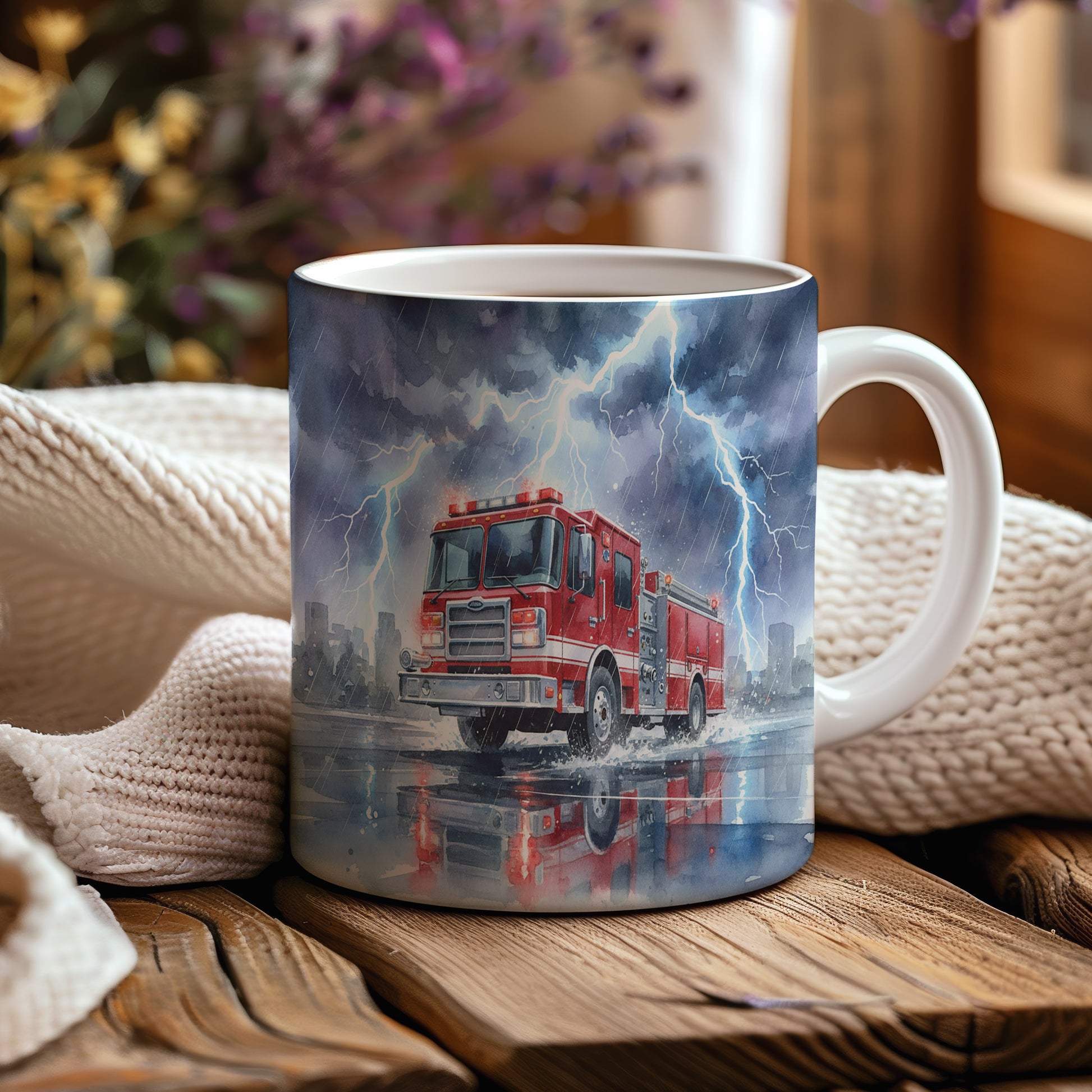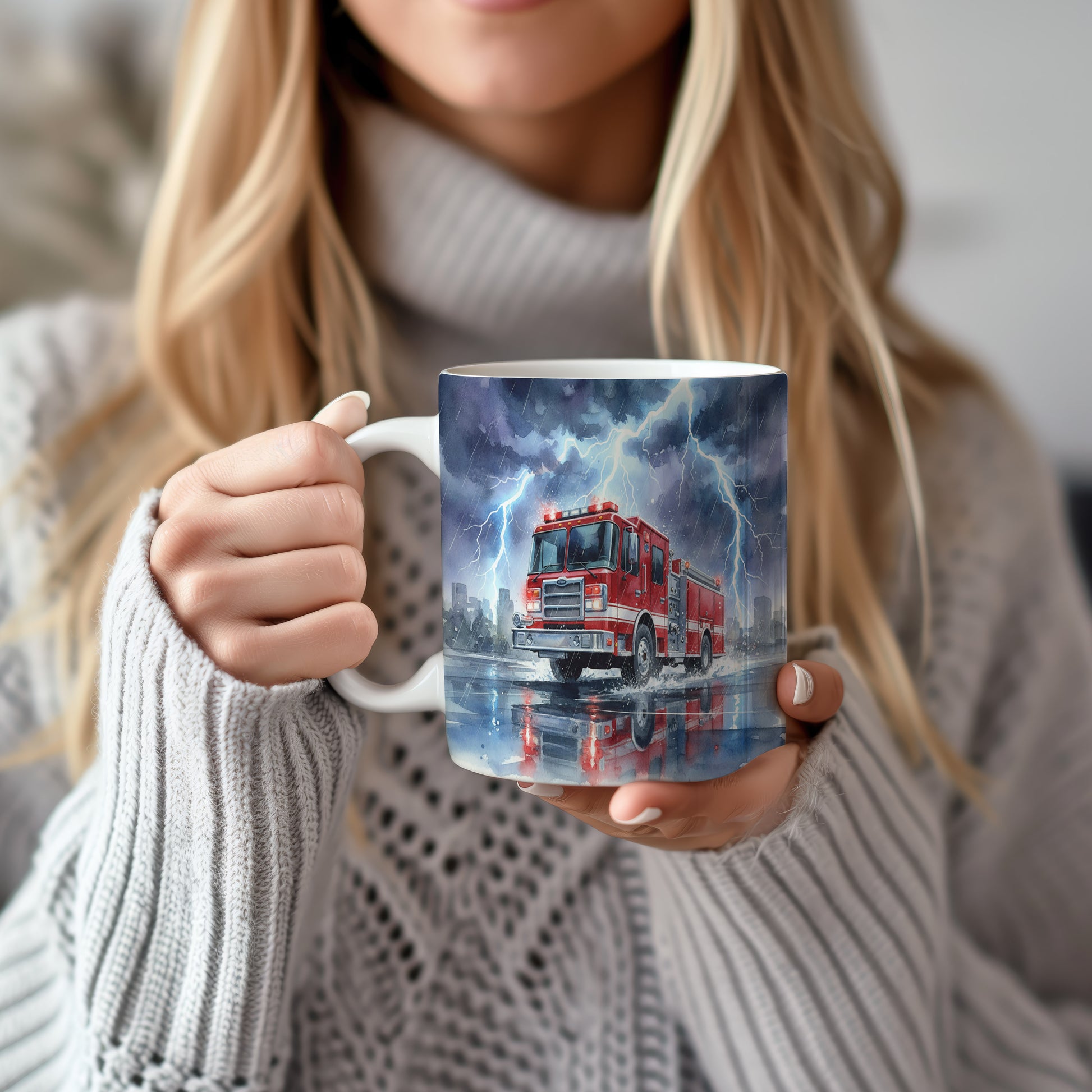 Objevte dramatickou scénu s hasičským vozem projíždějícím bouří. Akvarelový motiv dodává dynamiku a energii. Hrnek 330 ml – vhodný do myčky i mikrovlnky.