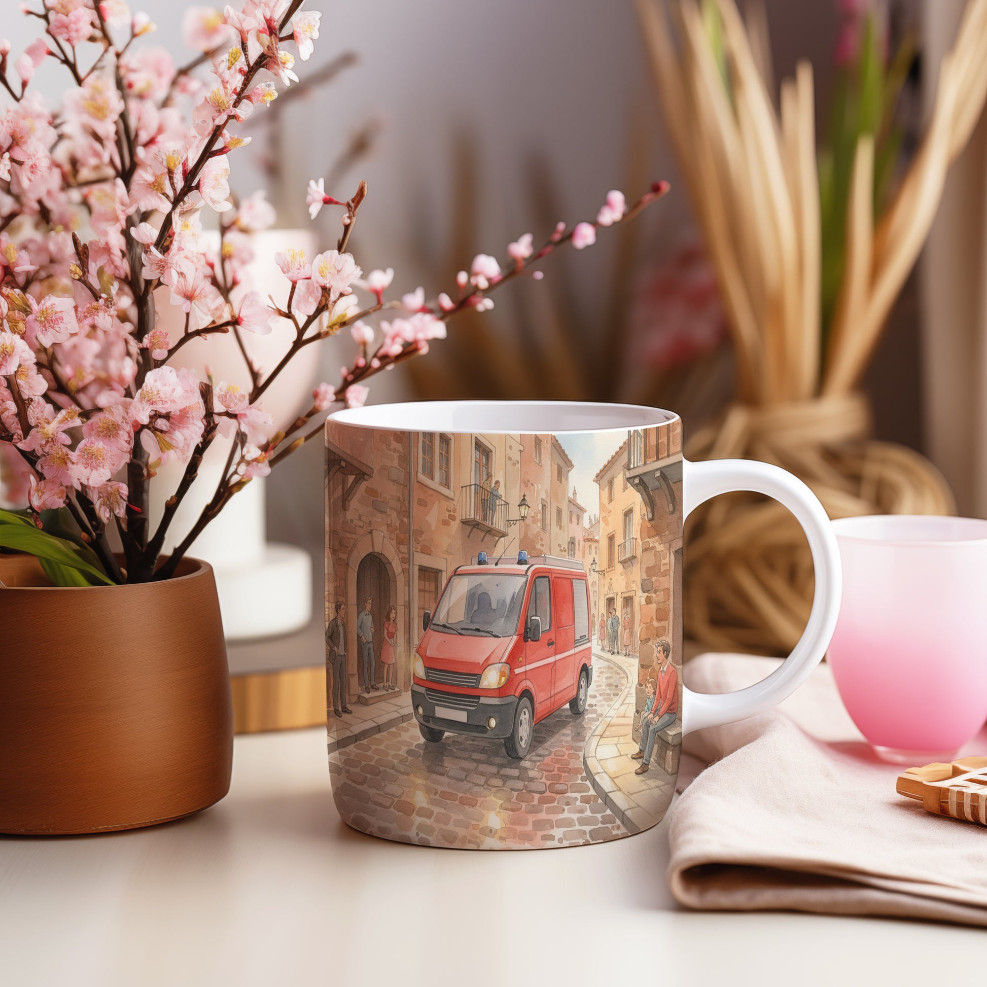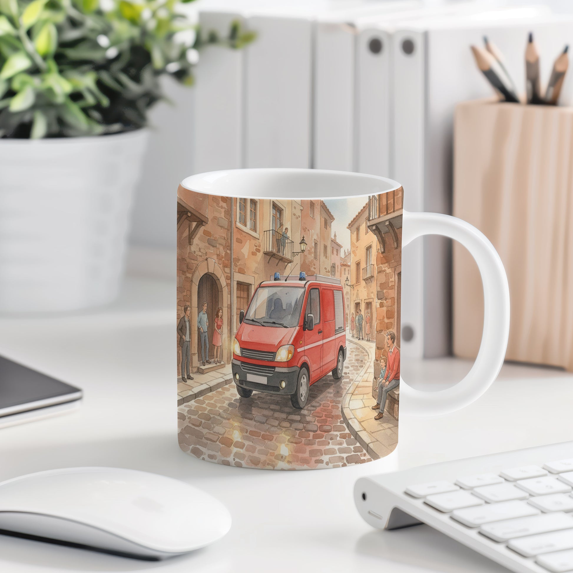 Objevte kouzlo akvarelu s motivem červeného hasičského vozu projíždějícího úzkou historickou uličkou. Hrnek 330 ml – vhodný do myčky i mikrovlnky.