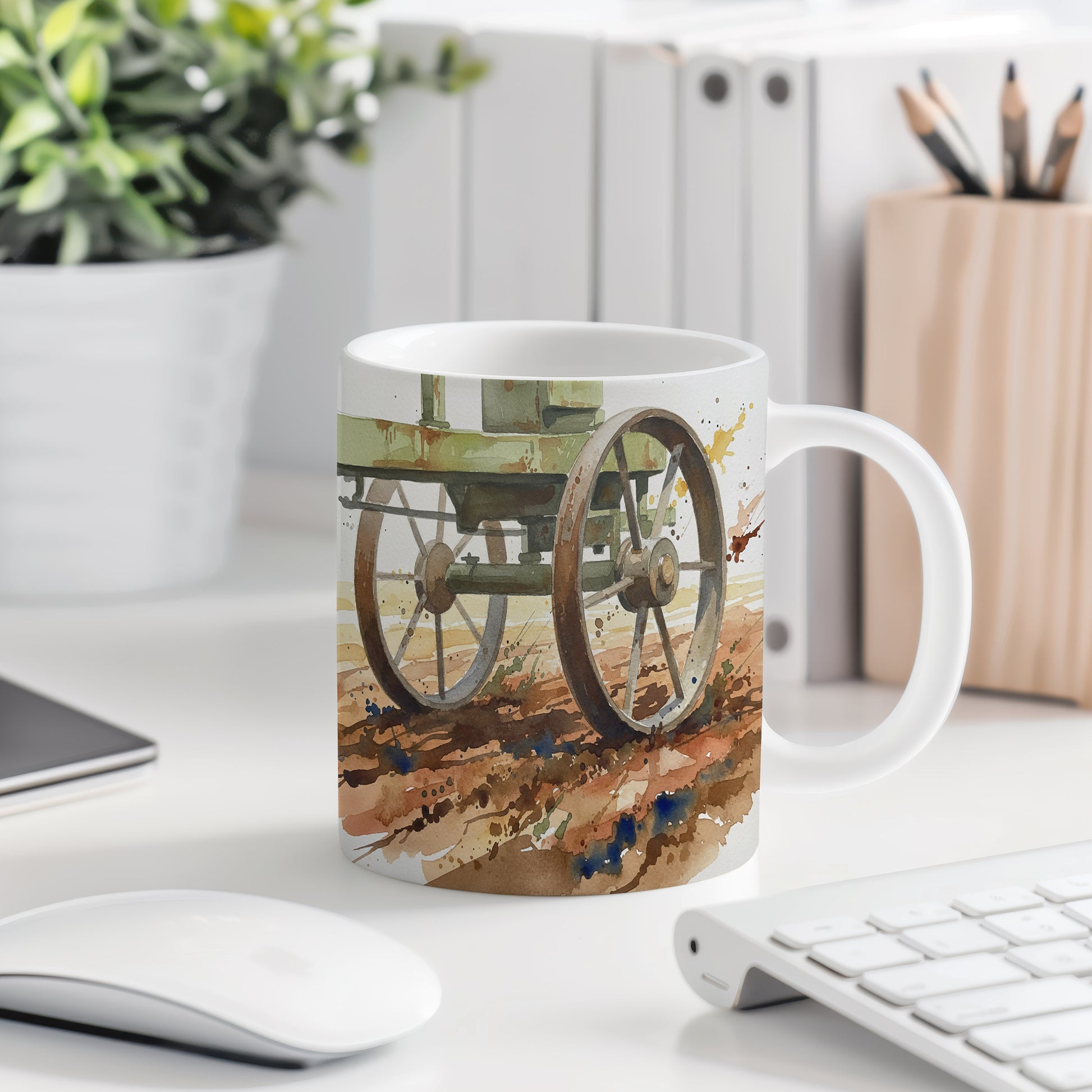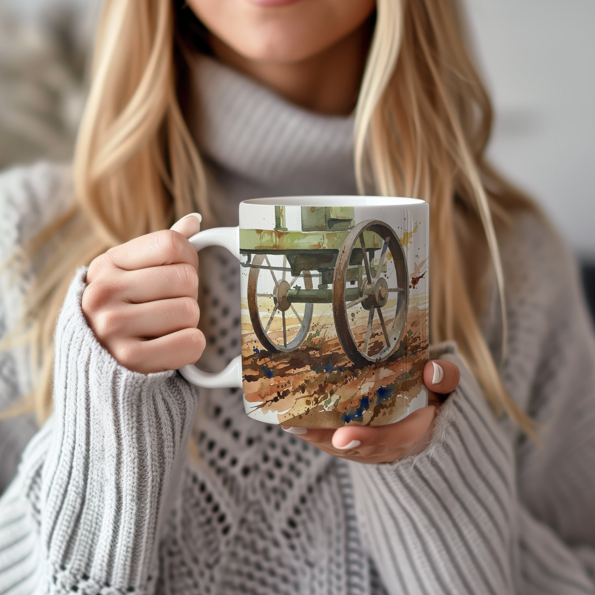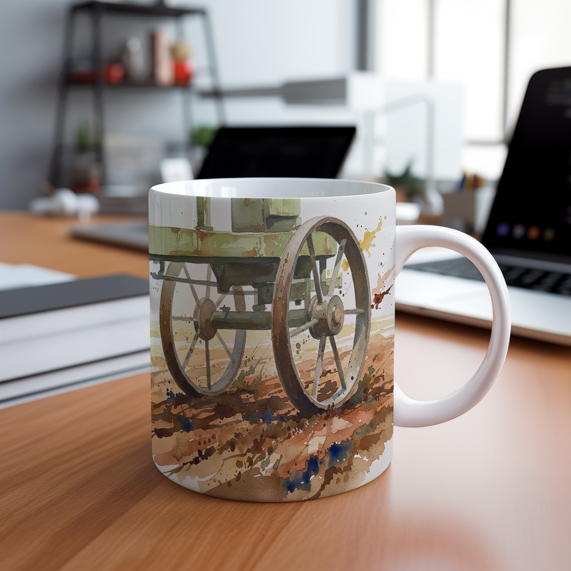 Objevte kouzlo minulosti s hrnkem zdobeným akvarelovým motivem historického vozu na polní cestě. Ideální pro milovníky starých strojů. Hrnek 330 ml – vhodný do myčky i mikrovlnky.