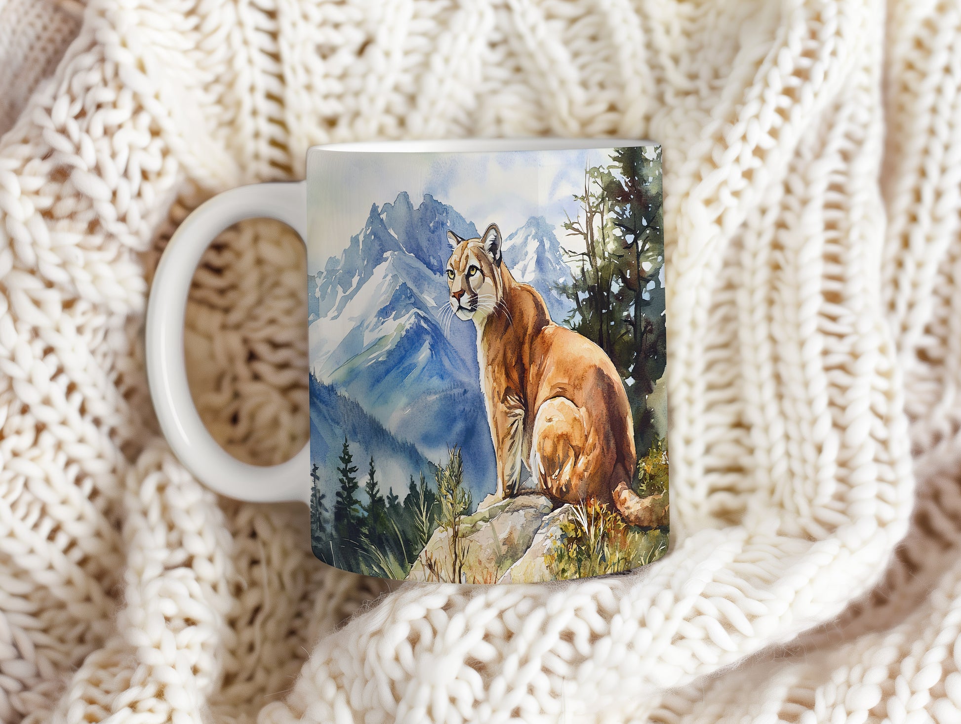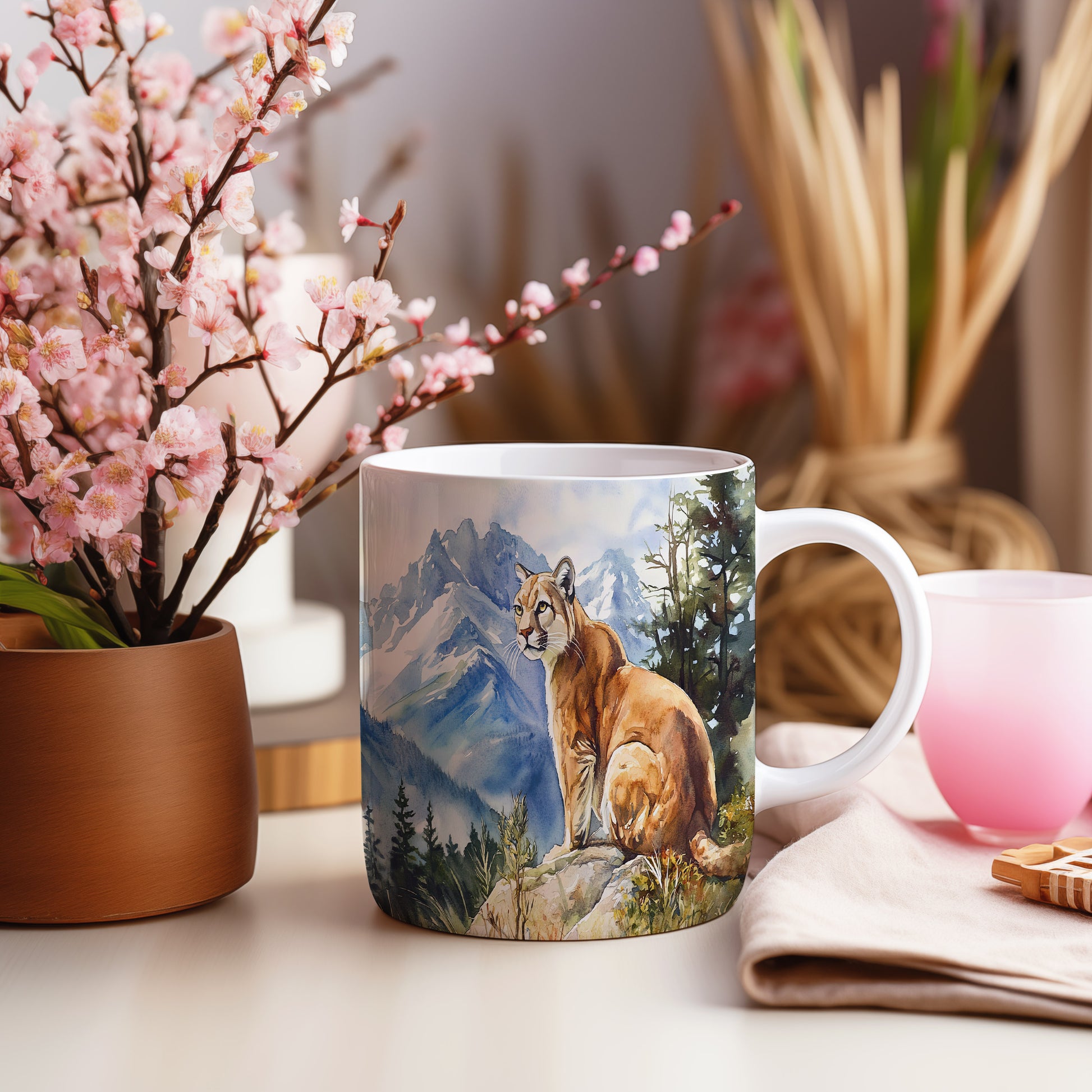 Hrnek s horskou kočkou v malebné přírodě