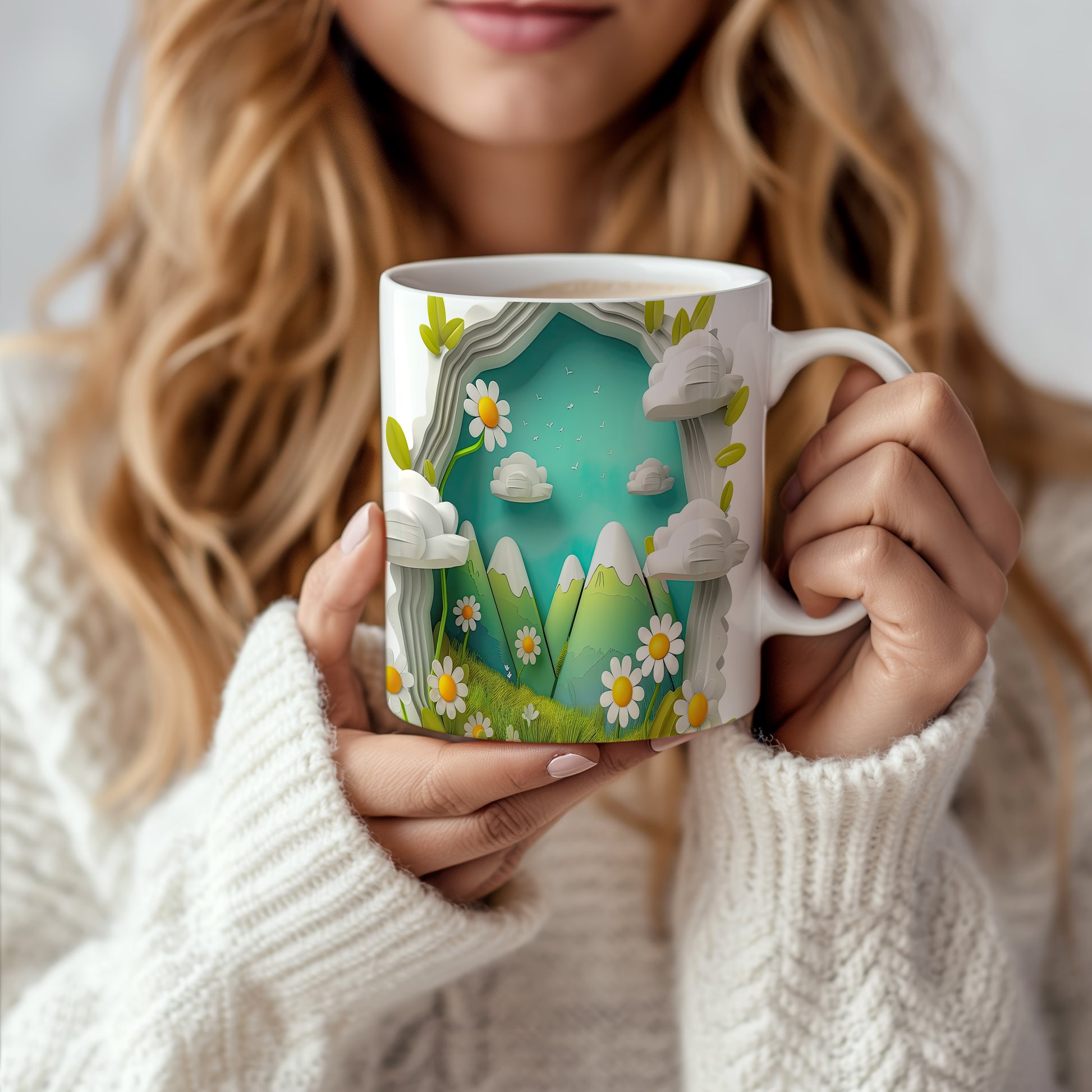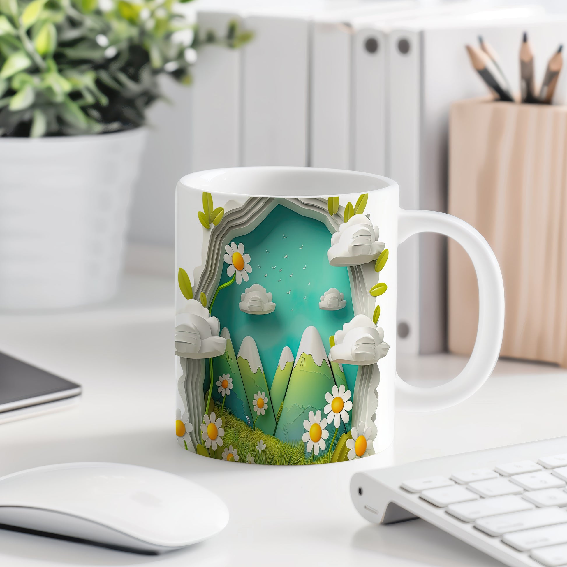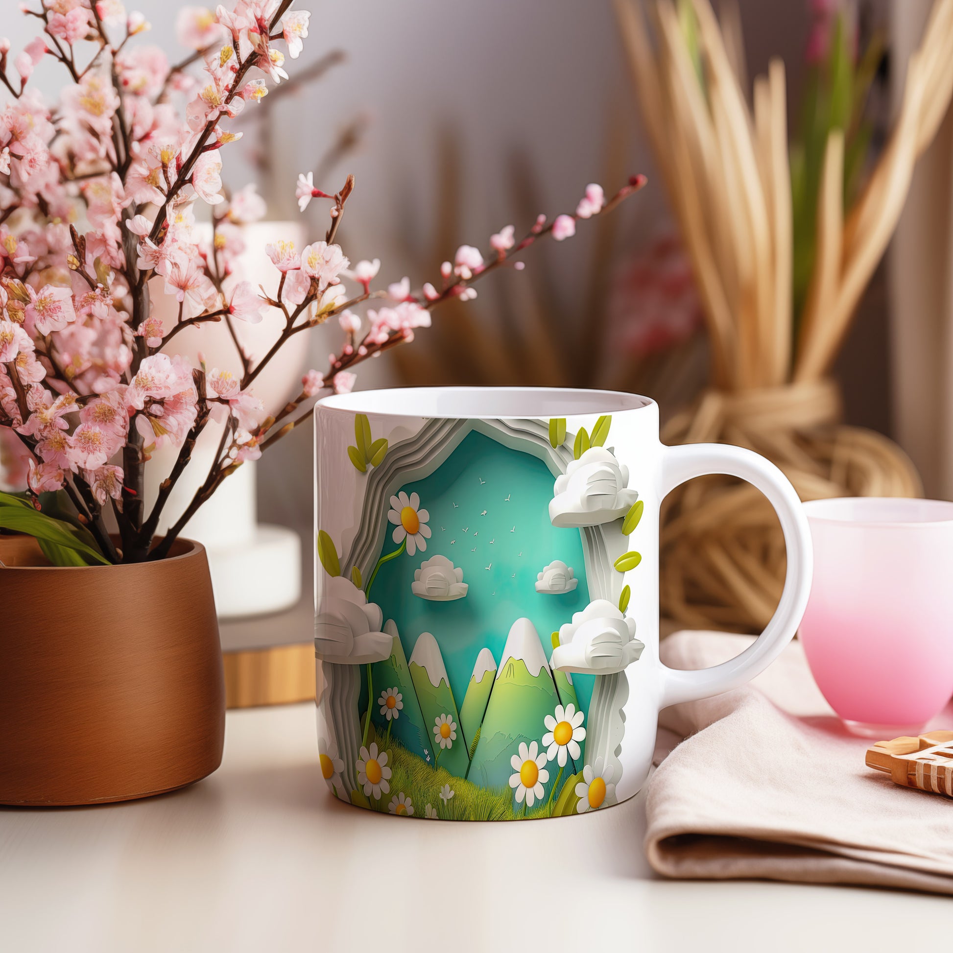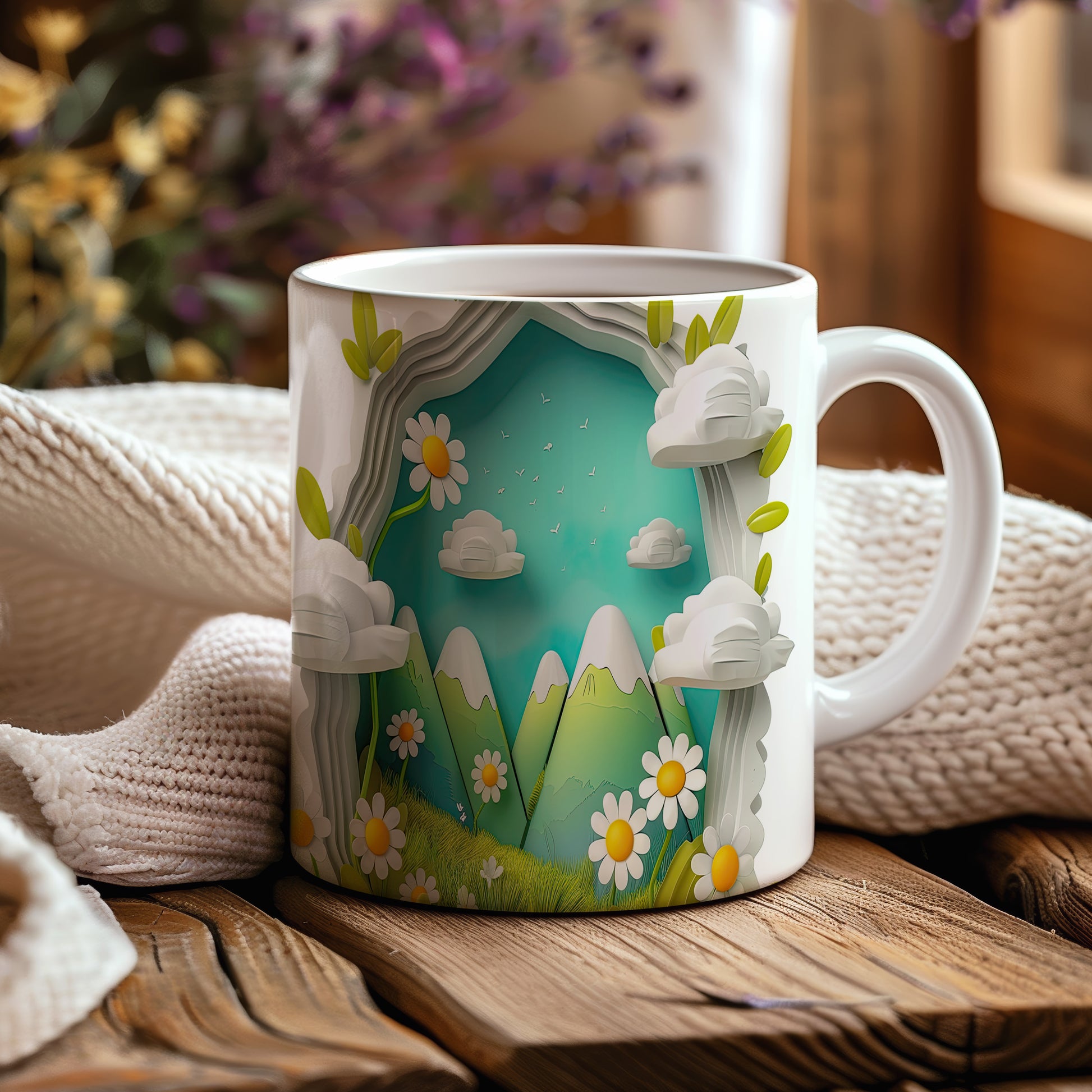 Hrnek s horským motivem a květinami