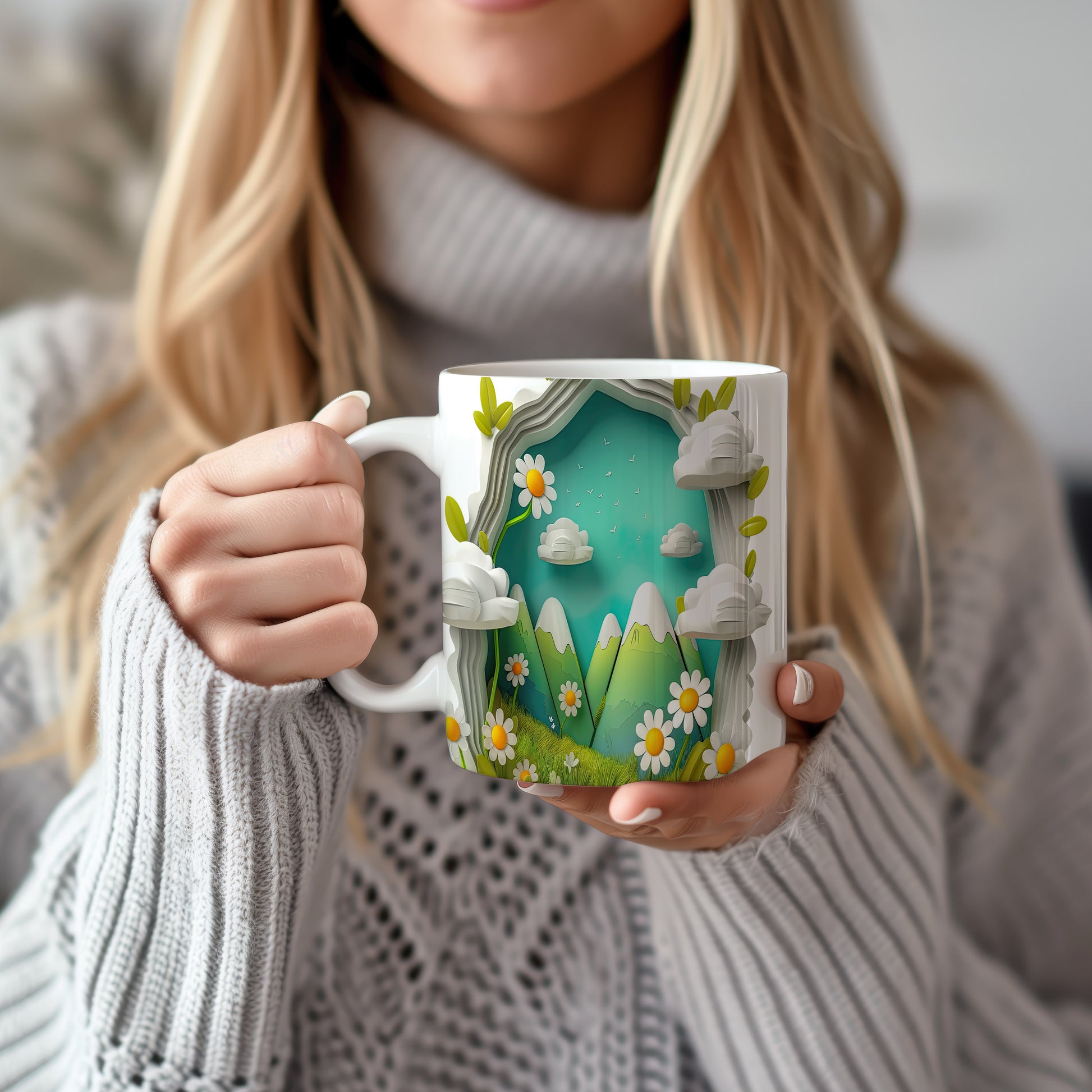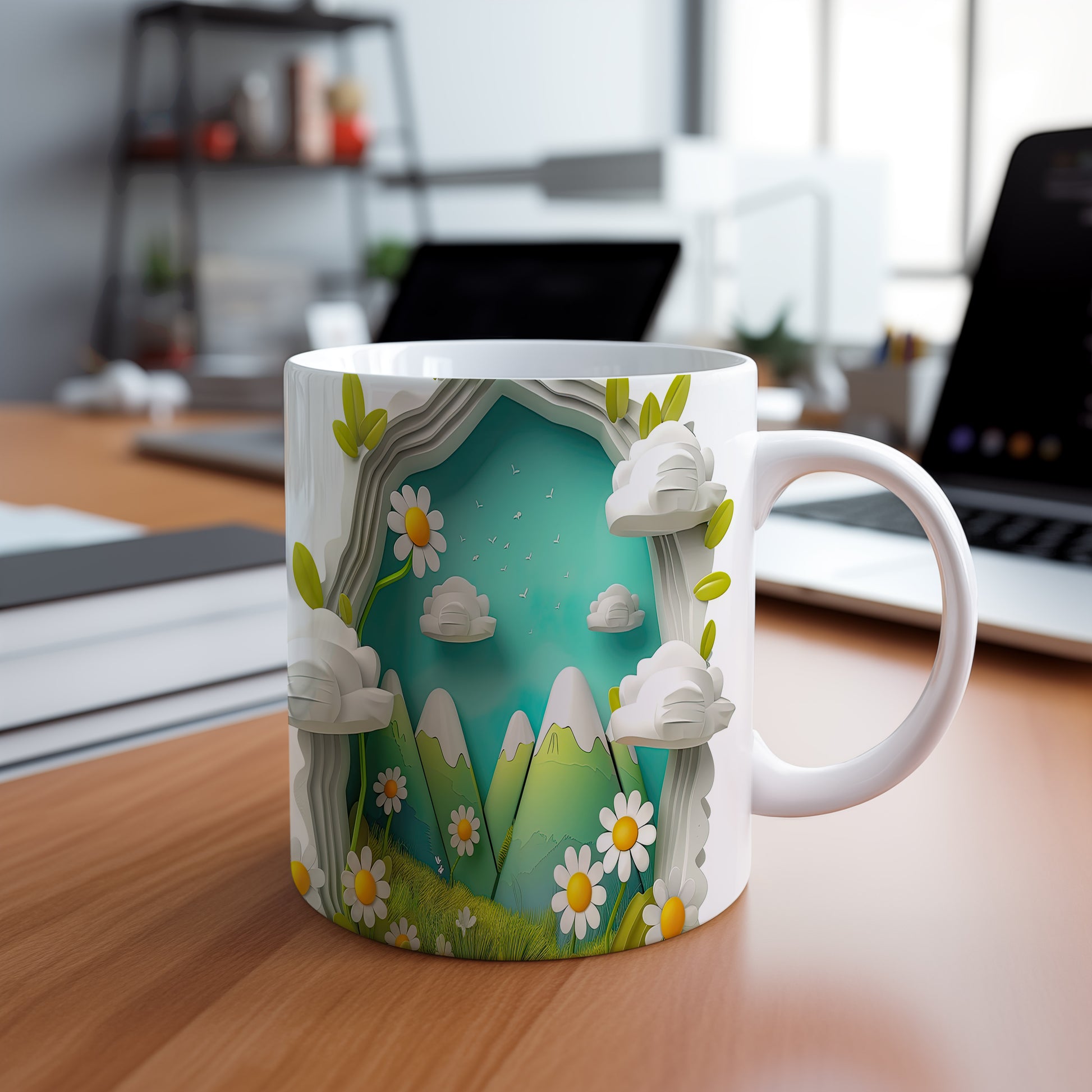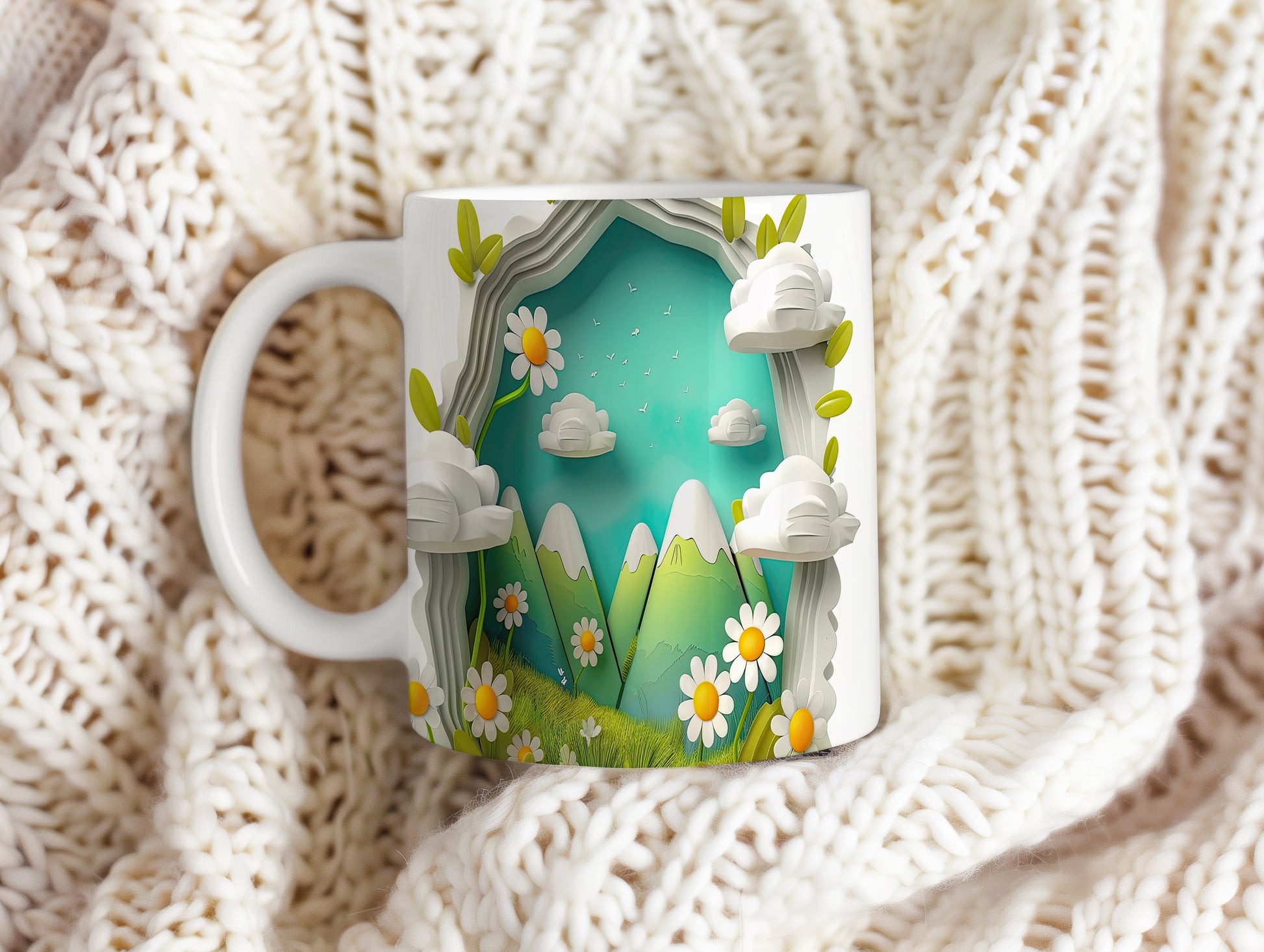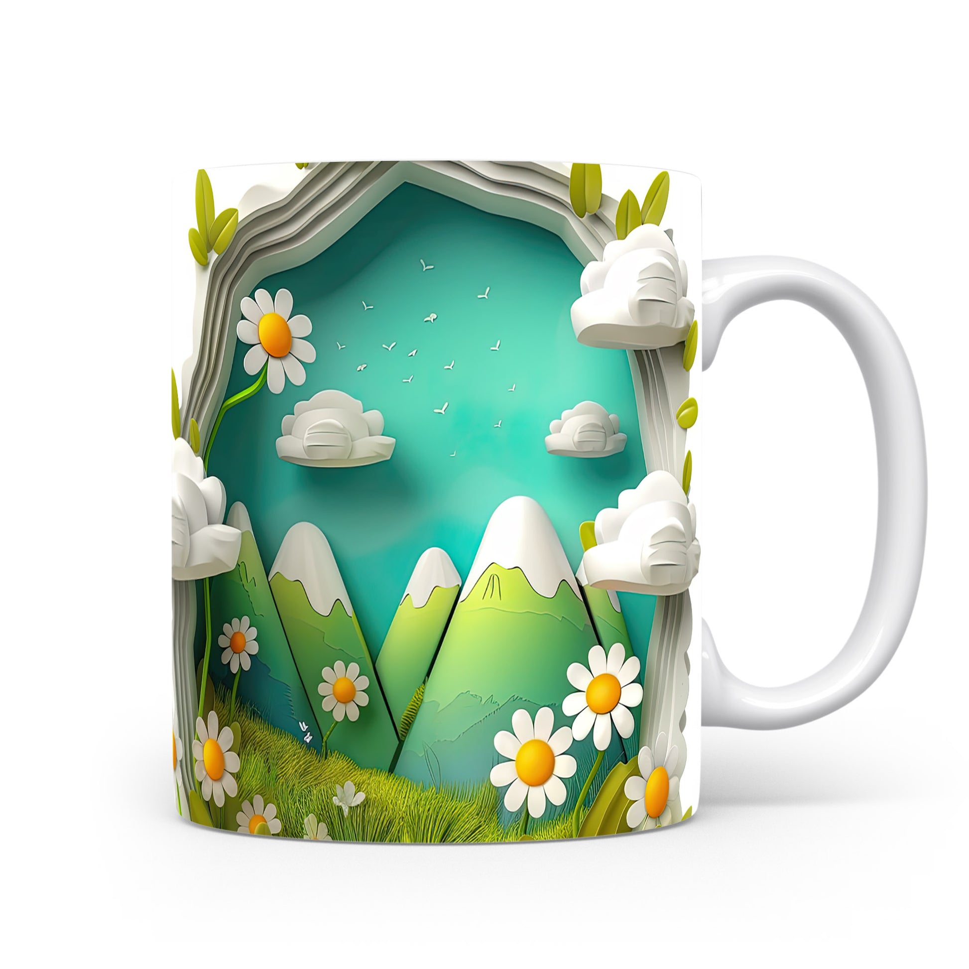 Hrnek s horským motivem a květinami