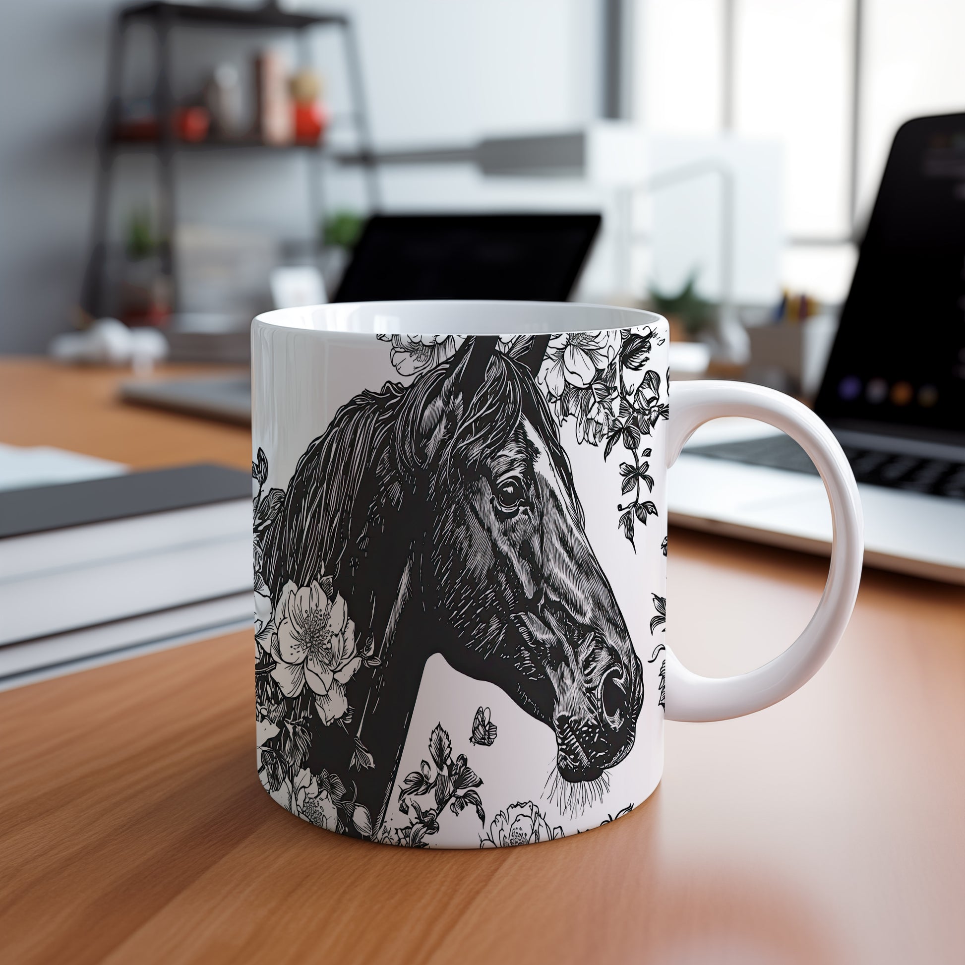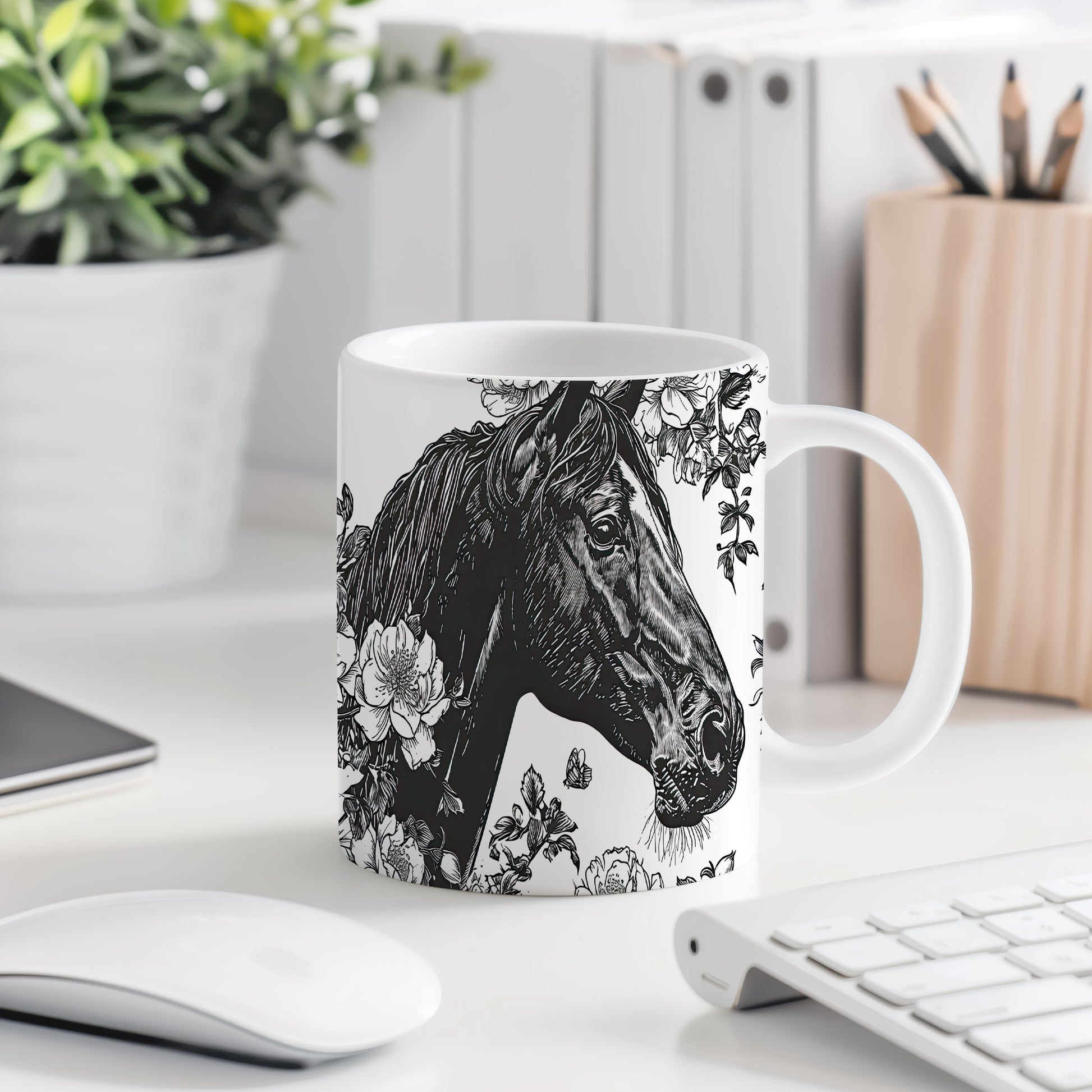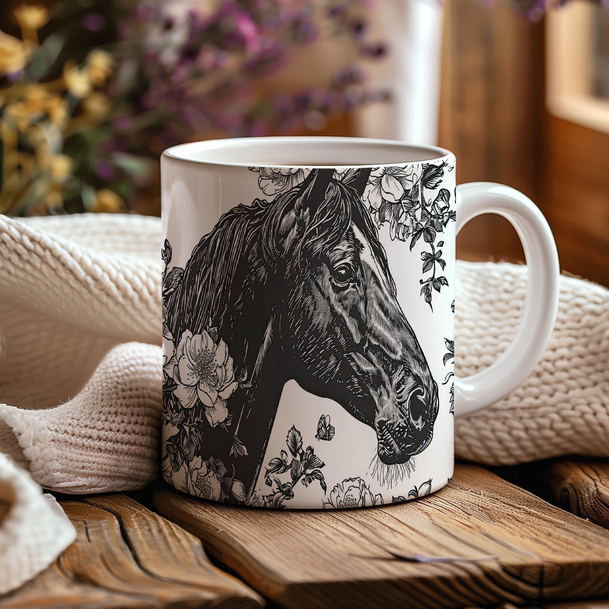 Hrnek s motivem koně a květin je elegantním kouskem pro všechny milovníky přírody. Skvělý tip na dárek pro přátele nebo rodinu, kteří ocení krásu přírody. Materiál: keramika. Objem: 330 ml. Vhodné do myčky i mikrovlnky. Tento hrnek přináší radost z každého doušku a dodává osobitý styl vaší kávě nebo čaji.