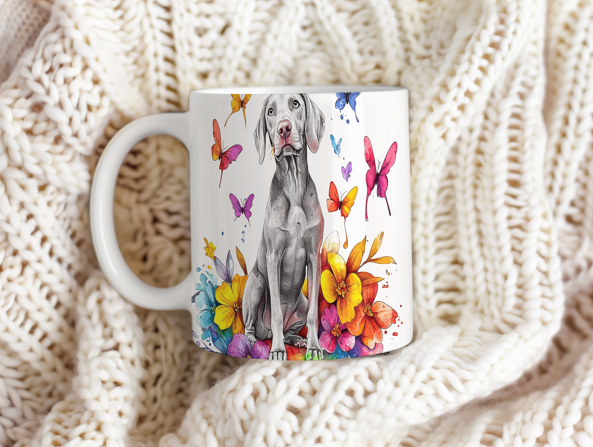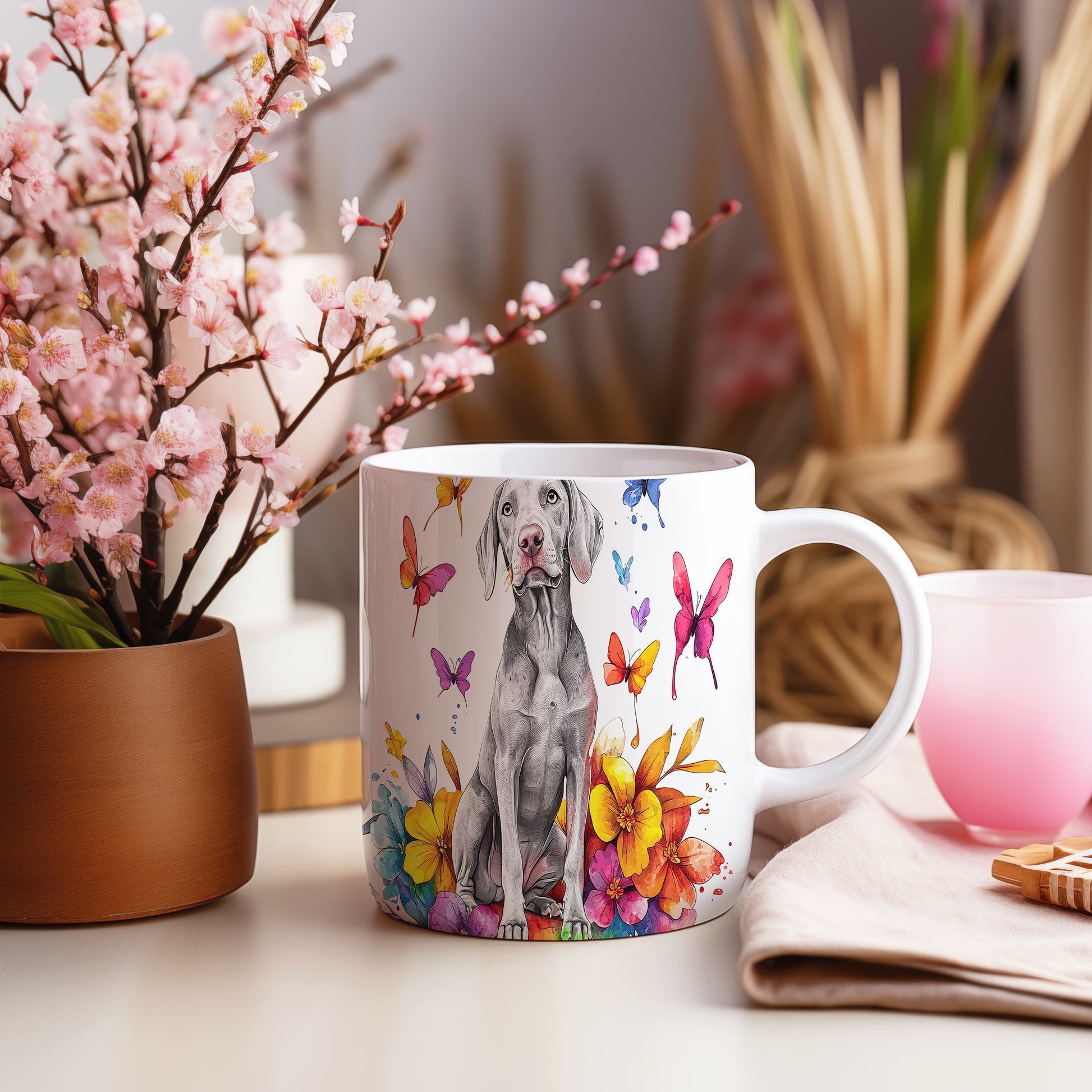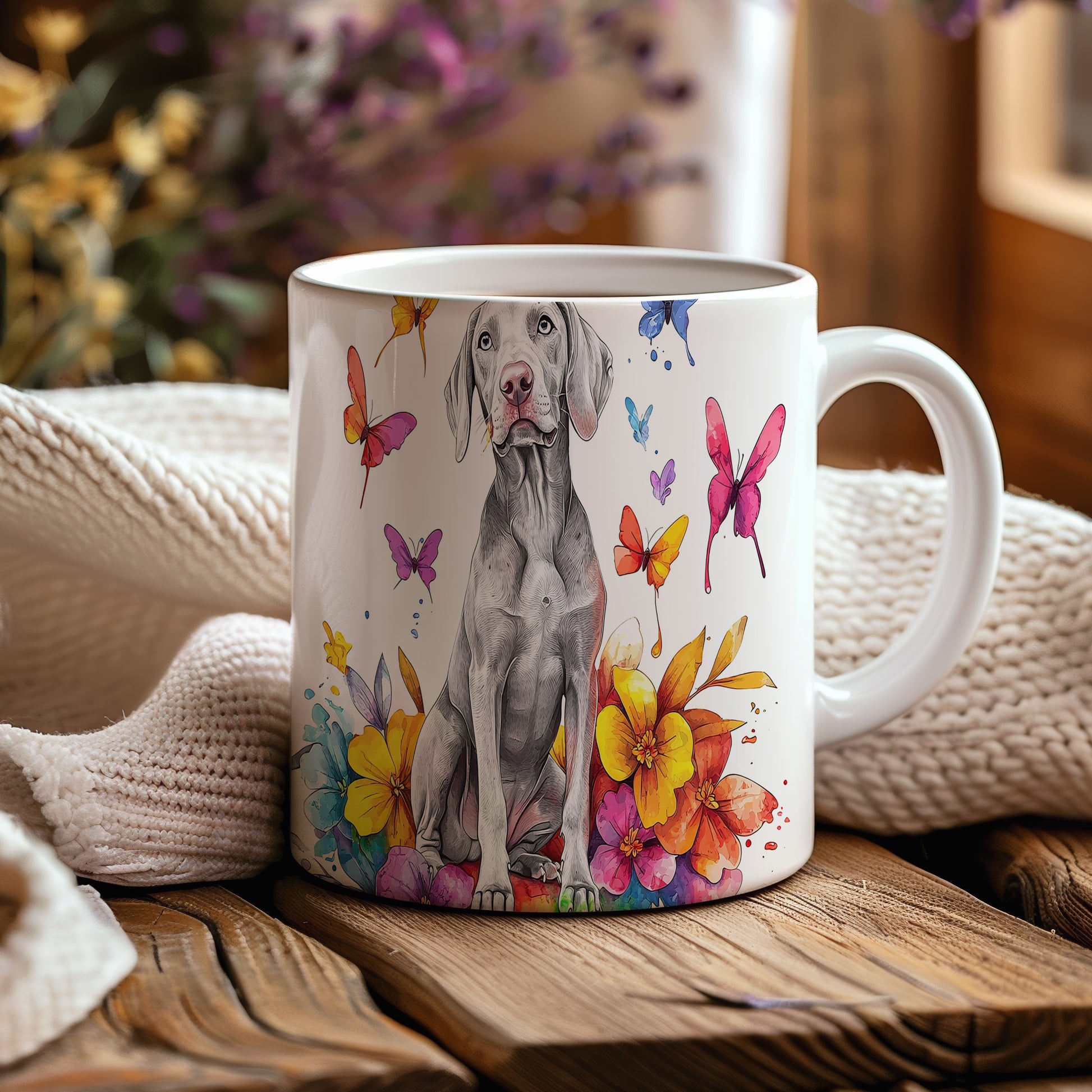 Hrnek s ilustrací Vymarského ohaře a květinami