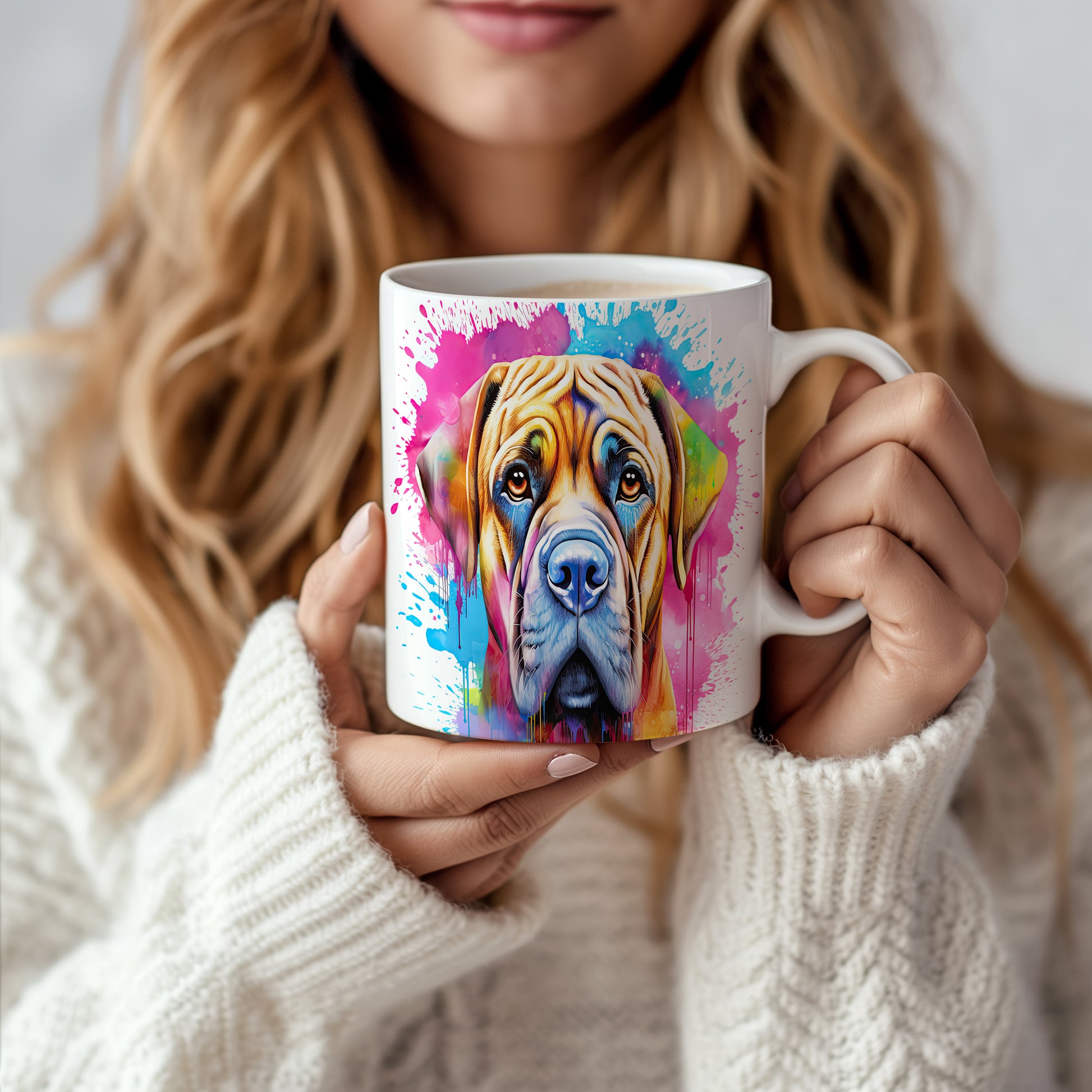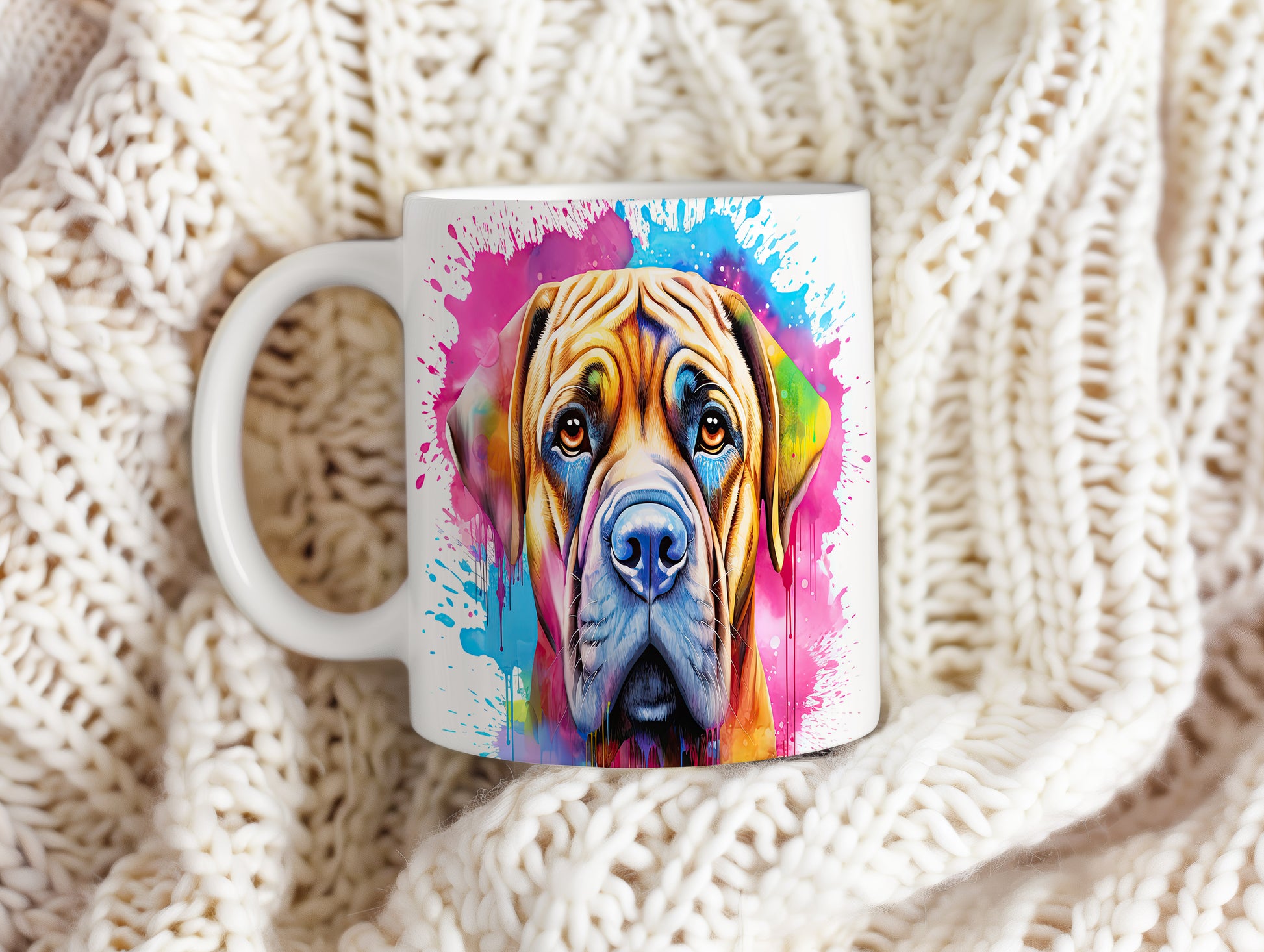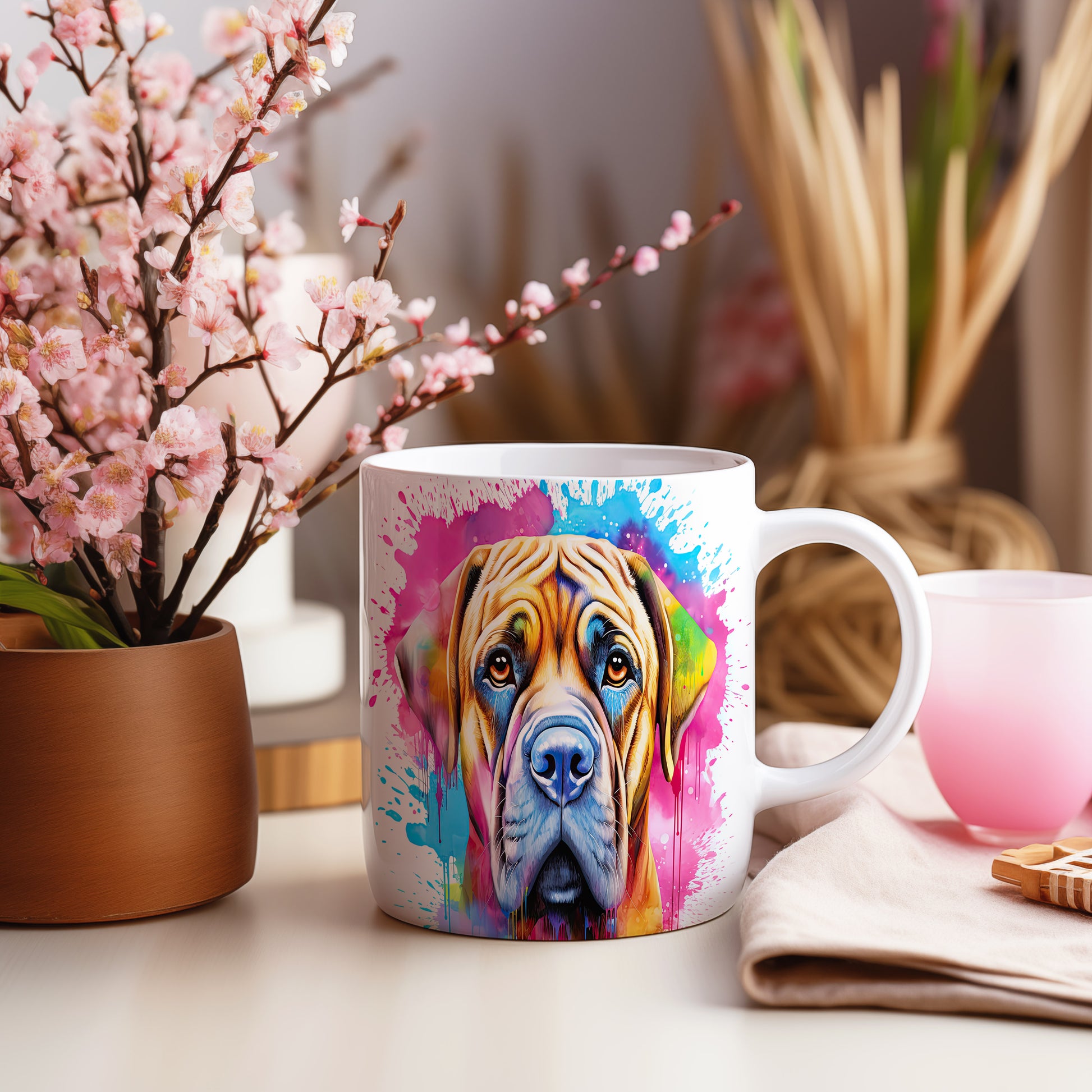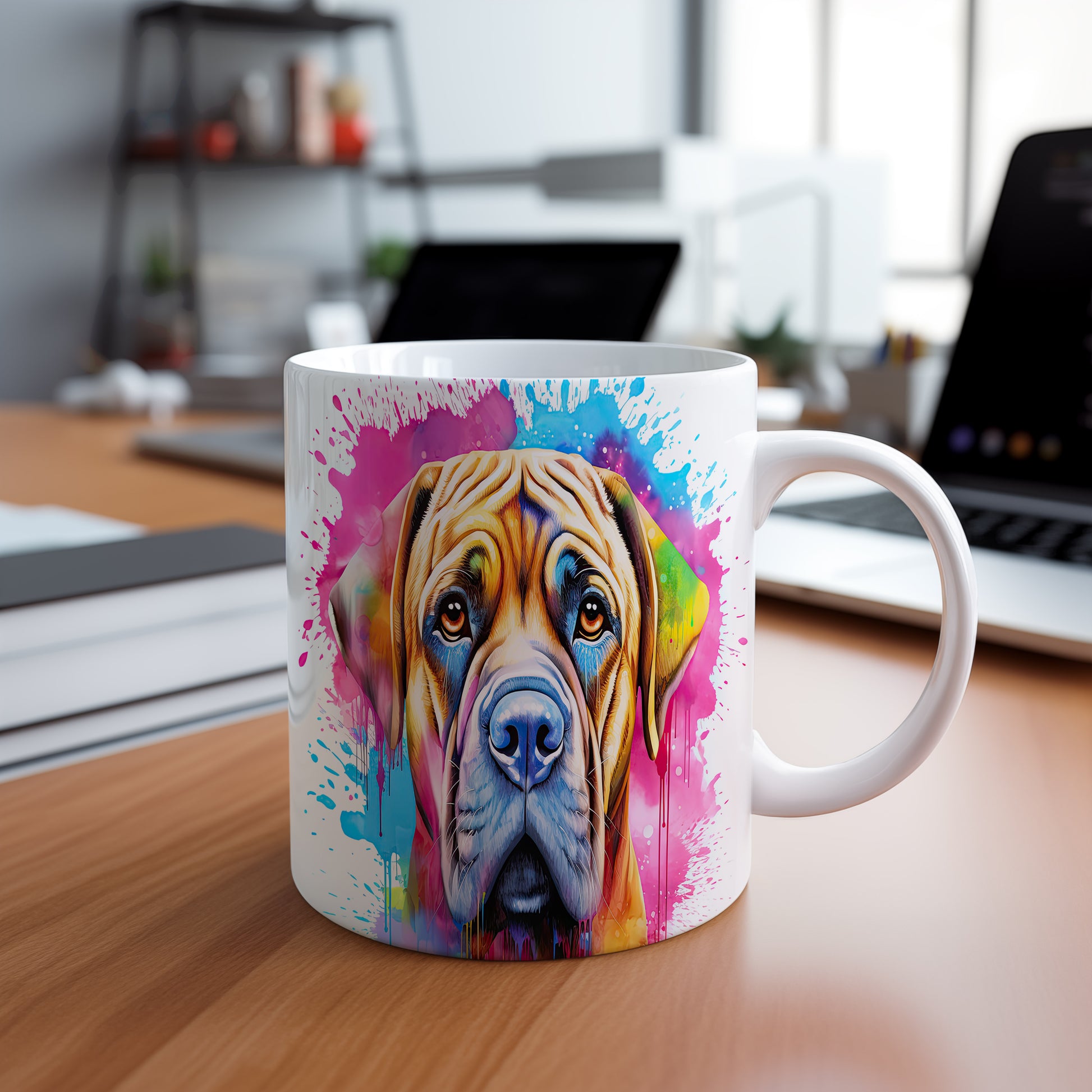 Hrnek s ilustrací psa na barevném pozadí