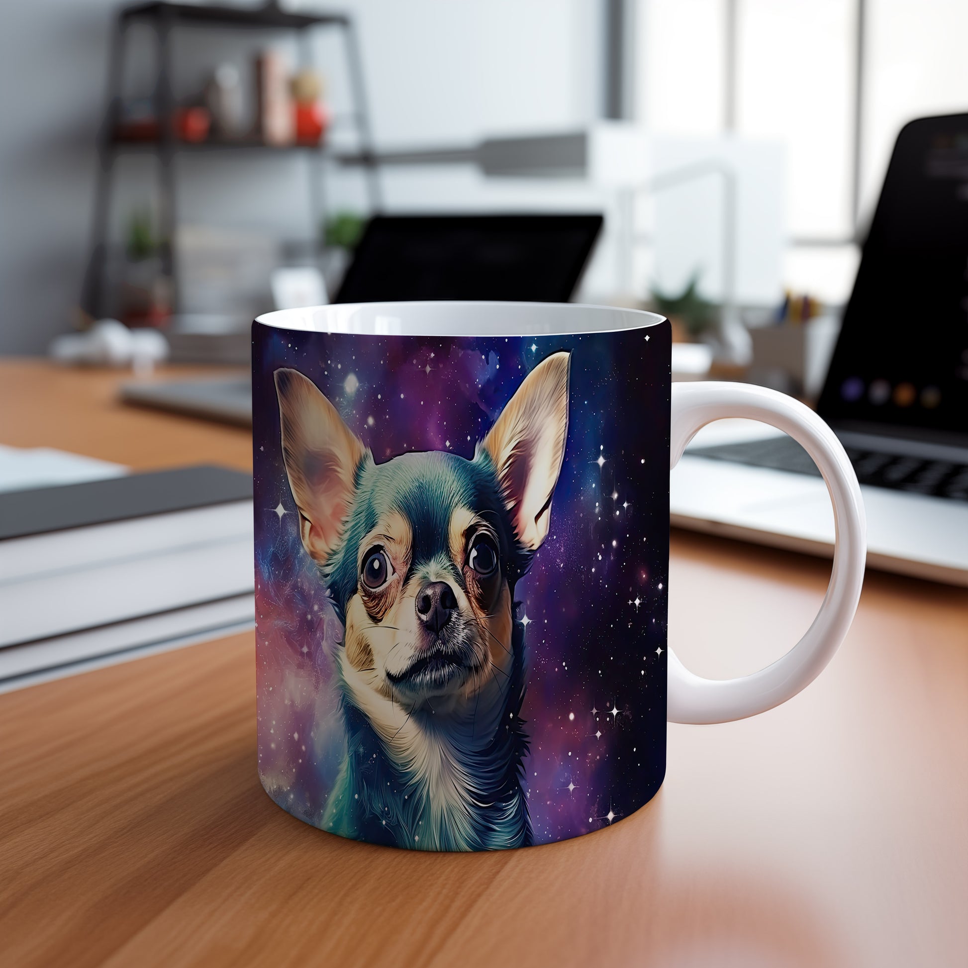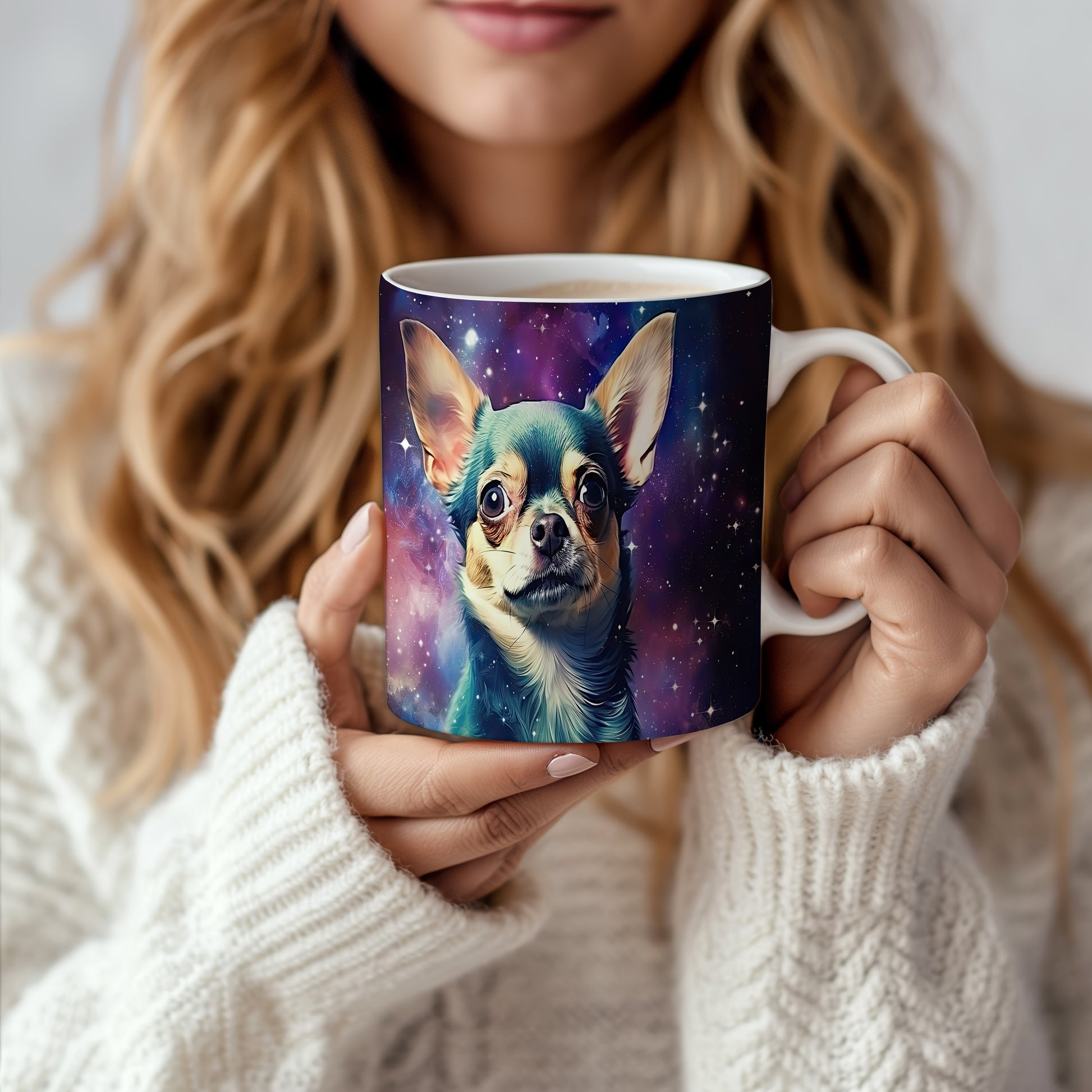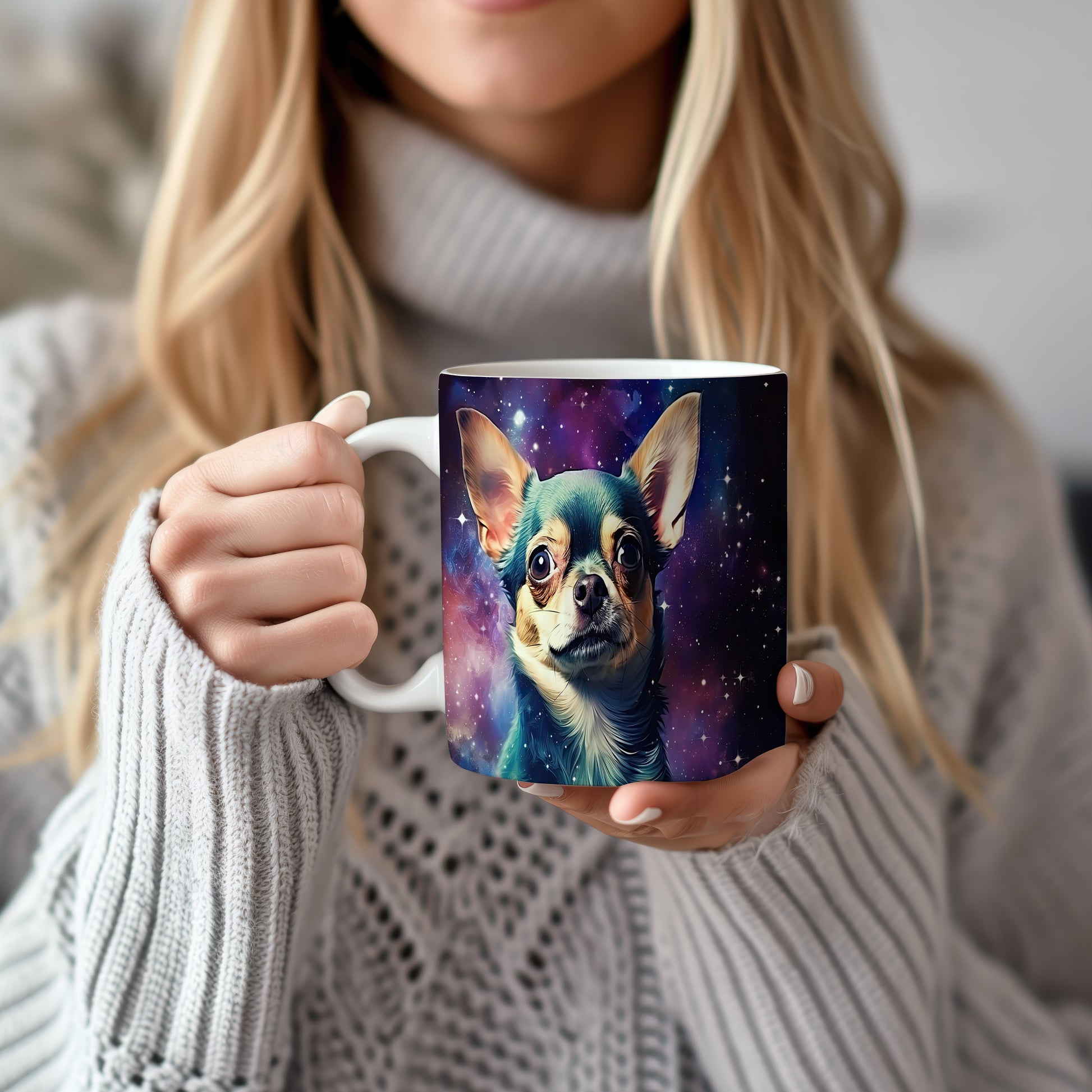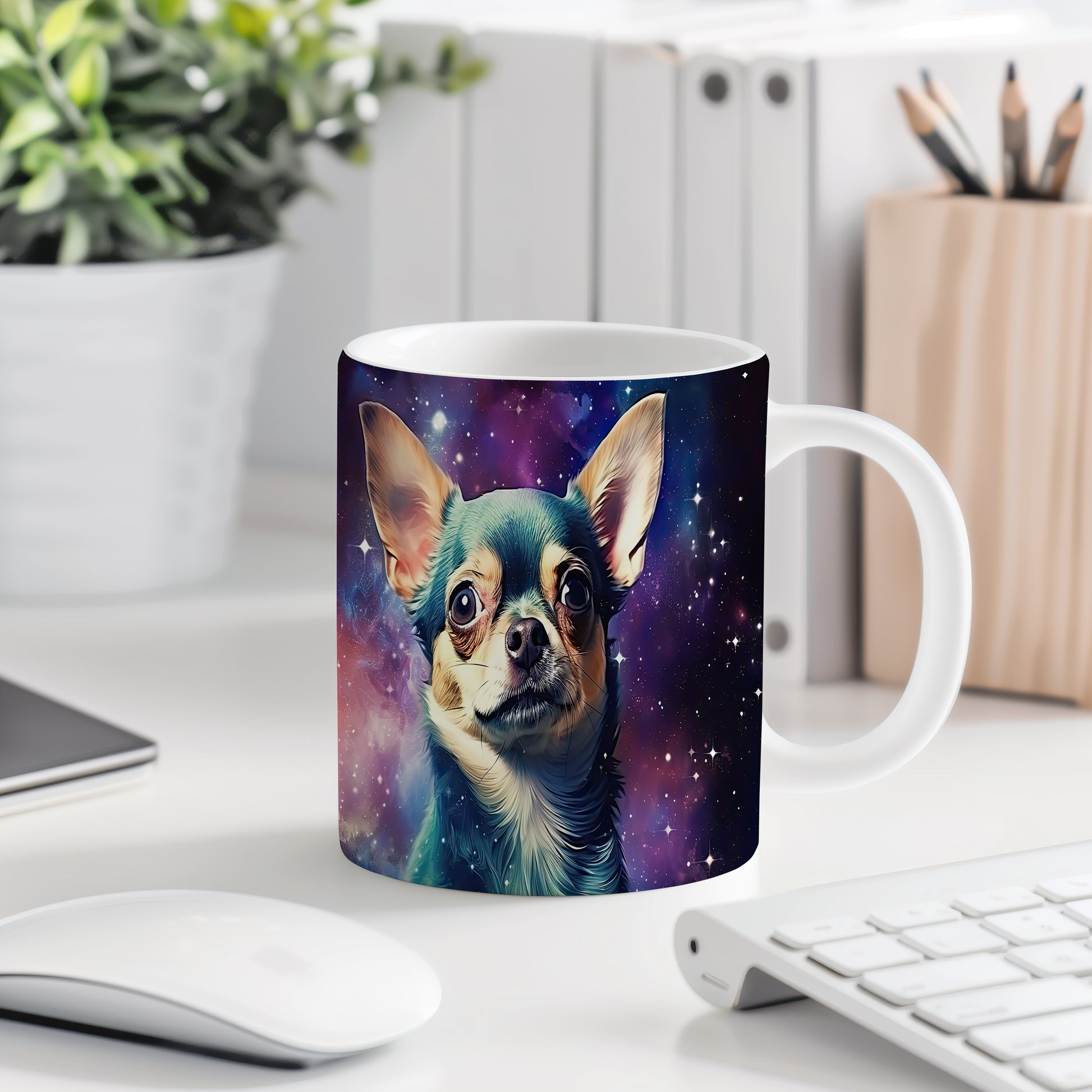 Hrnek s uměleckým zobrazením čivavy na galaktickém pozadí. Tento hrnek je ideální pro milovníky psů a vesmíru, skvělý tip na dárek pro každého, kdo má rád originální design. Materiál: keramika. Objem: 330 ml. Vhodné do myčky i mikrovlnky. Používání tohoto hrnku přináší radost z každého doušku.