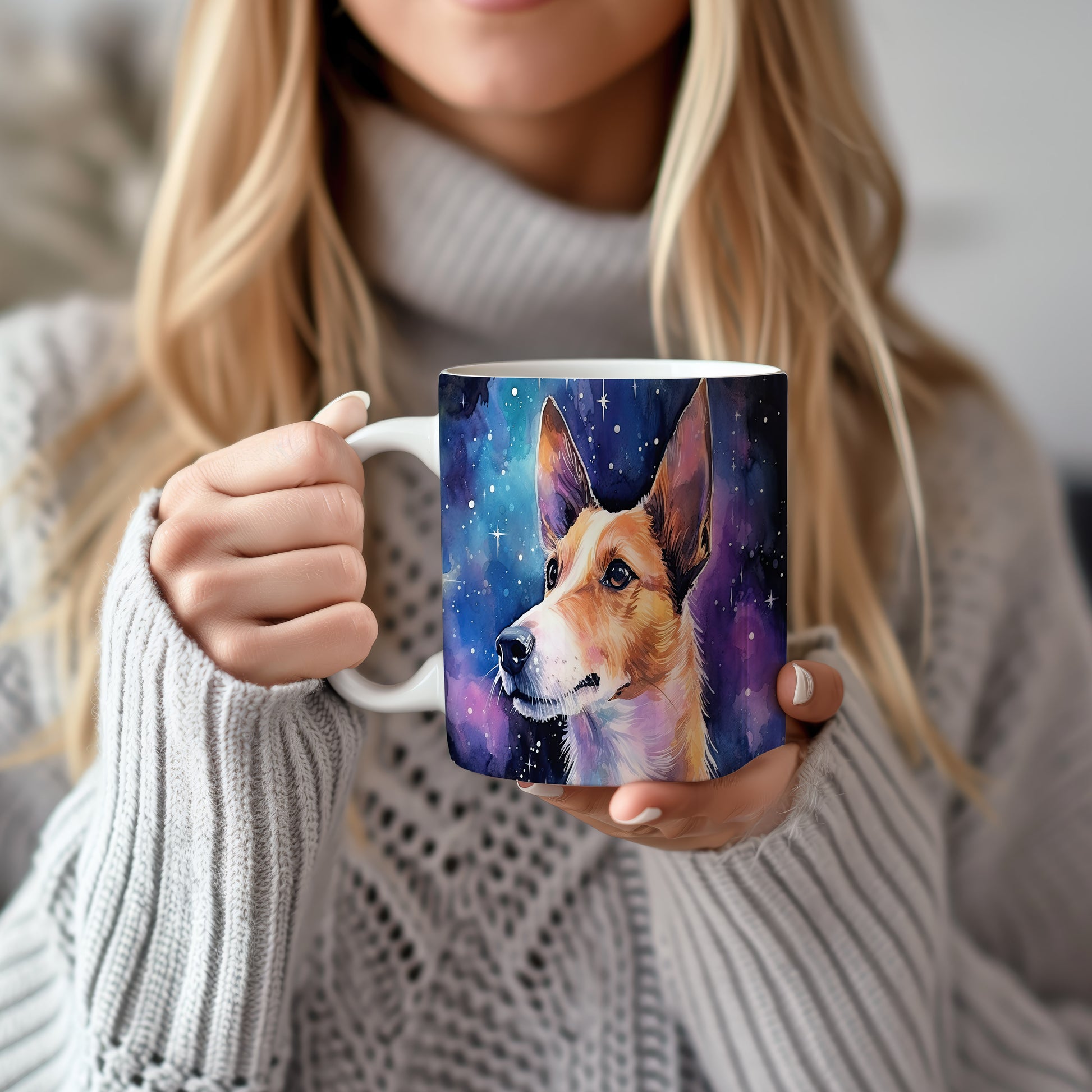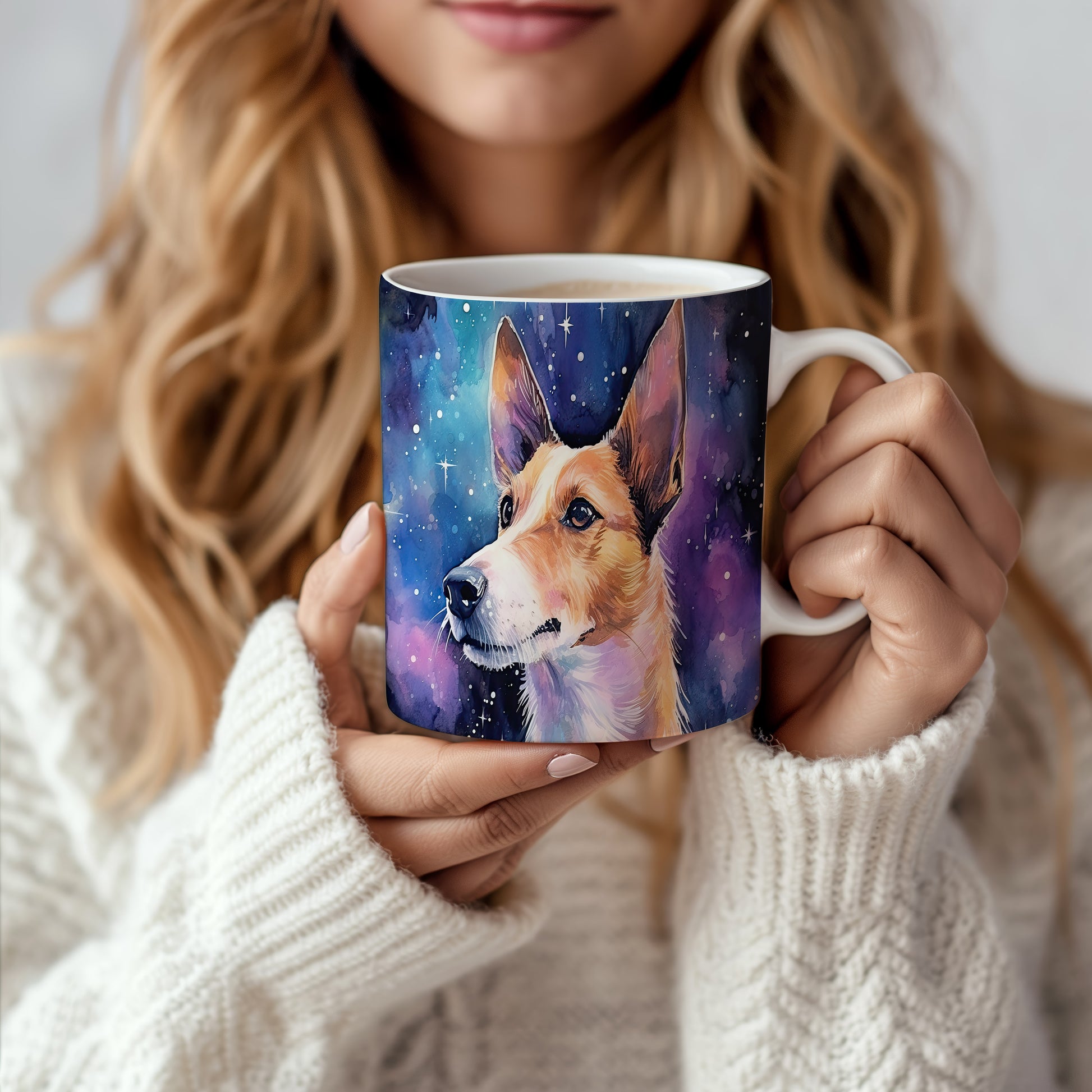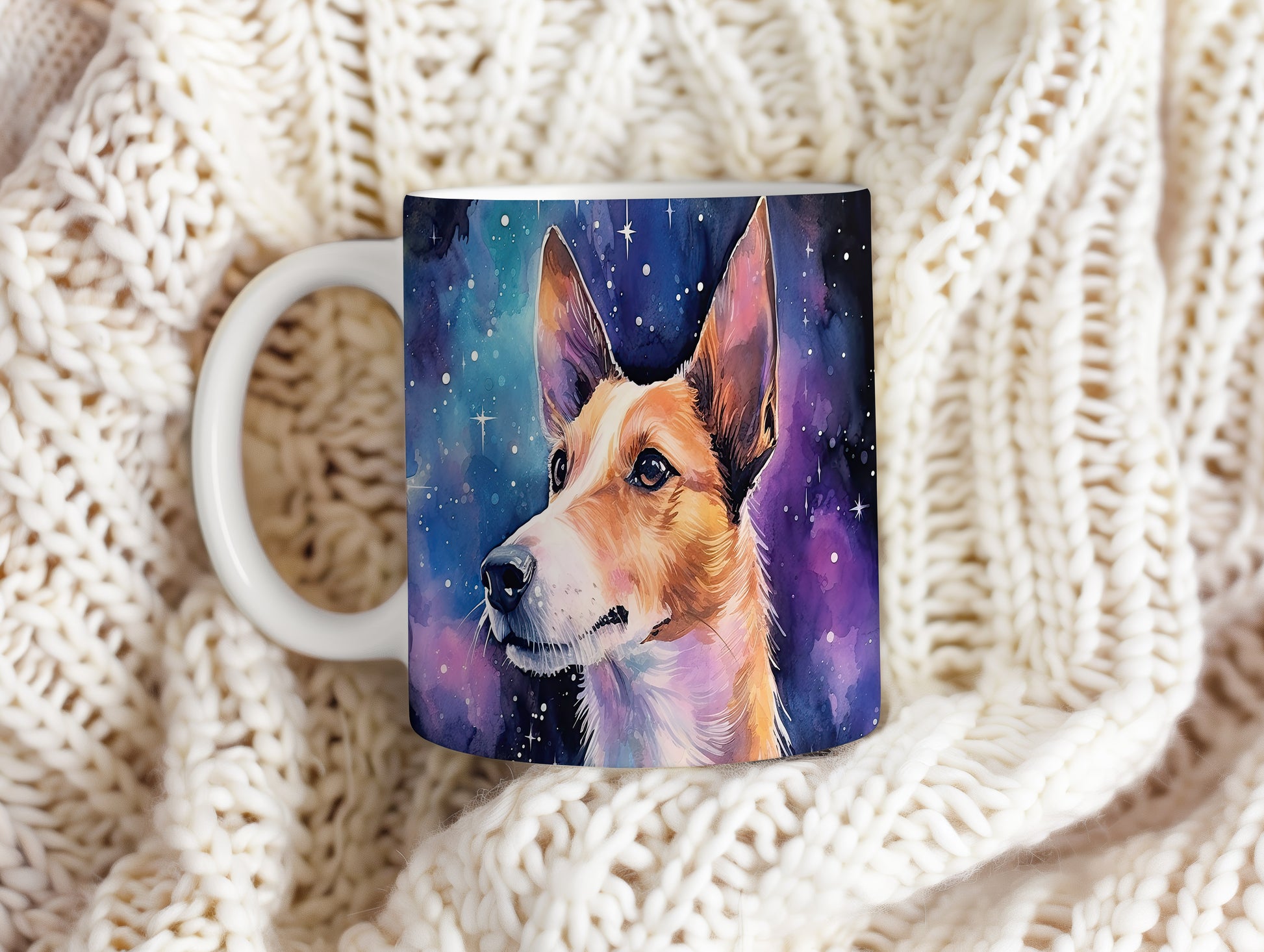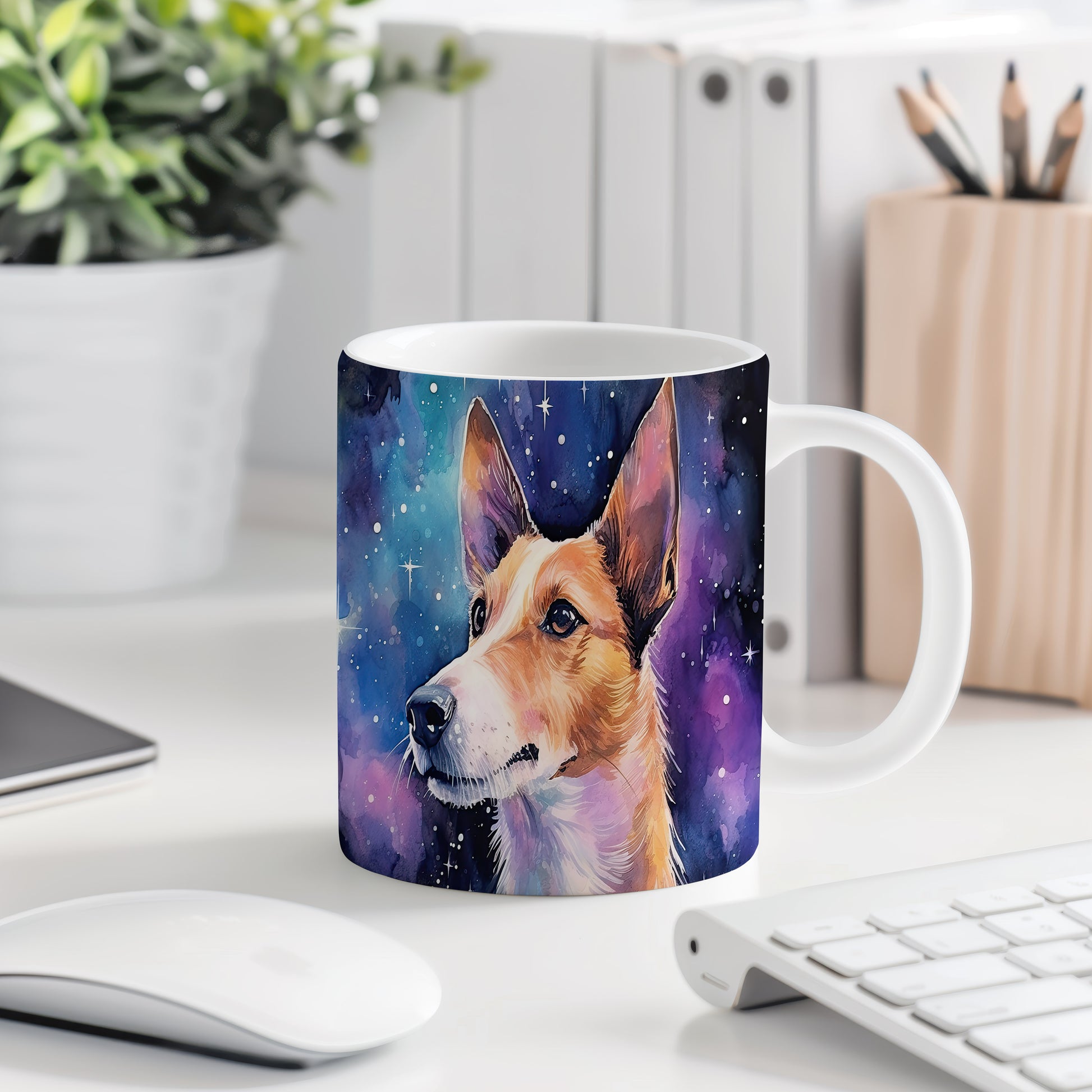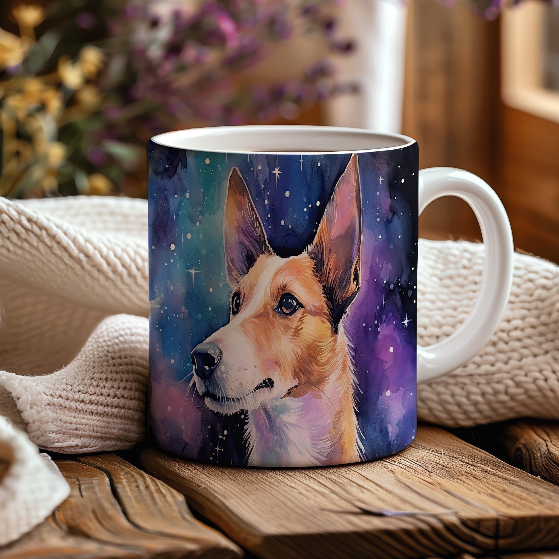 Hrnek s ilustrací psa v galaxii – kosmickým motivem
