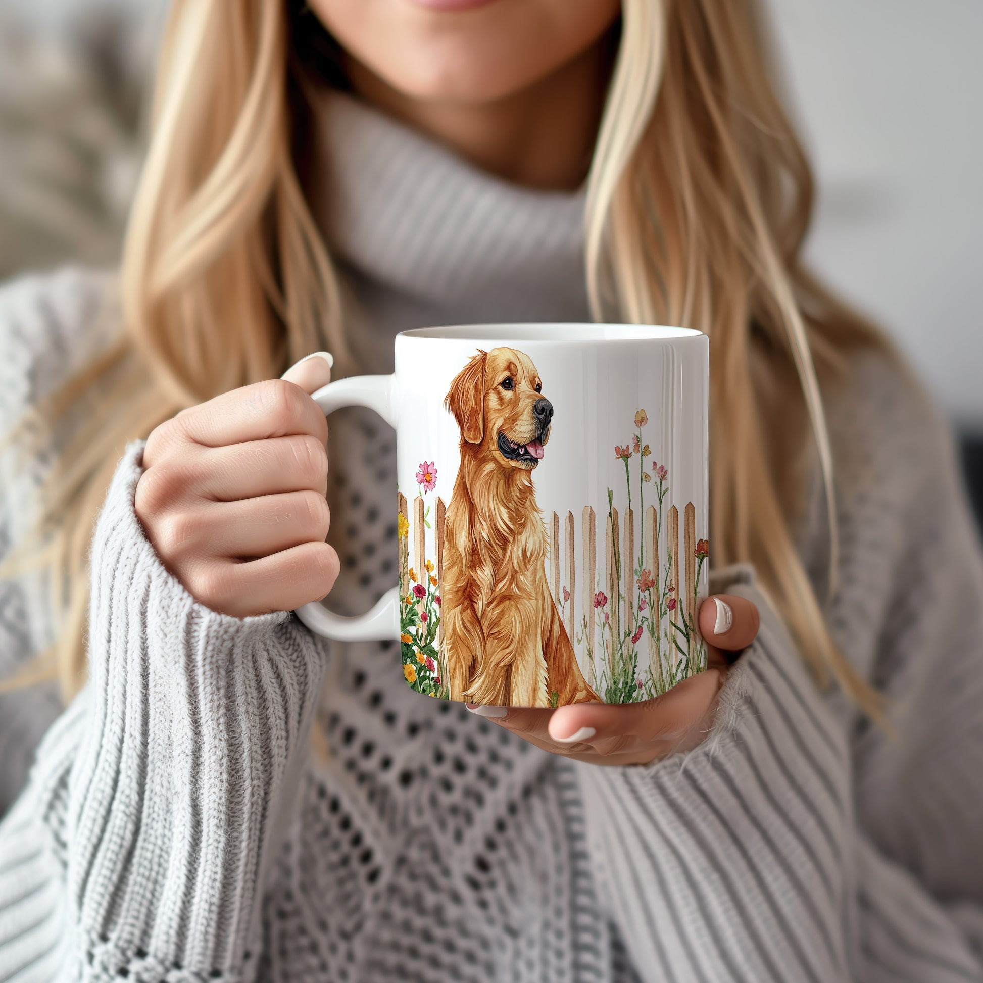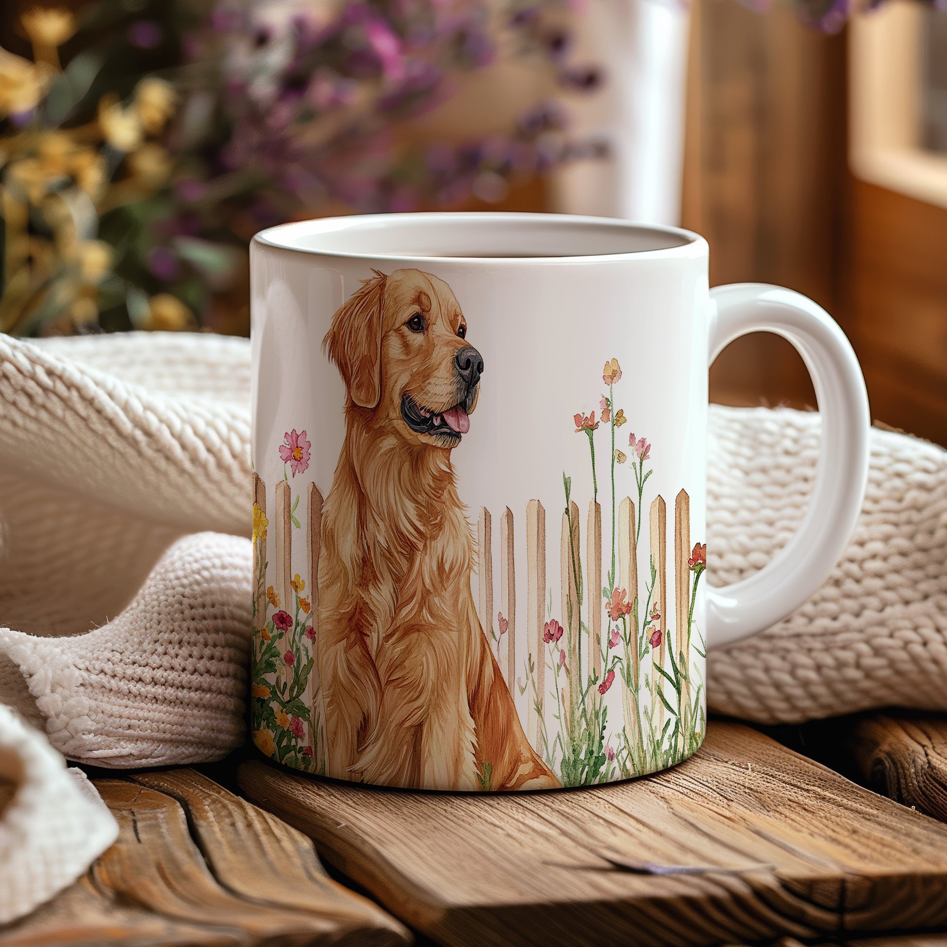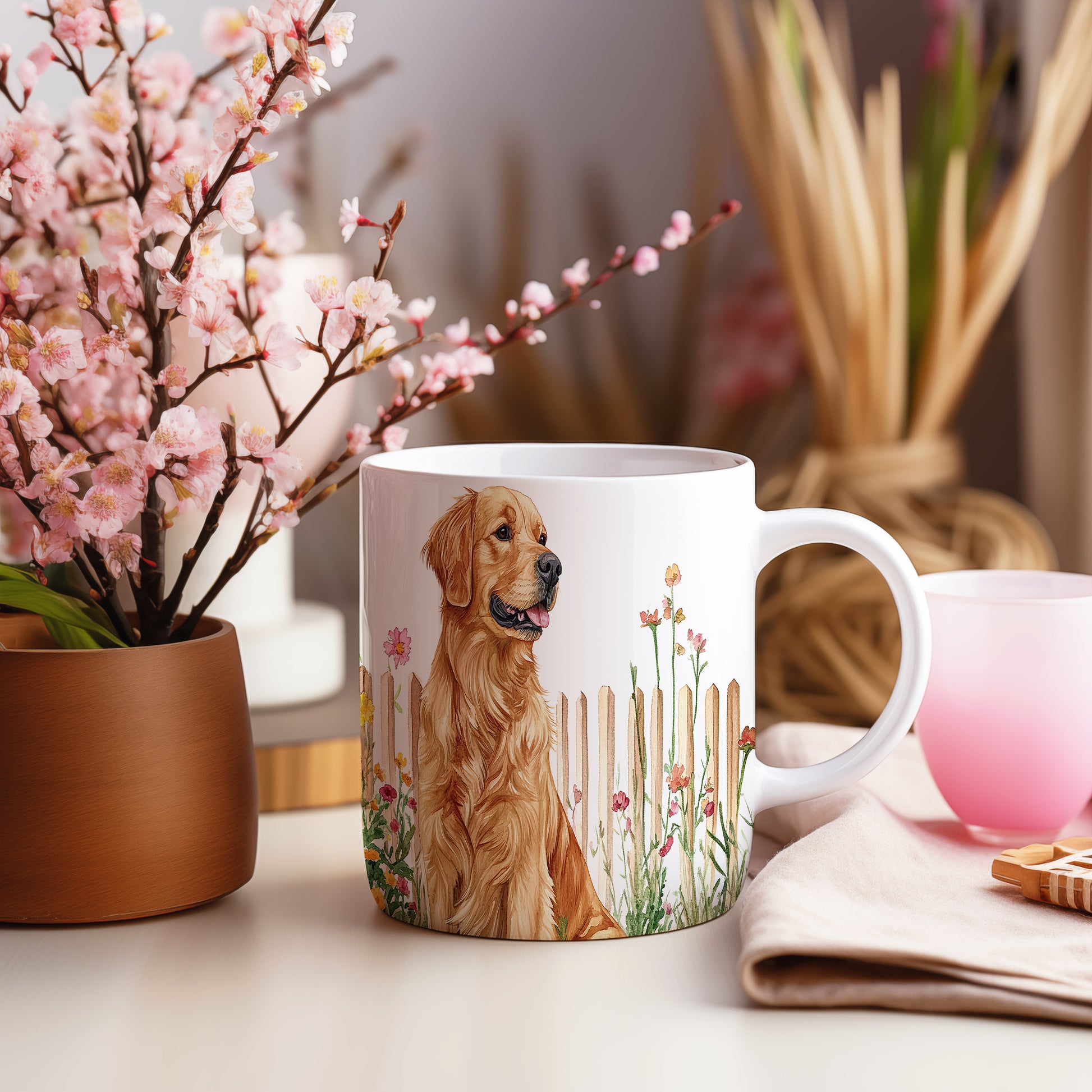 Hrnek s krásným provedením zlatého retrívra a květinami