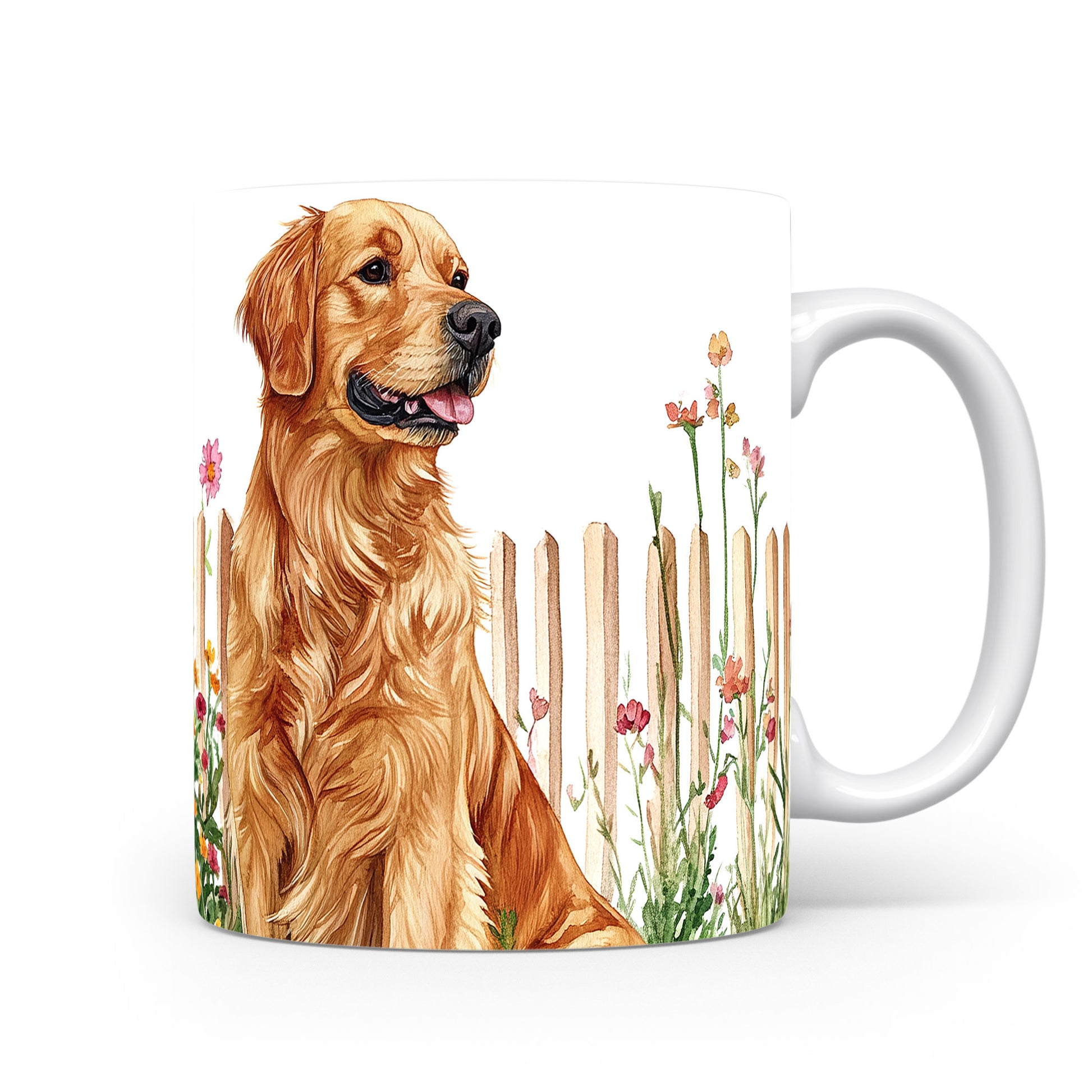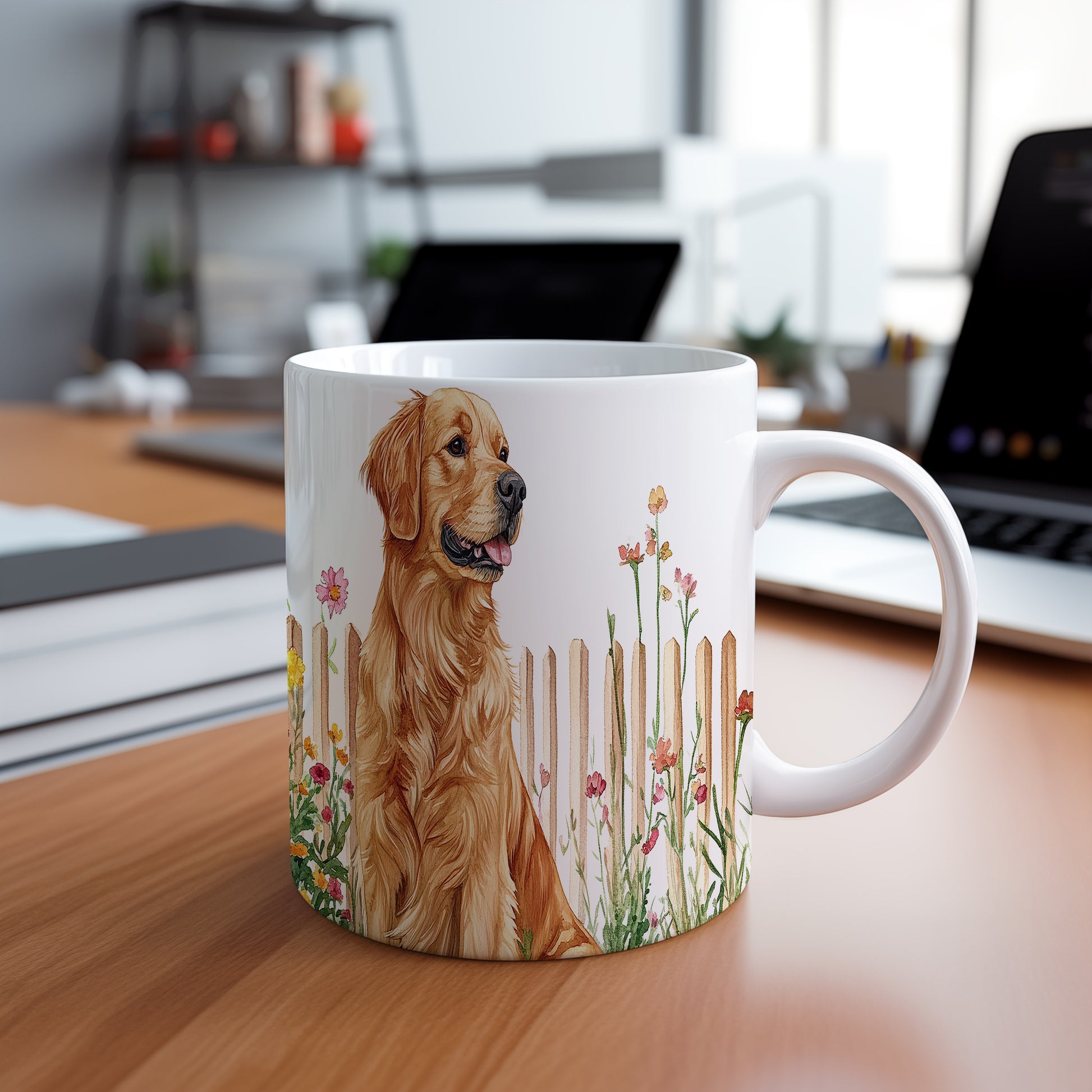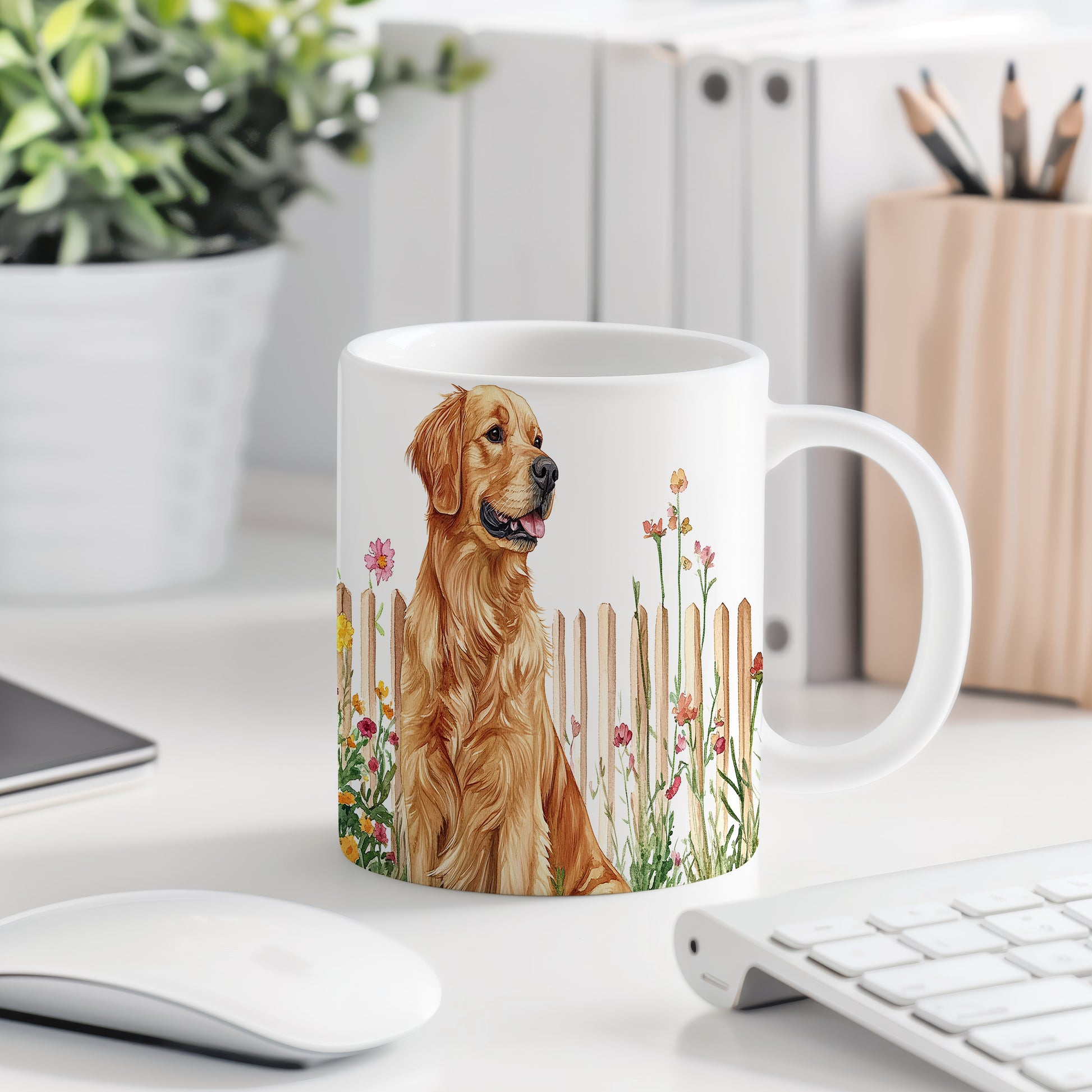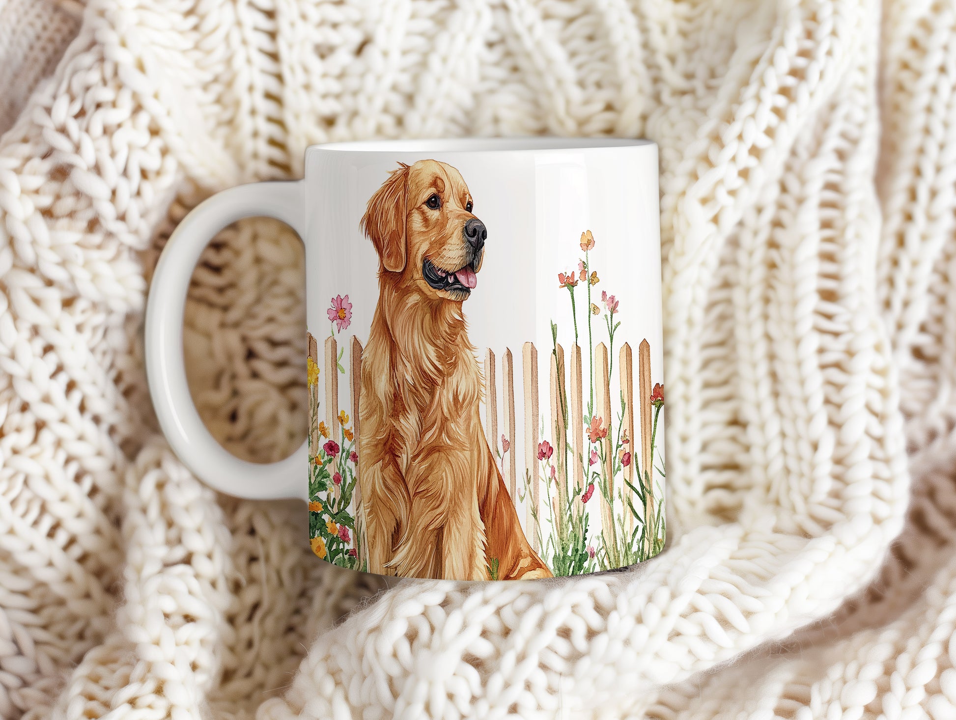 Hrnek s krásným provedením zlatého retrívra a květinami