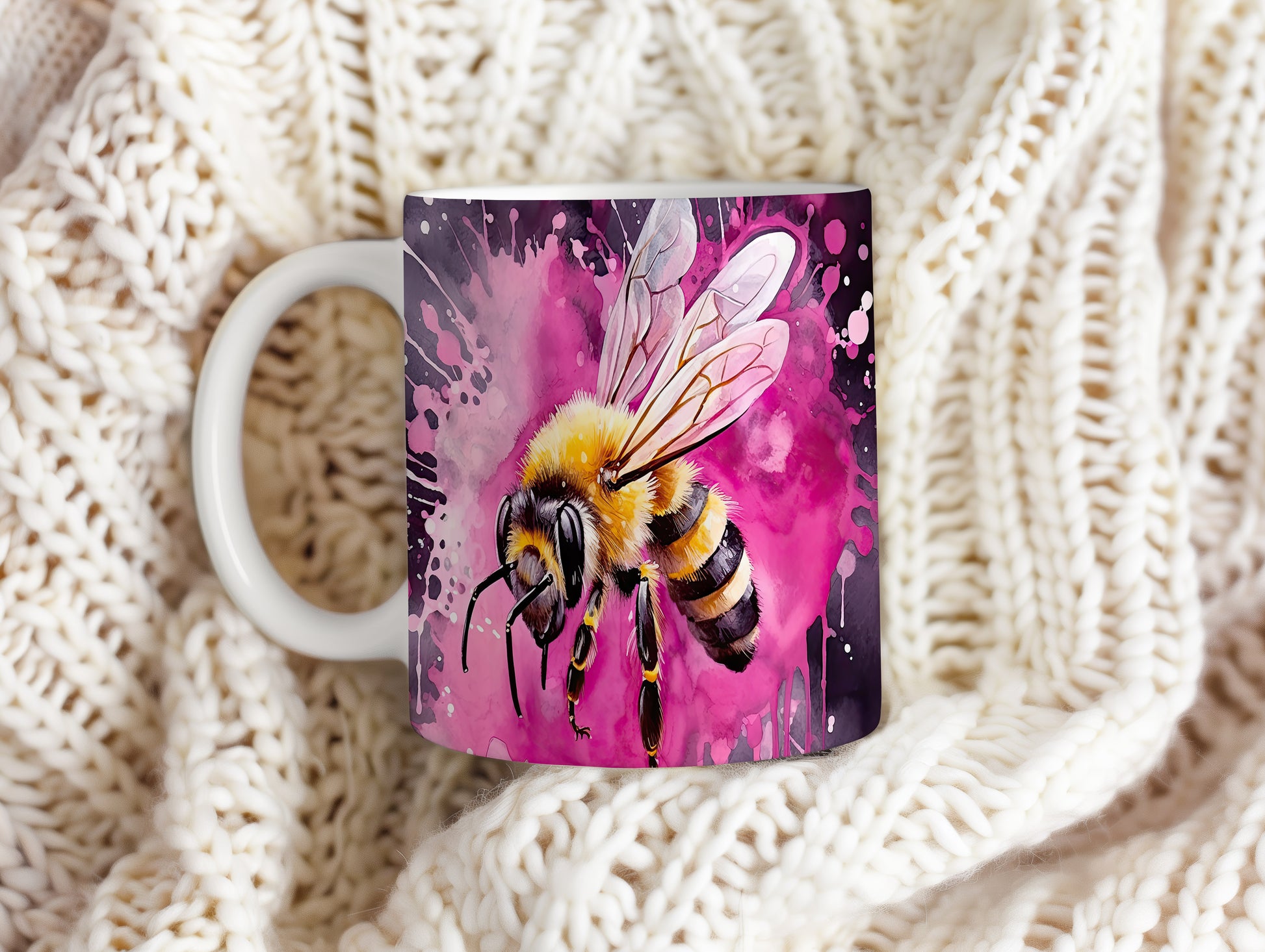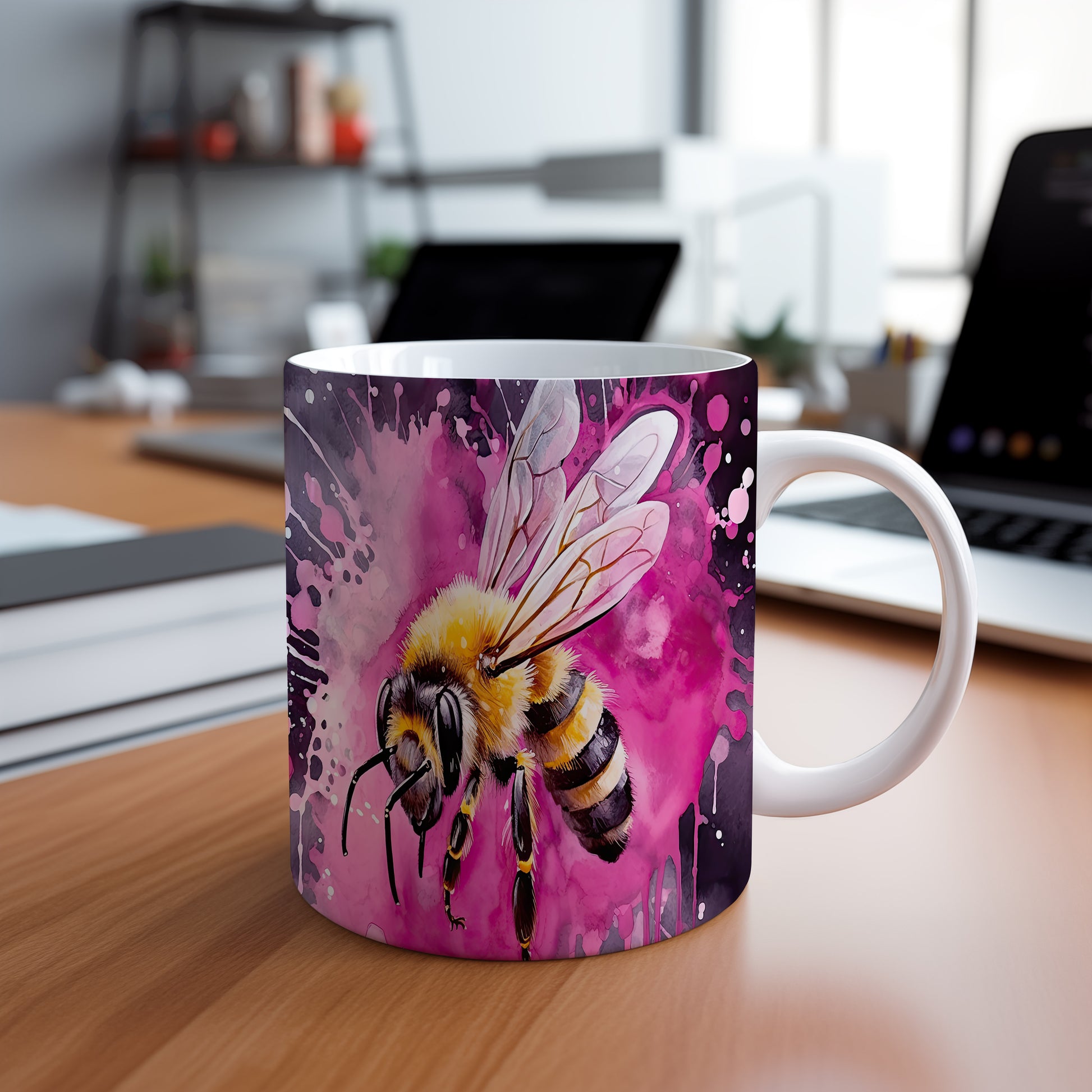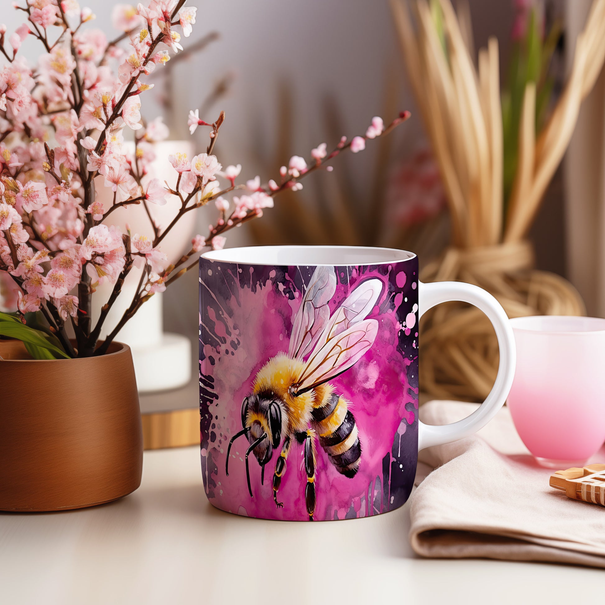 Hrnek s ilustrací včely na růžovém pozadí