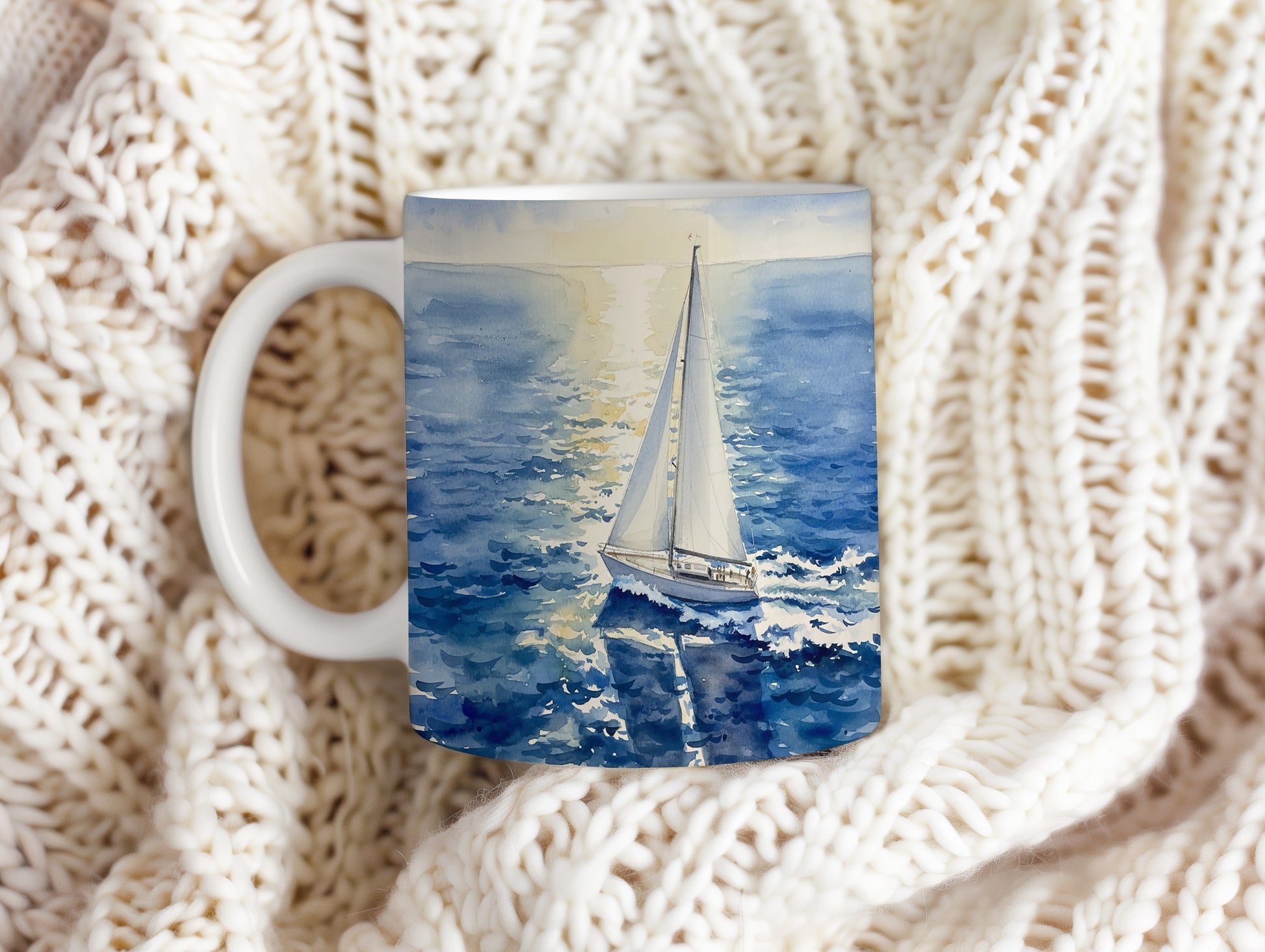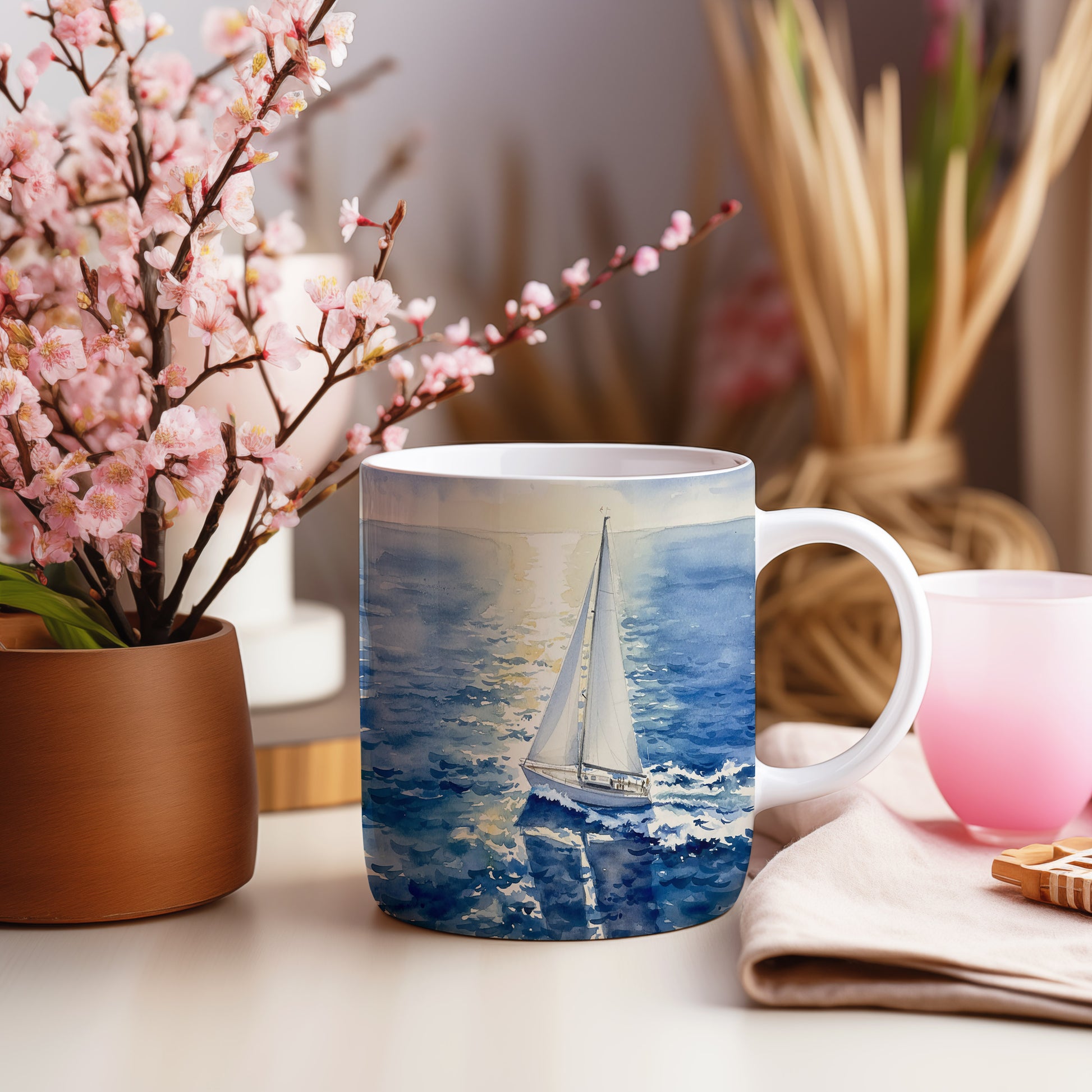 Užijte si klid moře s tímto hrnkem s akvarelovou jachtou v západu slunce. Ideální pro milovníky plachtění. Hrnek 330 ml – vhodný do myčky i mikrovlnky.
