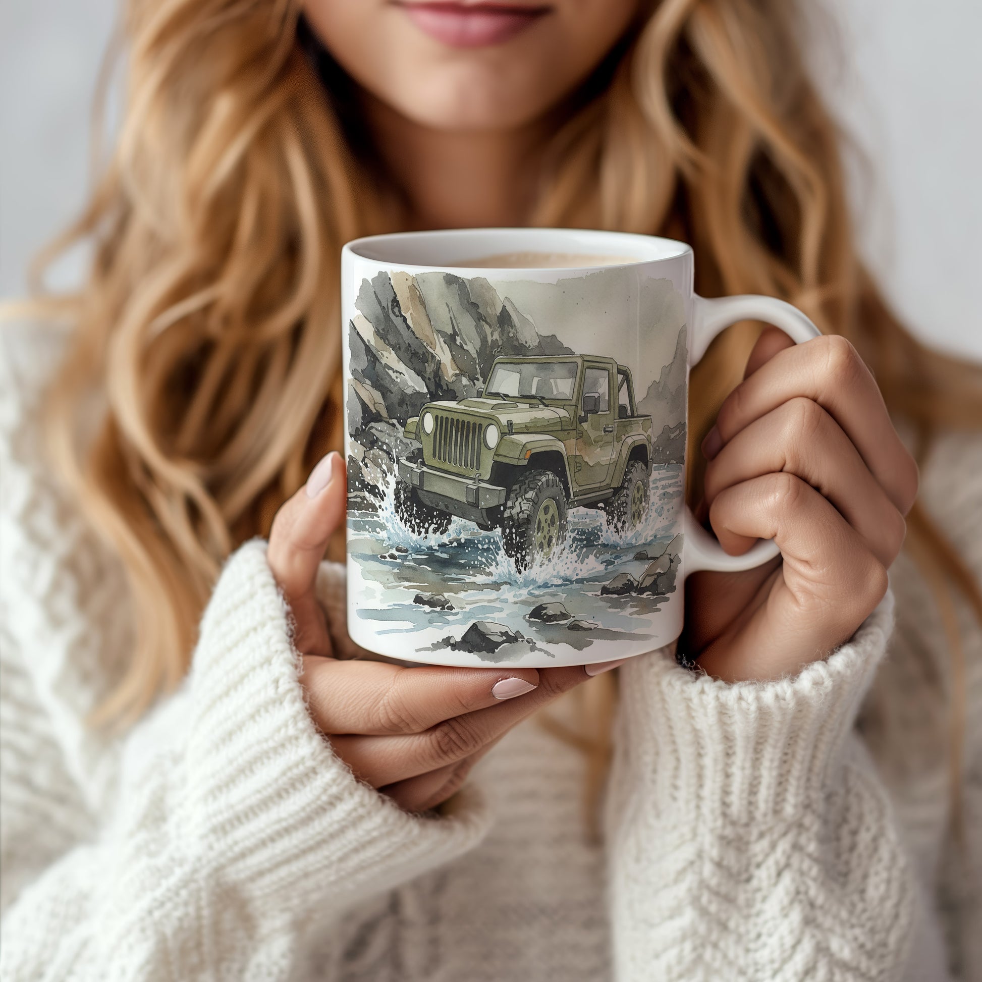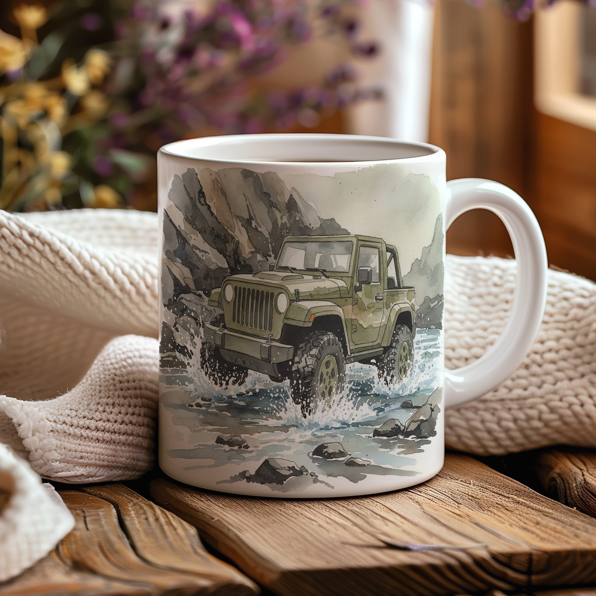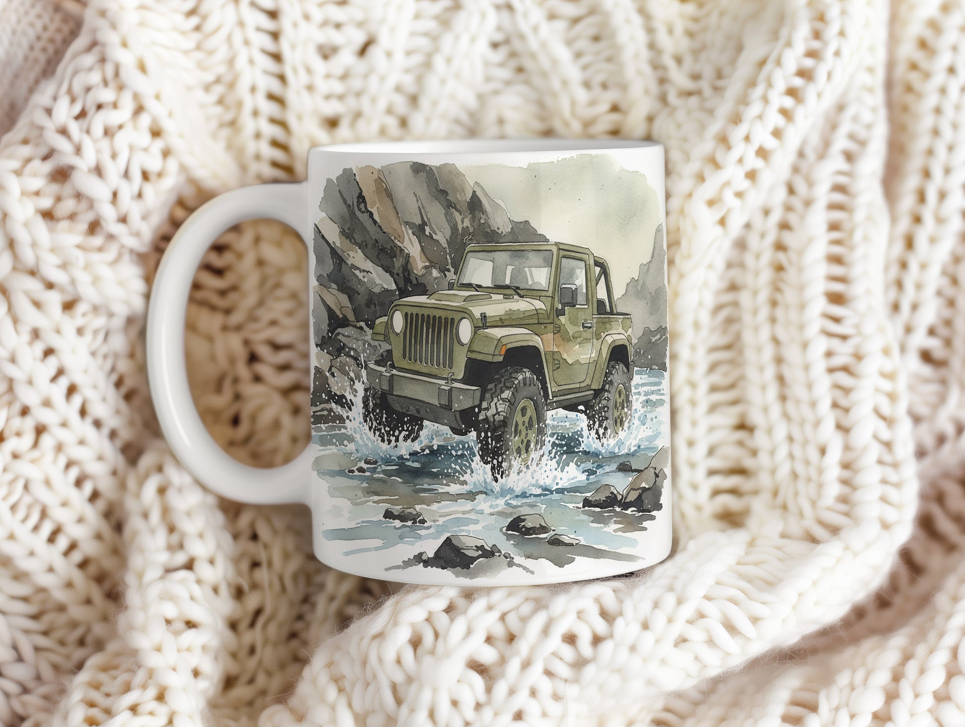Objevte kouzlo dobrodružství s tímto hrnkem, na kterém jeep překonává divokou řeku. Akvarel přináší pocit svobody a síly. Hrnek 330 ml – vhodný do myčky i mikrovlnky.