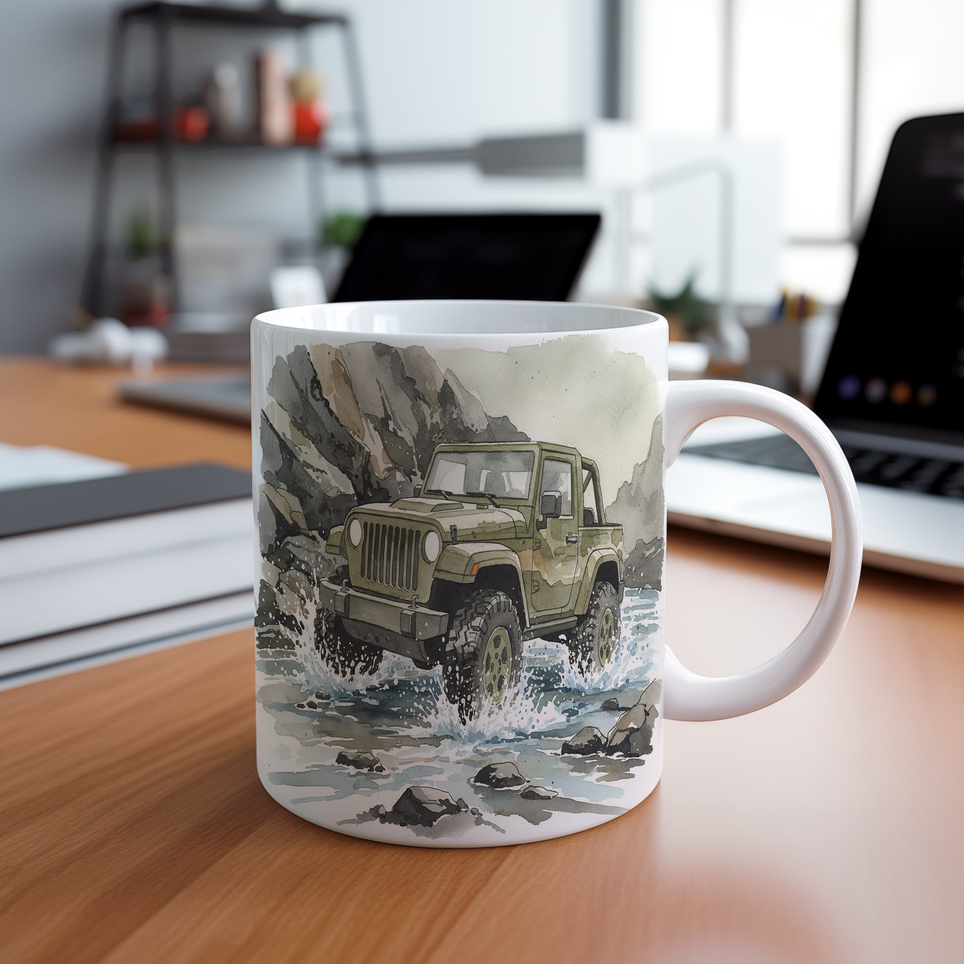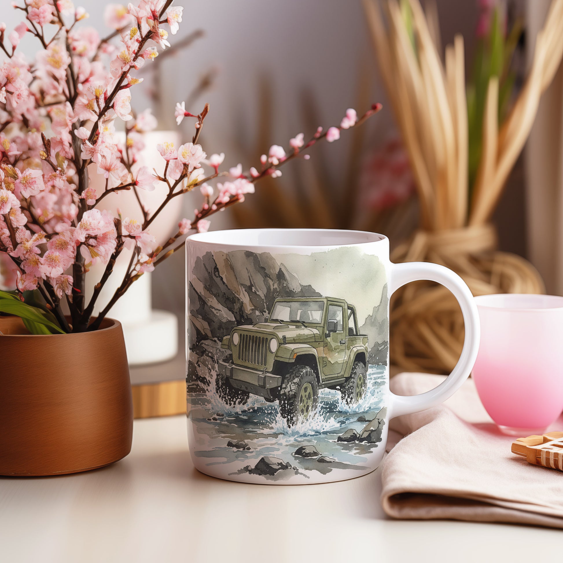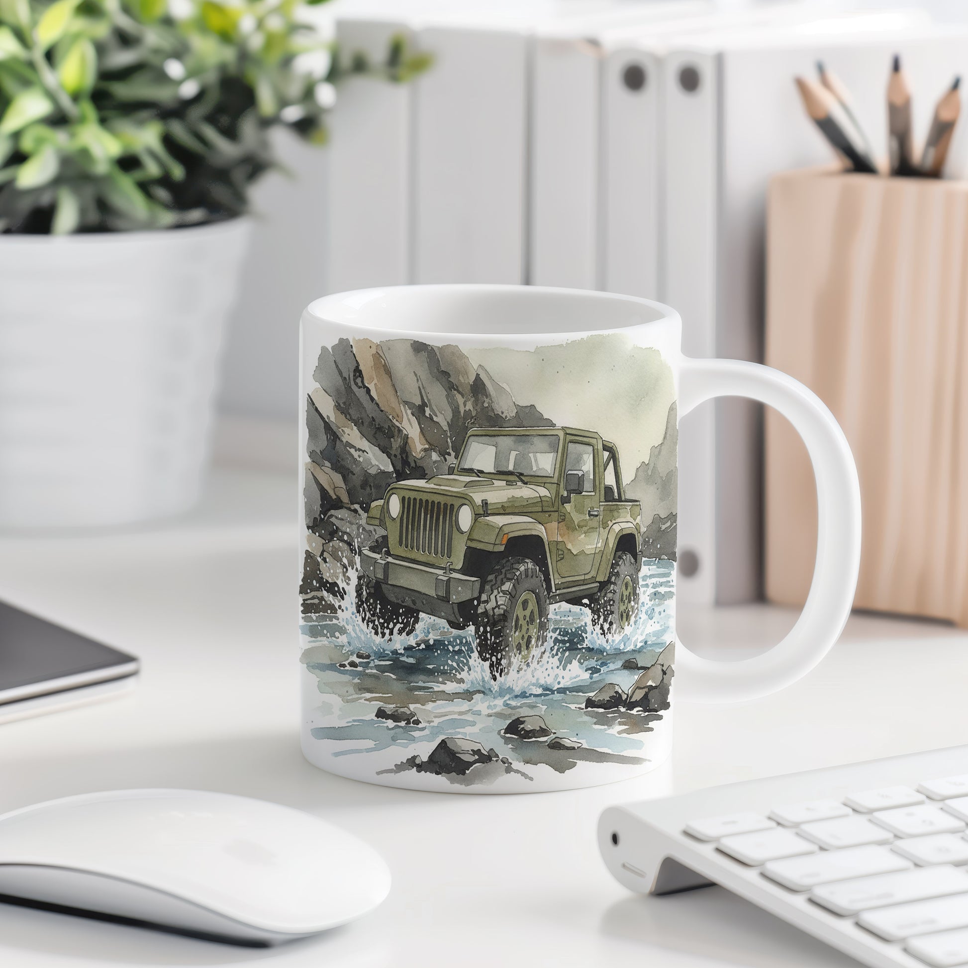 Objevte kouzlo dobrodružství s tímto hrnkem, na kterém jeep překonává divokou řeku. Akvarel přináší pocit svobody a síly. Hrnek 330 ml – vhodný do myčky i mikrovlnky.