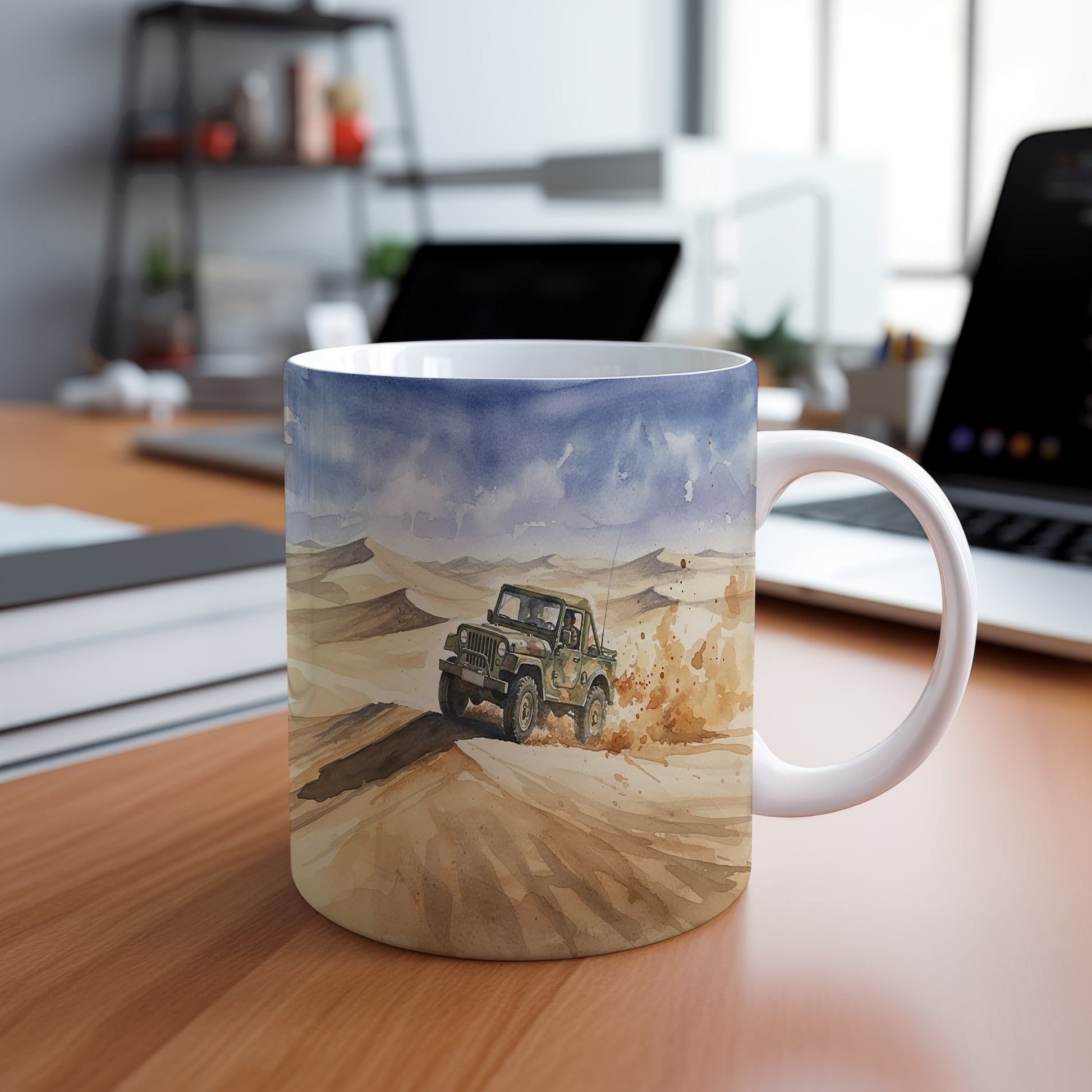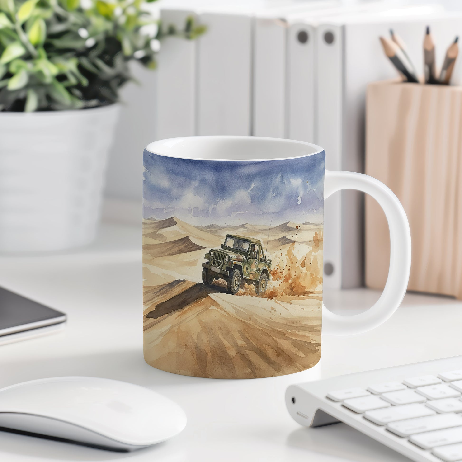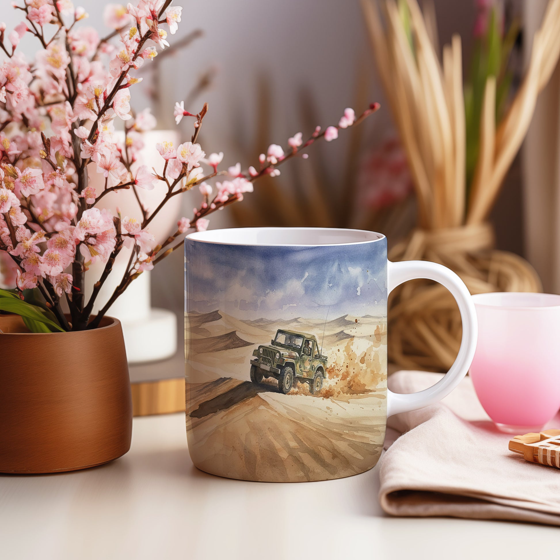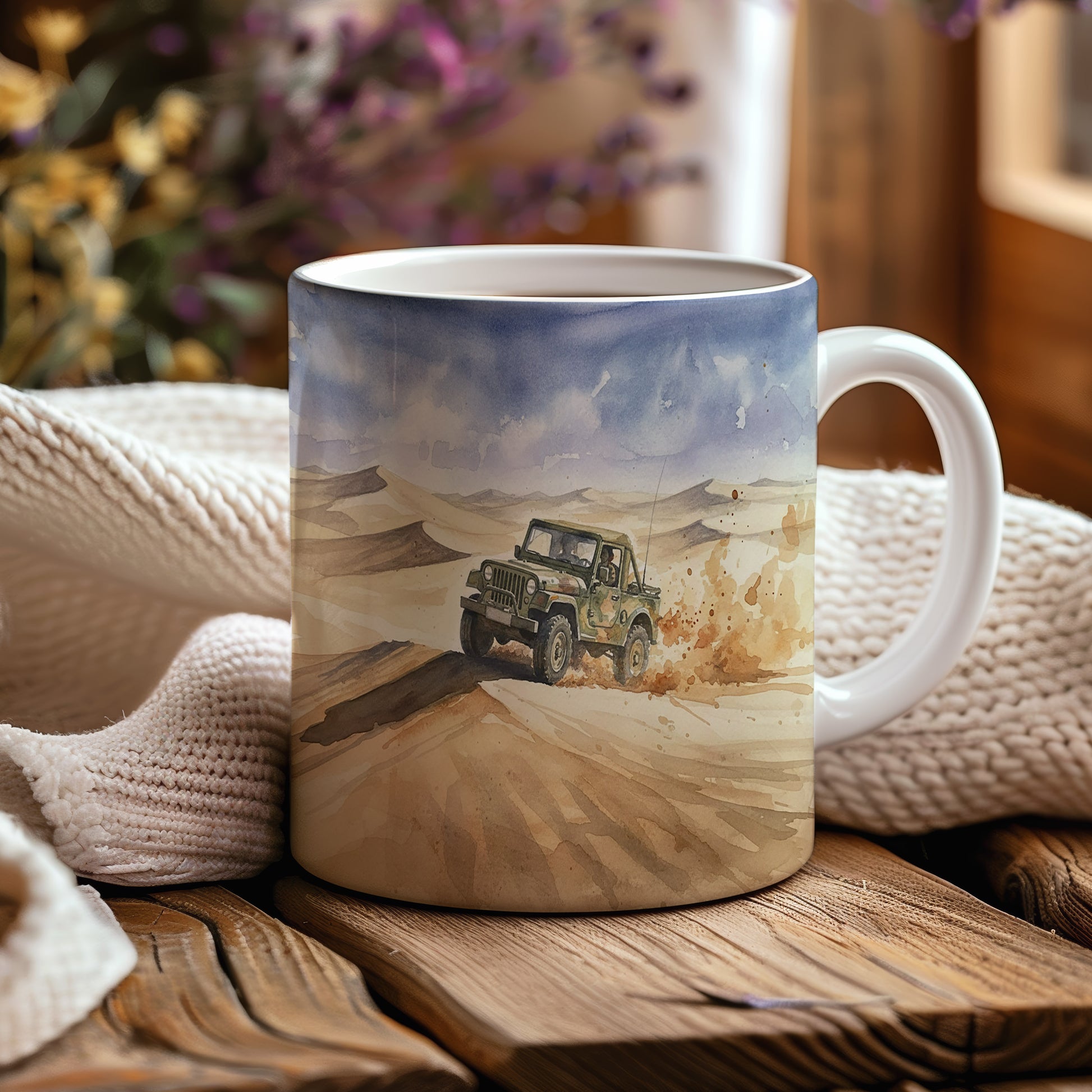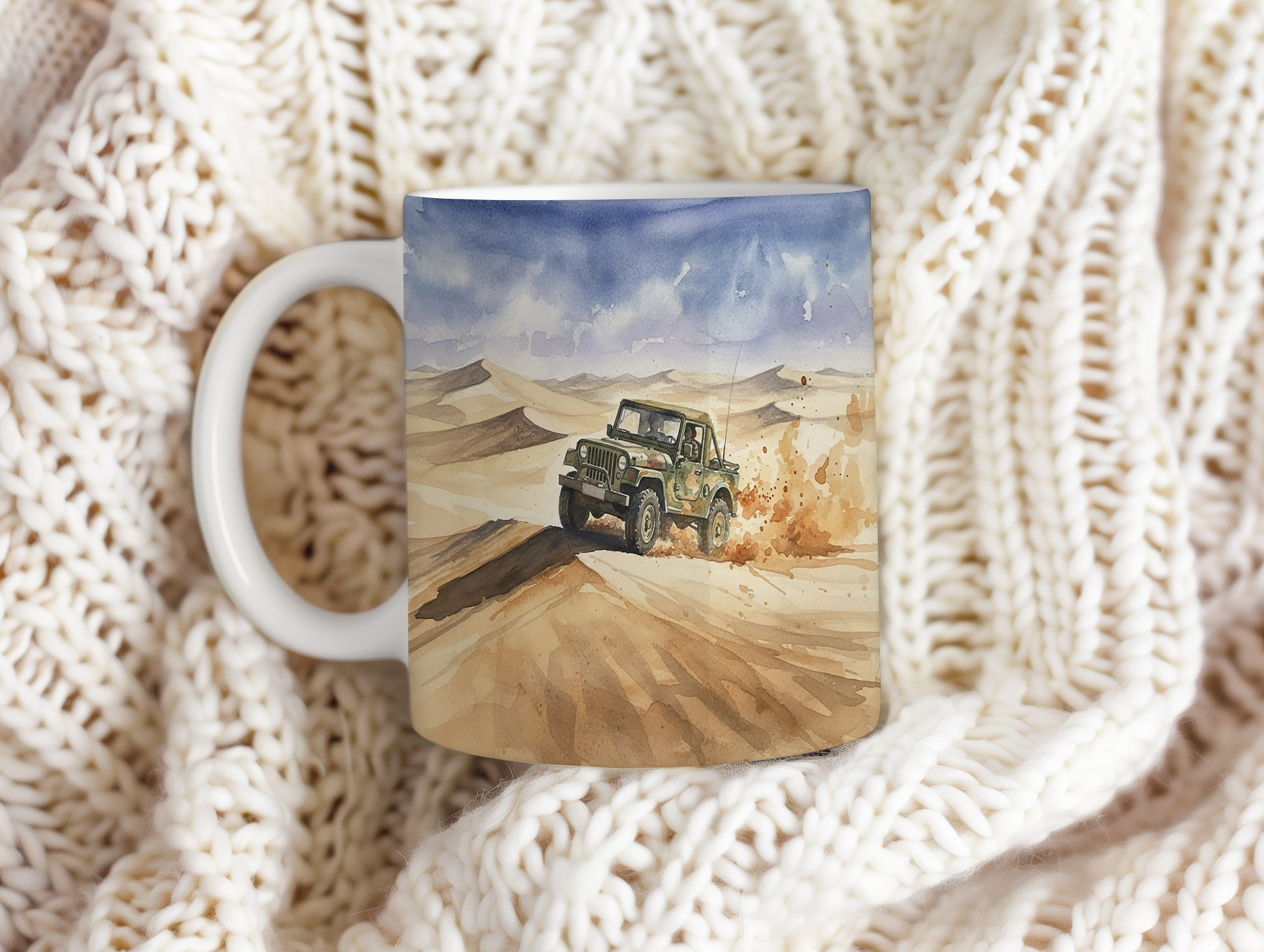 Objevte dobrodružství s hrnkem, na kterém jeep brázdí písečné duny. Perfektní pro milovníky terénních vozidel. Hrnek 330 ml – vhodný do myčky i mikrovlnky.
