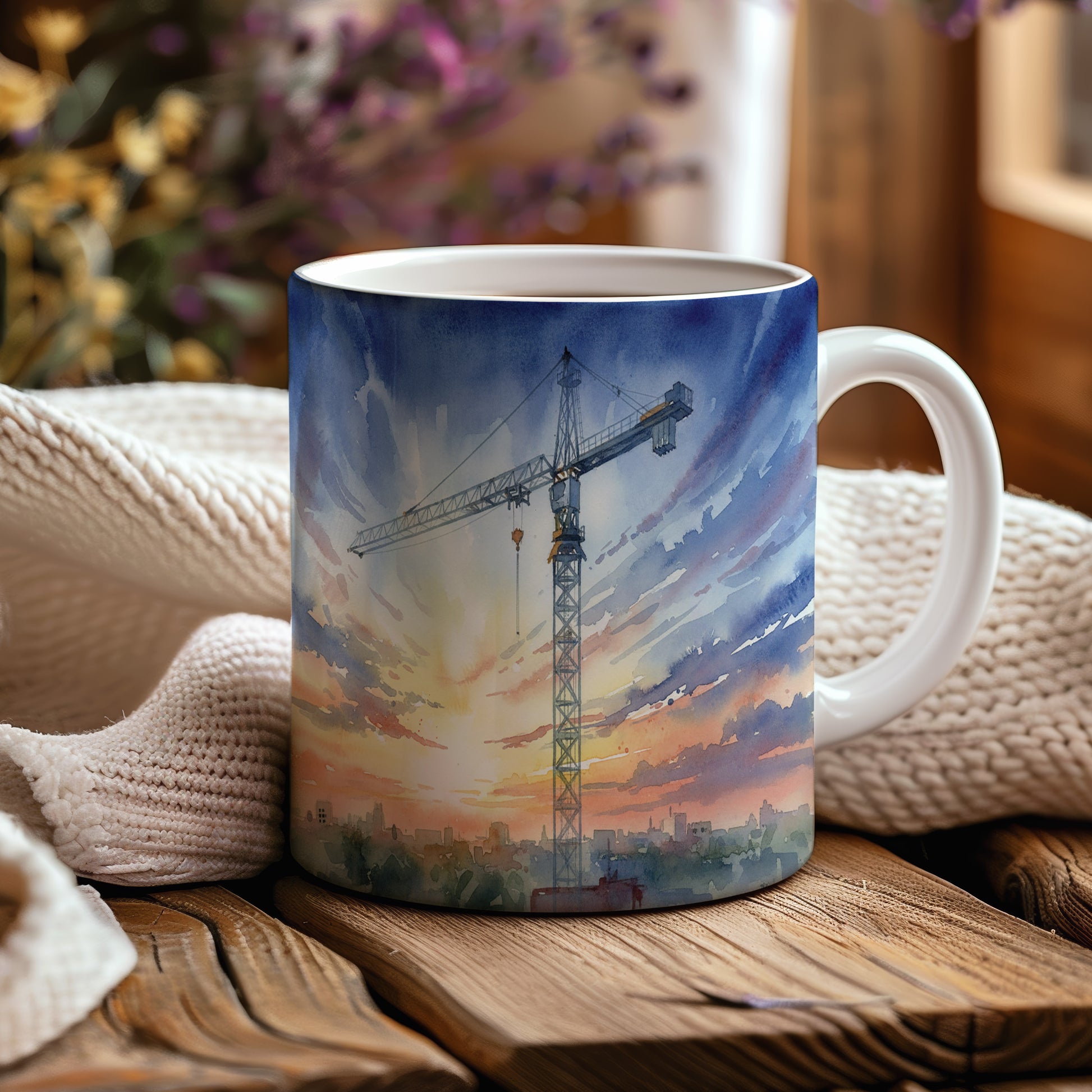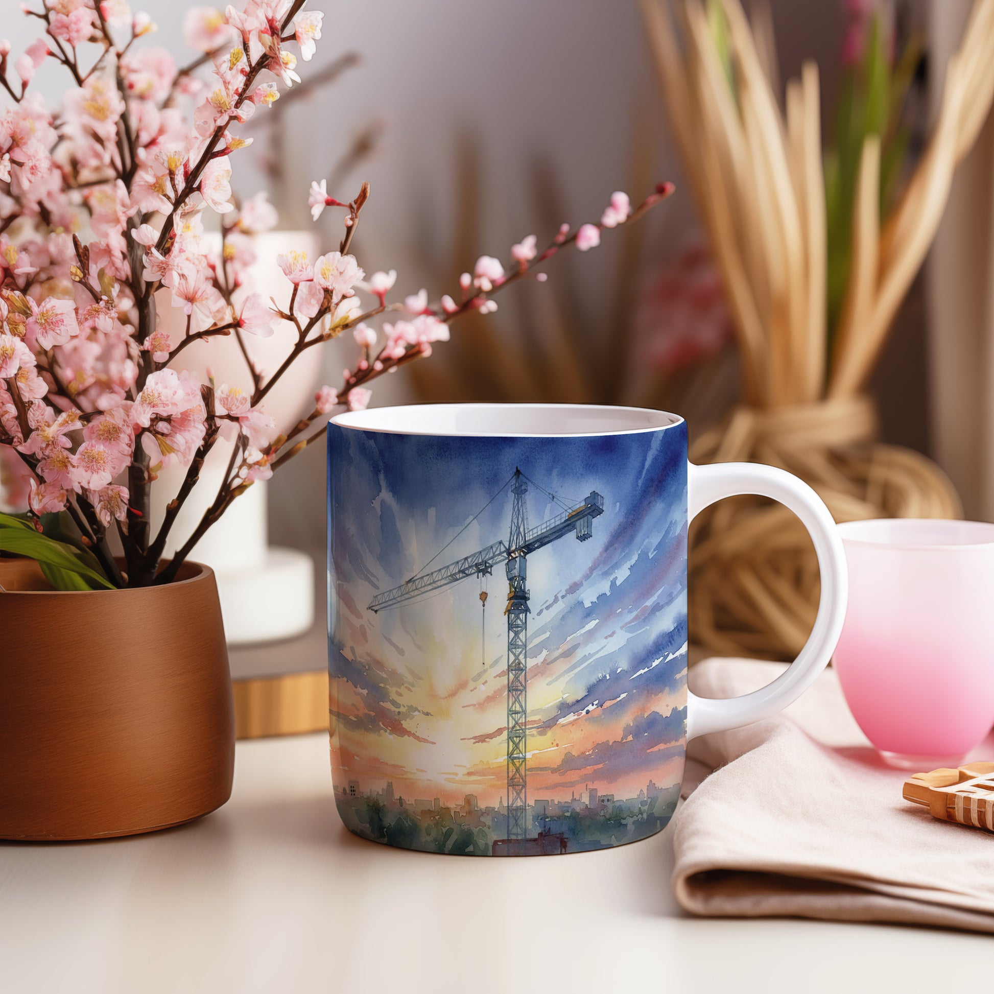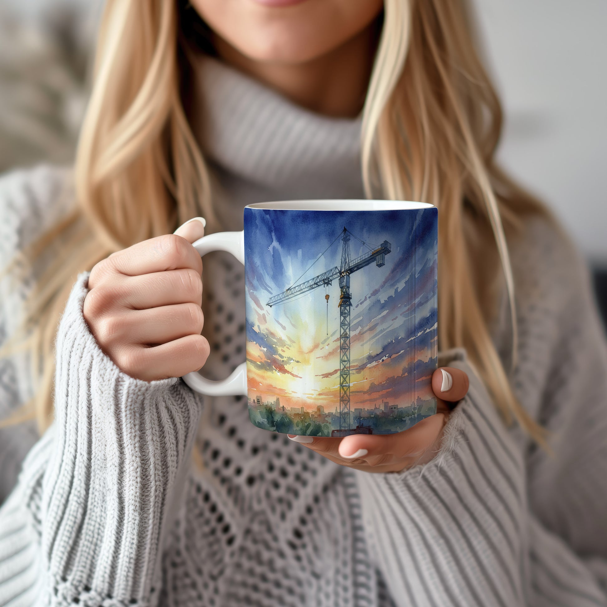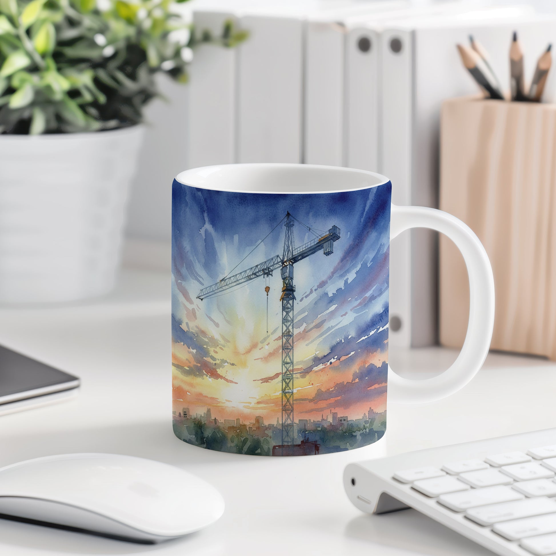 Objevte krásu akvarelového motivu jeřábu, který se tyčí nad městským panoramatem za svítání. Hrnek 330 ml – vhodný do myčky i mikrovlnky.