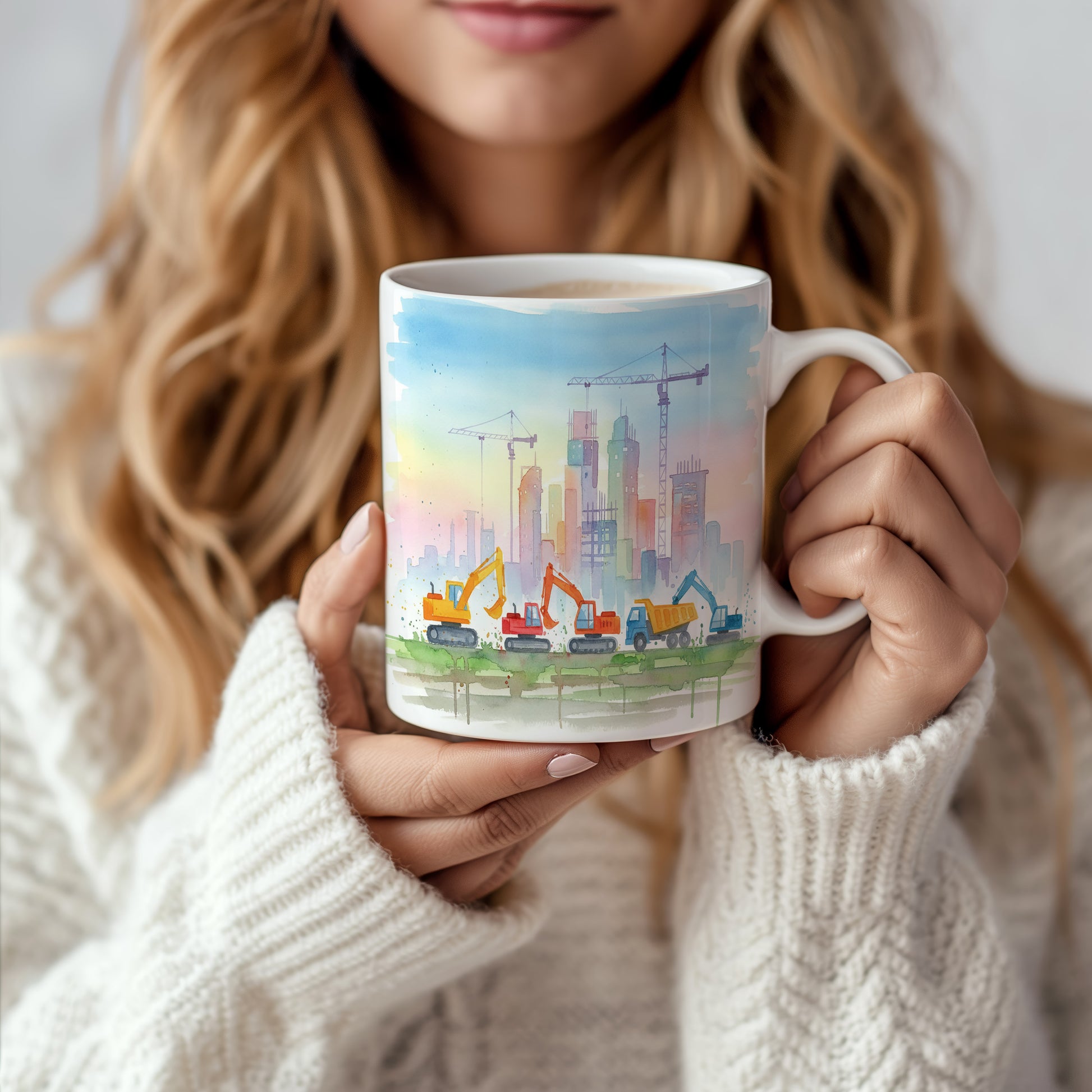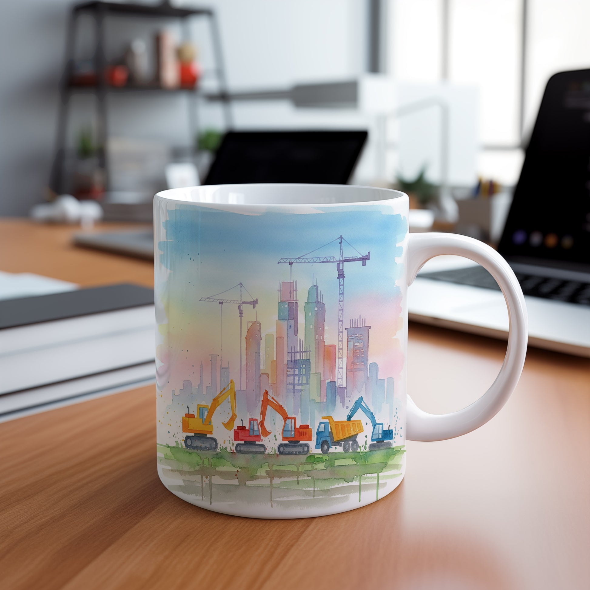 Objevte krásu stavby s hrnkem zobrazujícím jeřáby v akvarelovém stylu. Ideální pro milovníky stavebních strojů. Hrnek 330 ml – vhodný do myčky i mikrovlnky.