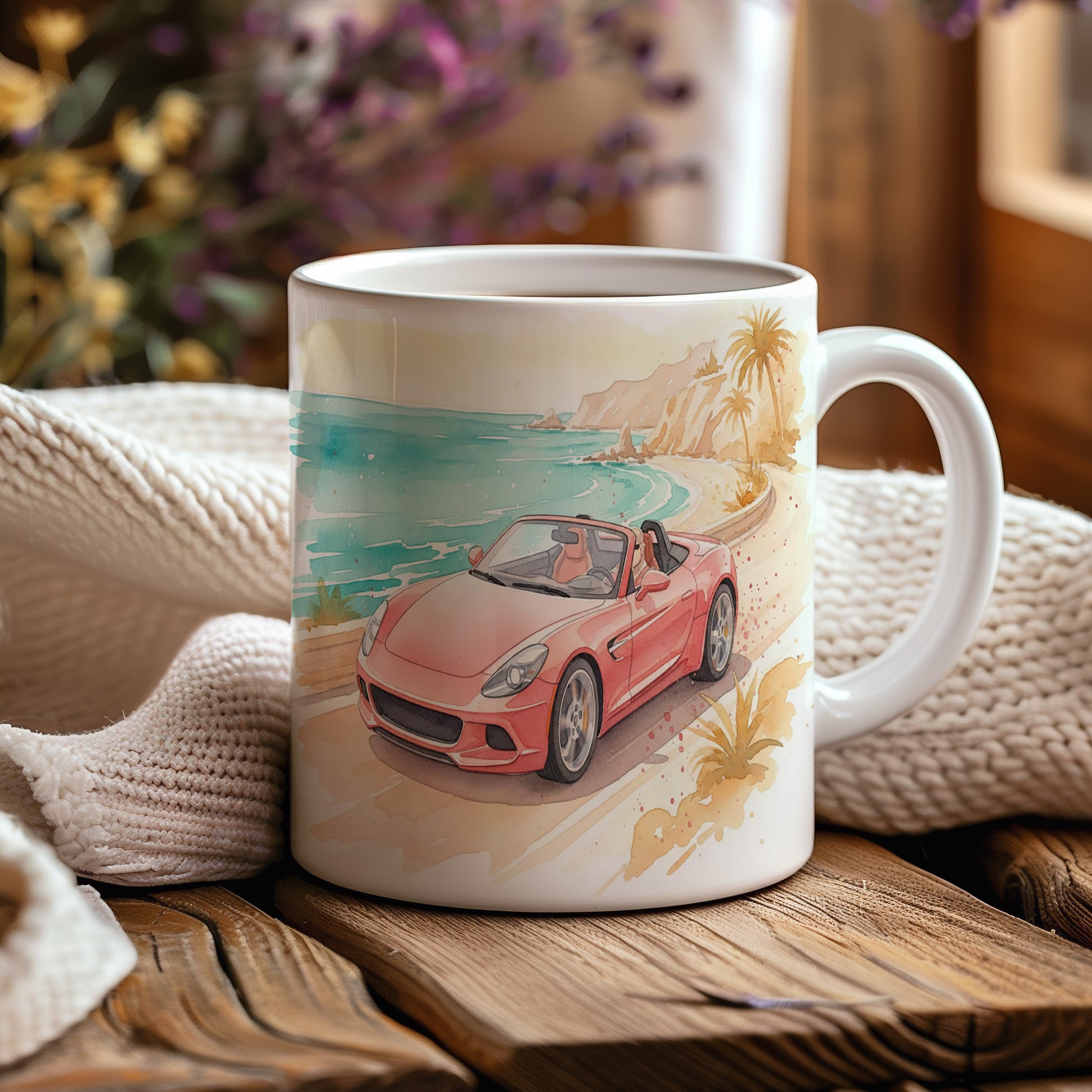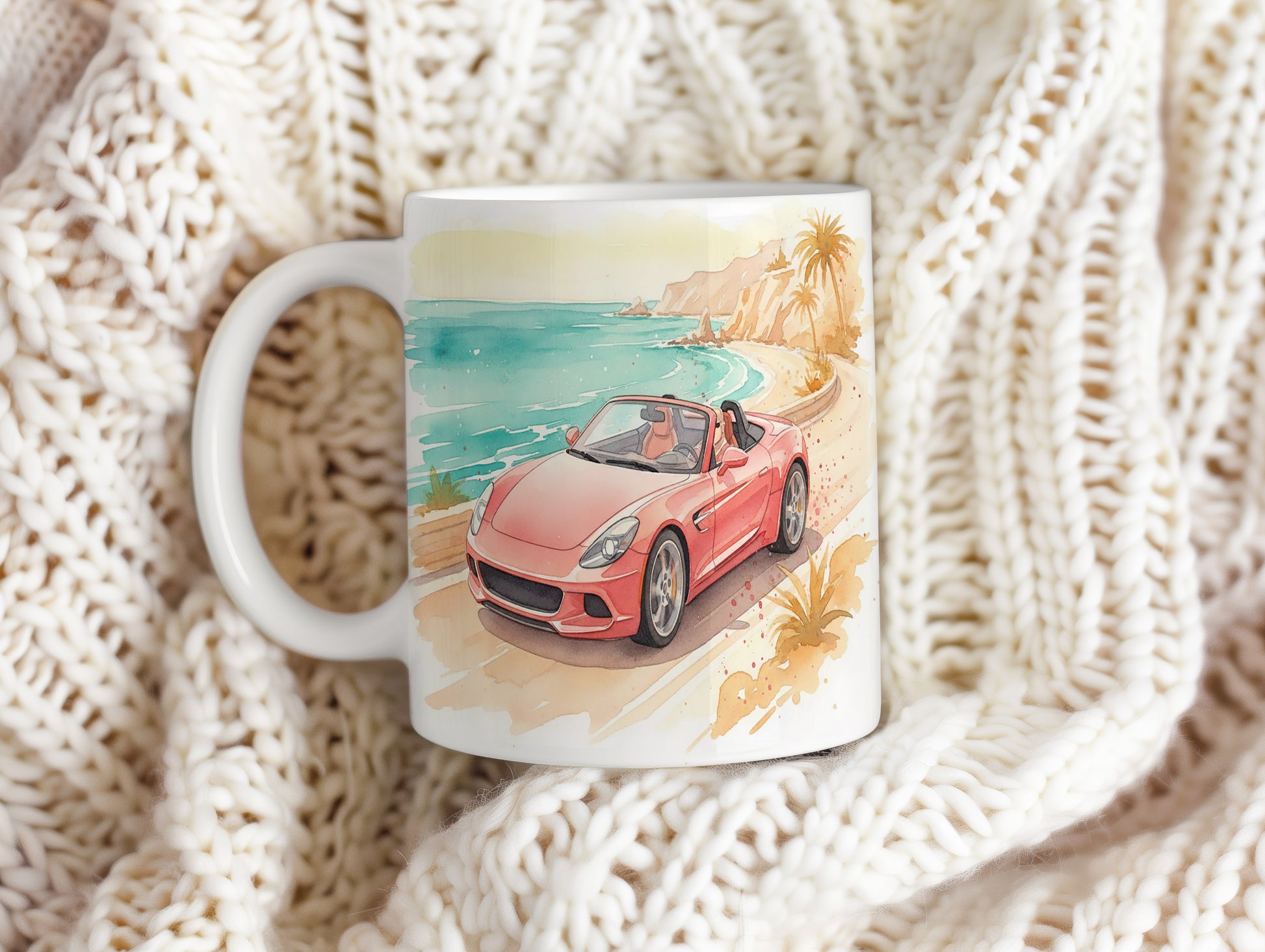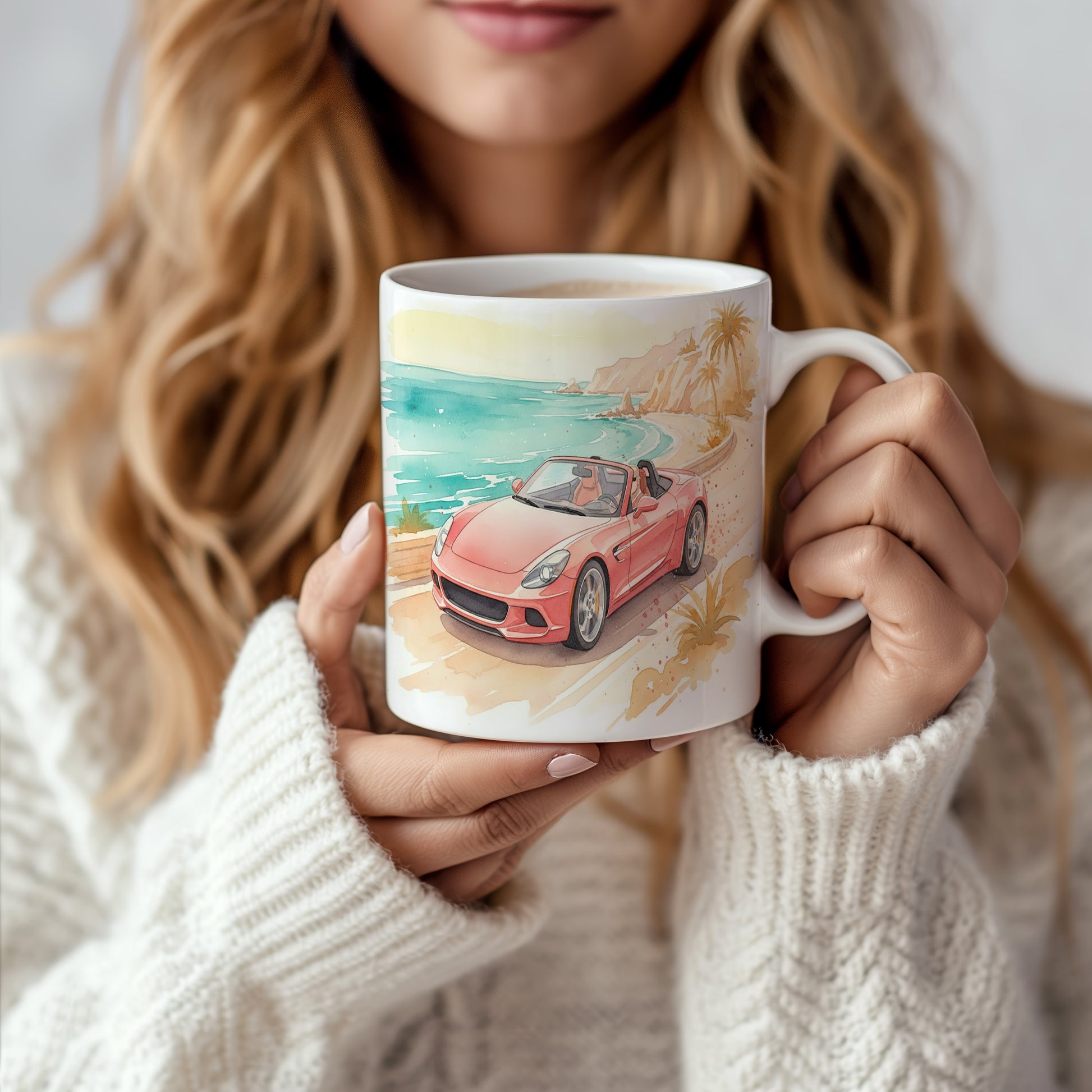 Elegantní kabriolet v akvarelu sviští podél mořského pobřeží. Užijte si pocit svobody při každém doušku. Hrnek 330 ml – vhodný do myčky i mikrovlnky.