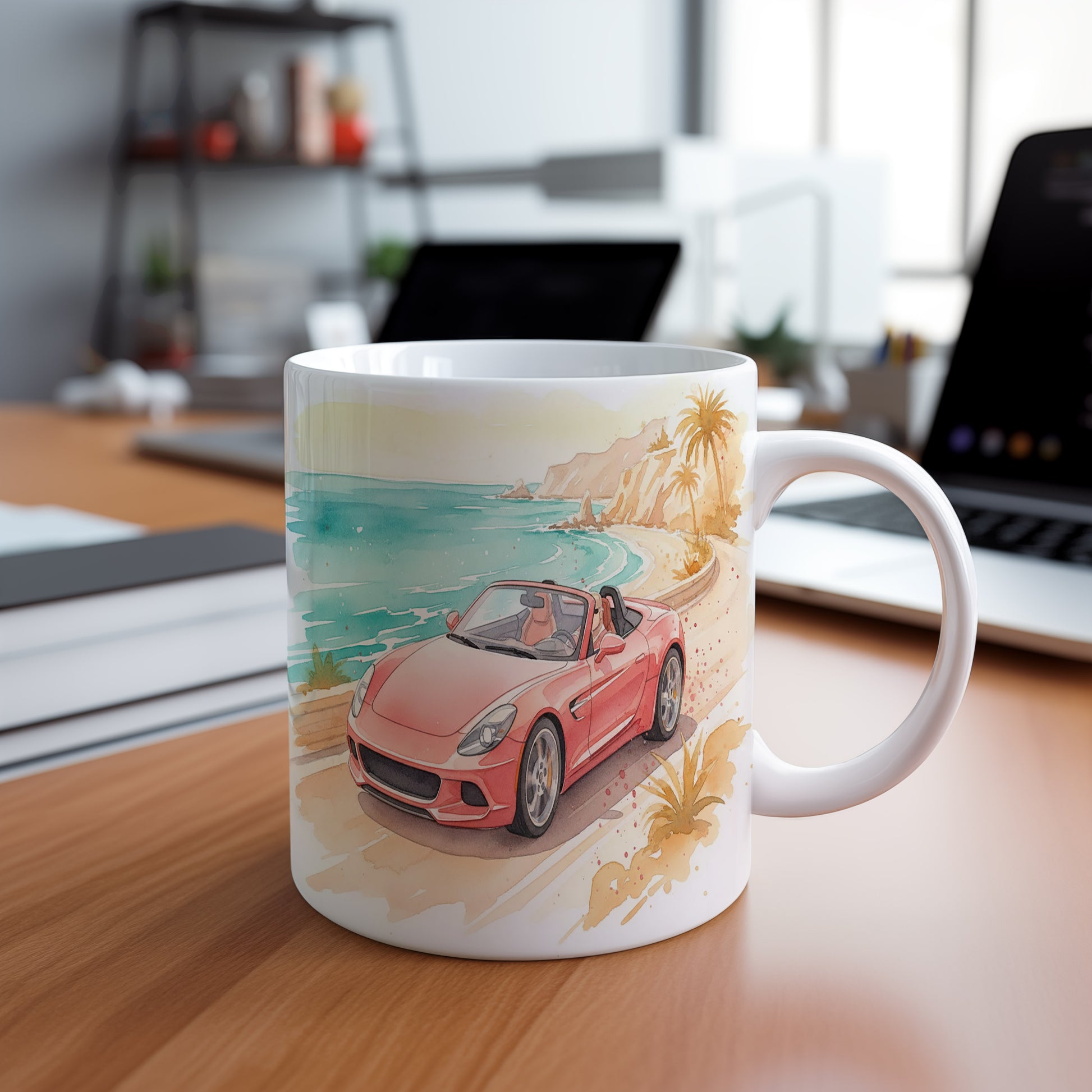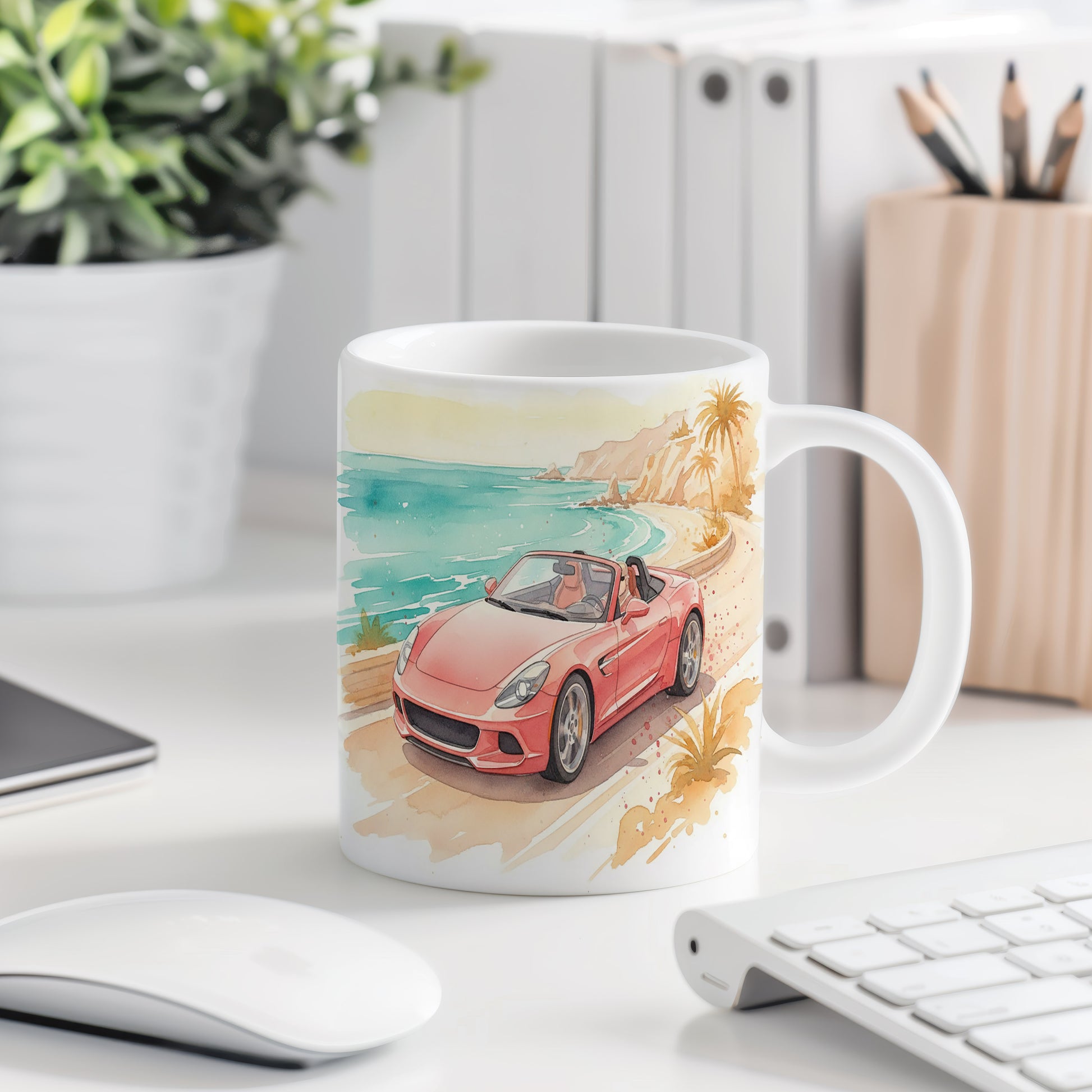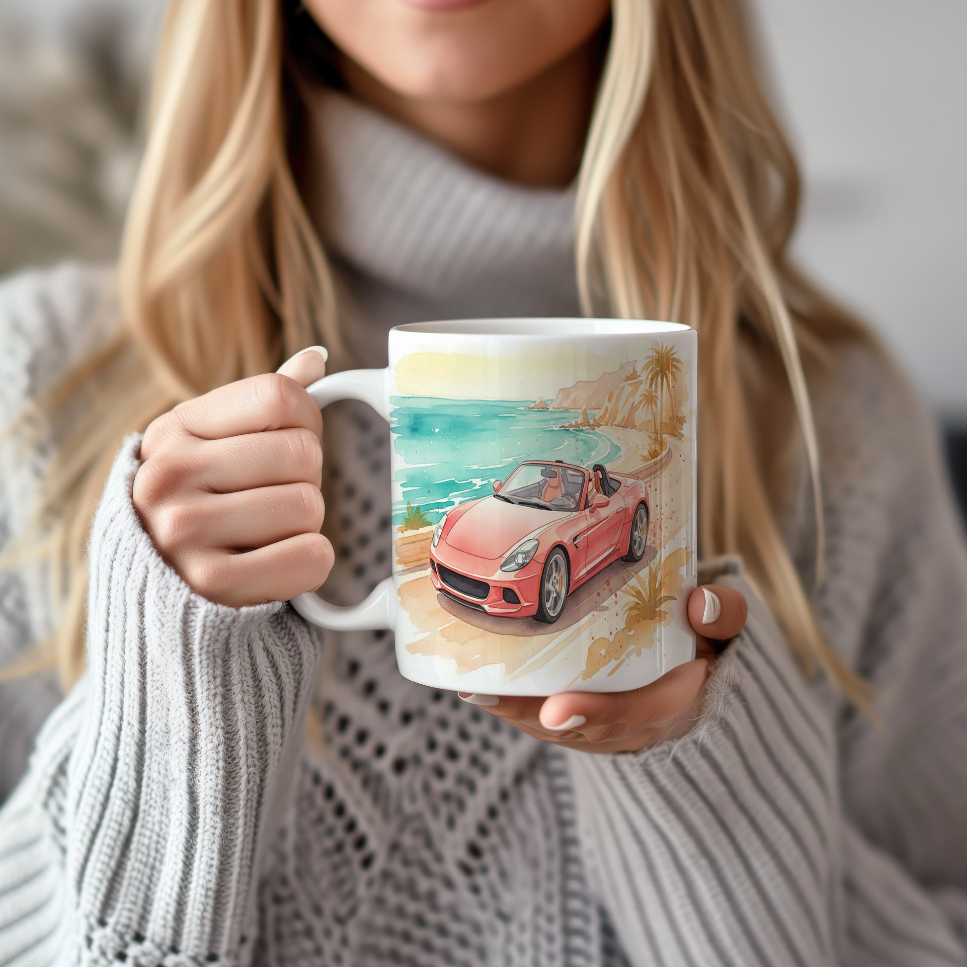 Elegantní kabriolet v akvarelu sviští podél mořského pobřeží. Užijte si pocit svobody při každém doušku. Hrnek 330 ml – vhodný do myčky i mikrovlnky.
