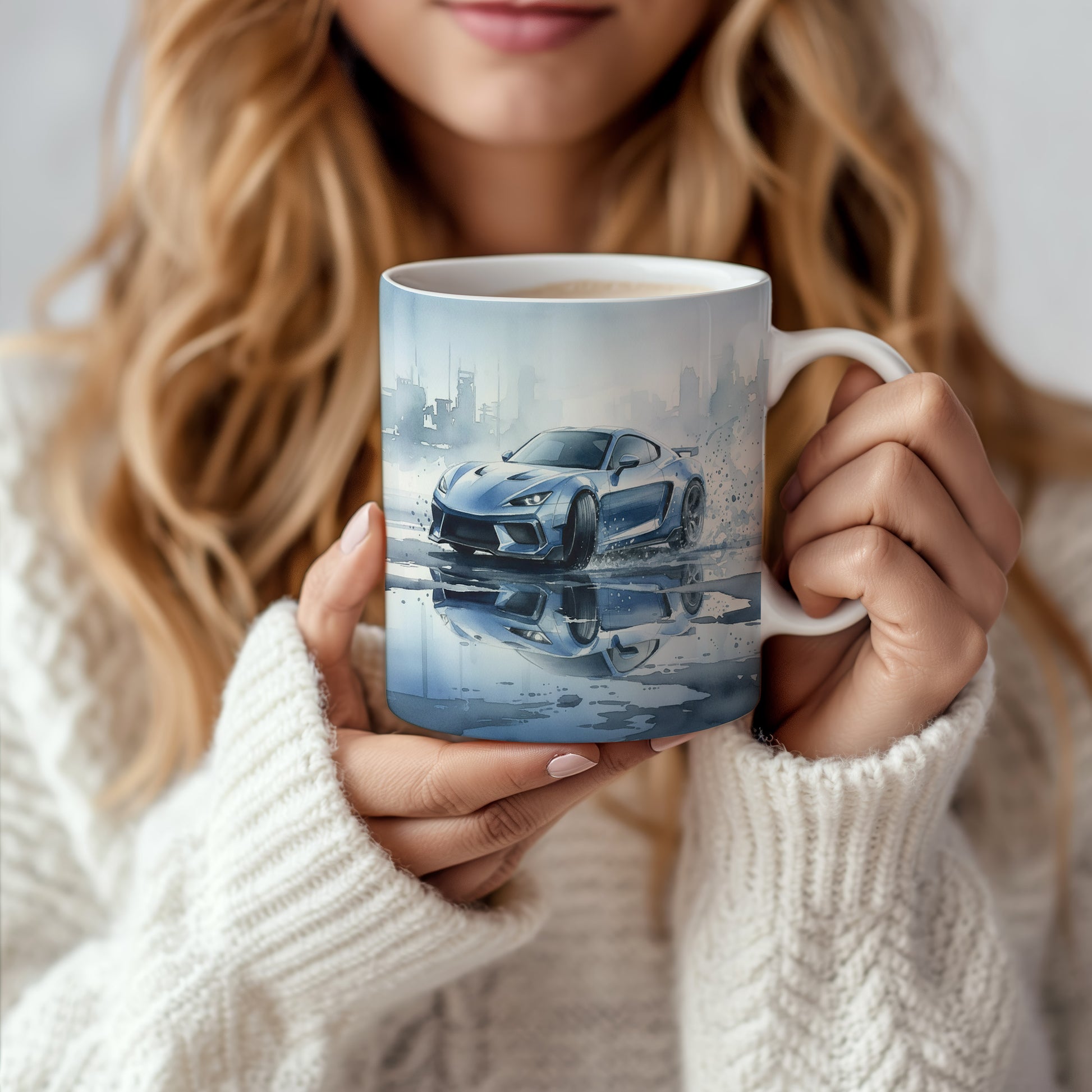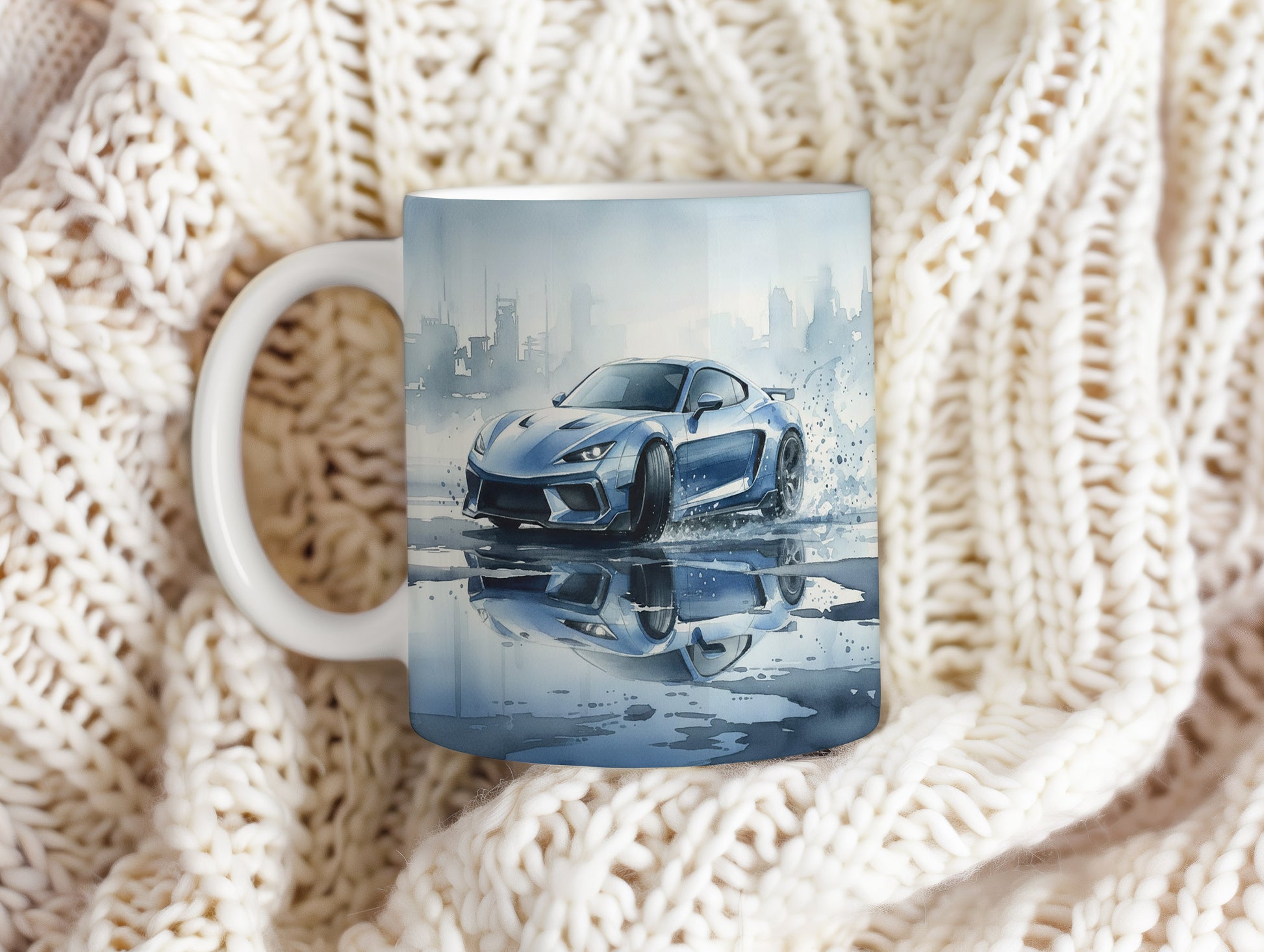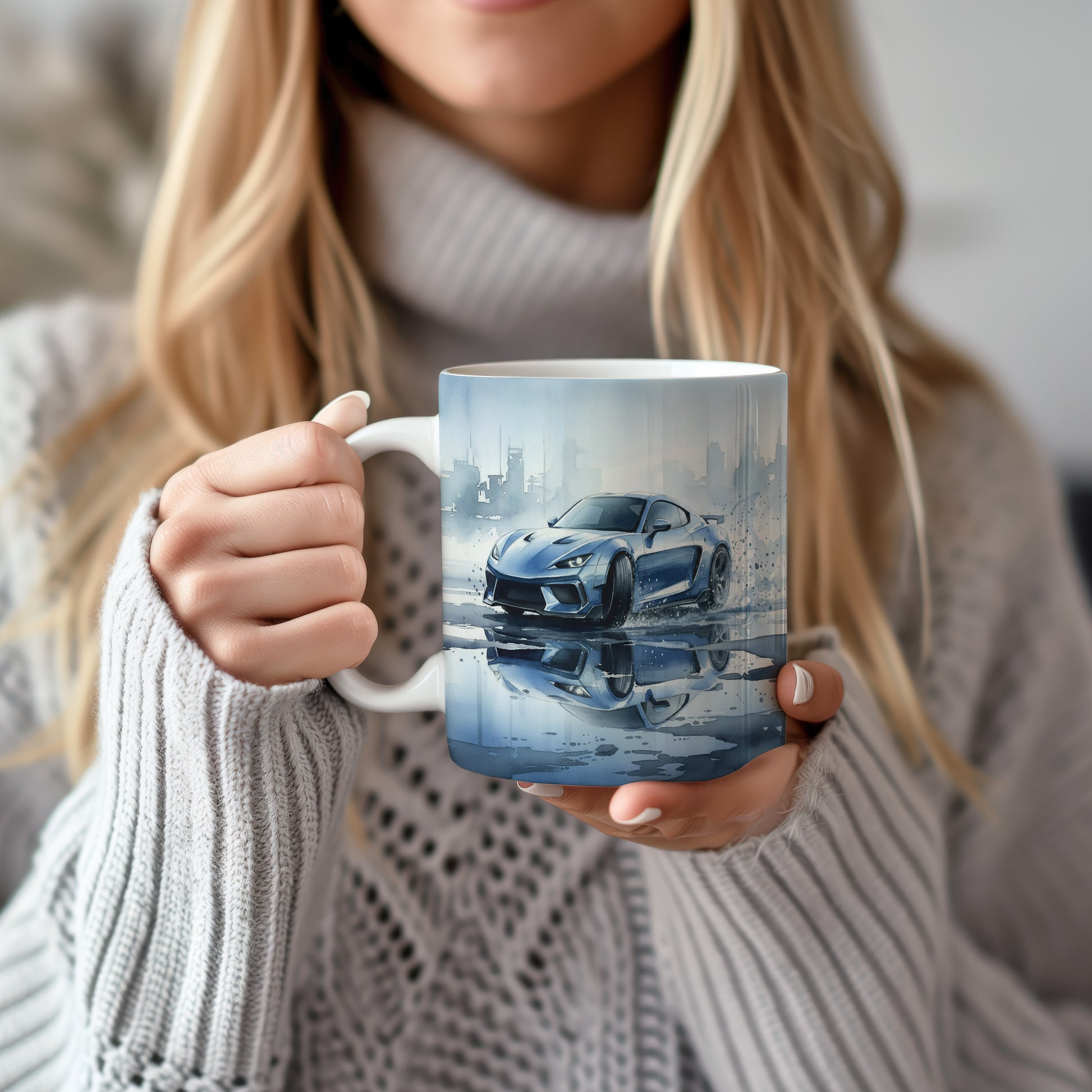 Elegantní modrý kabriolet v deštivém městském prostředí vás vtáhne do světa rychlosti a elegance. Hrnek 330 ml – vhodný do myčky i mikrovlnky.
