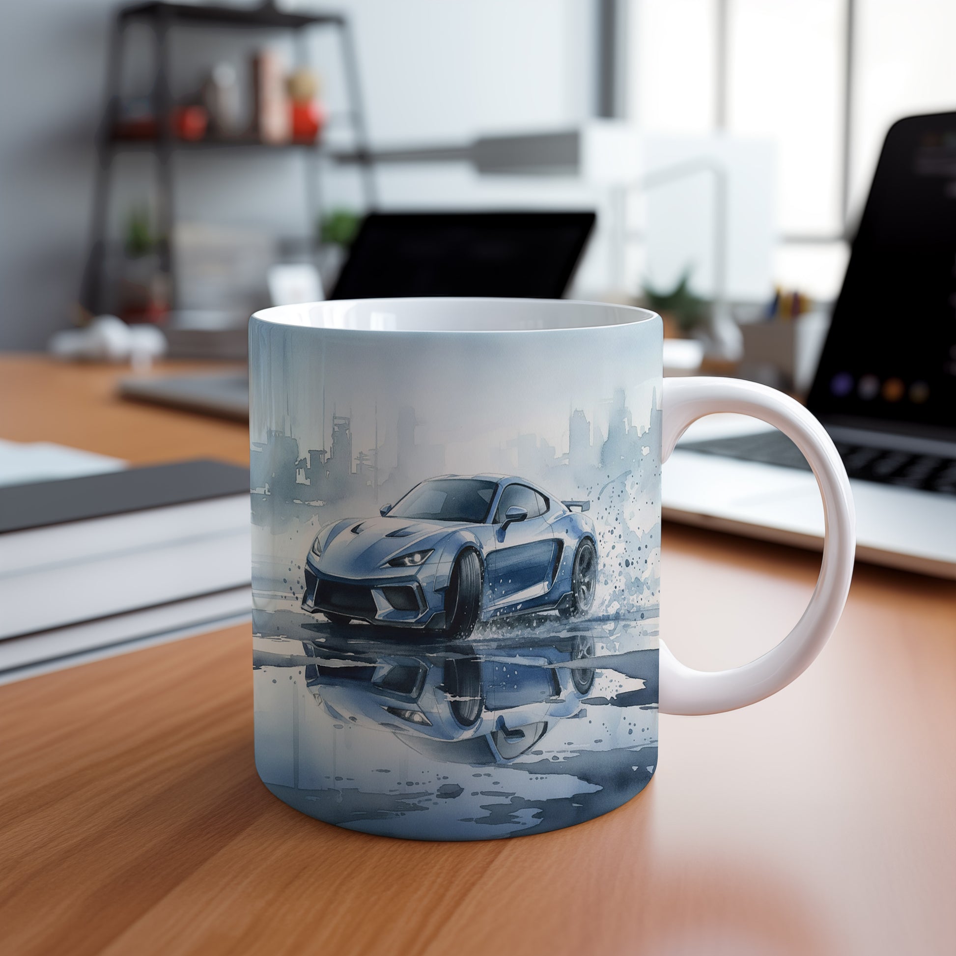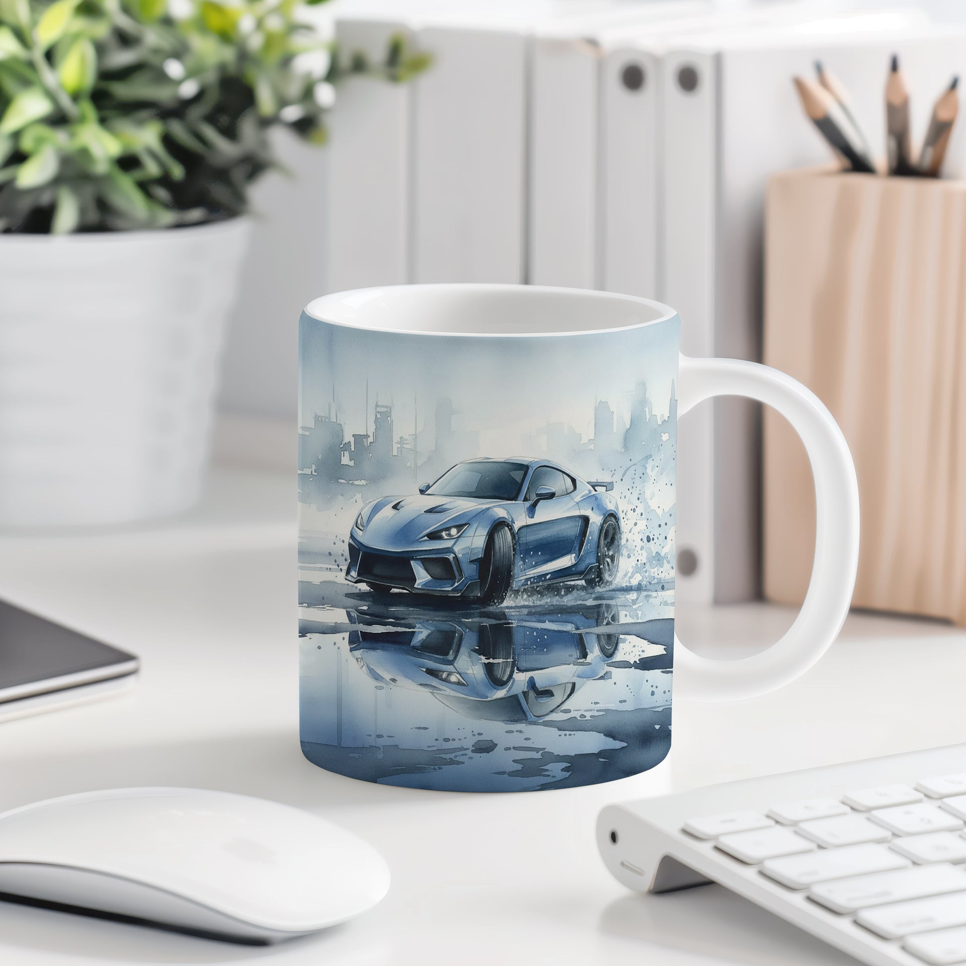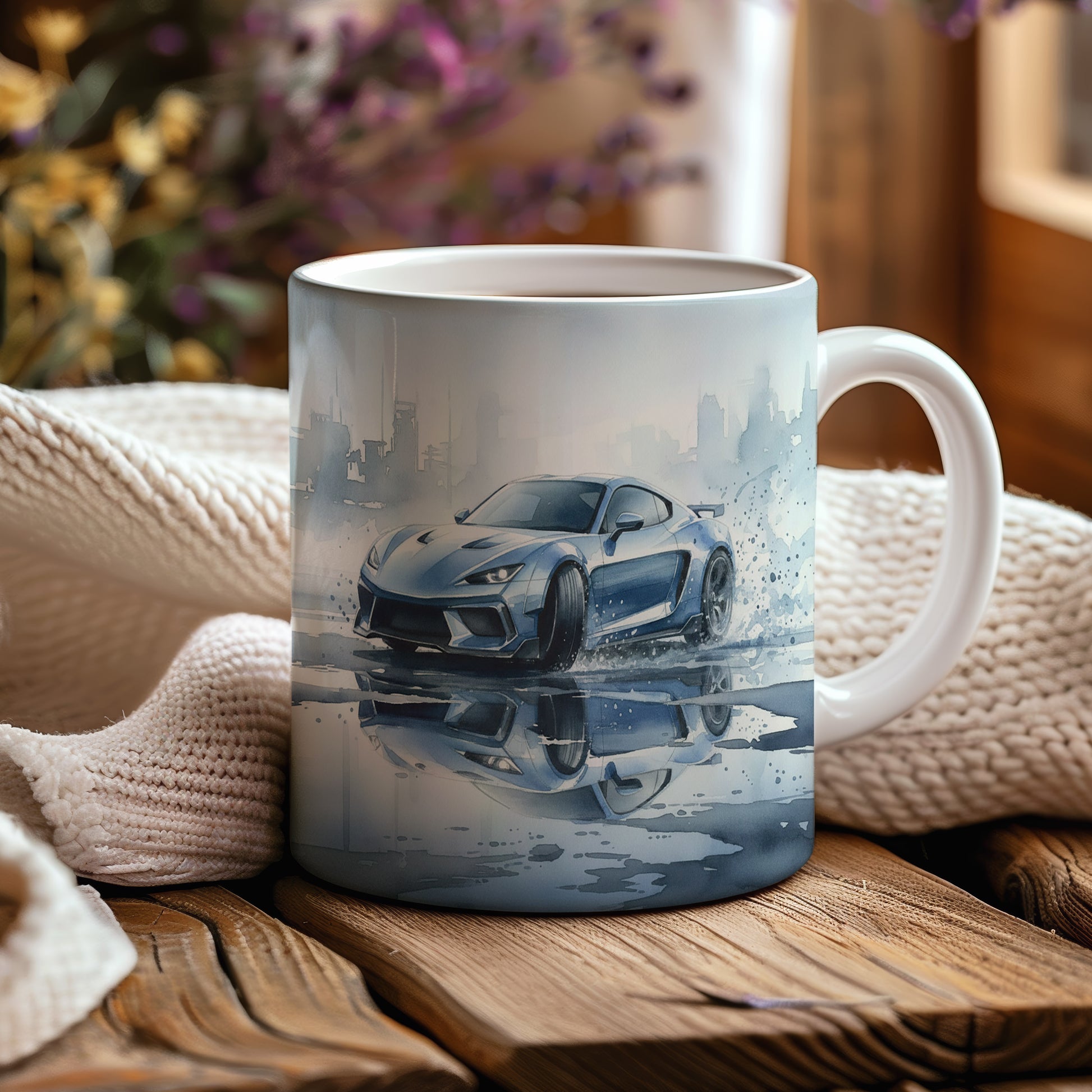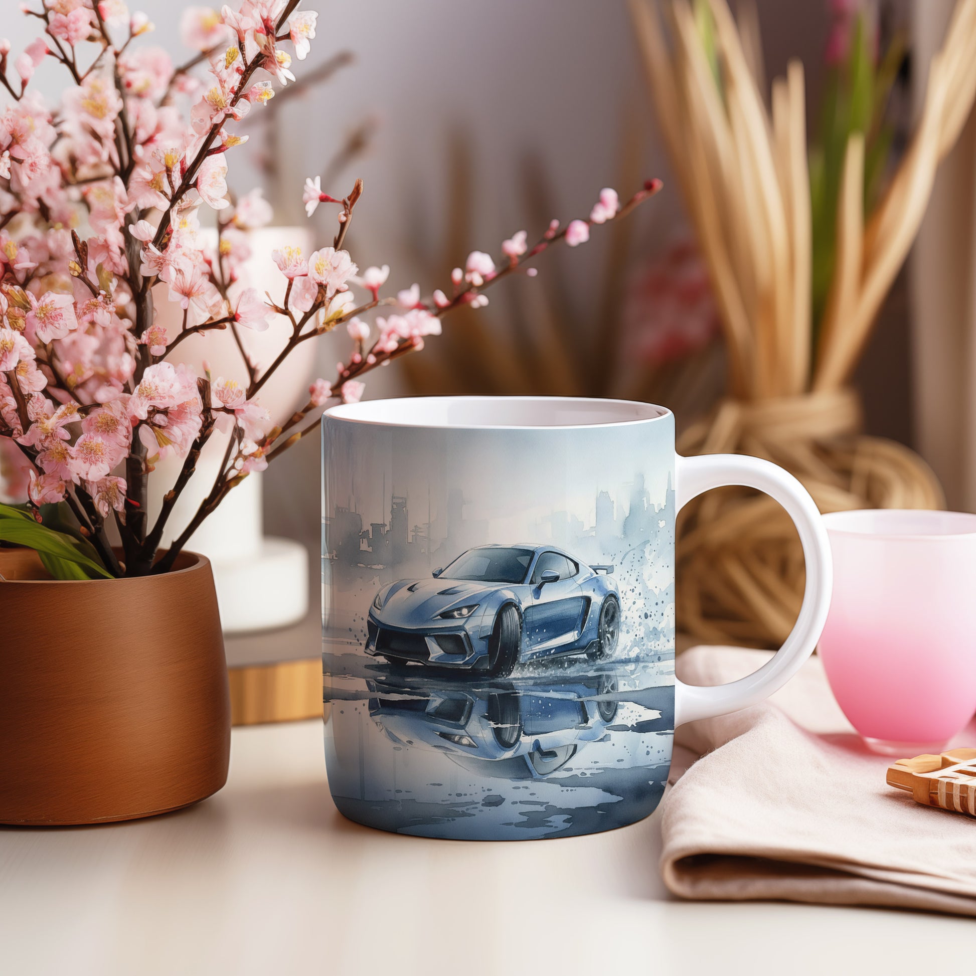 Elegantní modrý kabriolet v deštivém městském prostředí vás vtáhne do světa rychlosti a elegance. Hrnek 330 ml – vhodný do myčky i mikrovlnky.