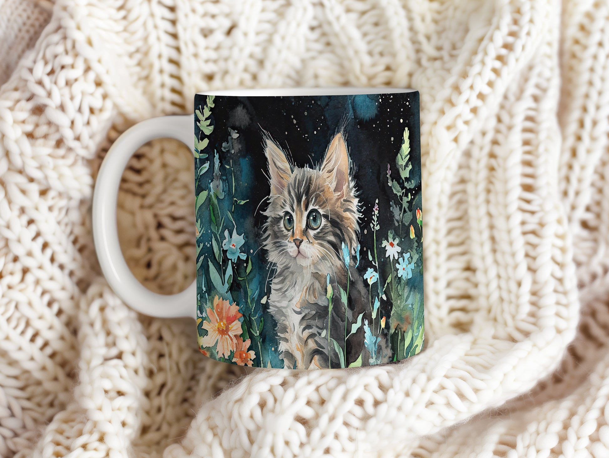 Hrnek s kočičkou v lučním motivu