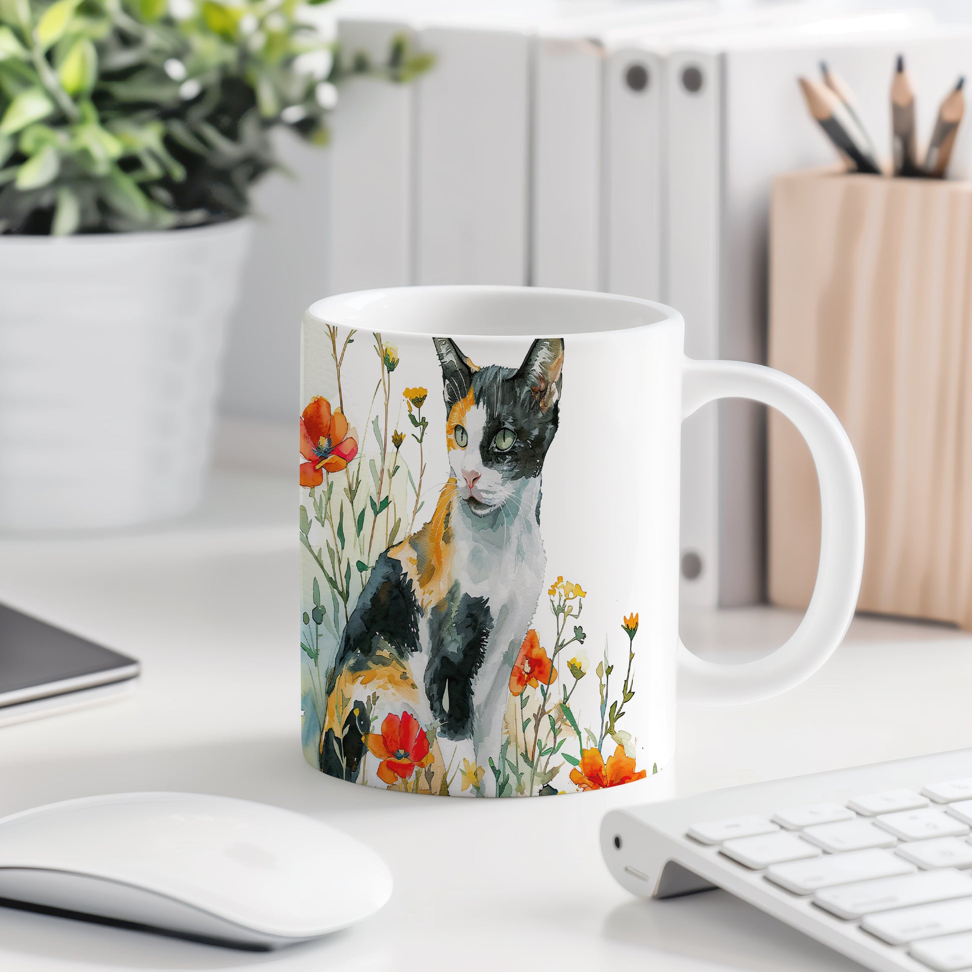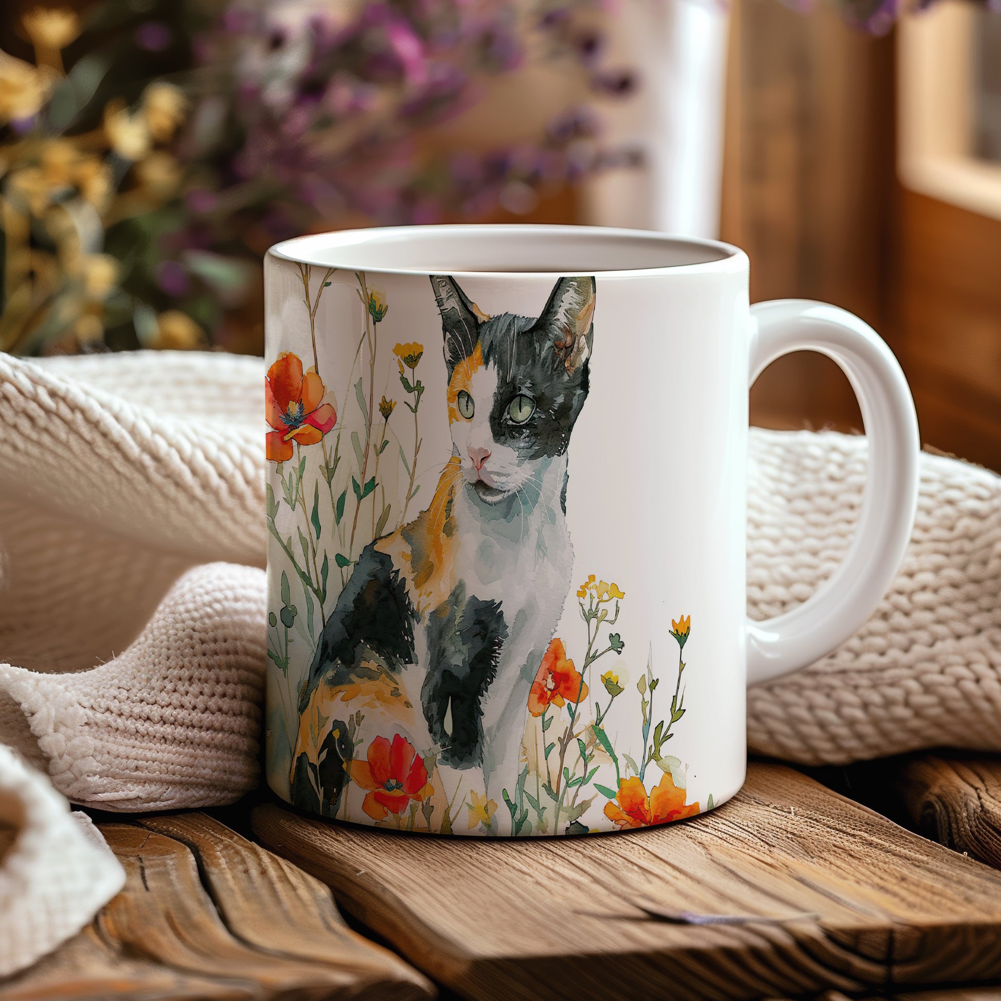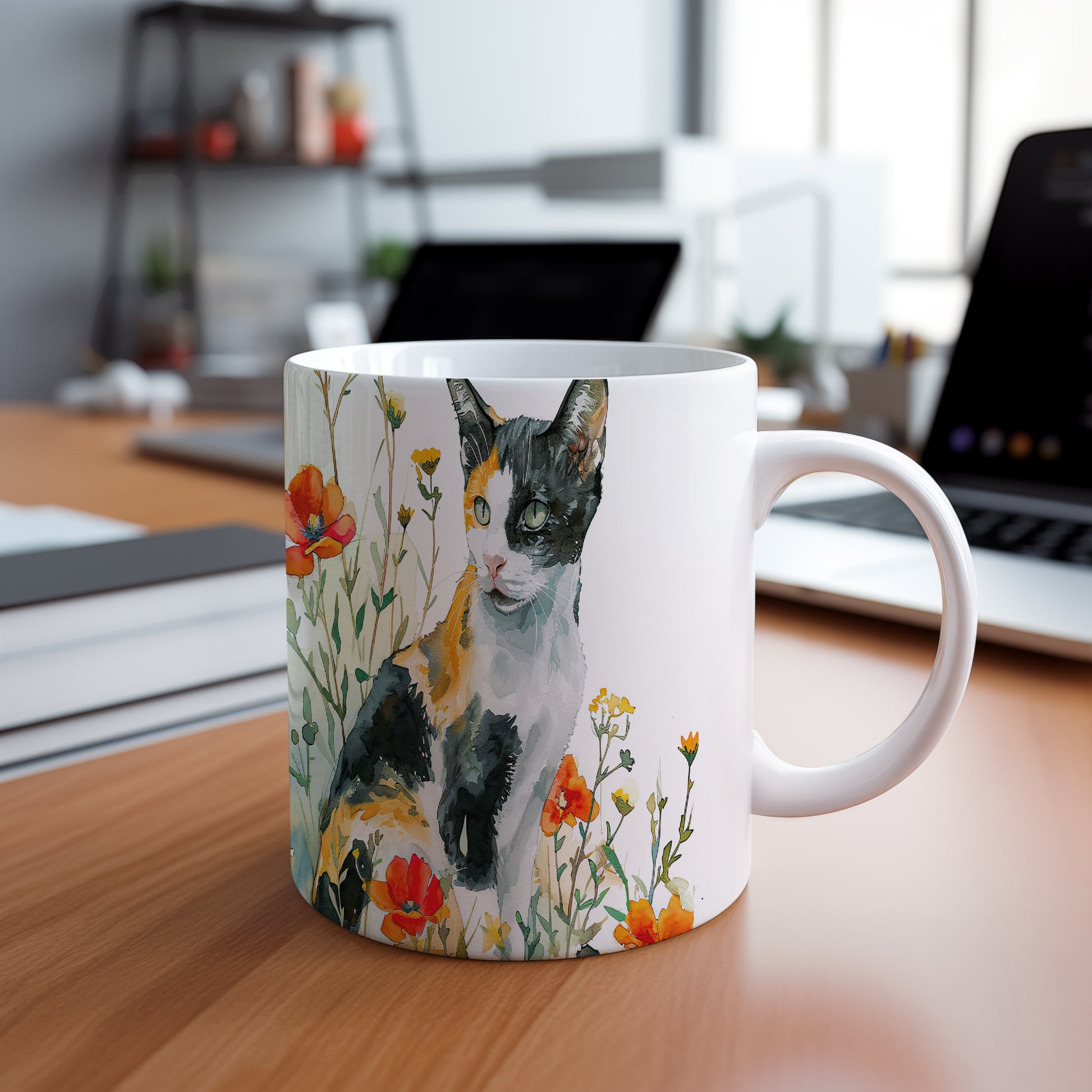 Tento keramický hrnek zobrazuje kočku obklopenou barevnými květinami. Je ideální pro milovníky zvířat a skvělým dárkem pro každého, kdo si rád vychutná kávu nebo čaj. Materiál: keramika. Objem: 330 ml. Vhodné do myčky i mikrovlnky. Používání tohoto hrnku přináší radost a oživí každé pití.