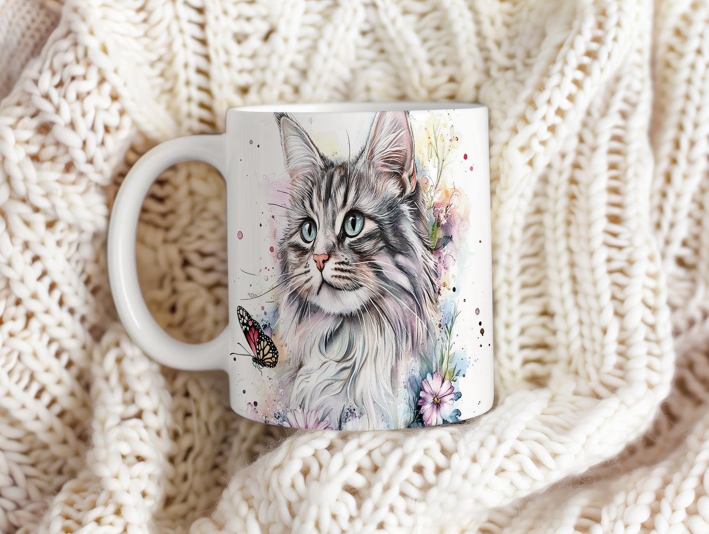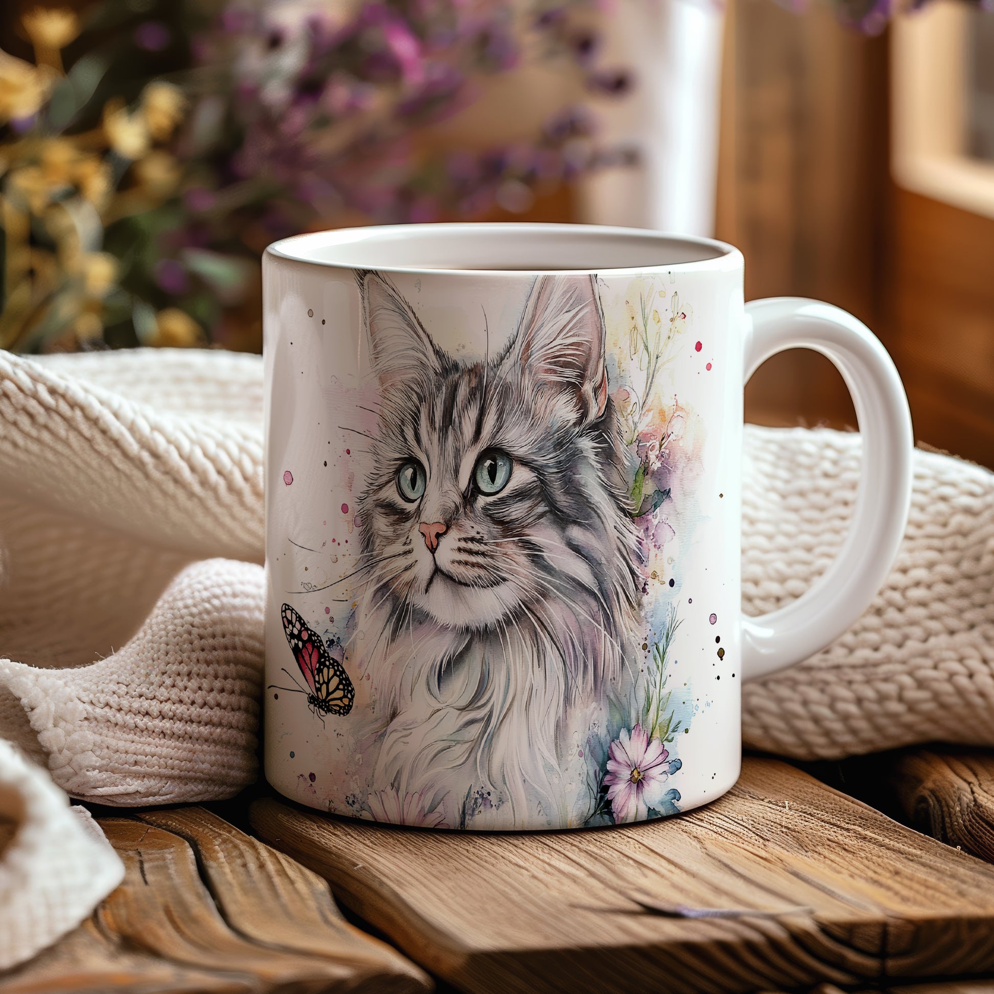 Hrnek s kočkou a květinovým motivem – malířským vzhledem