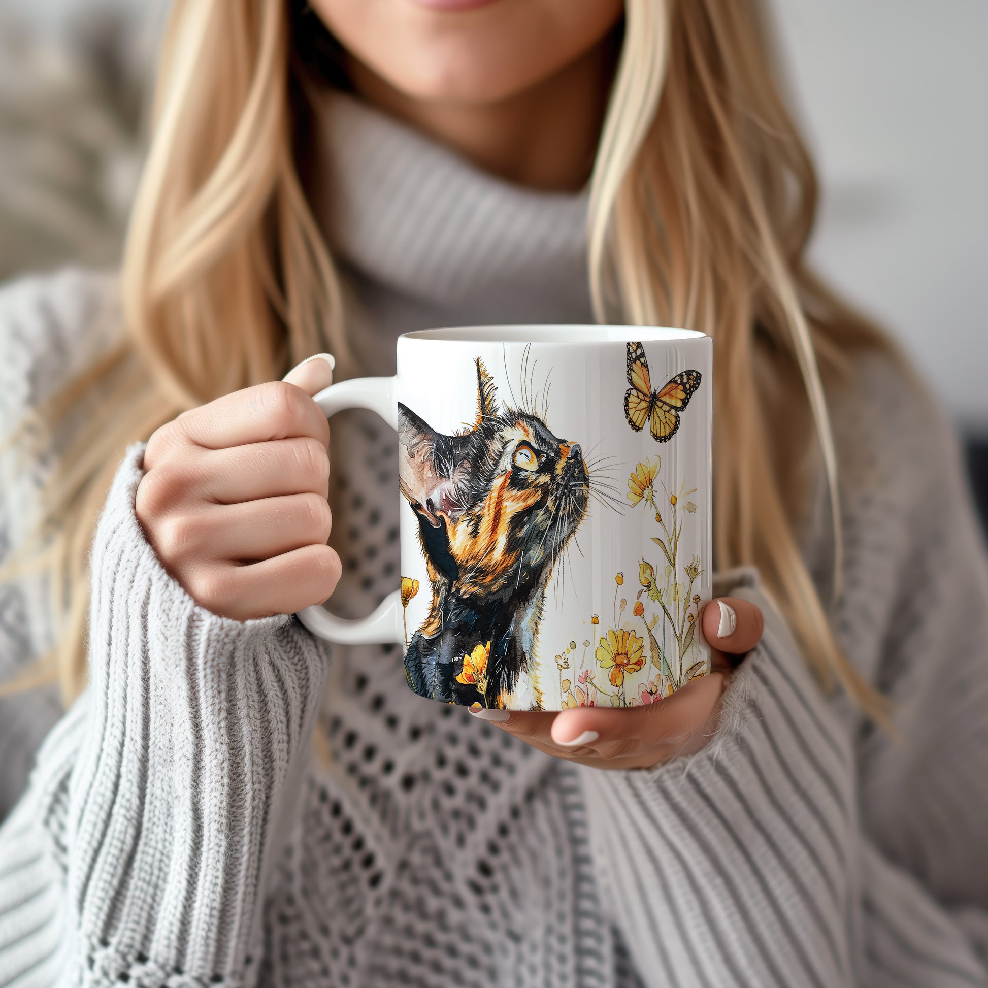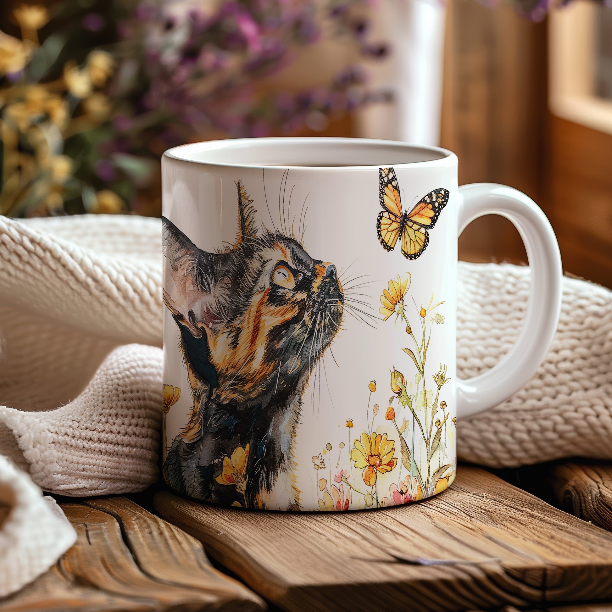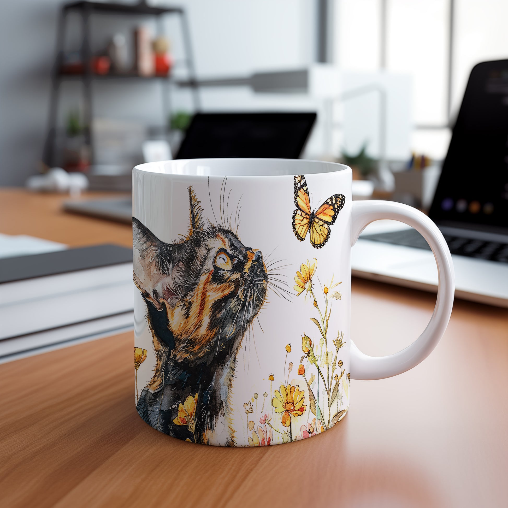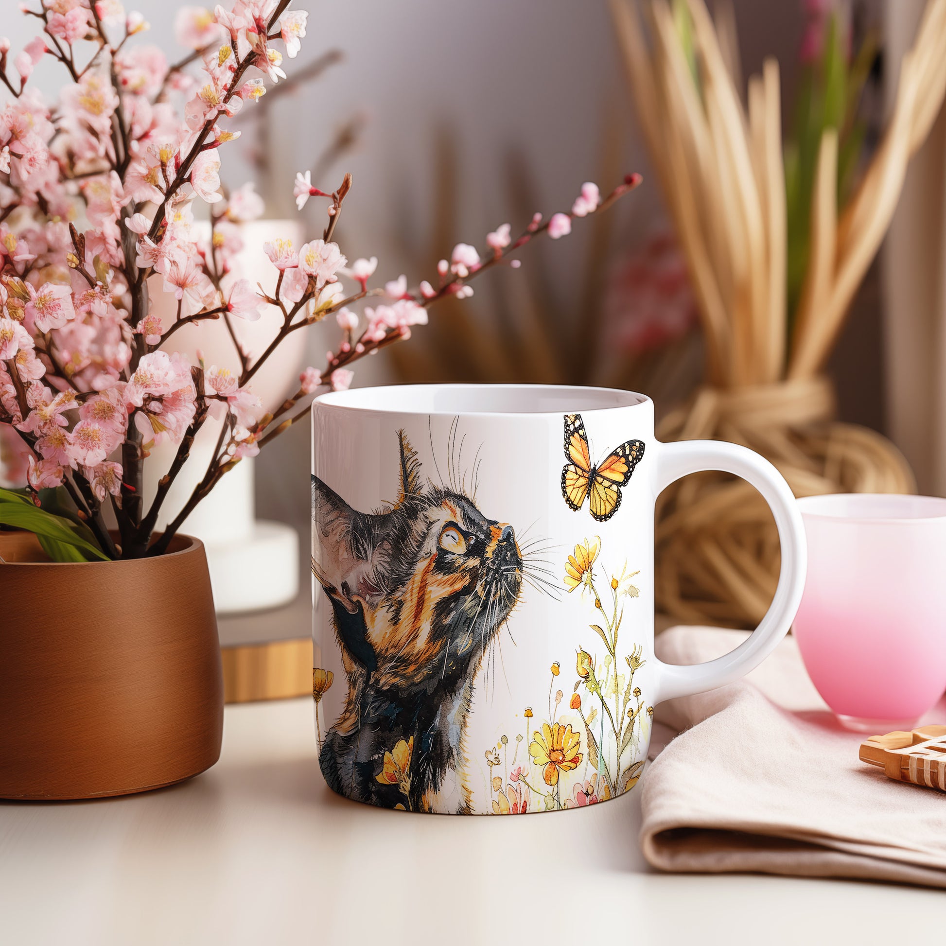 Tento hrnek s motivem kočky a motýla v květinovém stylu potěší každého milovníka zvířat a přírody. Je ideálním dárkem pro přátele nebo rodinu, kteří ocení krásu přírody. Materiál: keramika. Objem: 330 ml. Vhodné do myčky i mikrovlnky. Používání tohoto hrnku přináší radost a útulnost do každodenního pití.