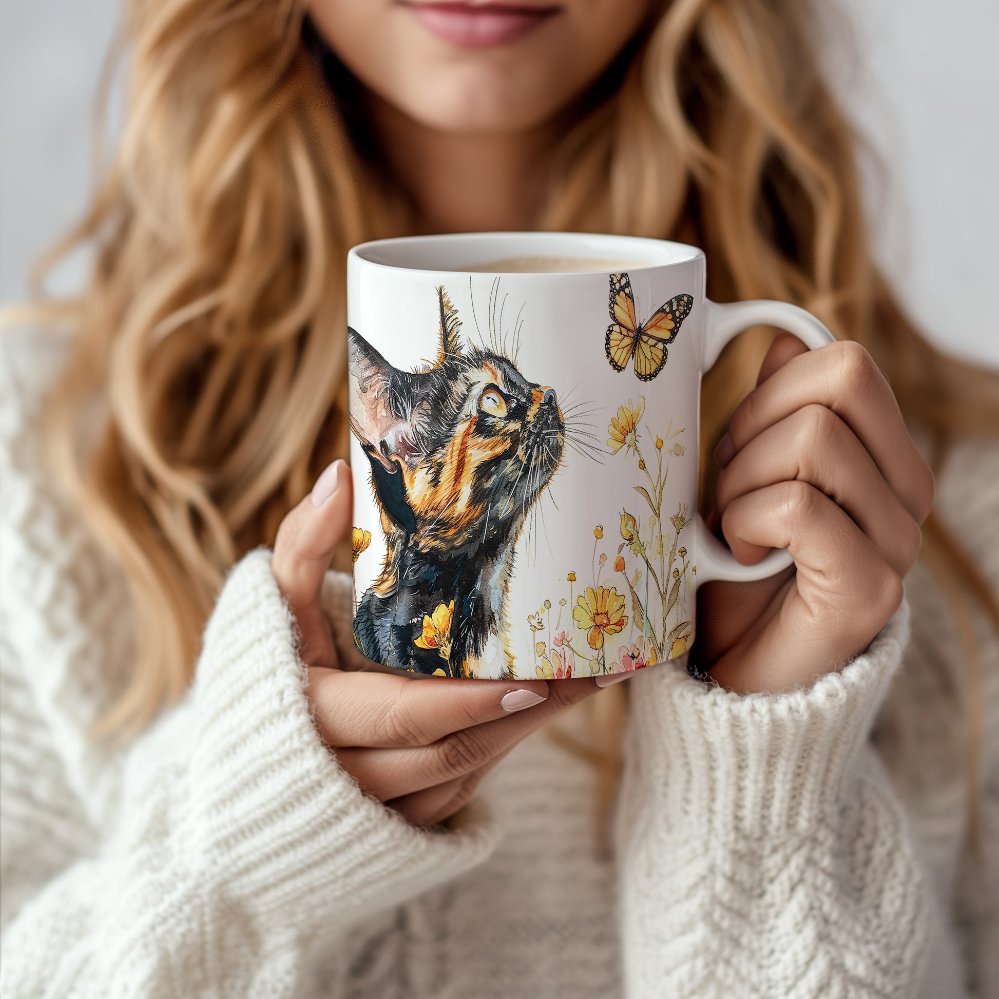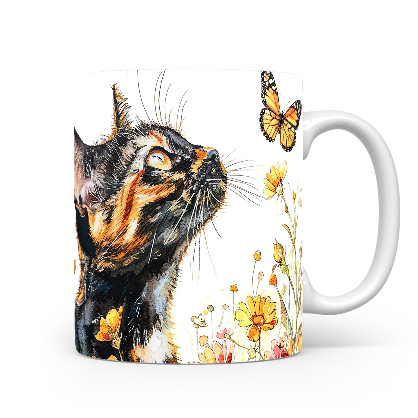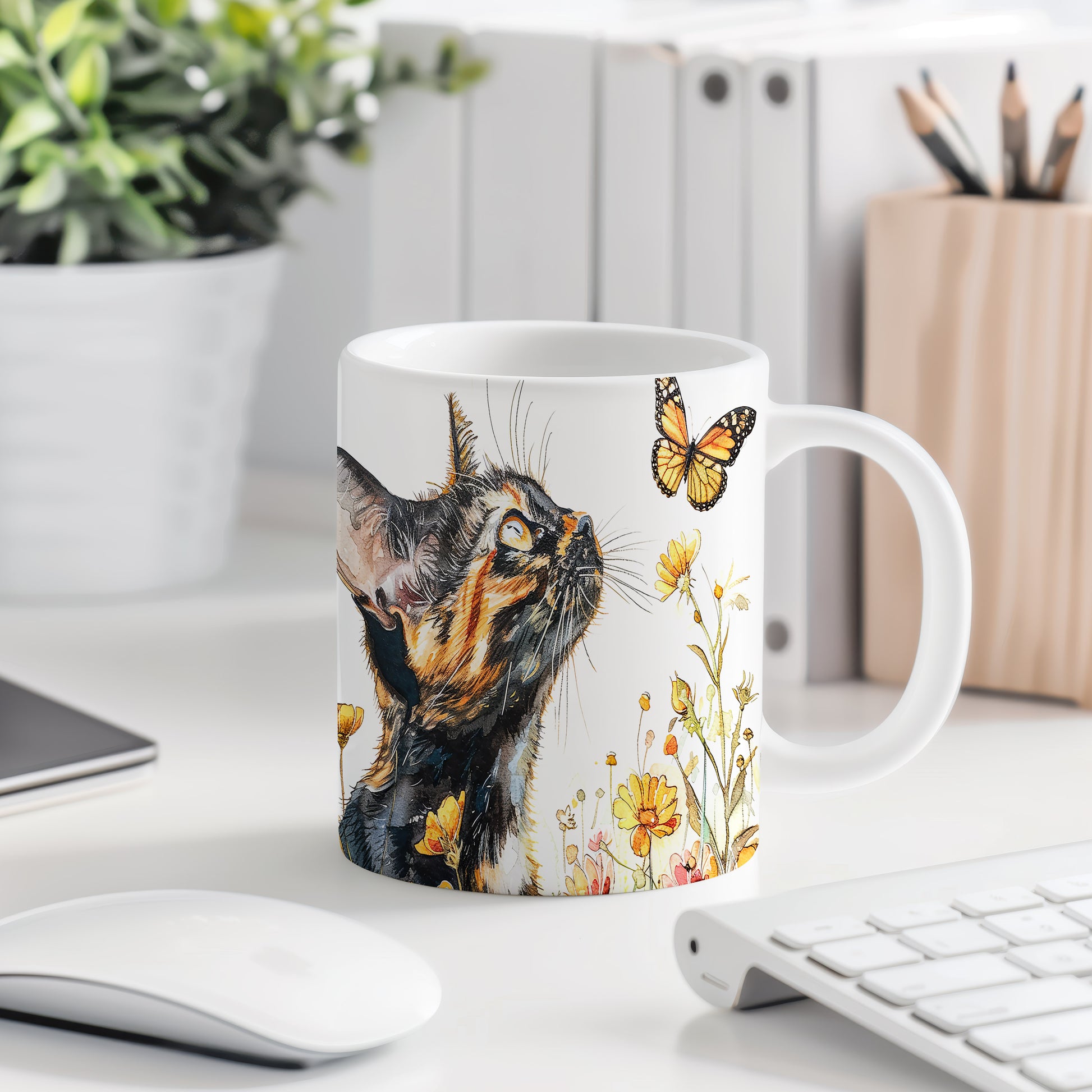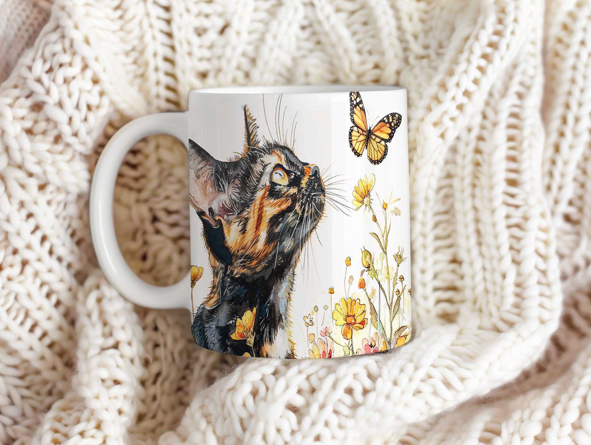 Tento hrnek s motivem kočky a motýla v květinovém stylu potěší každého milovníka zvířat a přírody. Je ideálním dárkem pro přátele nebo rodinu, kteří ocení krásu přírody. Materiál: keramika. Objem: 330 ml. Vhodné do myčky i mikrovlnky. Používání tohoto hrnku přináší radost a útulnost do každodenního pití.