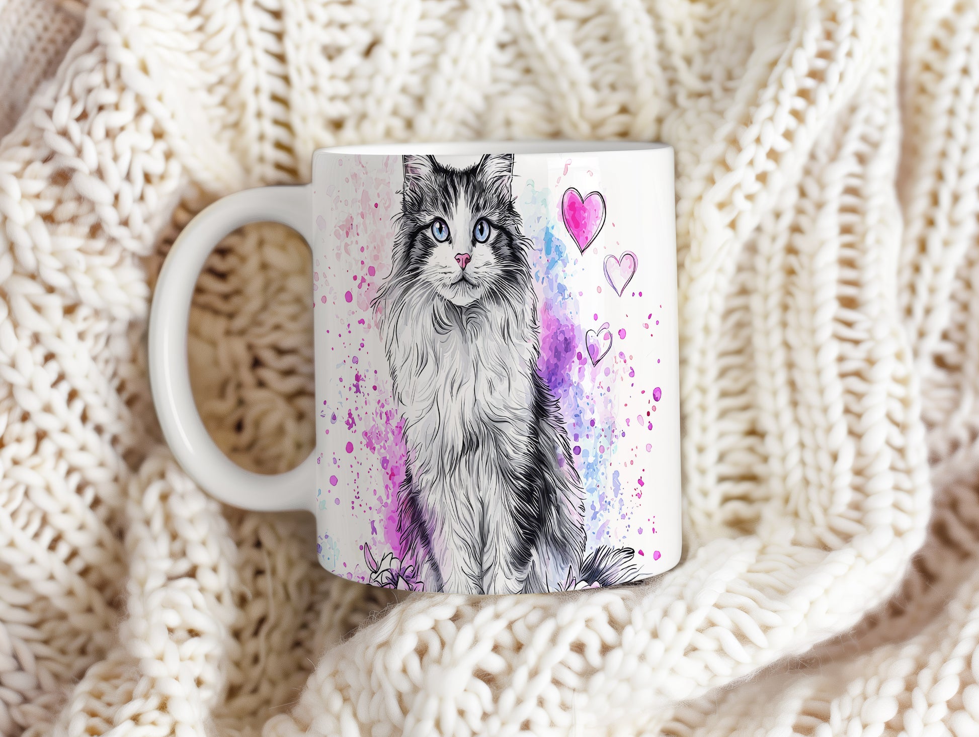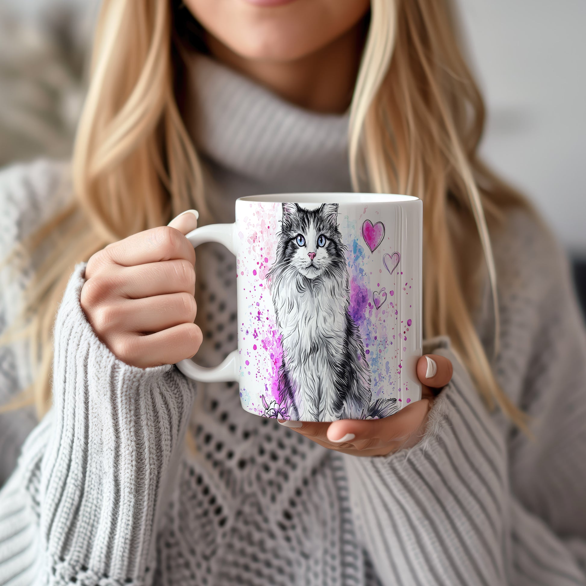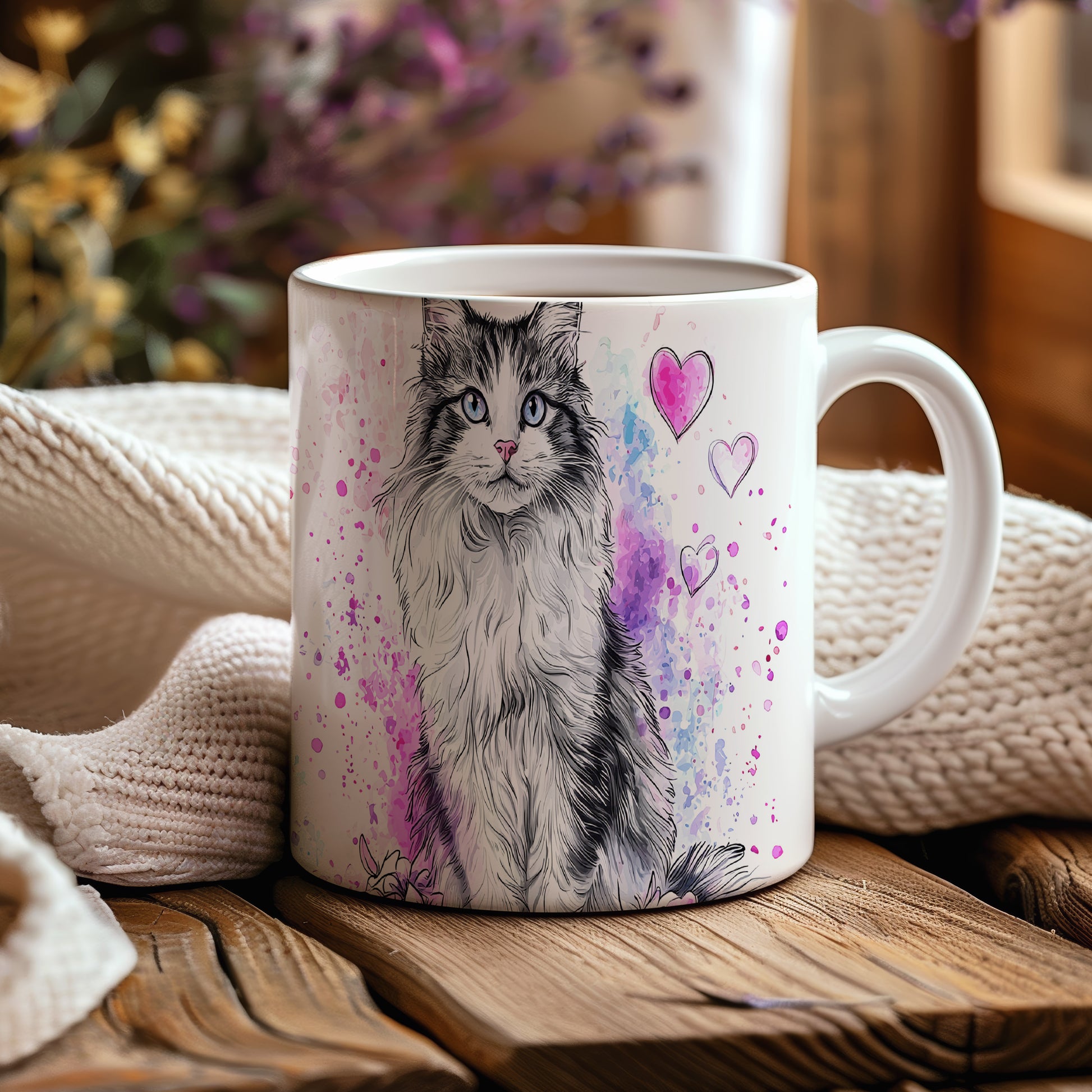 Tento hrnek zobrazuje roztomilou kočku s modrýma očima na pozadí srdíček a barevných skvrn. Je ideální pro milovníky koček a skvělým dárkem pro přátele nebo rodinu. Materiál: keramika. Objem: 330 ml. Vhodné do myčky i mikrovlnky. Používání tohoto hrnku přináší radost a útulnost do každého dne.