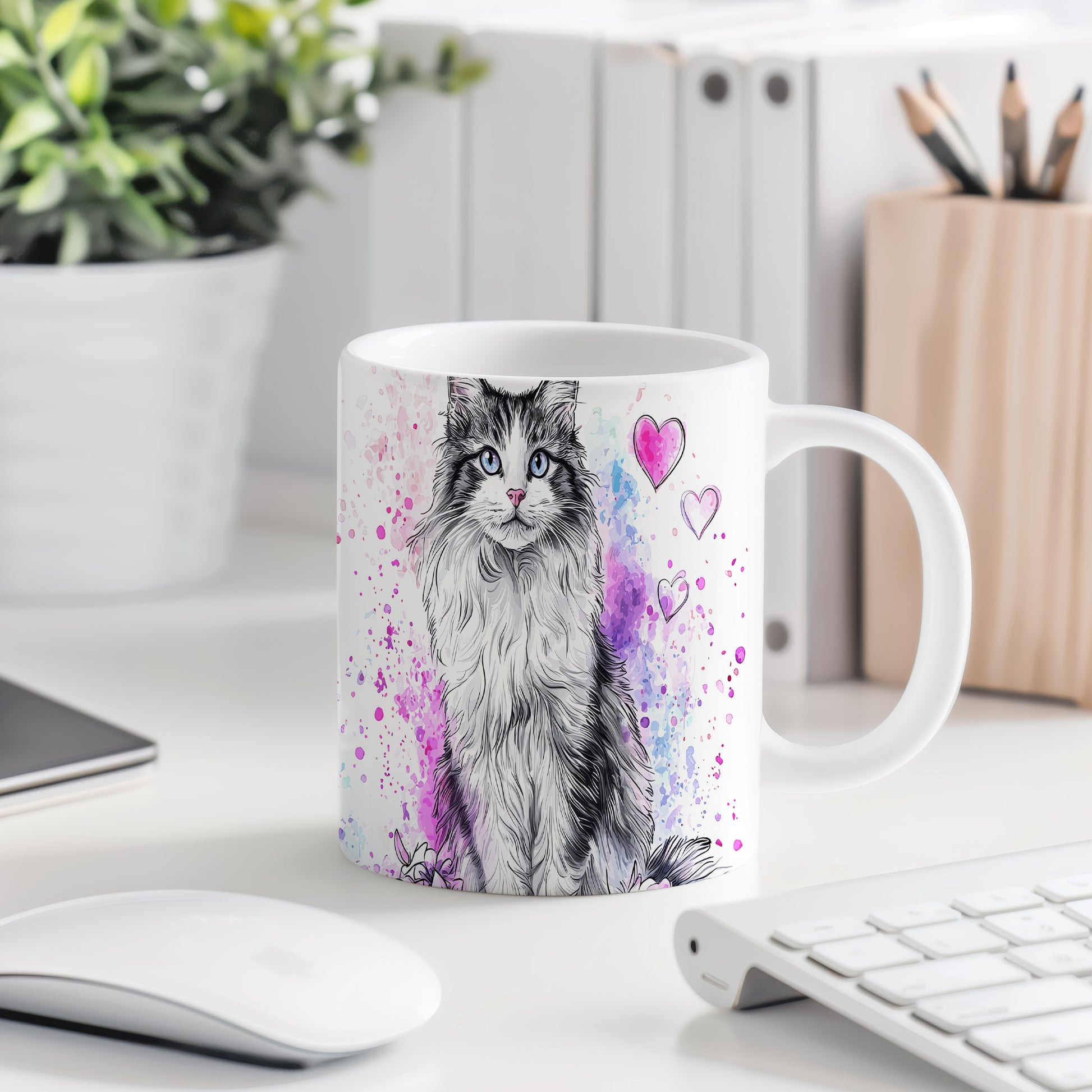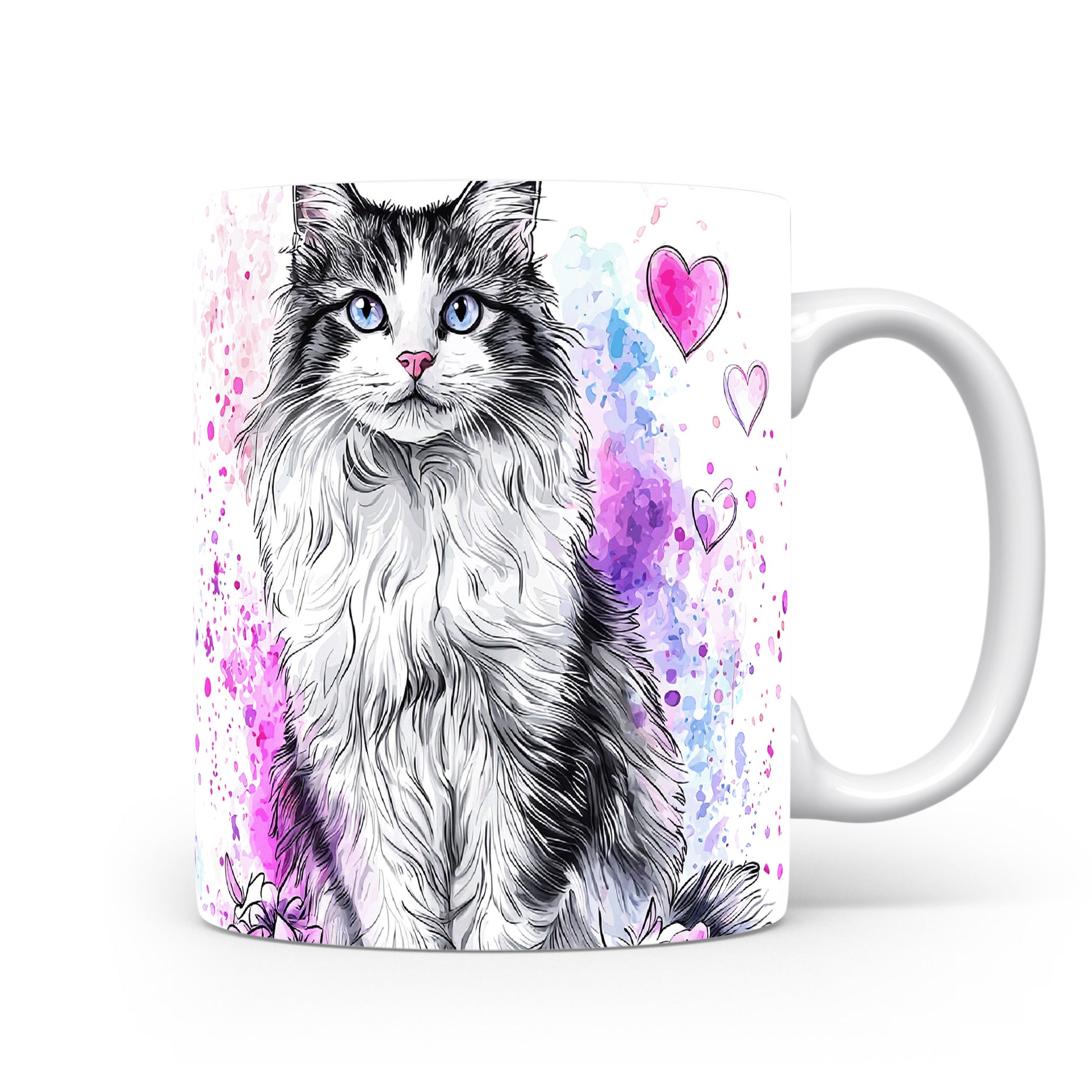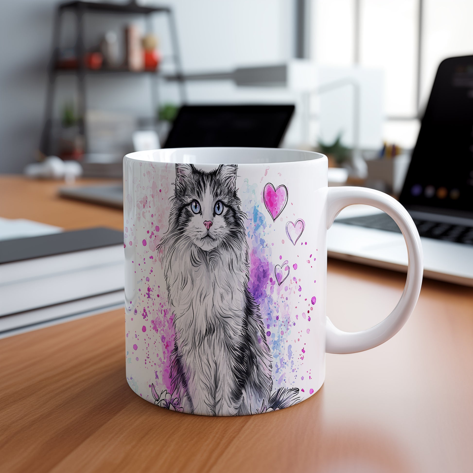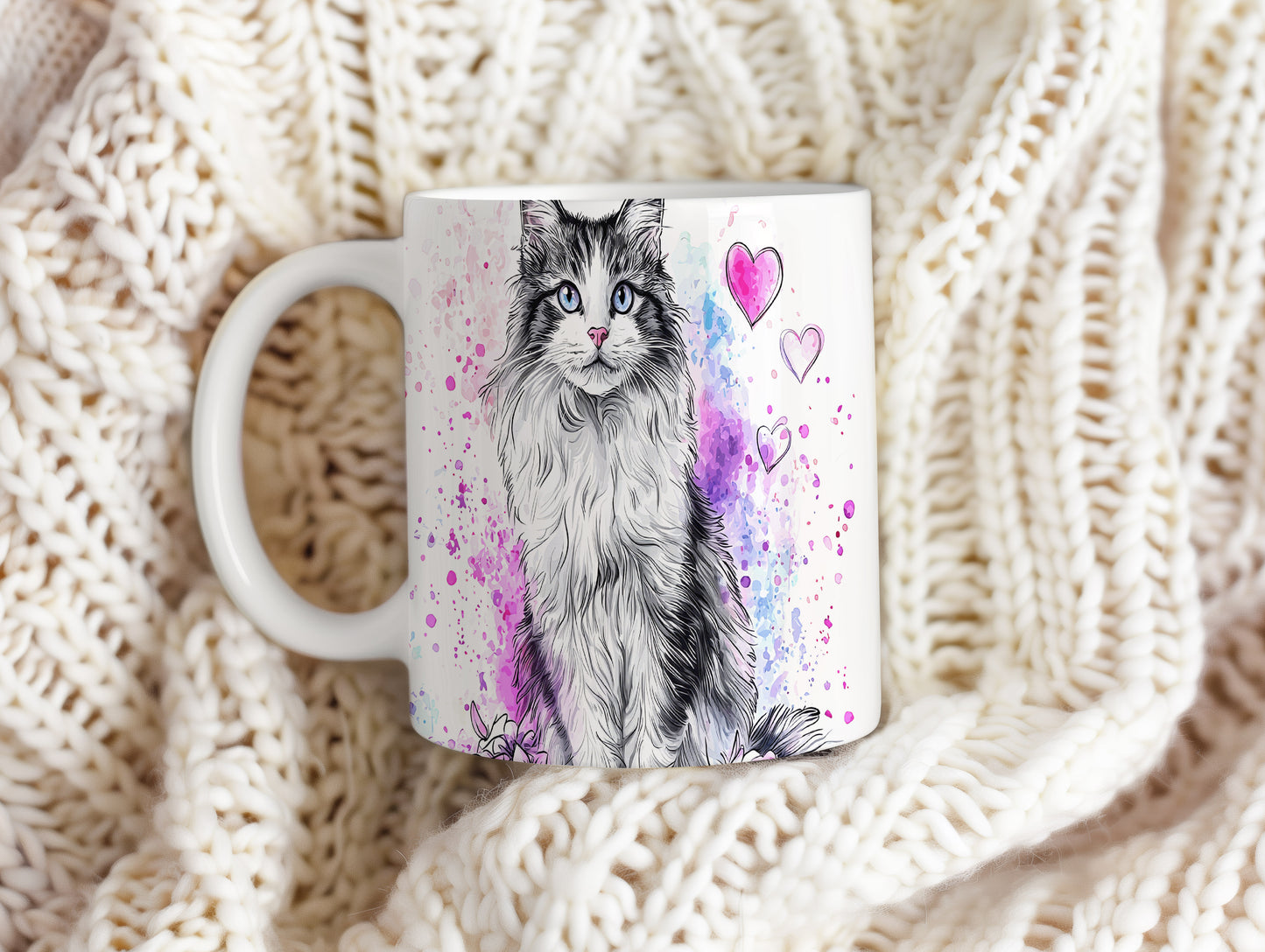 Tento hrnek zobrazuje roztomilou kočku s modrýma očima na pozadí srdíček a barevných skvrn. Je ideální pro milovníky koček a skvělým dárkem pro přátele nebo rodinu. Materiál: keramika. Objem: 330 ml. Vhodné do myčky i mikrovlnky. Používání tohoto hrnku přináší radost a útulnost do každého dne.