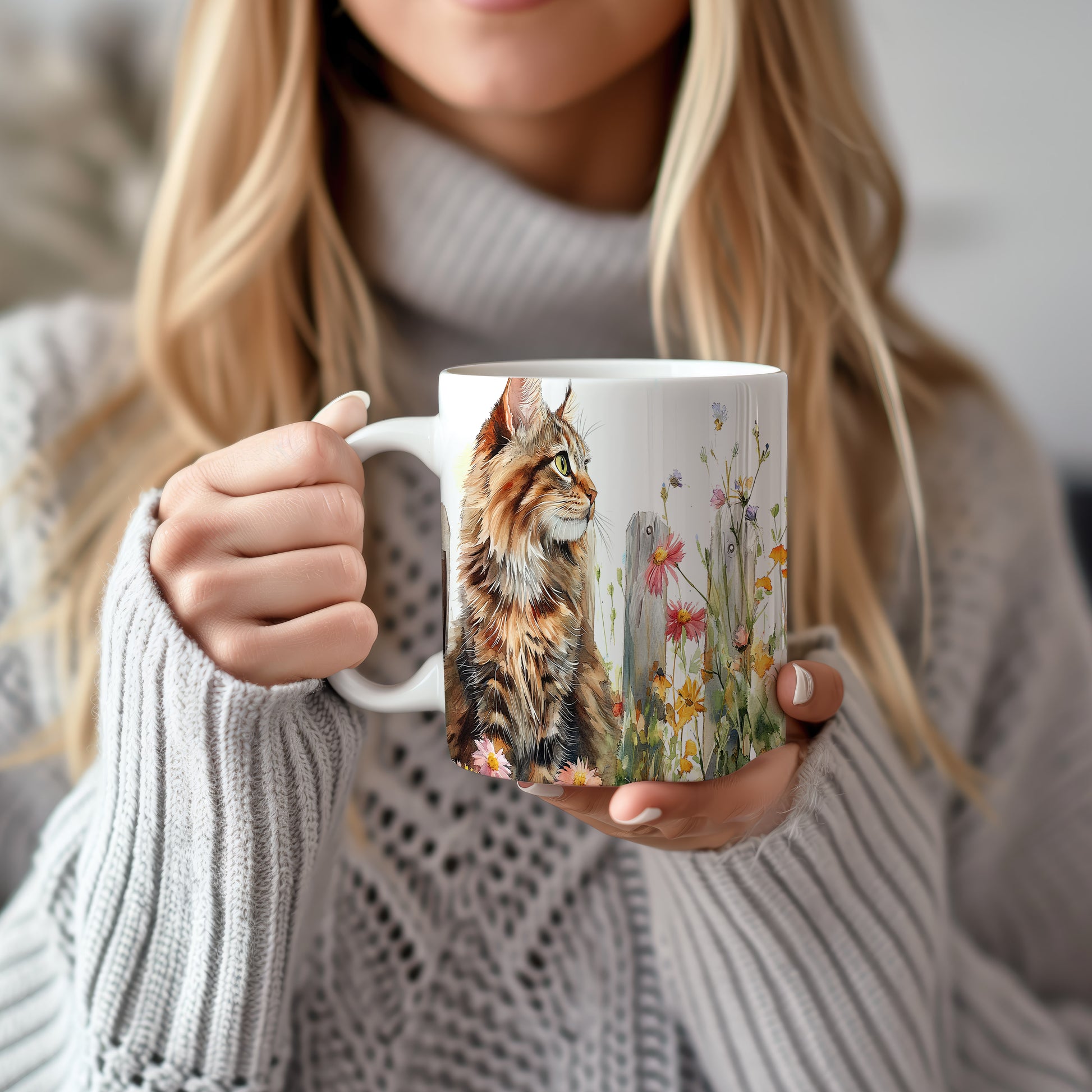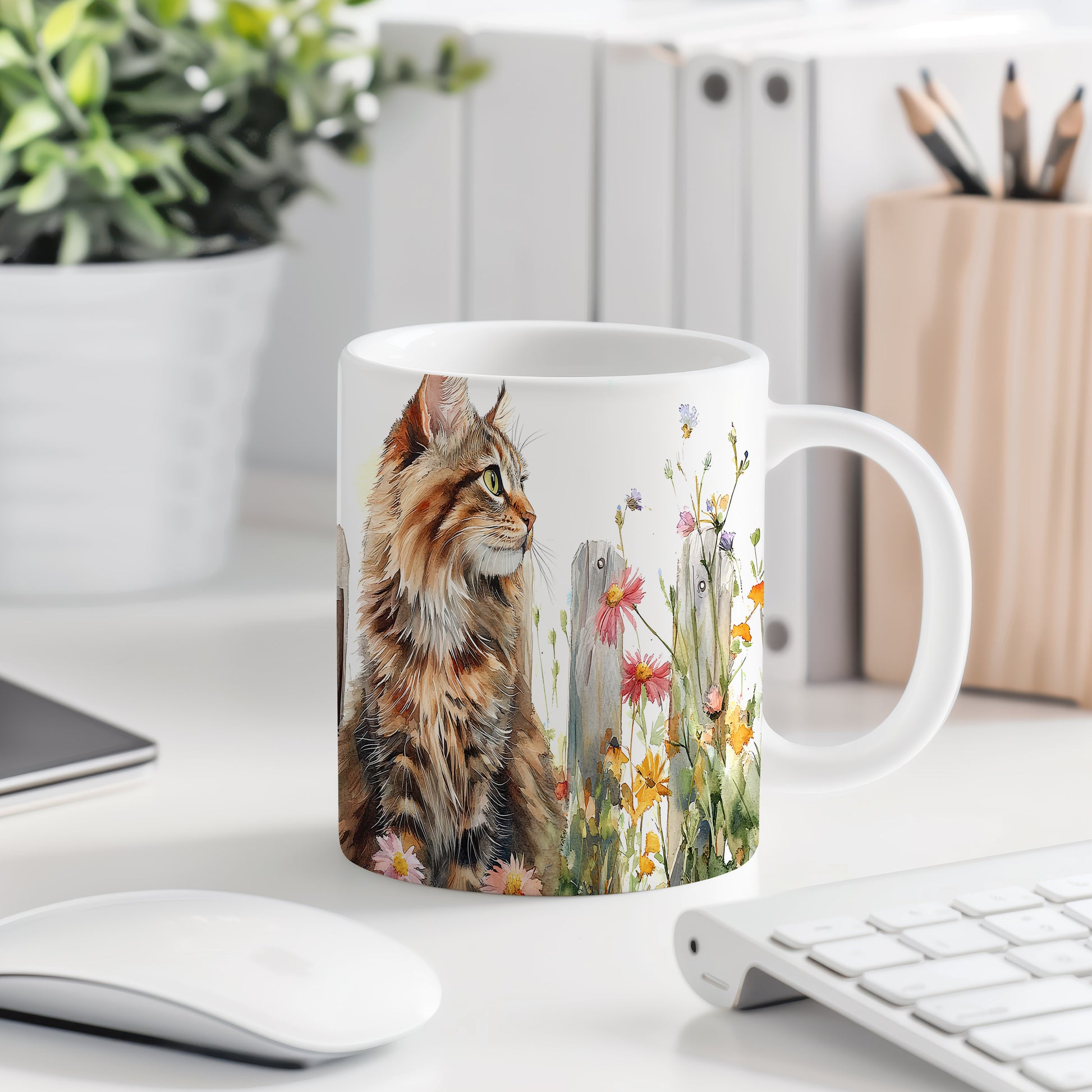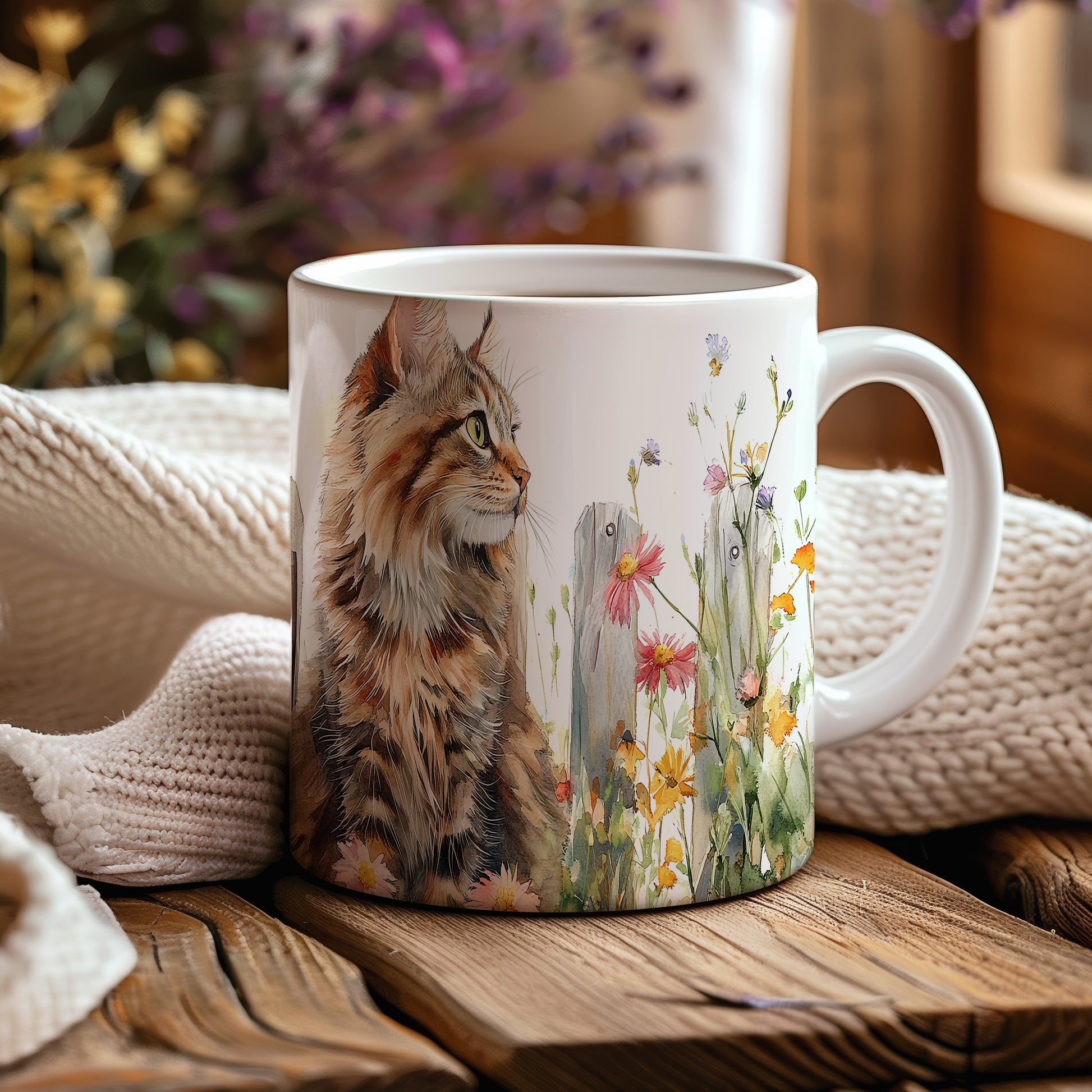 Tento hrnek zobrazuje kočku v malebném stylu, která sedí mezi květinami. Je ideální pro milovníky koček a přírody, skvělý tip na dárek pro přátele nebo rodinu. Materiál: keramika. Objem: 330 ml. Vhodné do myčky i mikrovlnky. Používáním tohoto hrnku si užijete nejen kávu nebo čaj, ale také krásný design, který potěší každého.