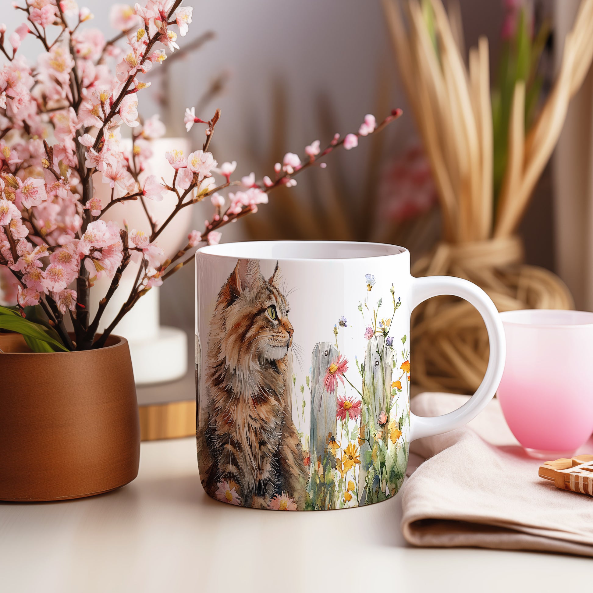Hrnek s kočkou mezi květinami – bílým provedením