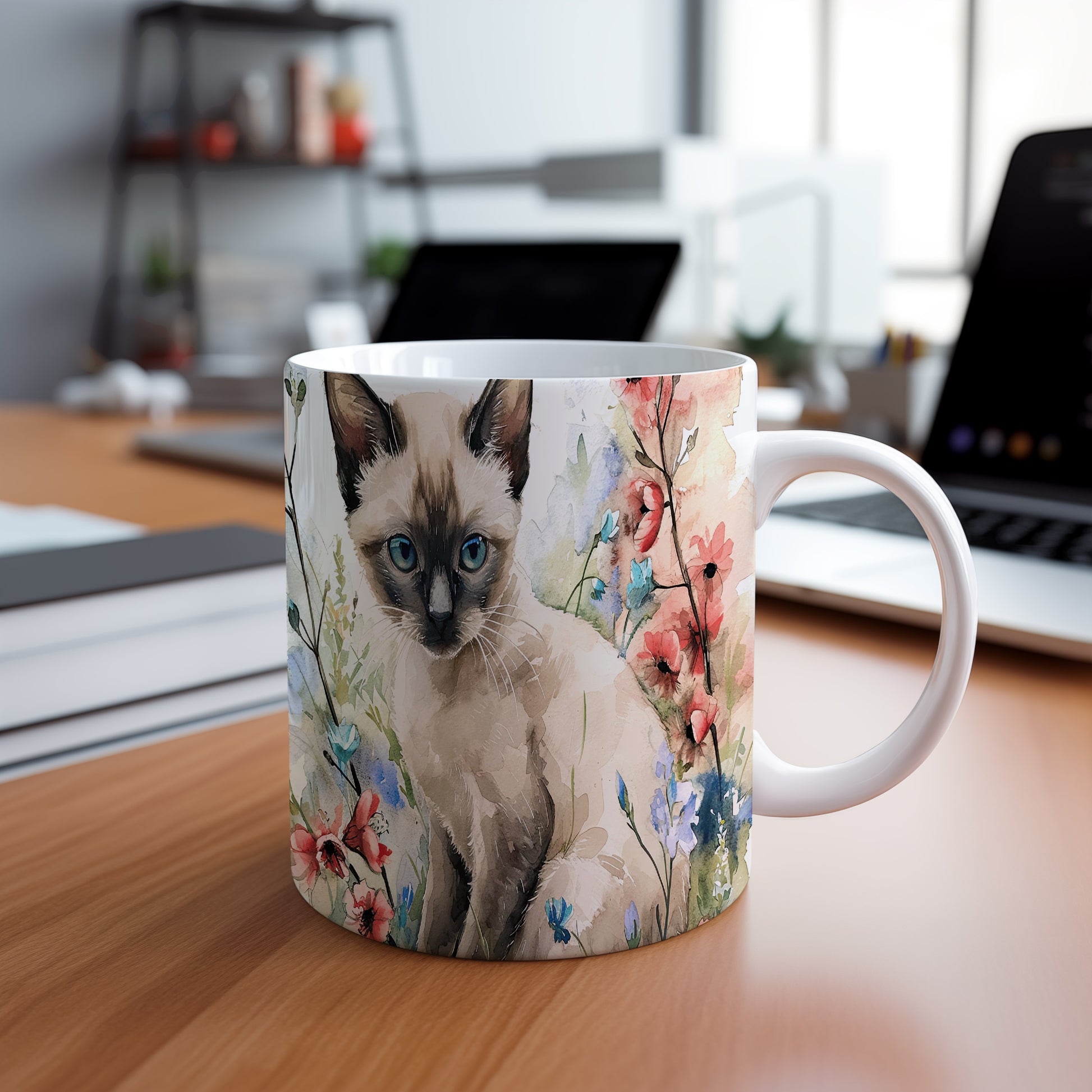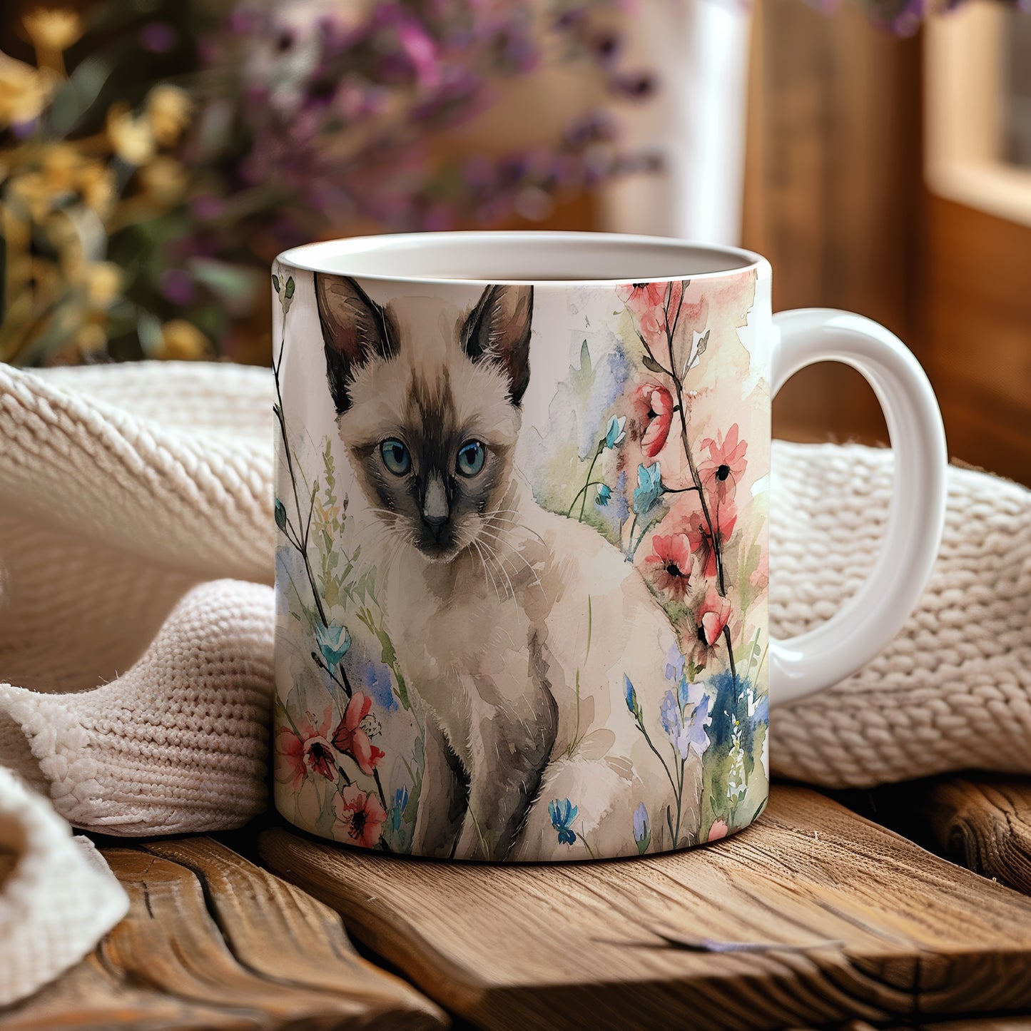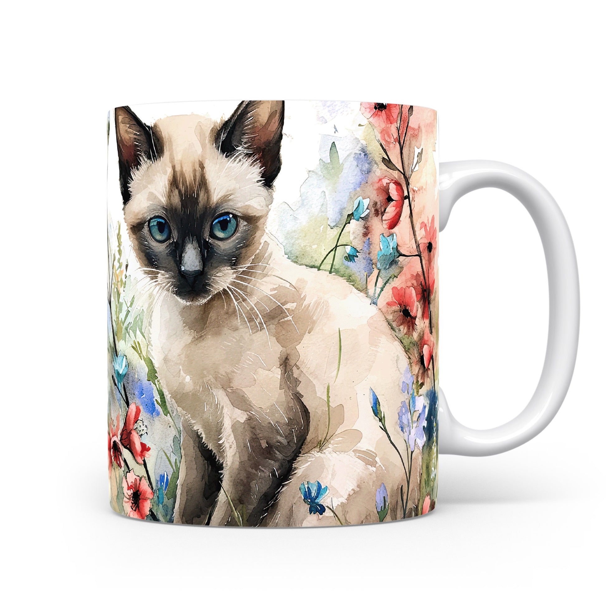 Tento krásný hrnek zobrazuje roztomilou siamskou kočku obklopenou barevnými květinami. Je ideální pro milovníky koček a přírody, skvělý tip na dárek pro každého, kdo má rád zvířata. Materiál: keramika. Objem: 330 ml. Vhodné do myčky i mikrovlnky. Užívejte si kávu nebo čaj s tímto jedinečným hrnkem, který přináší radost do každého dne.