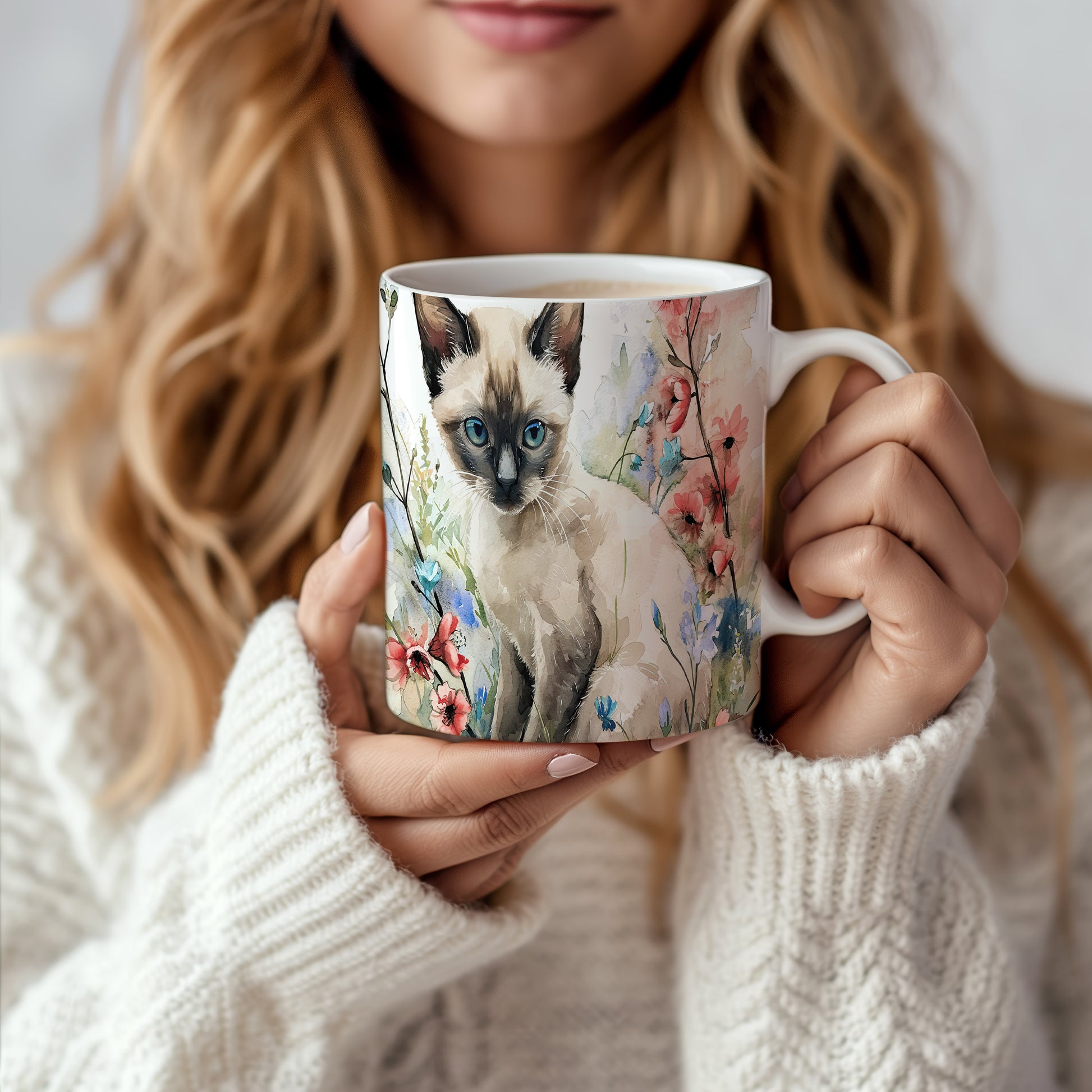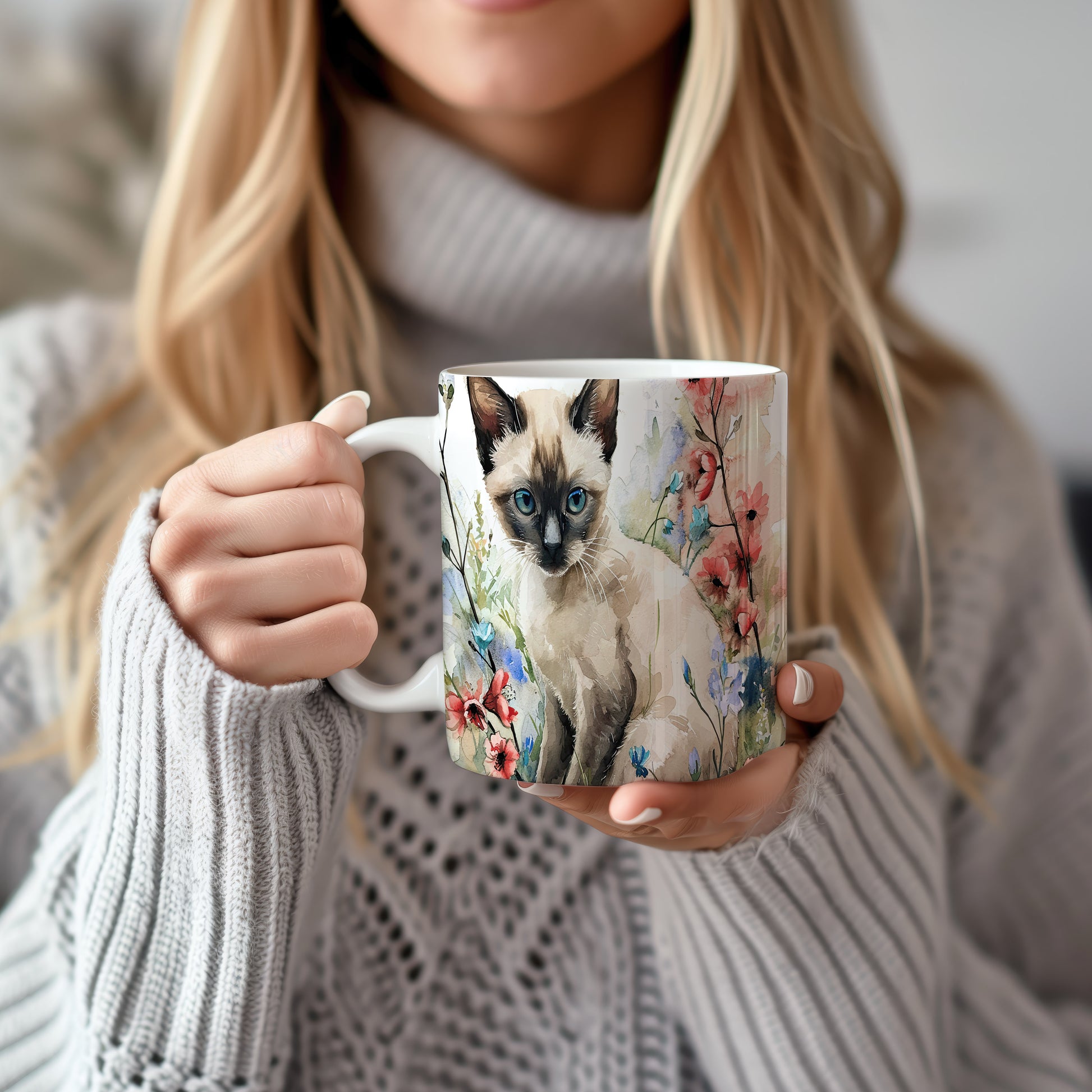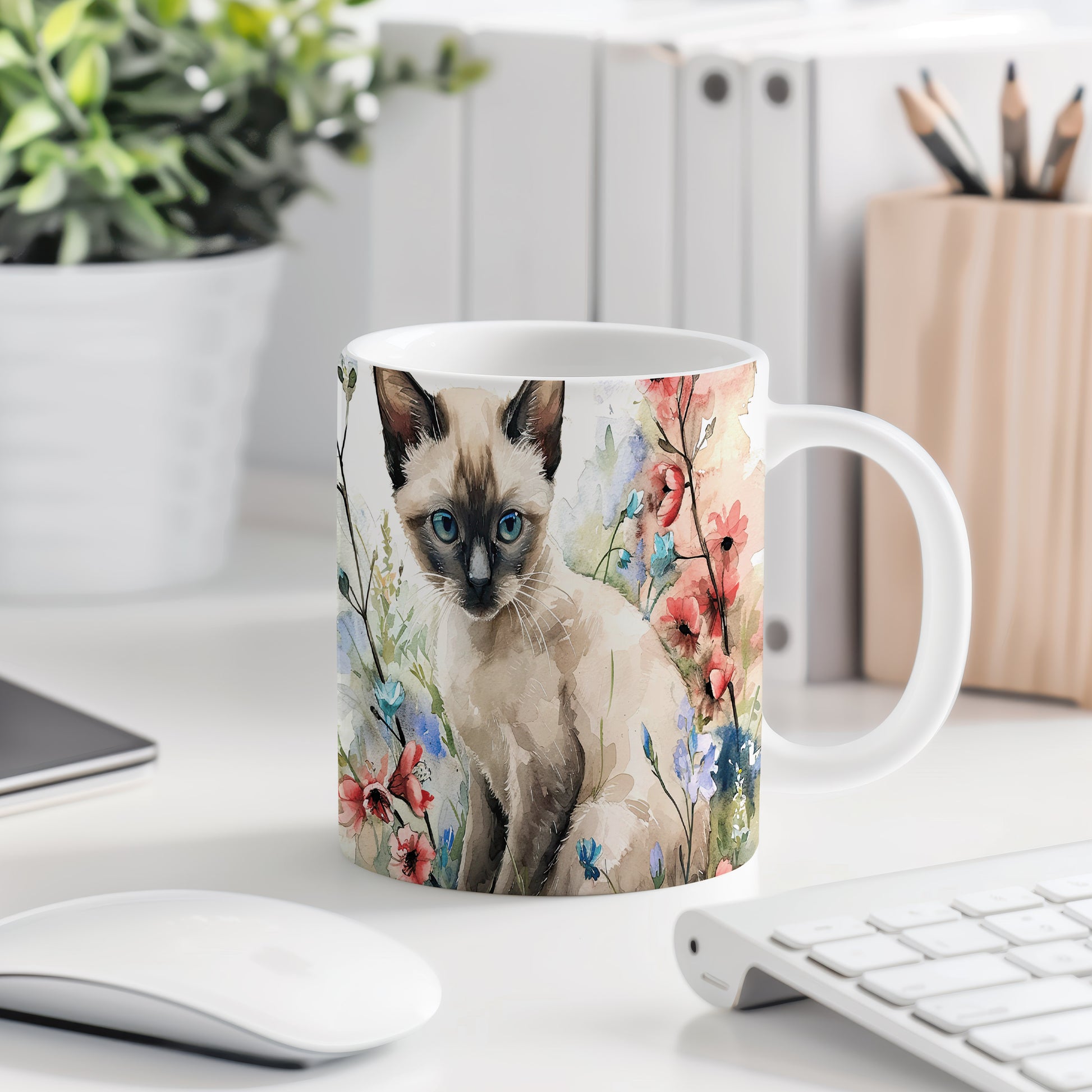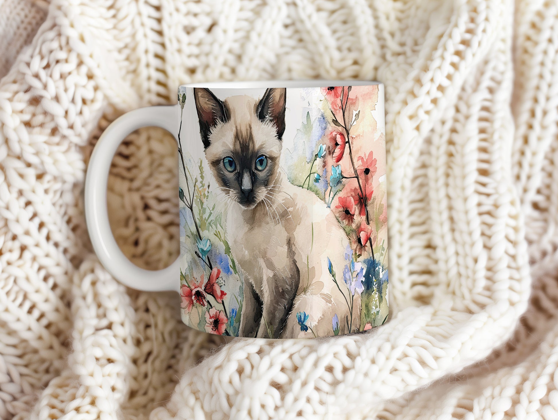 Tento krásný hrnek zobrazuje roztomilou siamskou kočku obklopenou barevnými květinami. Je ideální pro milovníky koček a přírody, skvělý tip na dárek pro každého, kdo má rád zvířata. Materiál: keramika. Objem: 330 ml. Vhodné do myčky i mikrovlnky. Užívejte si kávu nebo čaj s tímto jedinečným hrnkem, který přináší radost do každého dne.