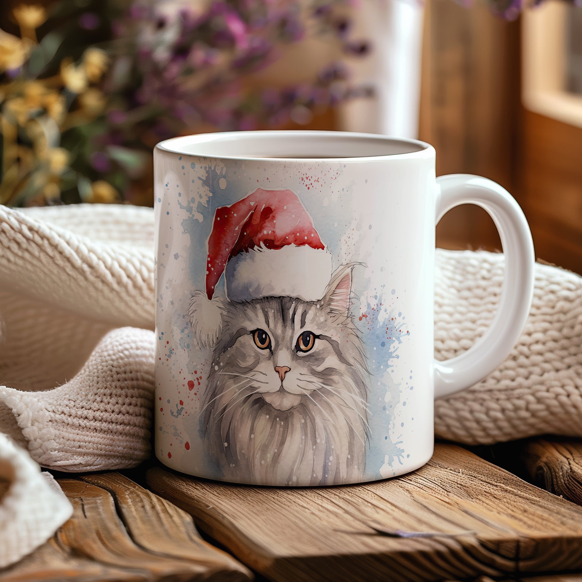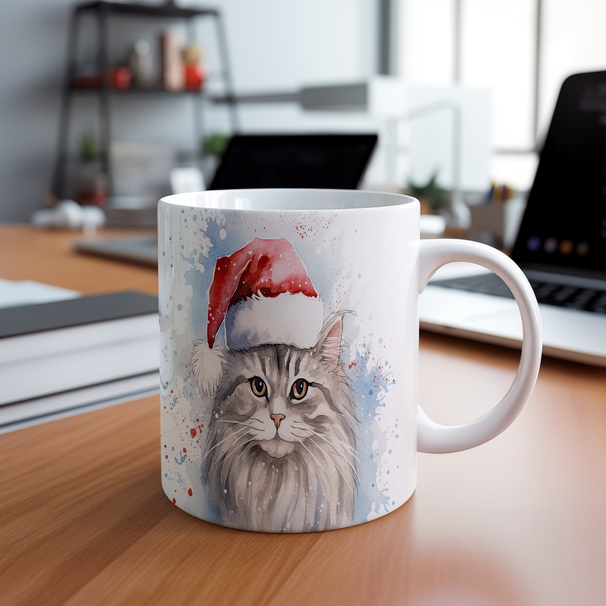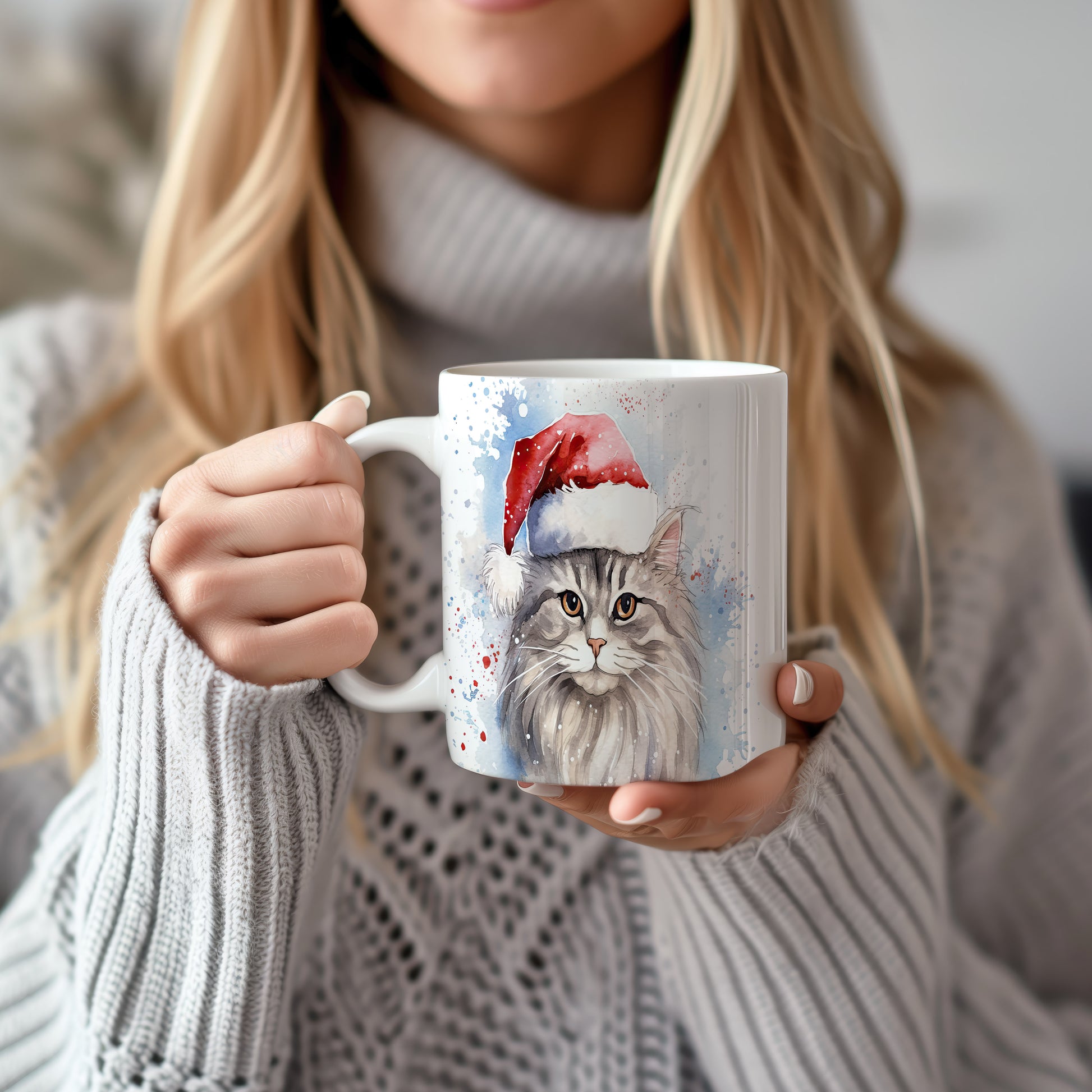 Tento stylový hrnek zobrazuje roztomilou kočku v červené vánoční čepici. Je ideální pro milovníky koček a skvělým dárkem pro přátele na zimní období. Materiál: keramika. Objem: 330 ml. Vhodné do myčky i mikrovlnky. Díky svému designu přináší radost při každém doušku vašeho oblíbeného nápoje.