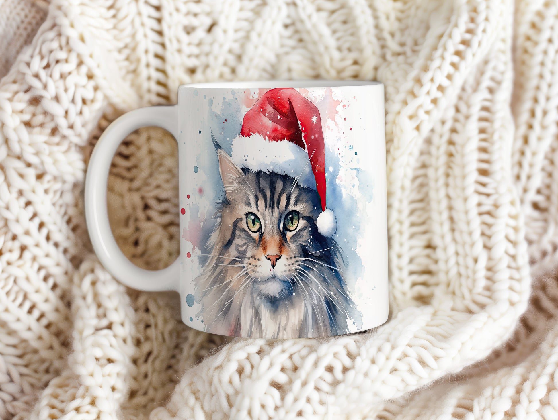 Hrnek s kočkou v čepici Santa – modrými detaily