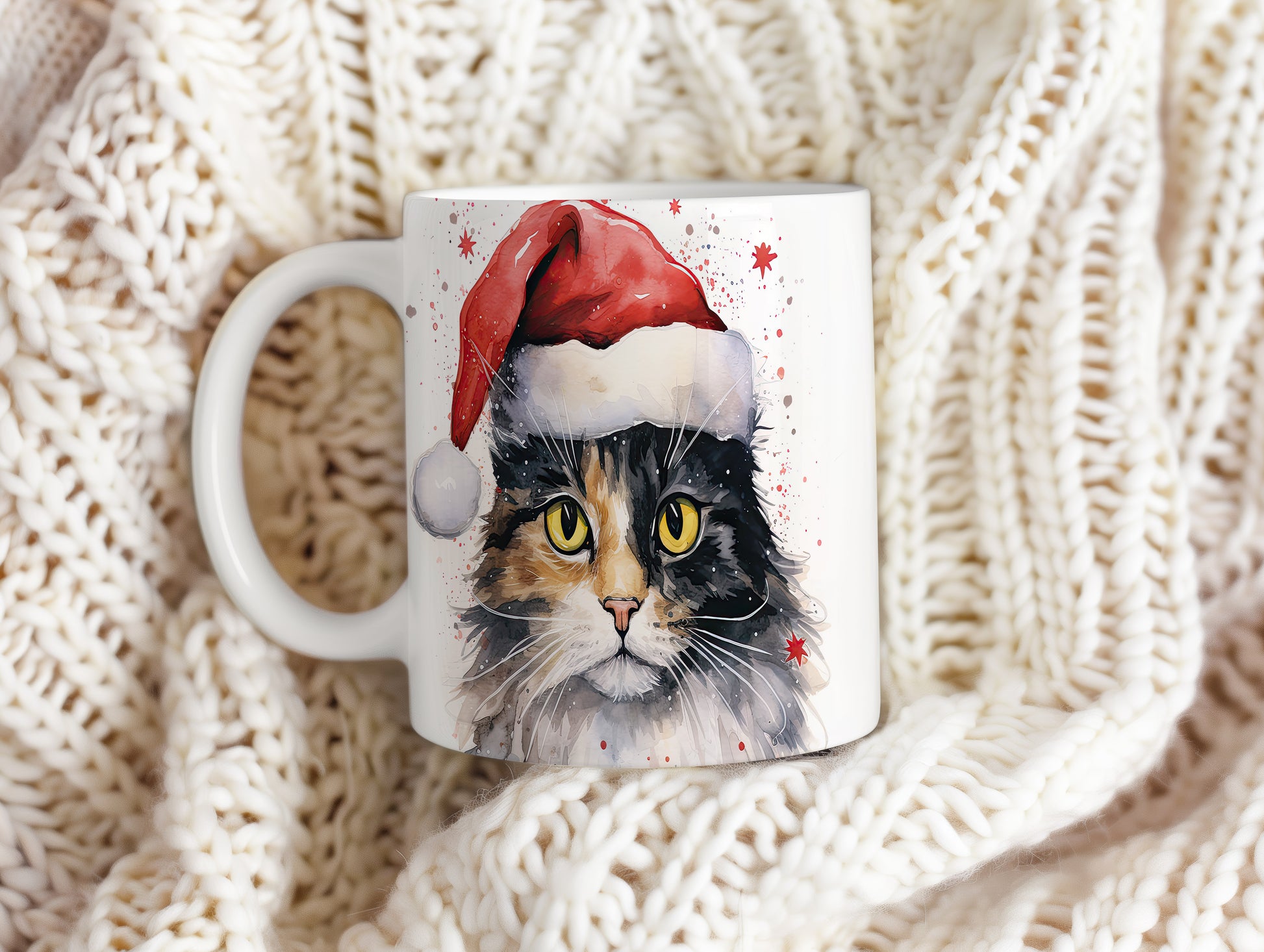 Hrnek s kočkou v čepici Santa – radostná digitální ilustrace