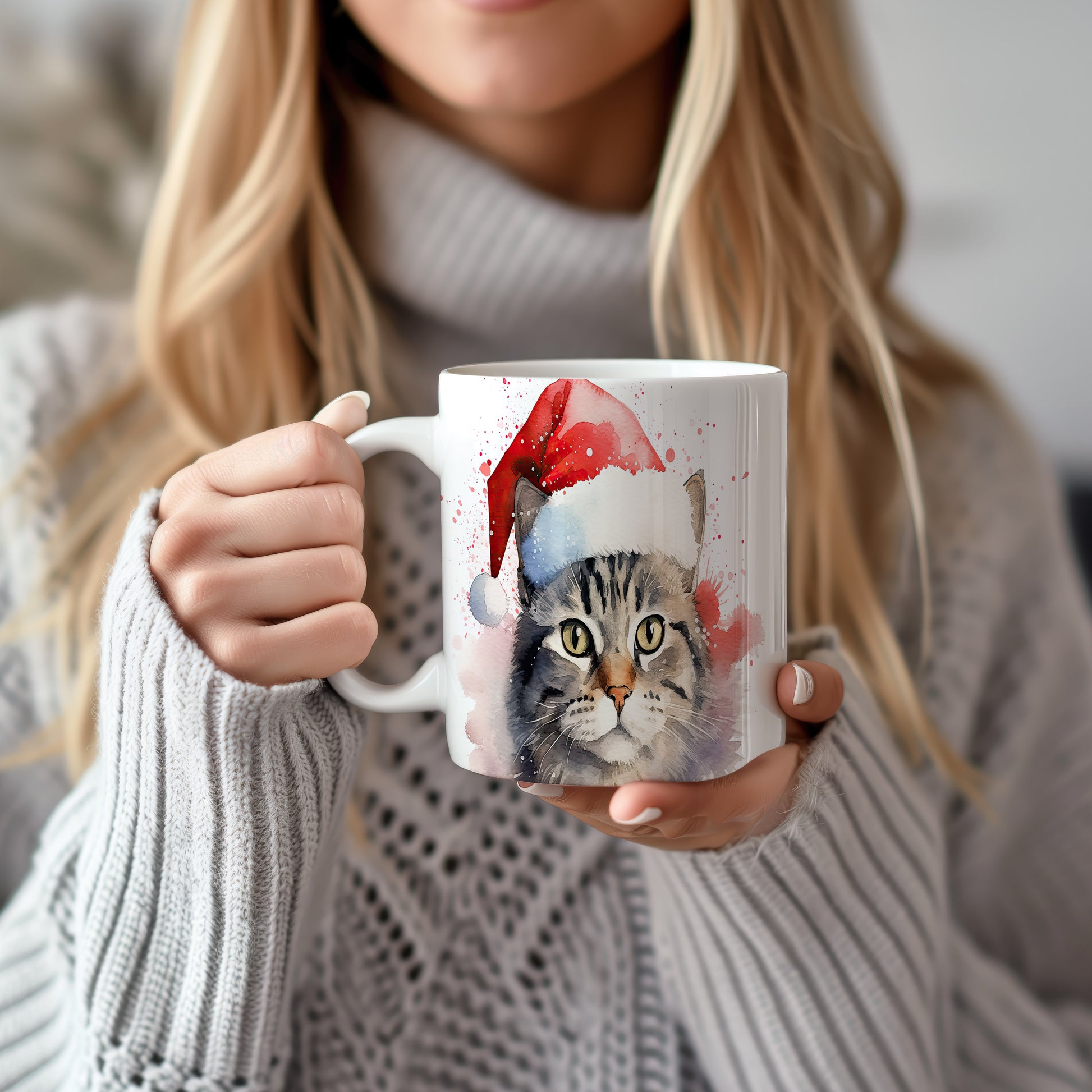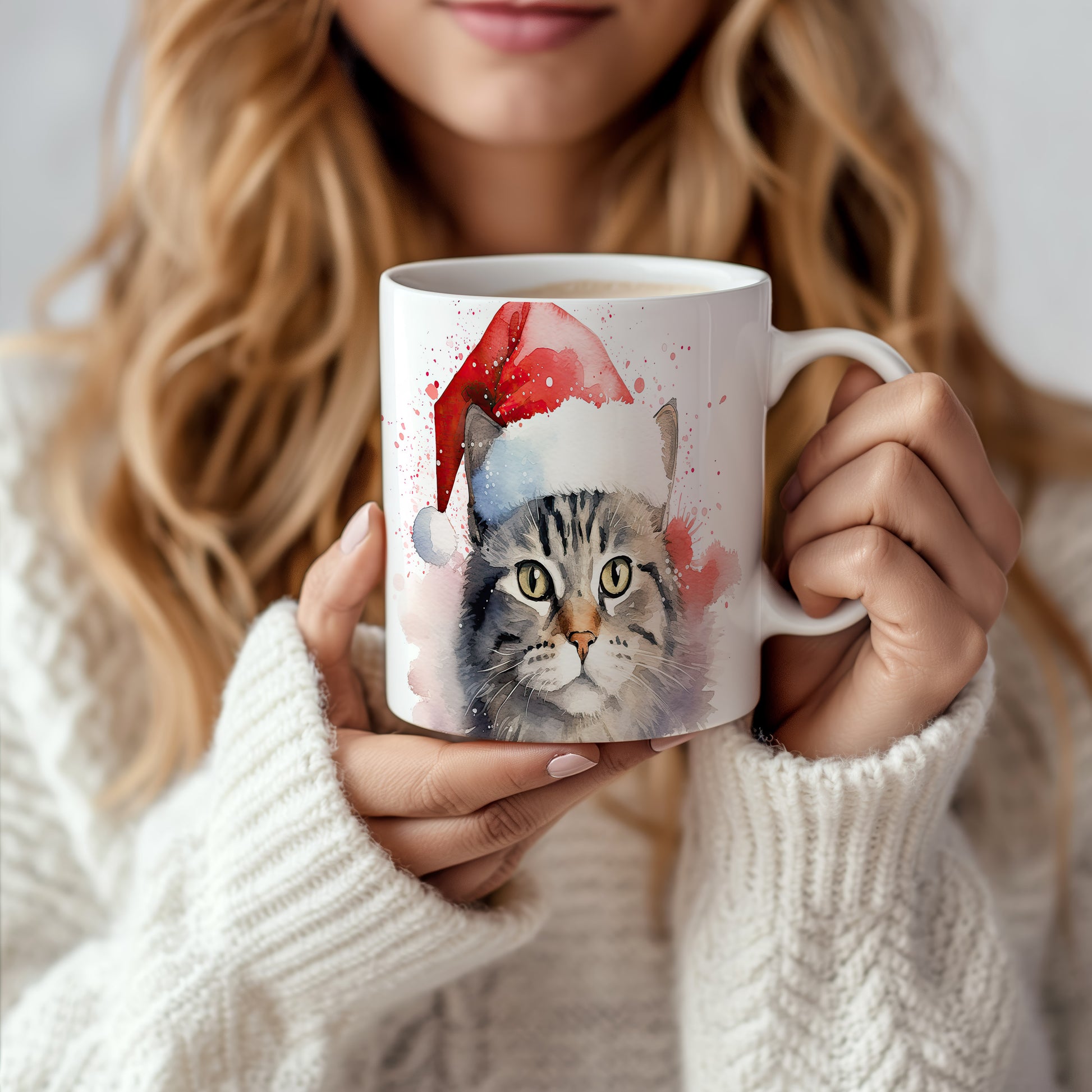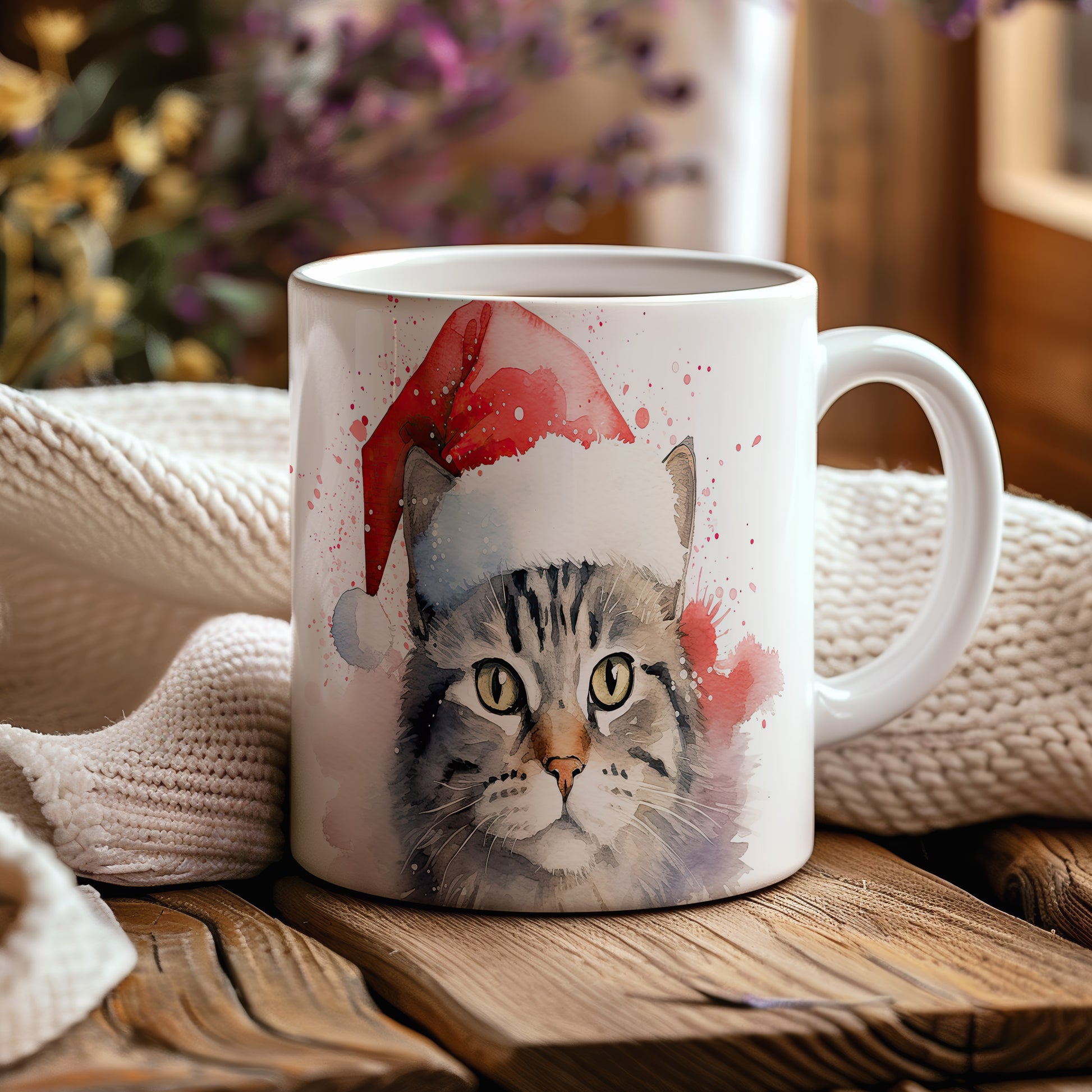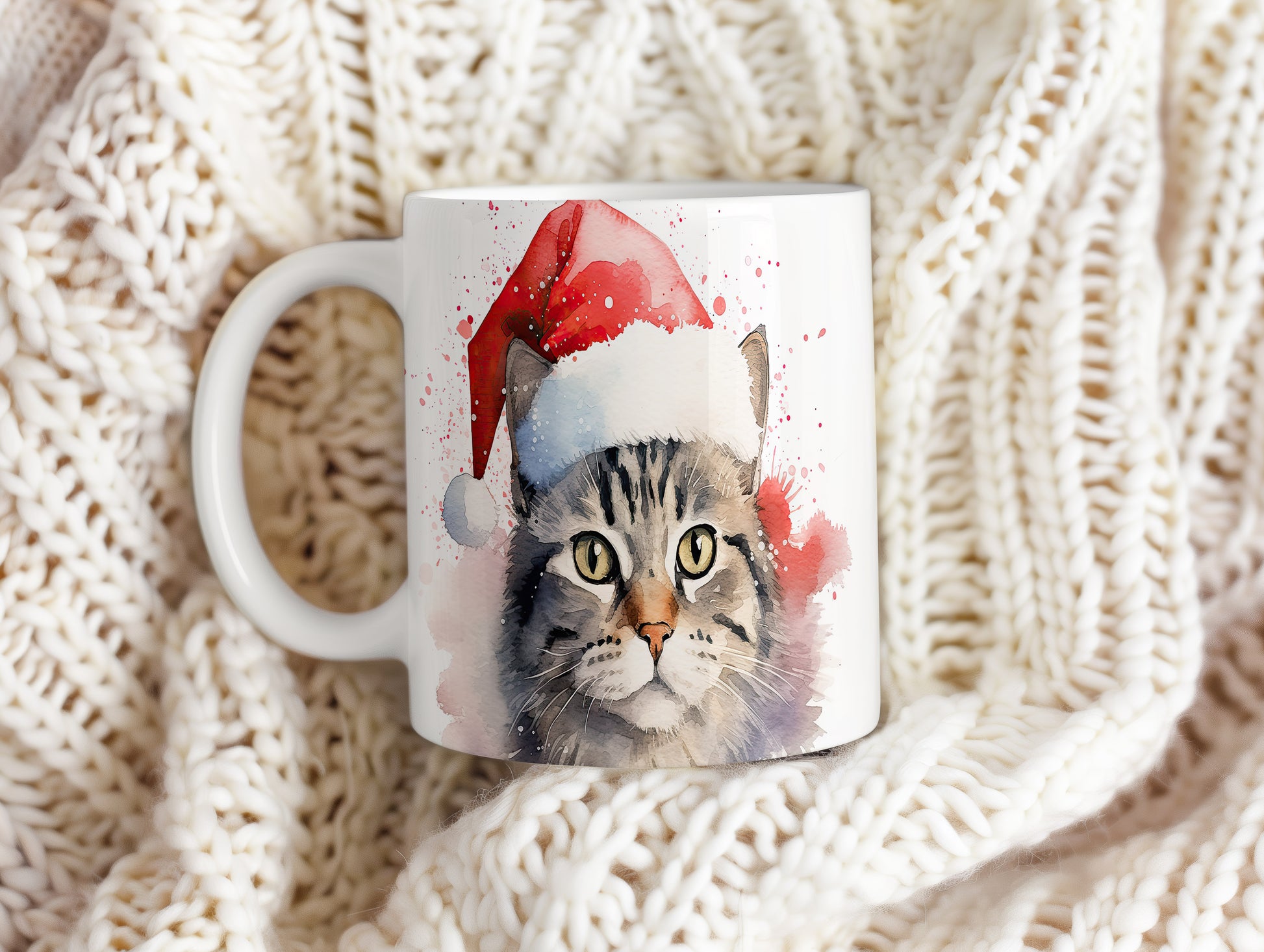 Hrnek s kočkou v čepici – vánočním akvarelovým stylem
