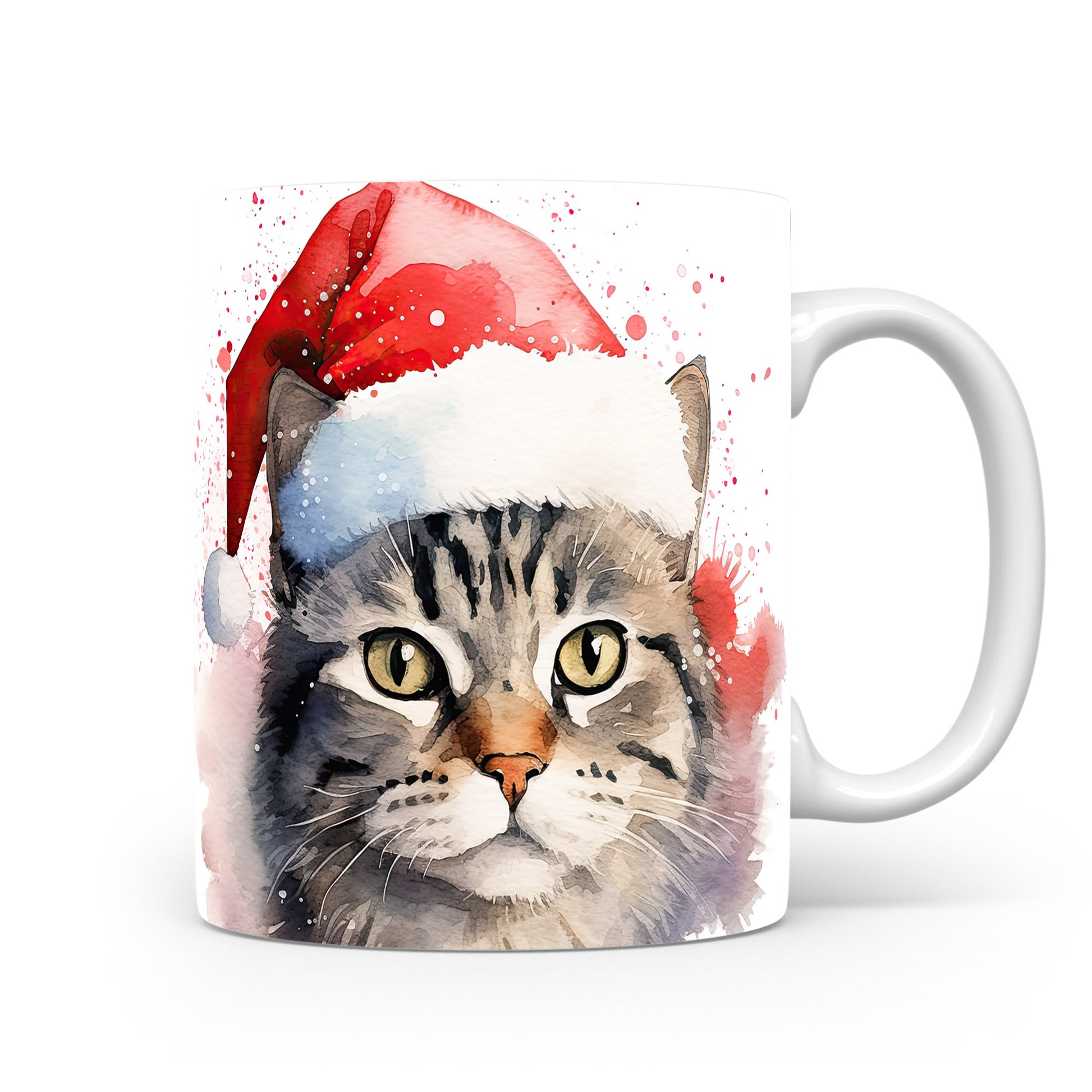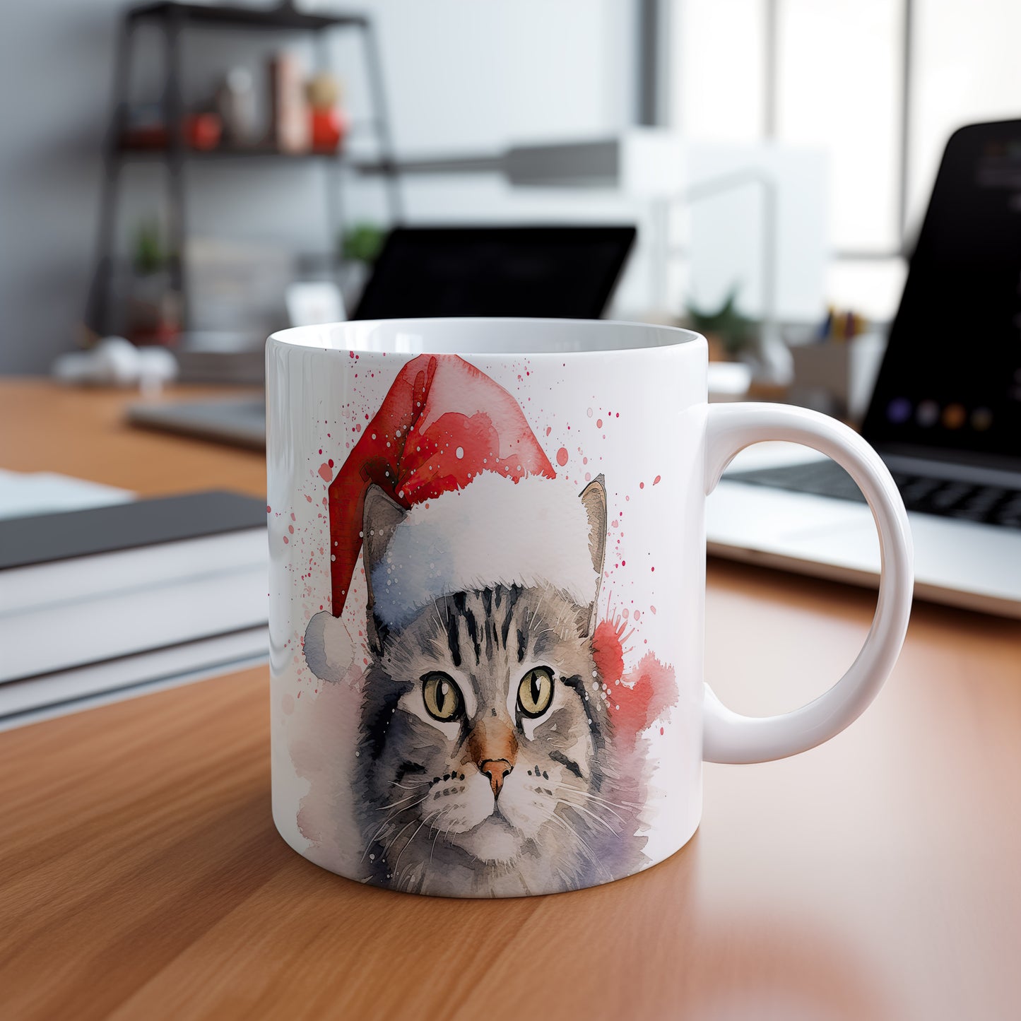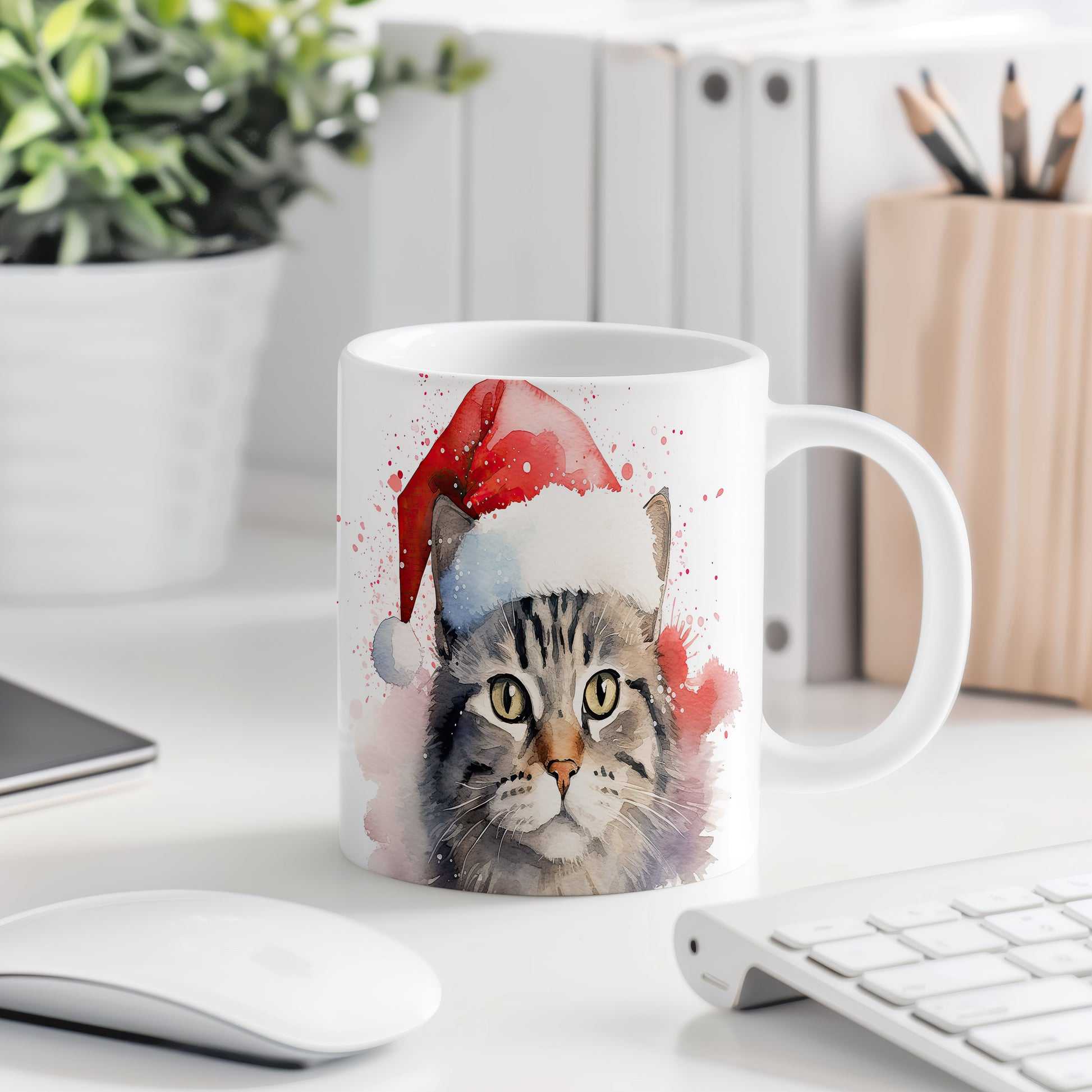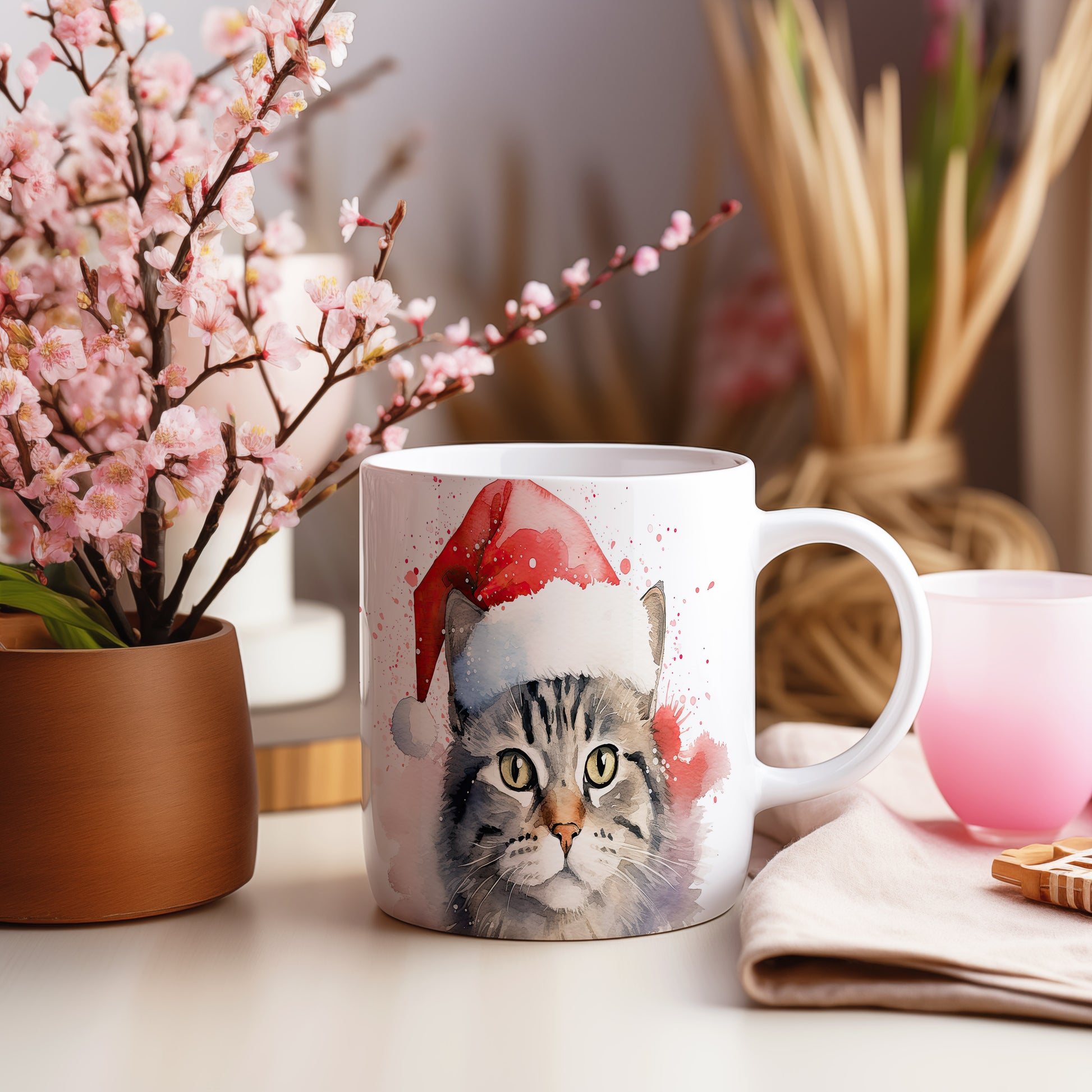 Hrnek s kočkou v čepici – vánočním akvarelovým stylem