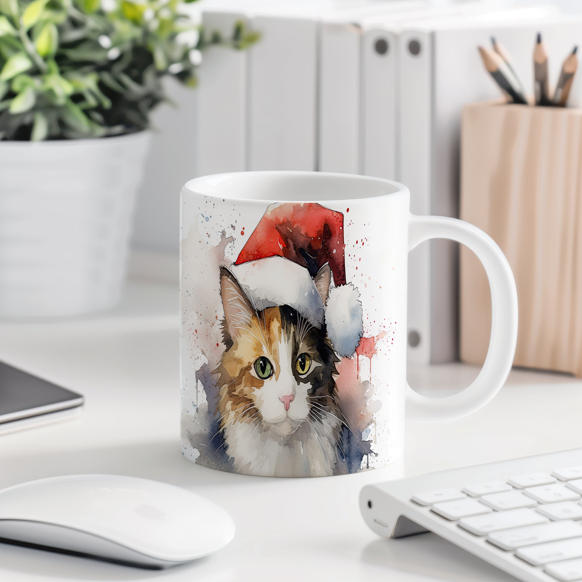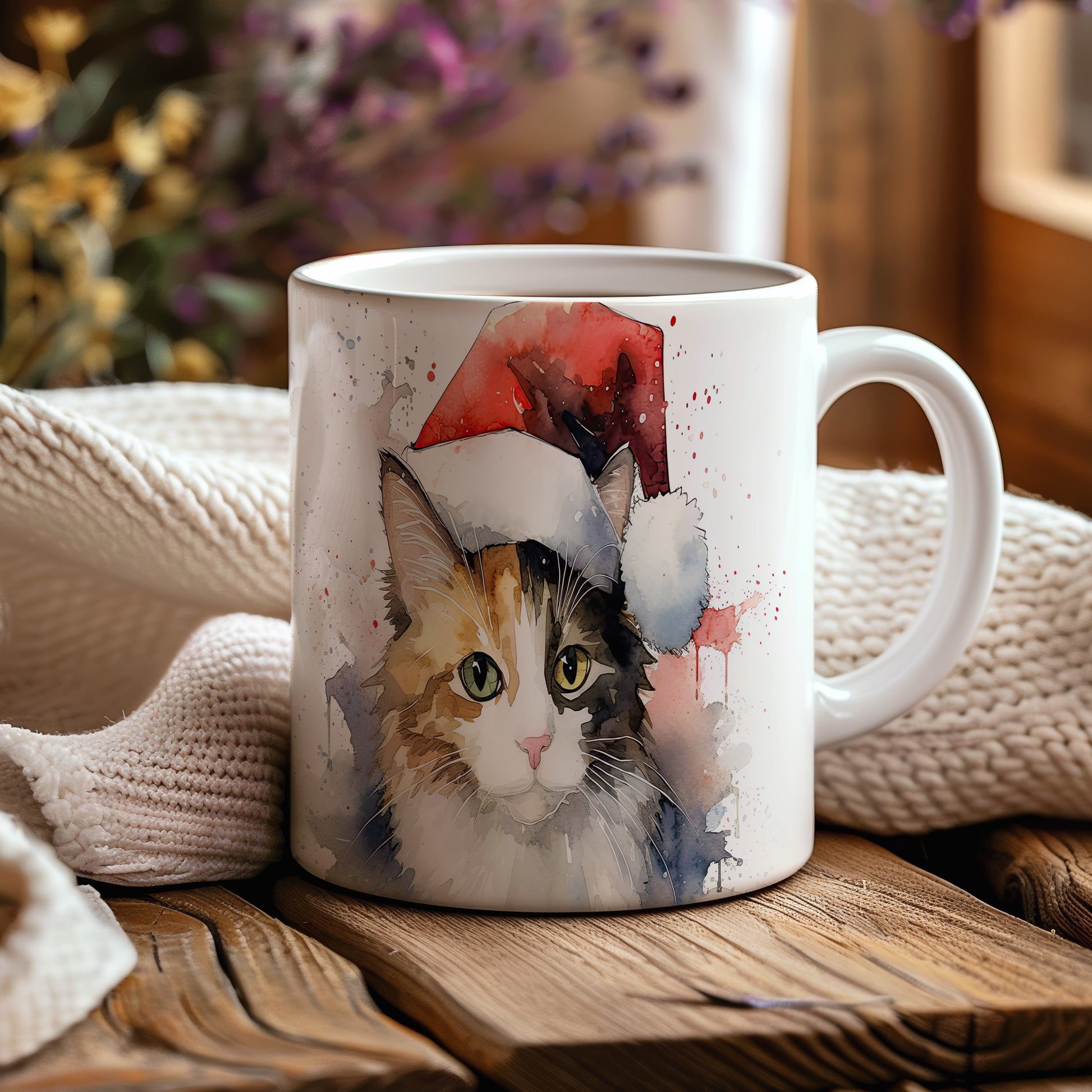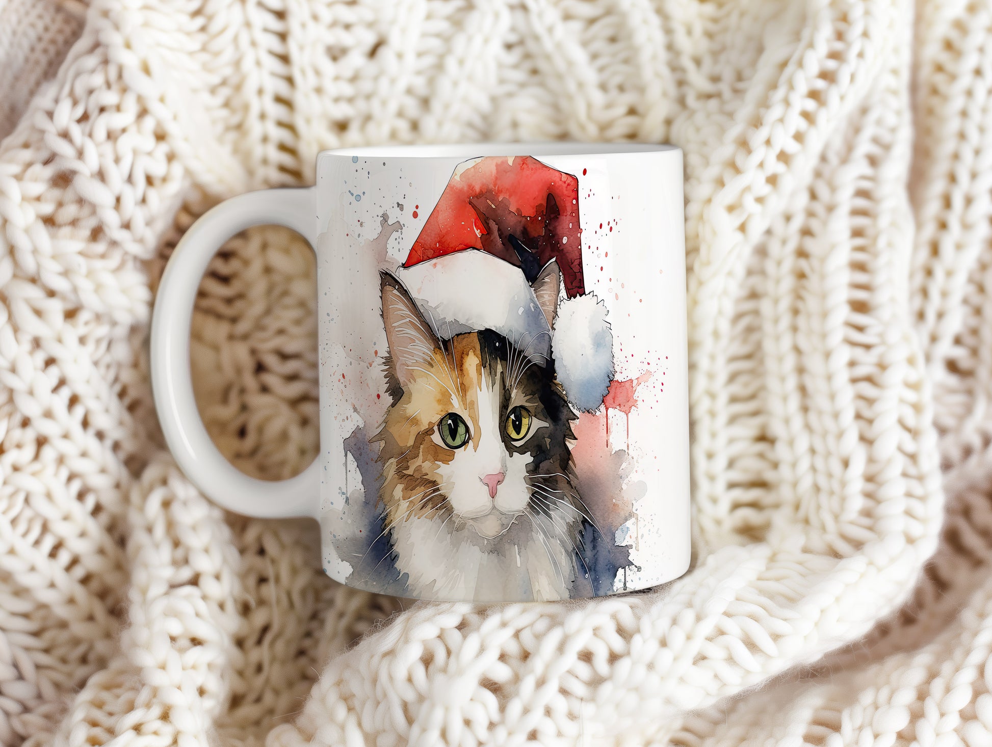 Hrnek s kočkou v vánoční čepici – malířským vzhledem