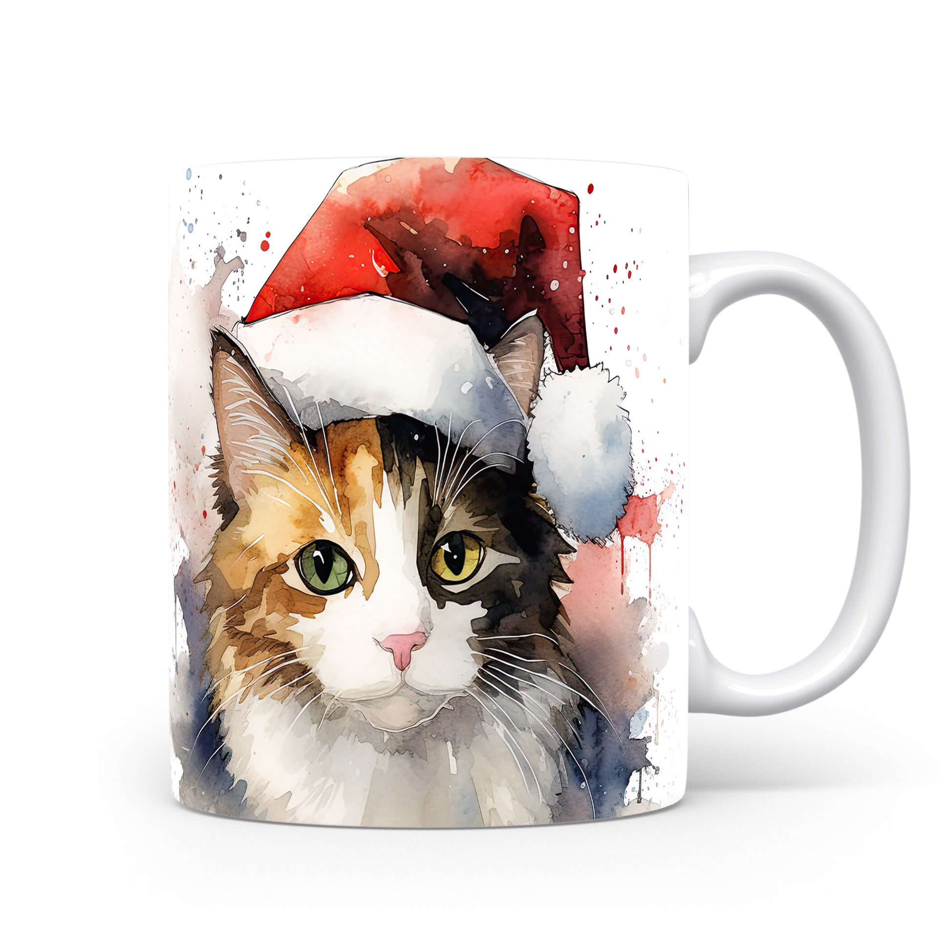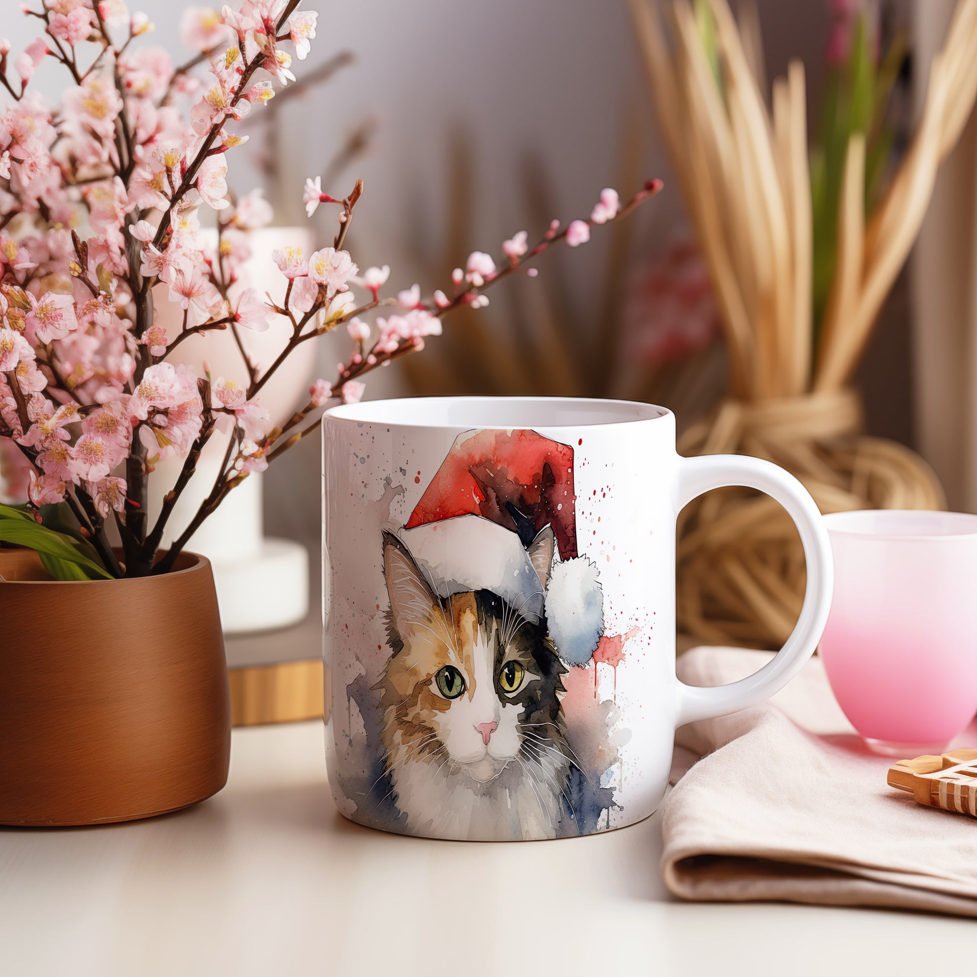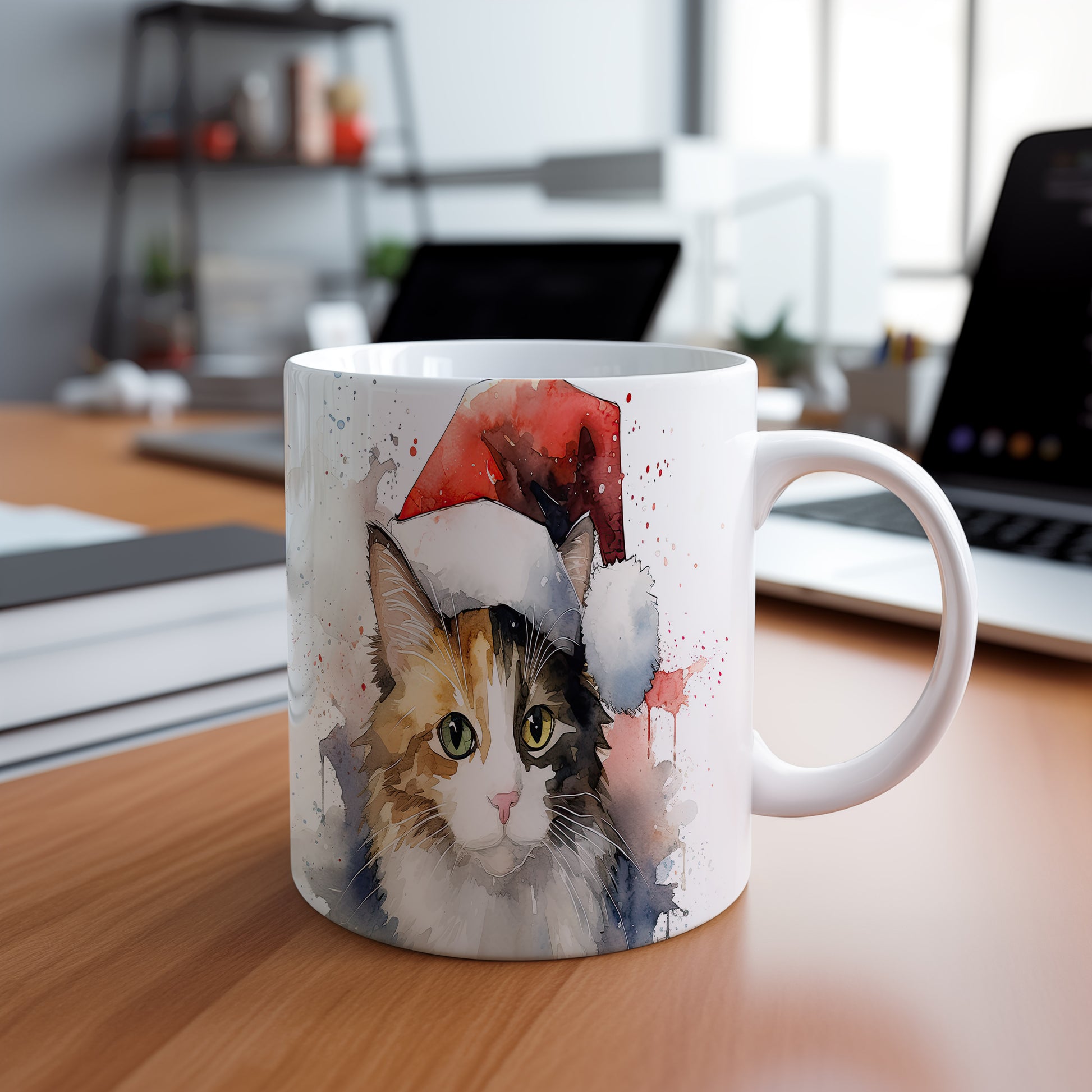 Hrnek s kočkou v vánoční čepici – malířským vzhledem