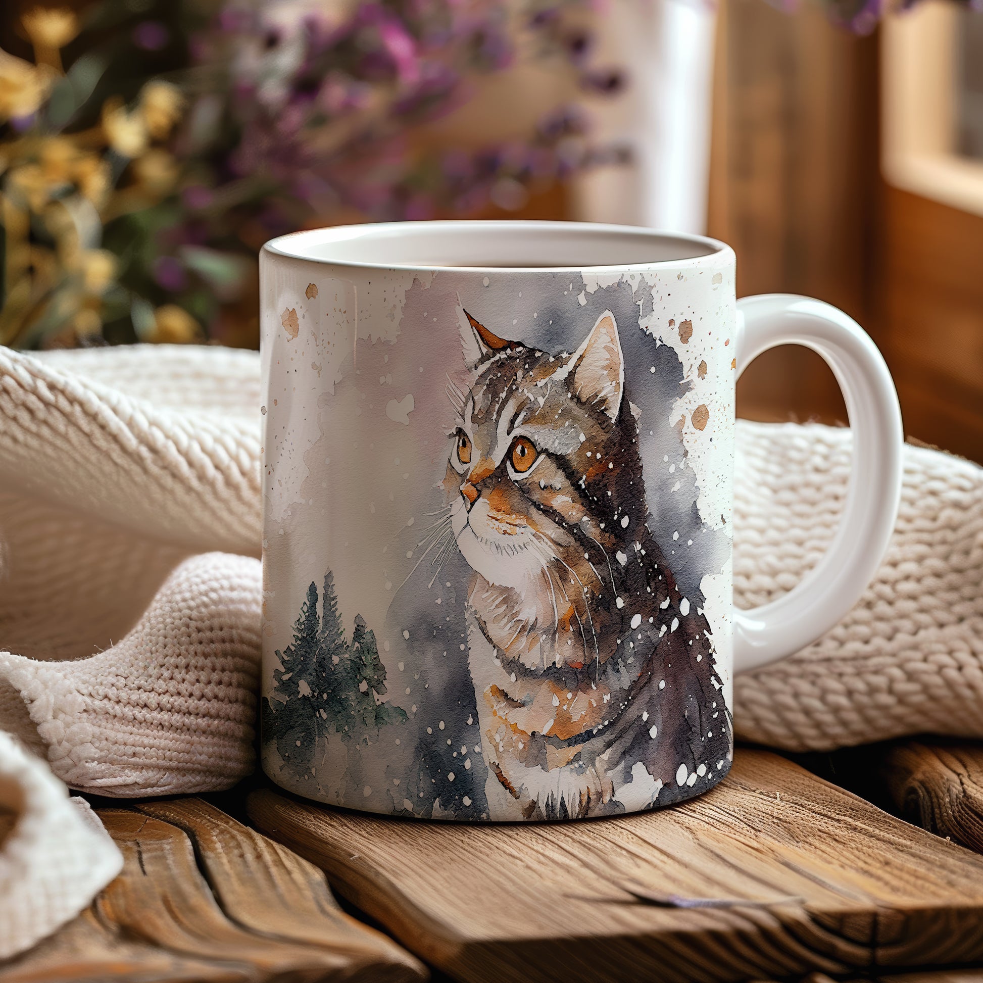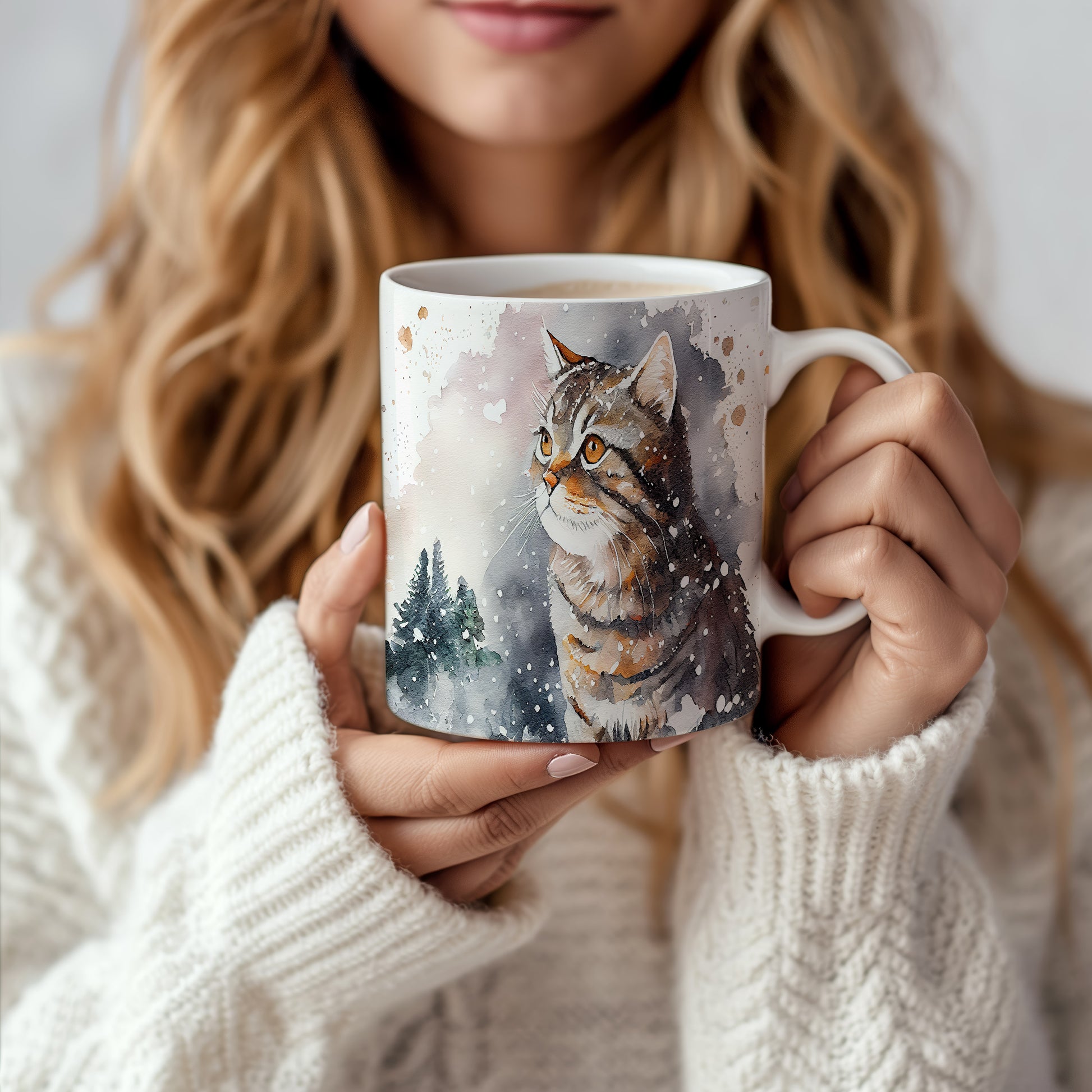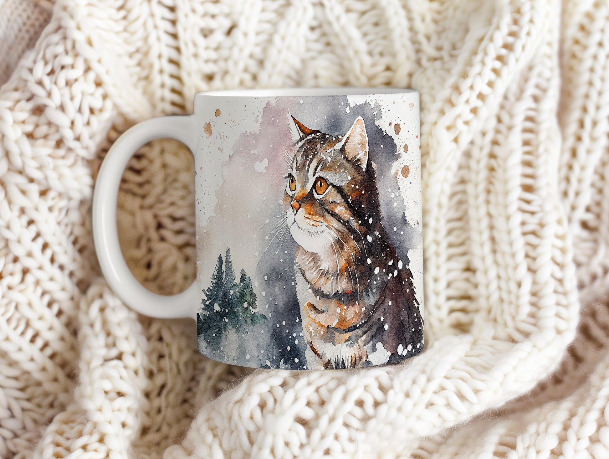 Hrnek s kočkou v zasněžené krajině – roztomilým motivem