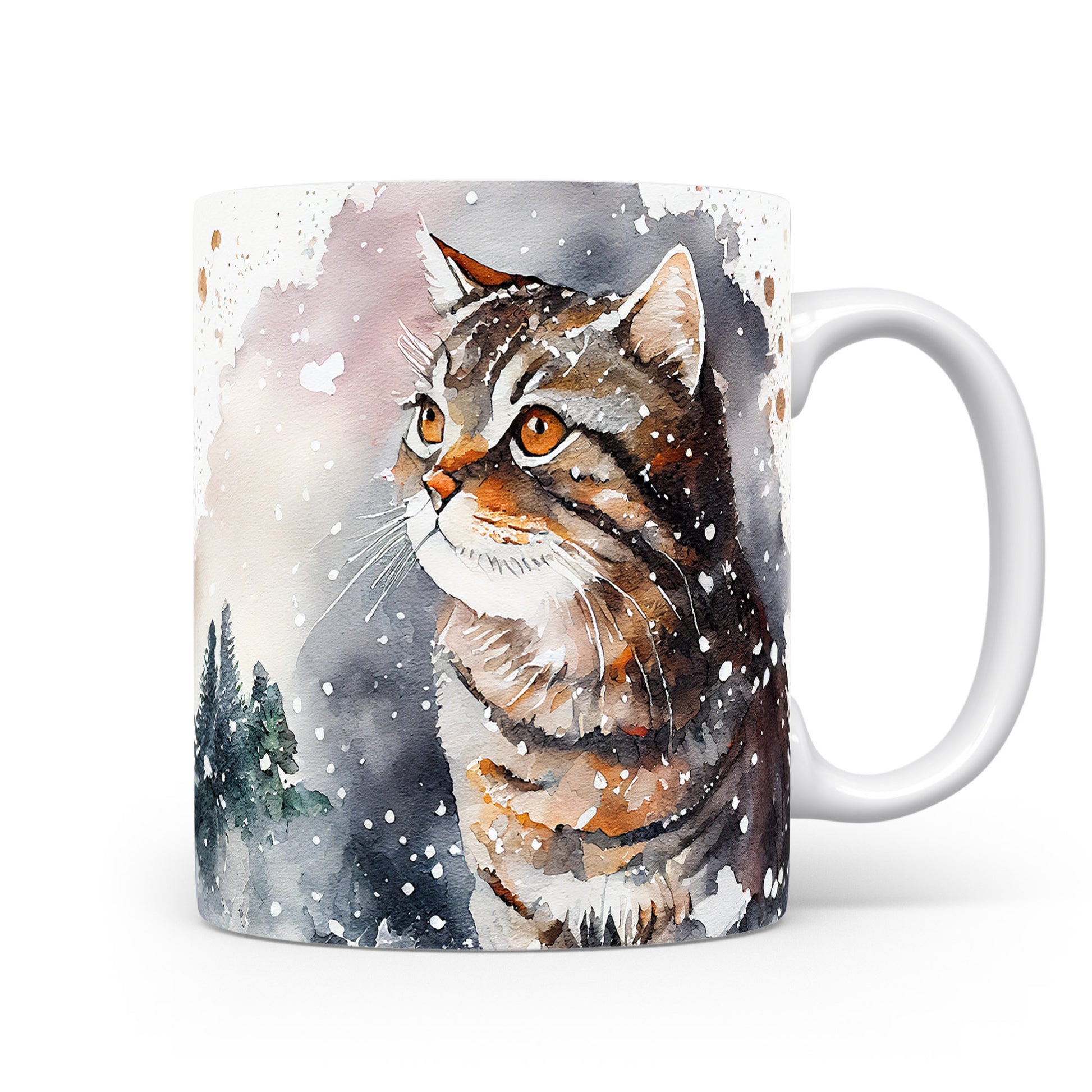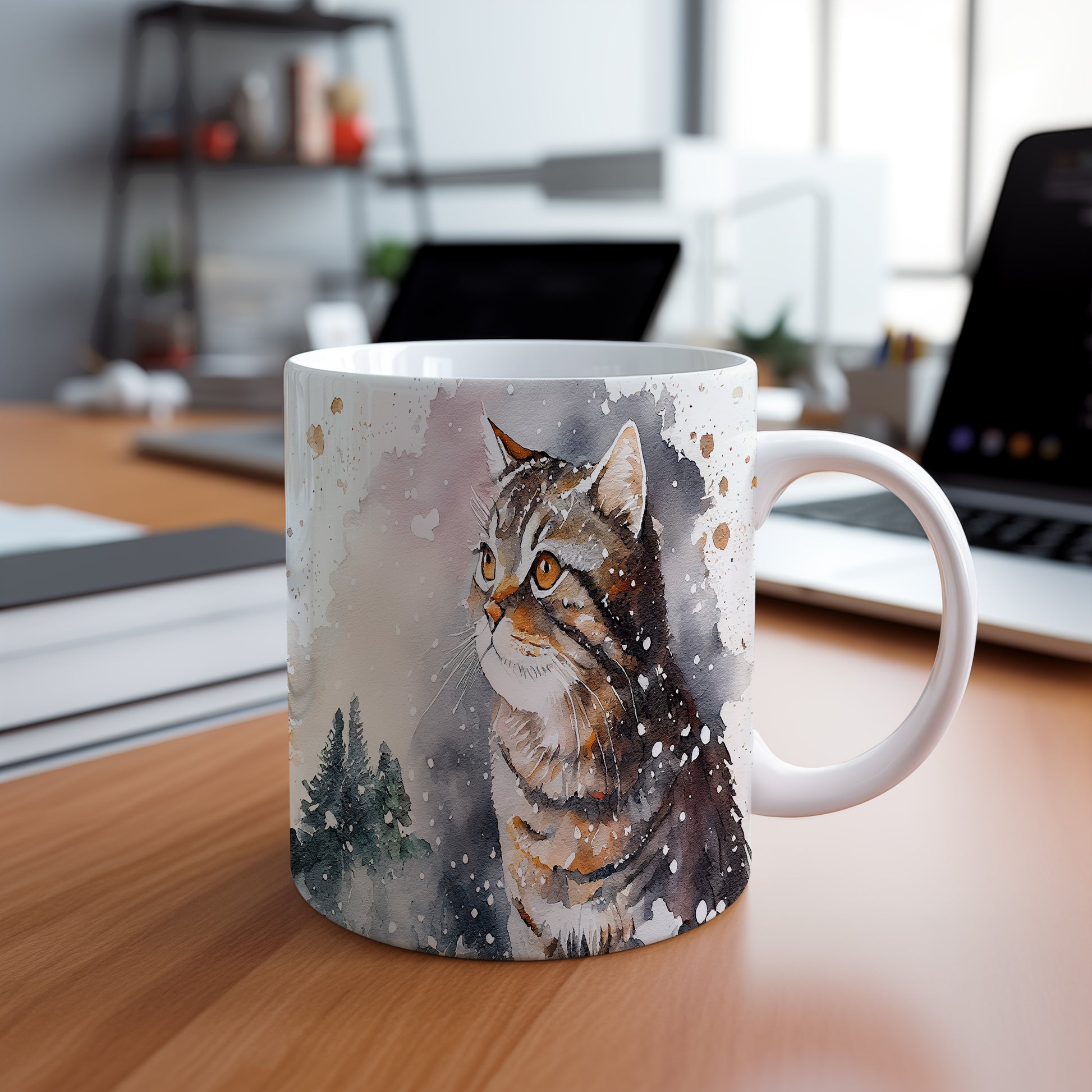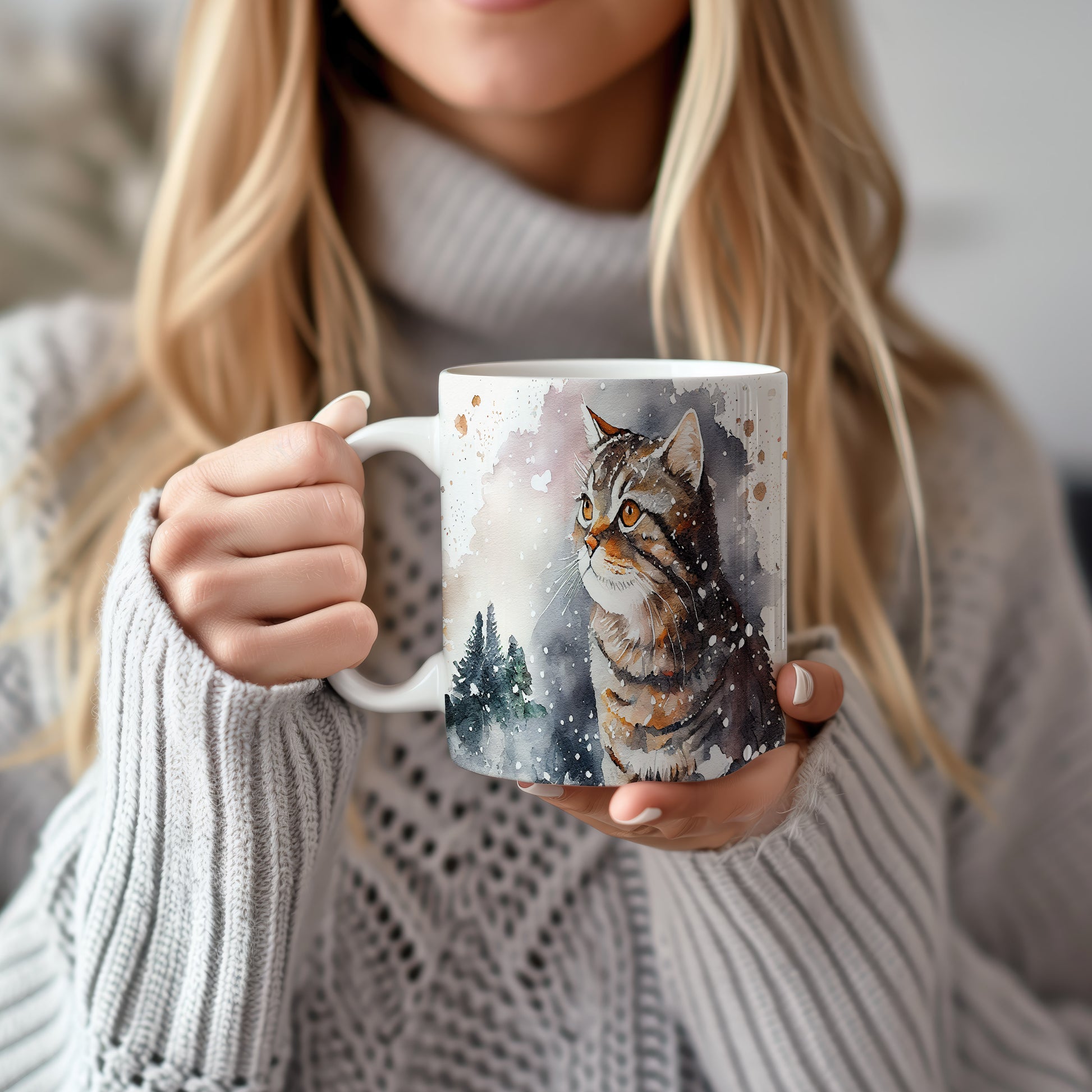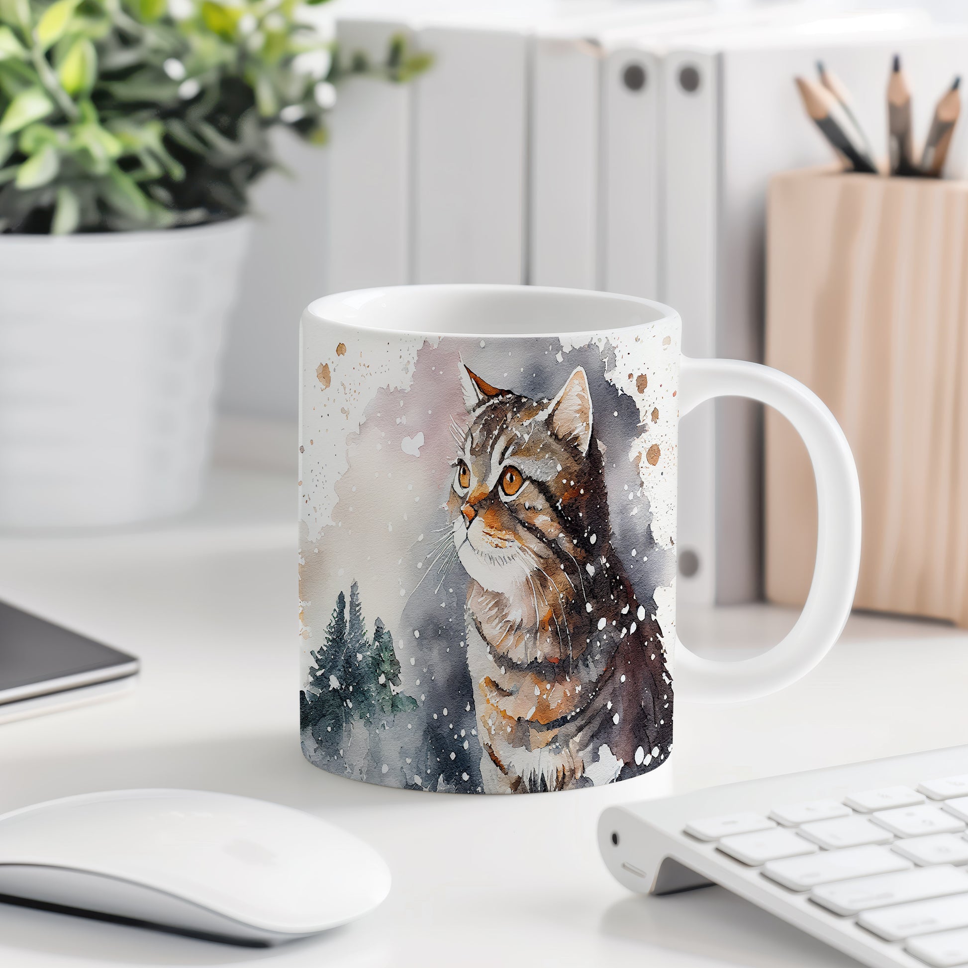 Hrnek s kočkou v zasněžené krajině – roztomilým motivem