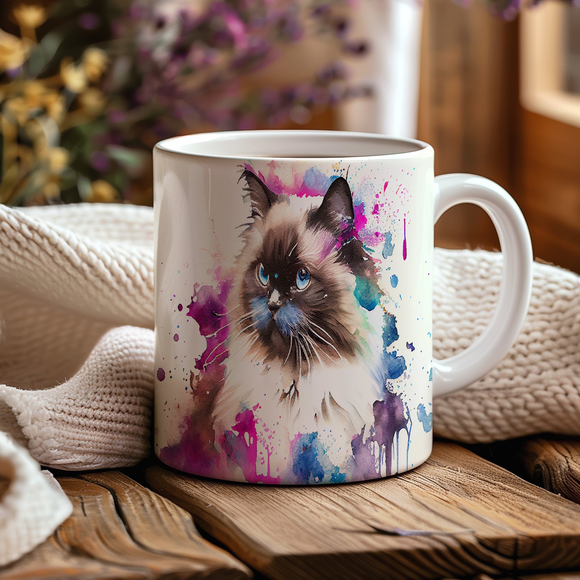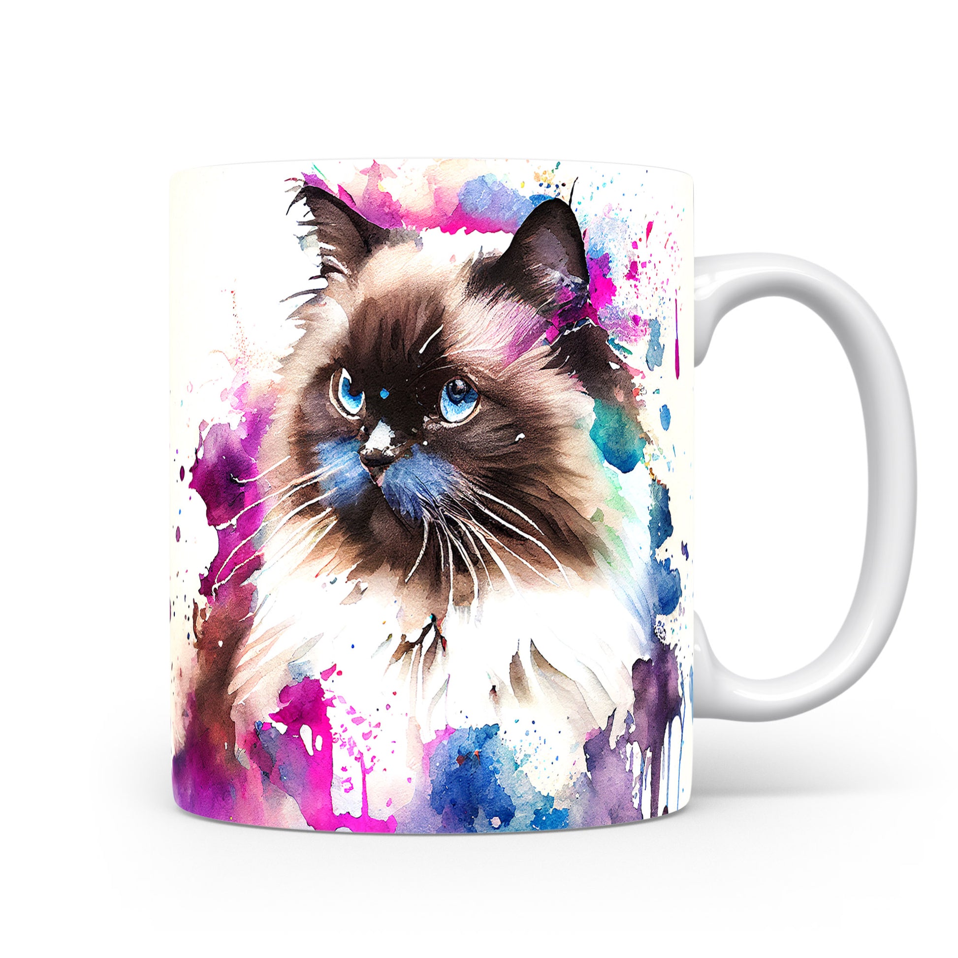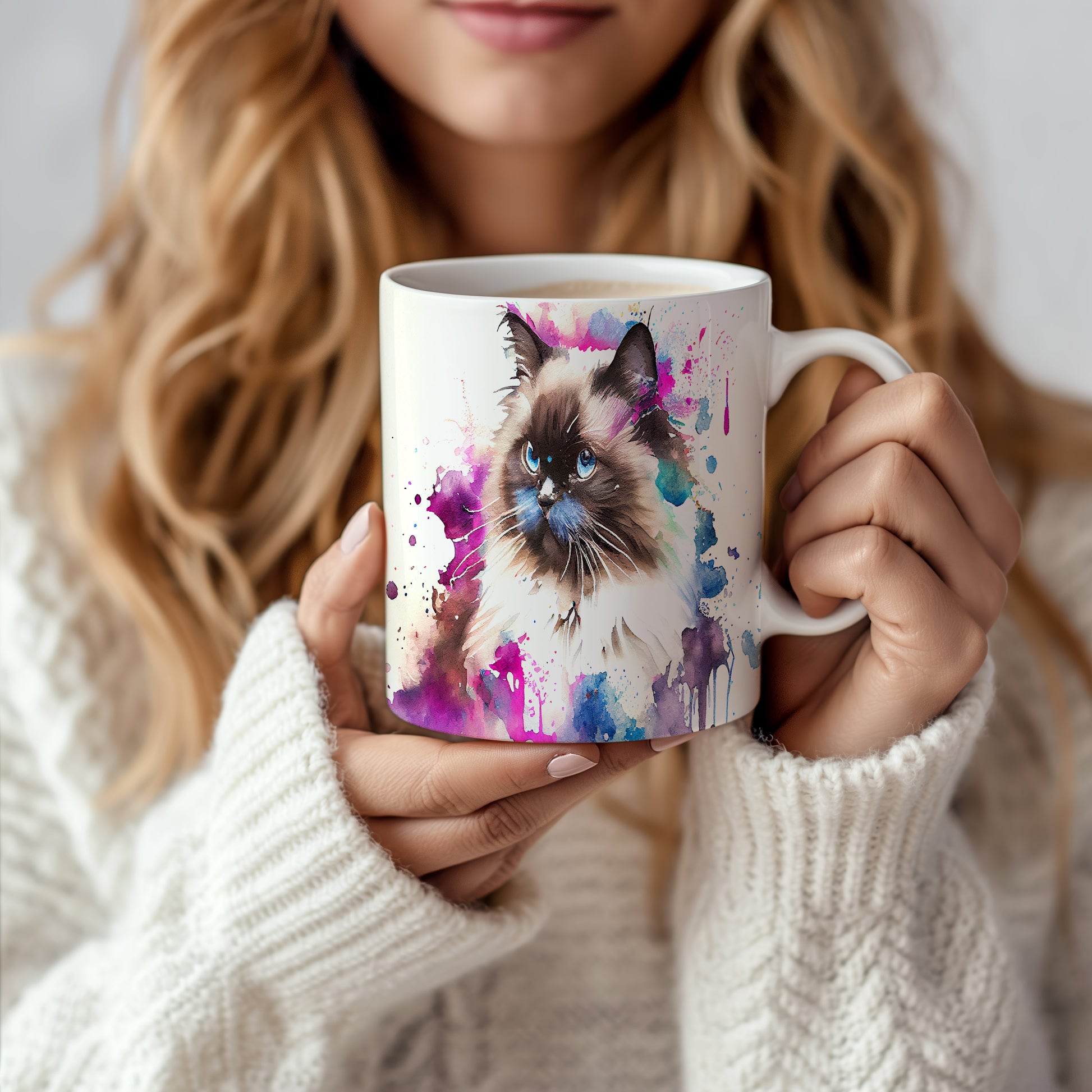 Tento hrnek zdobí krásná malba kočky s modrýma očima na pozadí akvarelových barev. Je ideální pro milovníky koček a skvělý dárek pro každého, kdo si rád vychutnává kávu. Materiál: keramika. Objem: 330 ml. Vhodné do myčky i mikrovlnky. Používání tohoto hrnku přináší radost a oživuje každou přestávku.