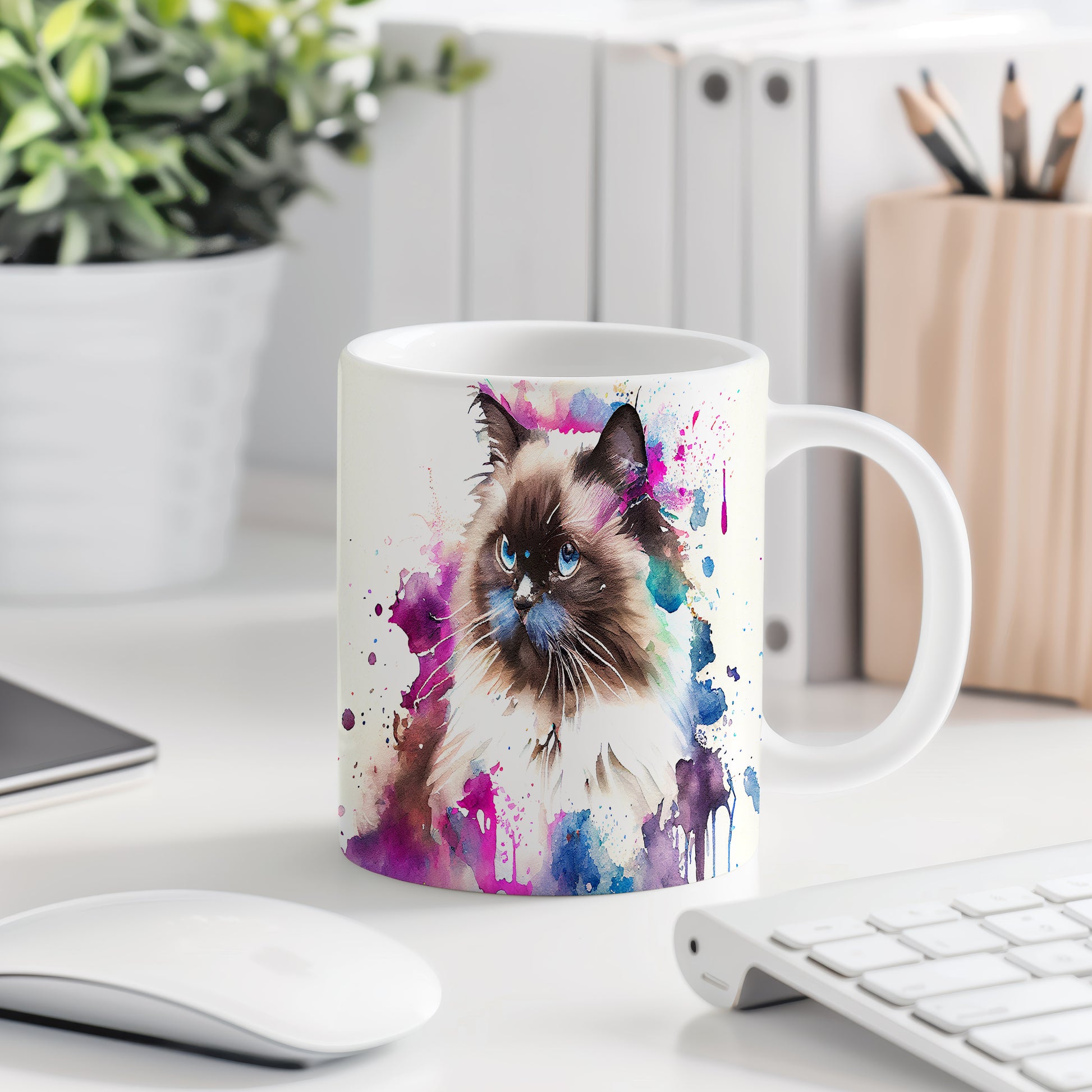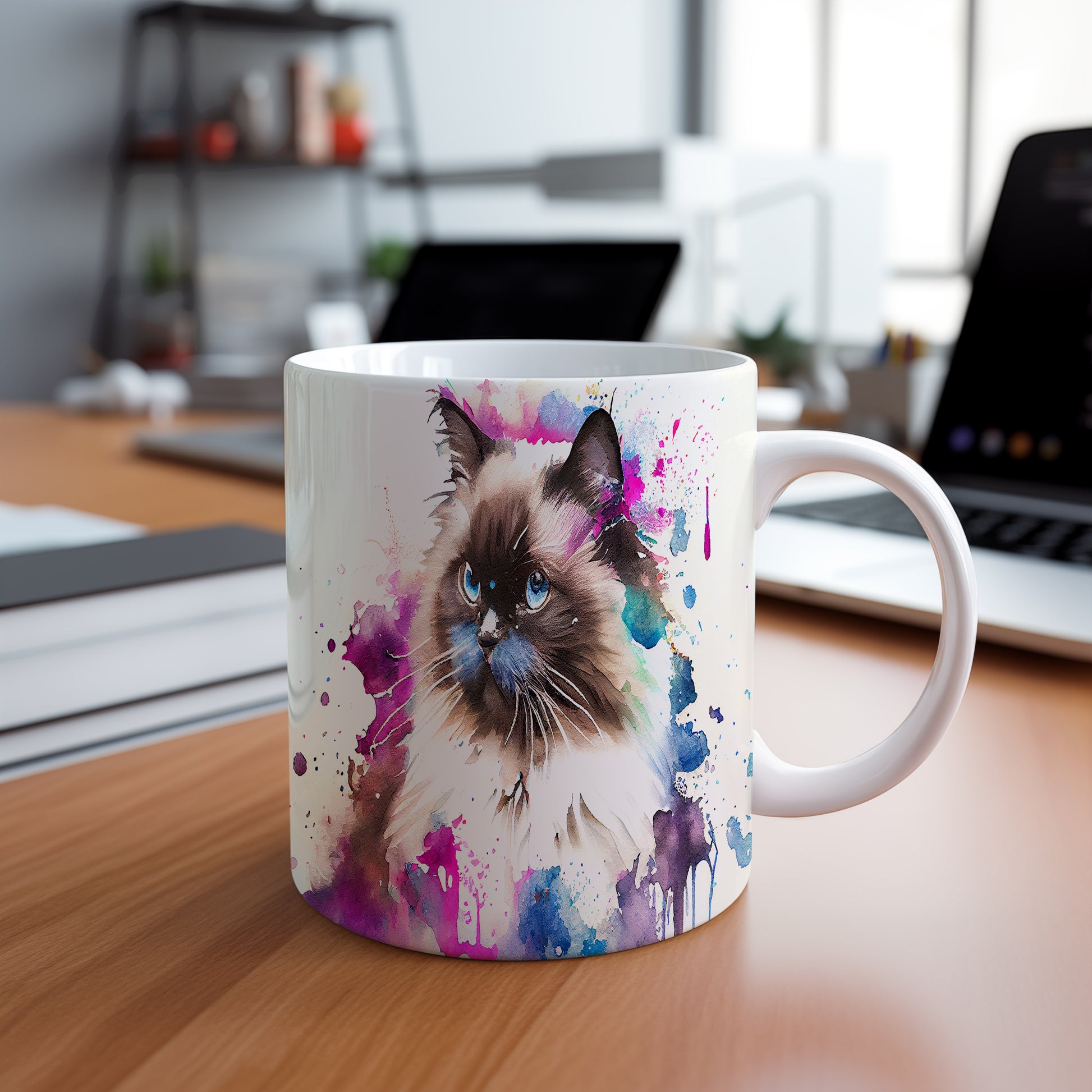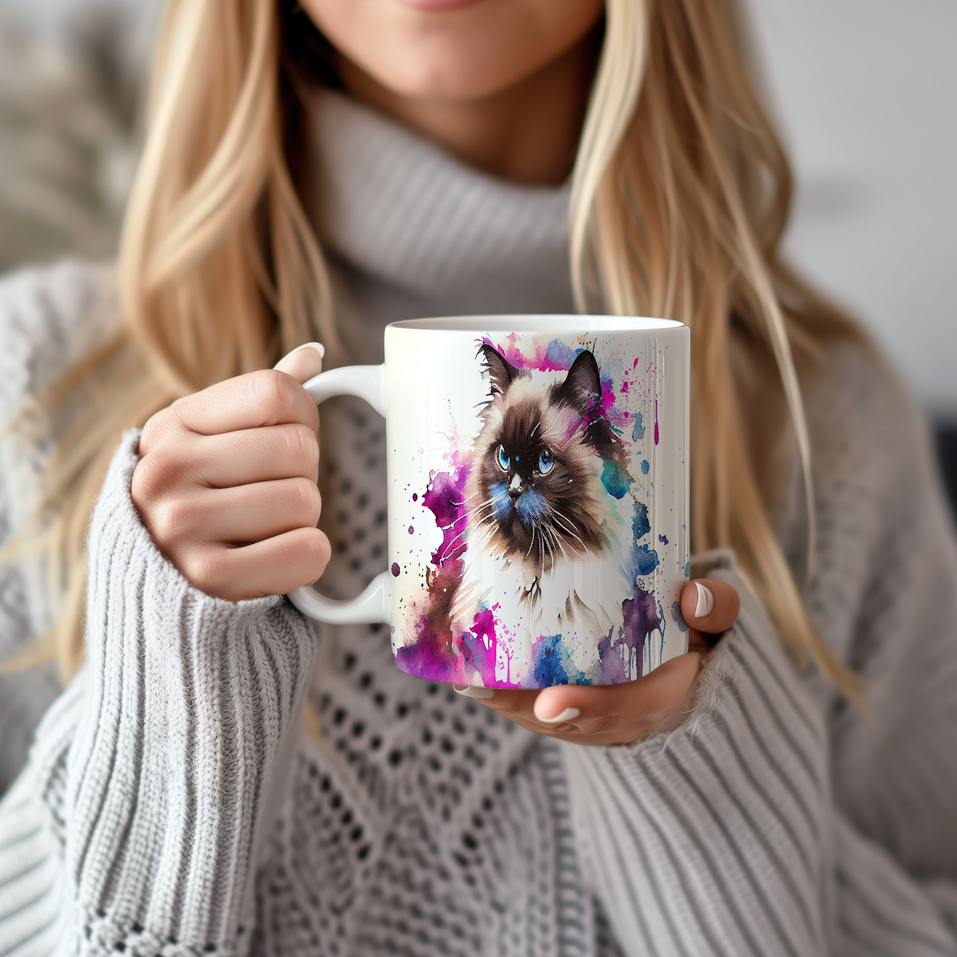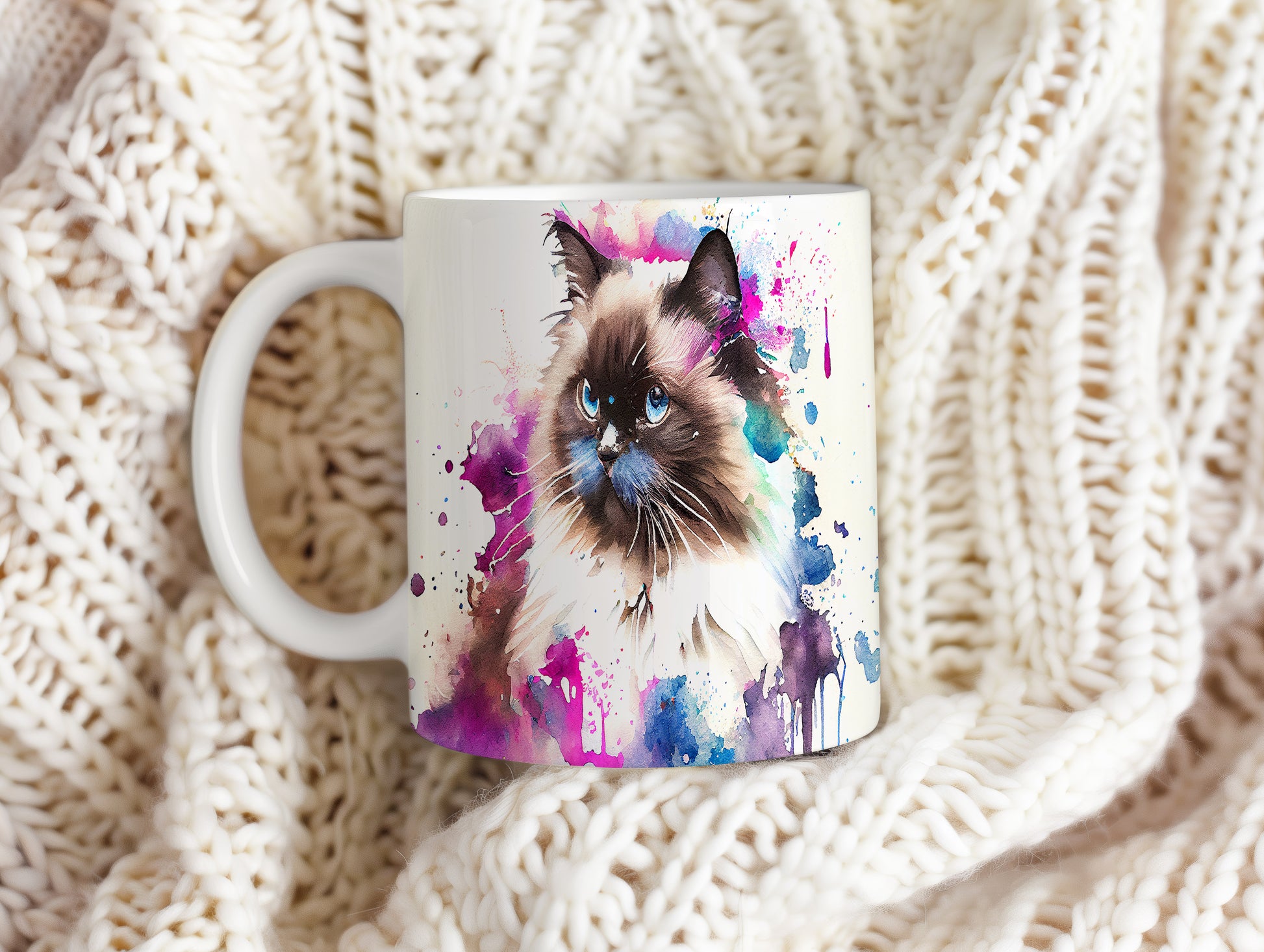 Tento hrnek zdobí krásná malba kočky s modrýma očima na pozadí akvarelových barev. Je ideální pro milovníky koček a skvělý dárek pro každého, kdo si rád vychutnává kávu. Materiál: keramika. Objem: 330 ml. Vhodné do myčky i mikrovlnky. Používání tohoto hrnku přináší radost a oživuje každou přestávku.
