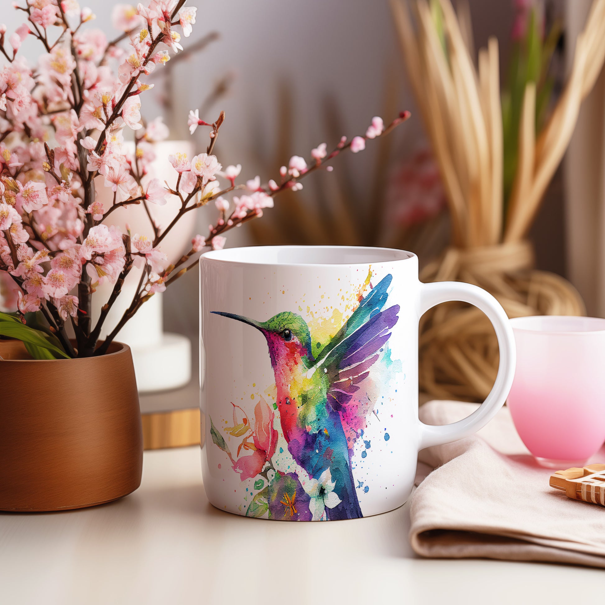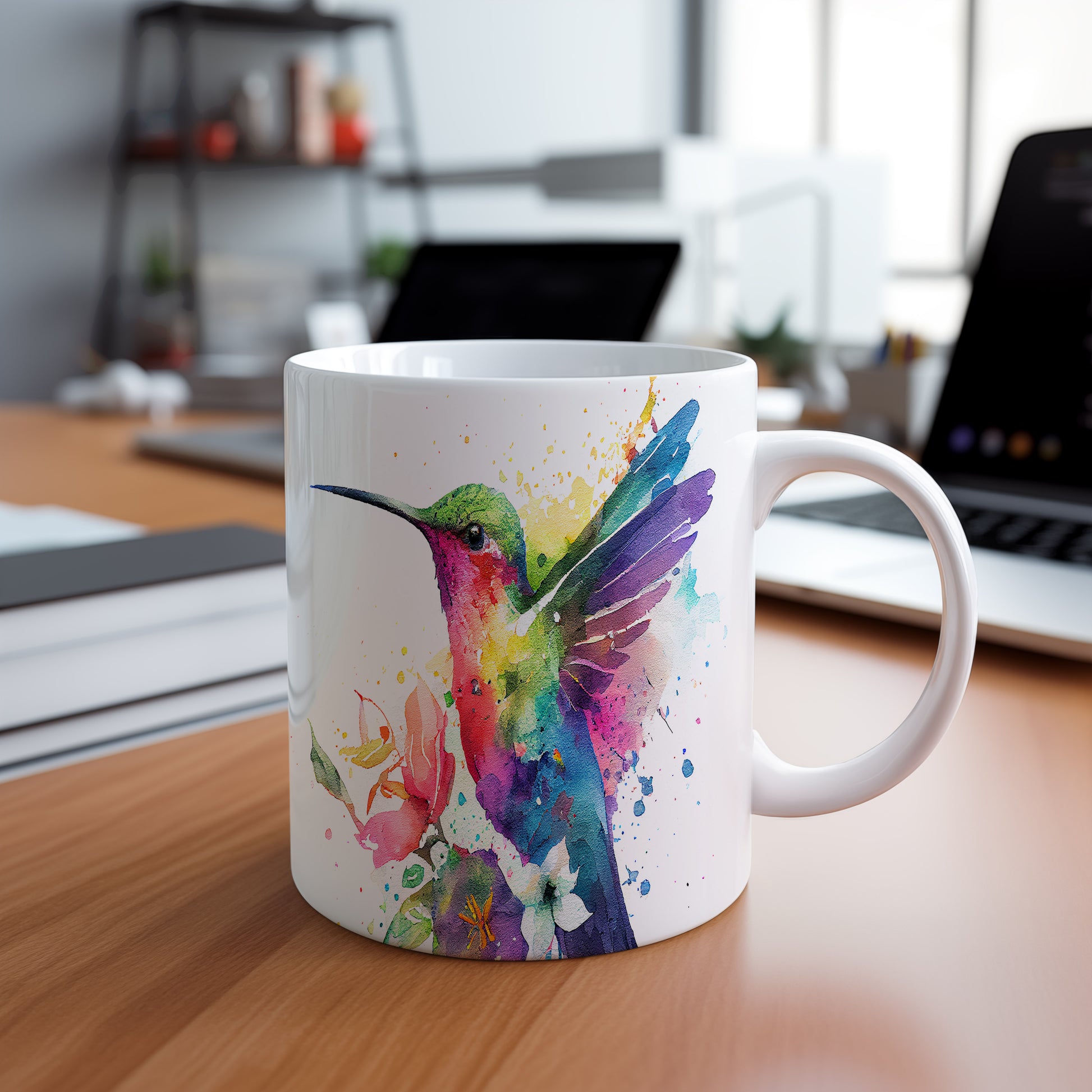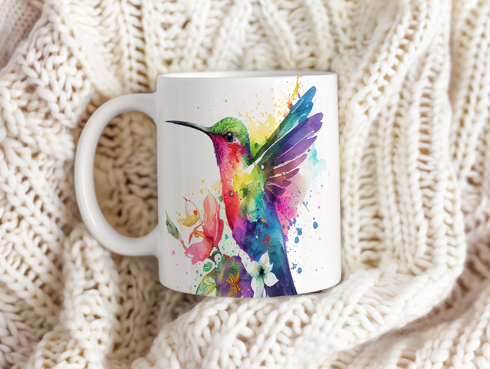 Hrnek s kolibříkem a květinami – akvarelovým motivem