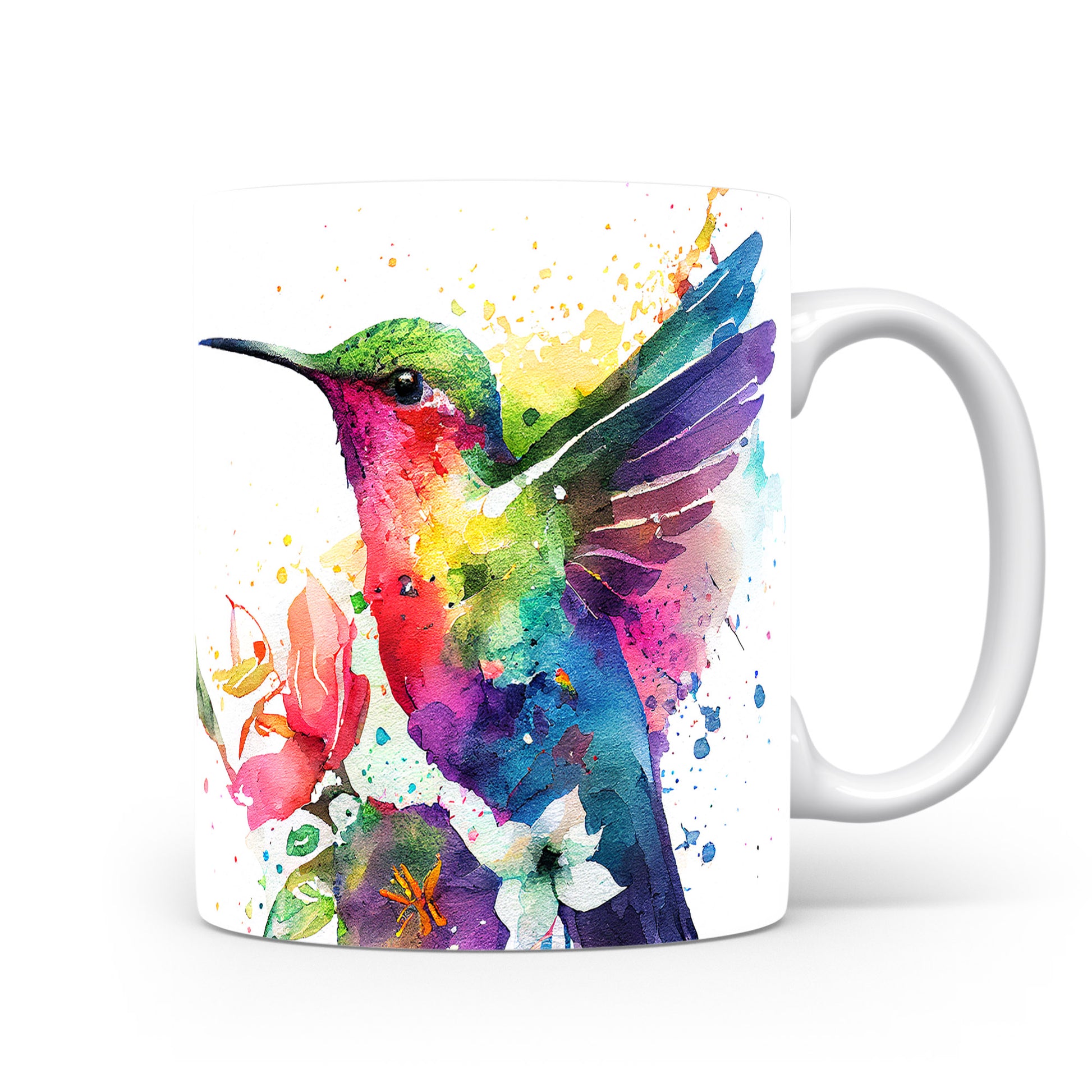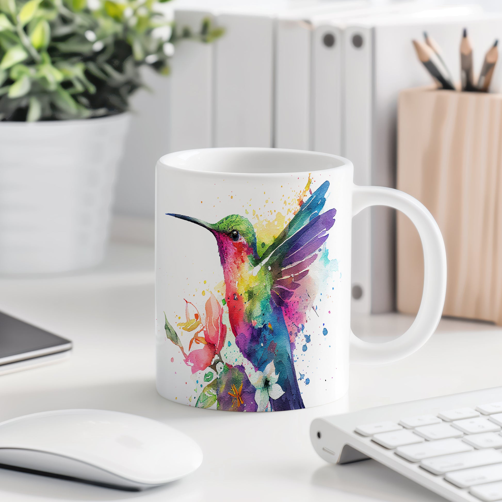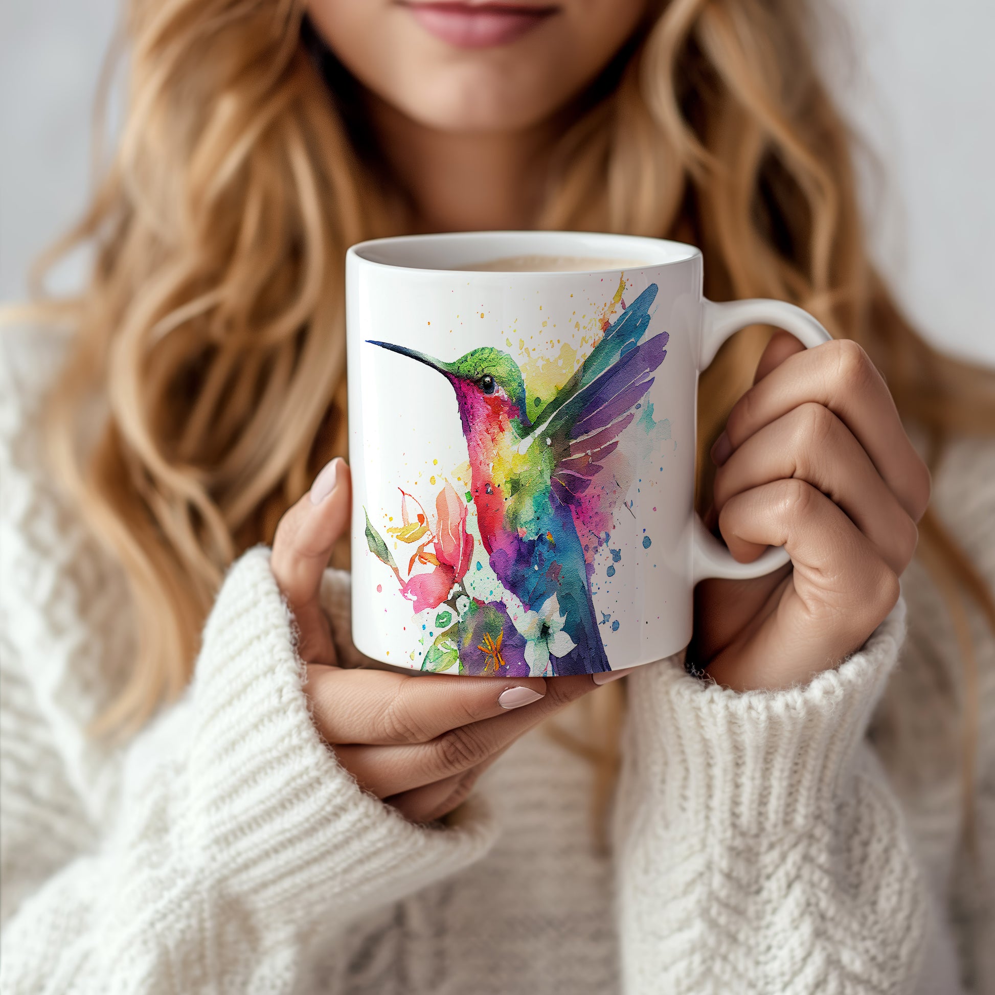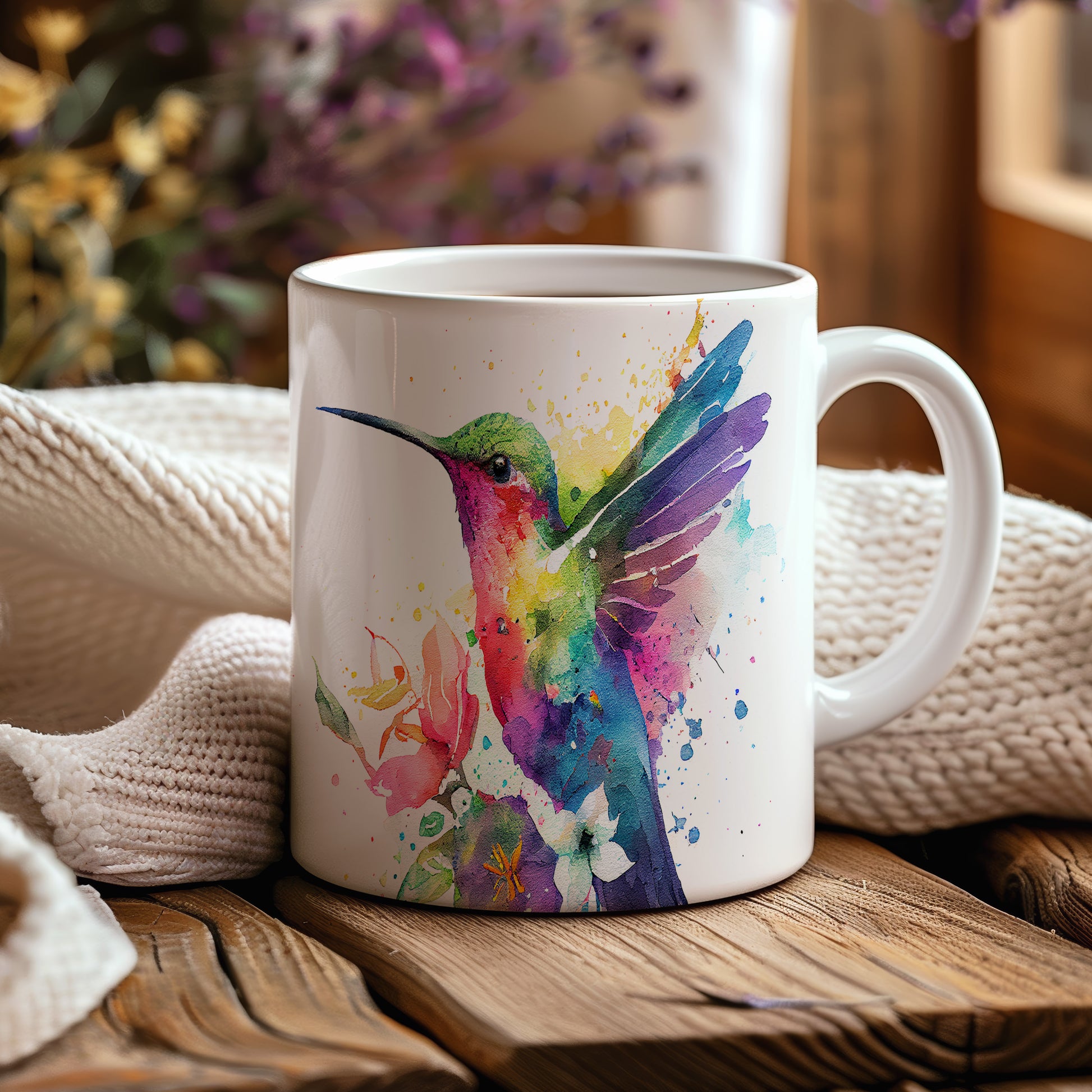 Hrnek s kolibříkem a květinami – akvarelovým motivem