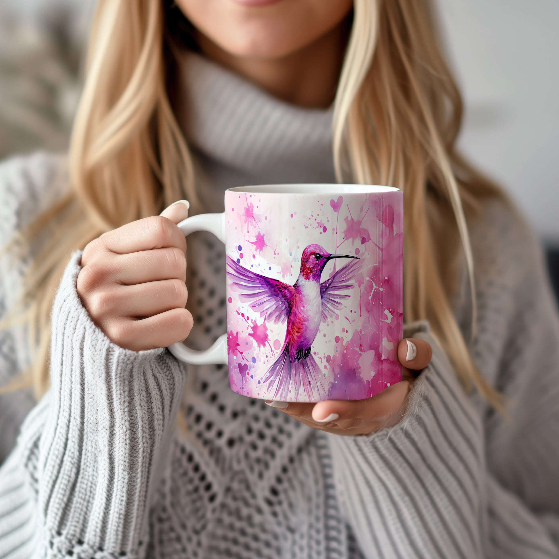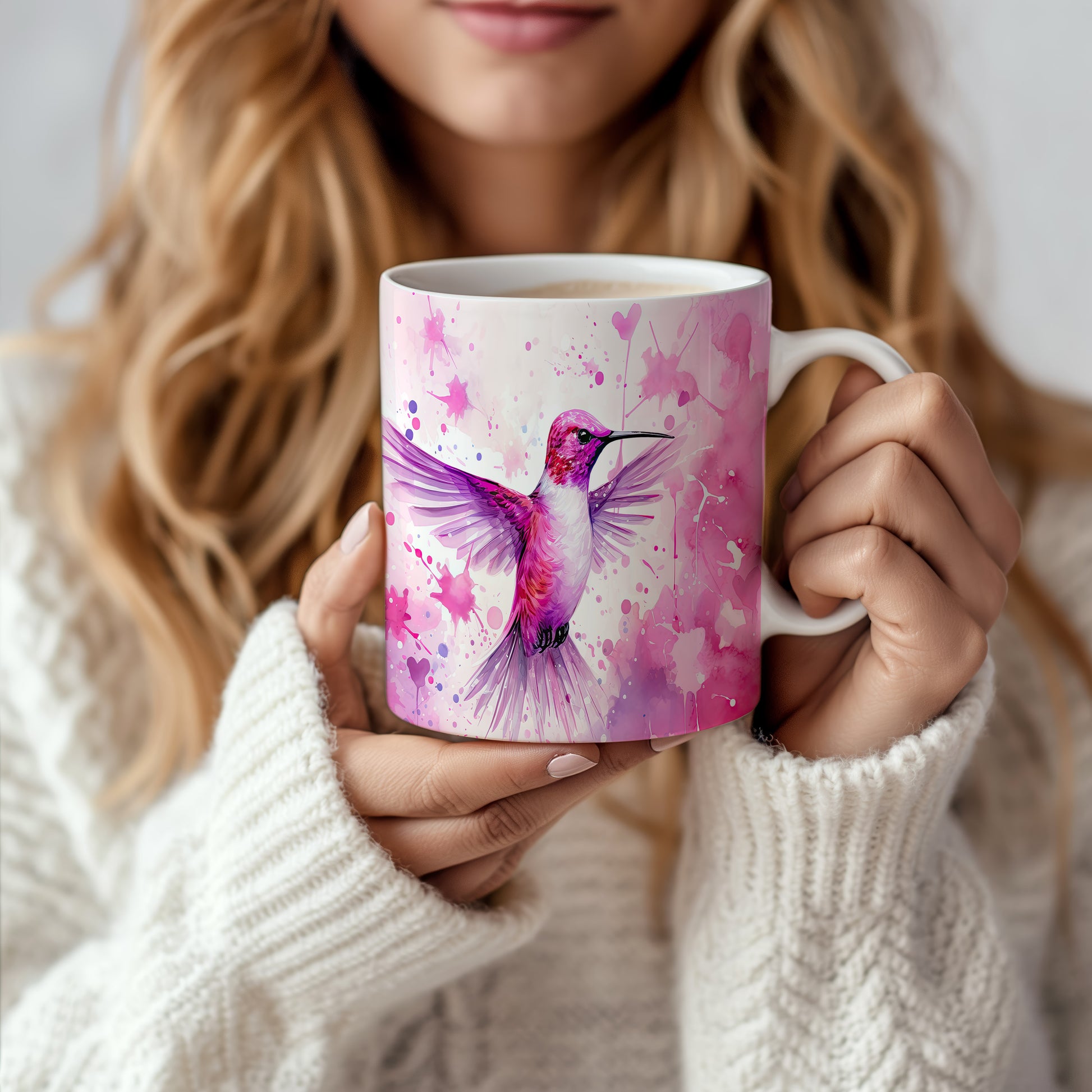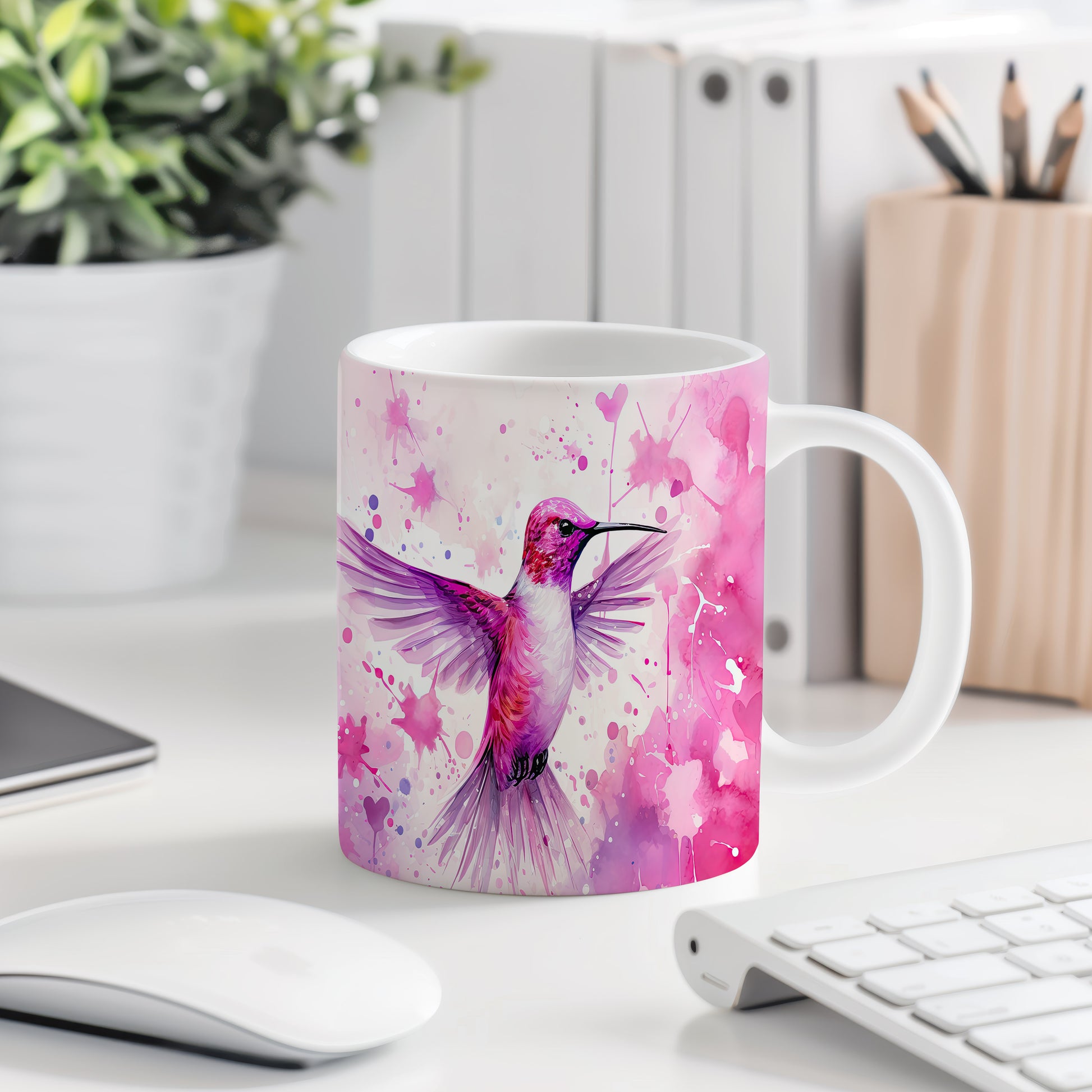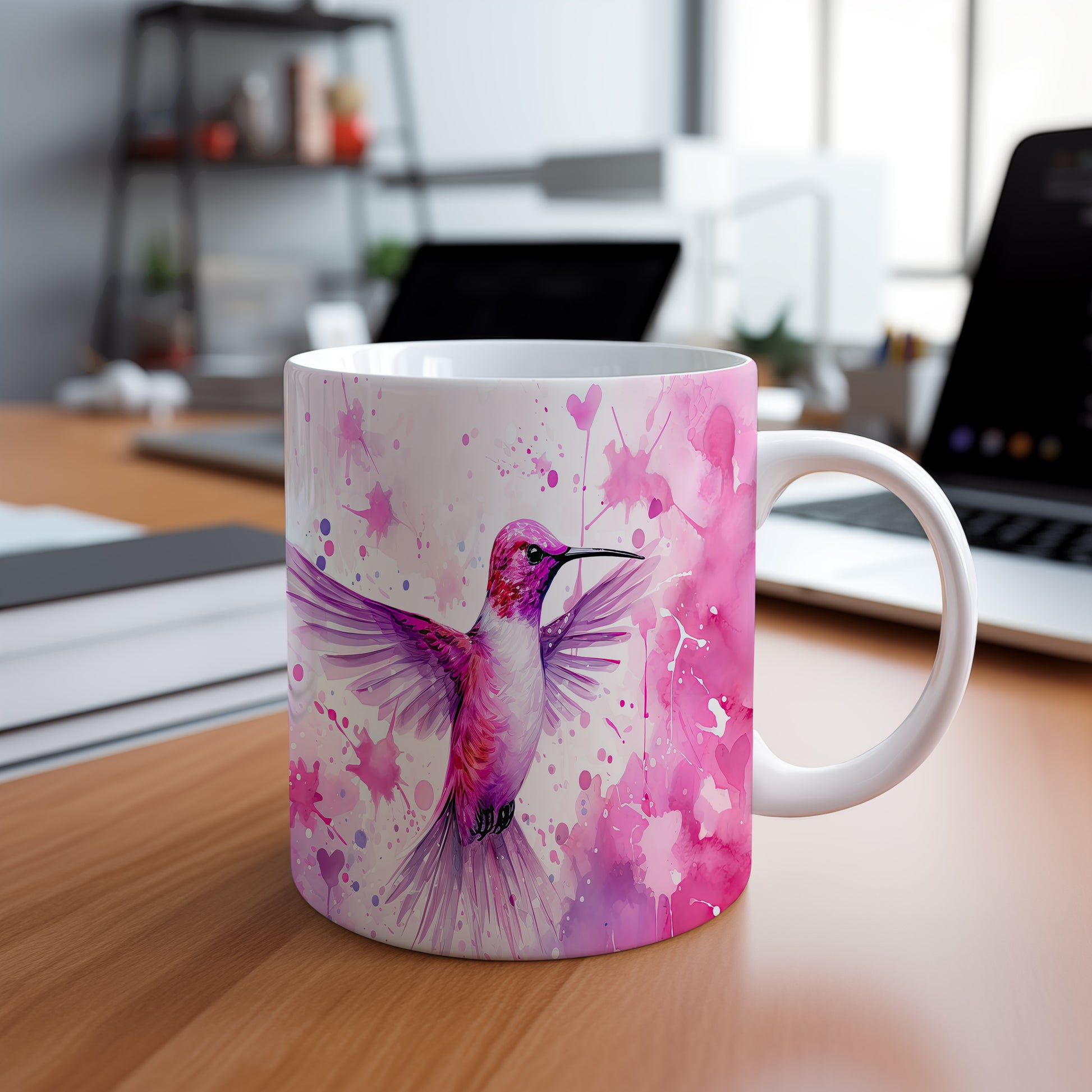 Hrnek s kolibříkem na růžovém pozadí – modrými detaily